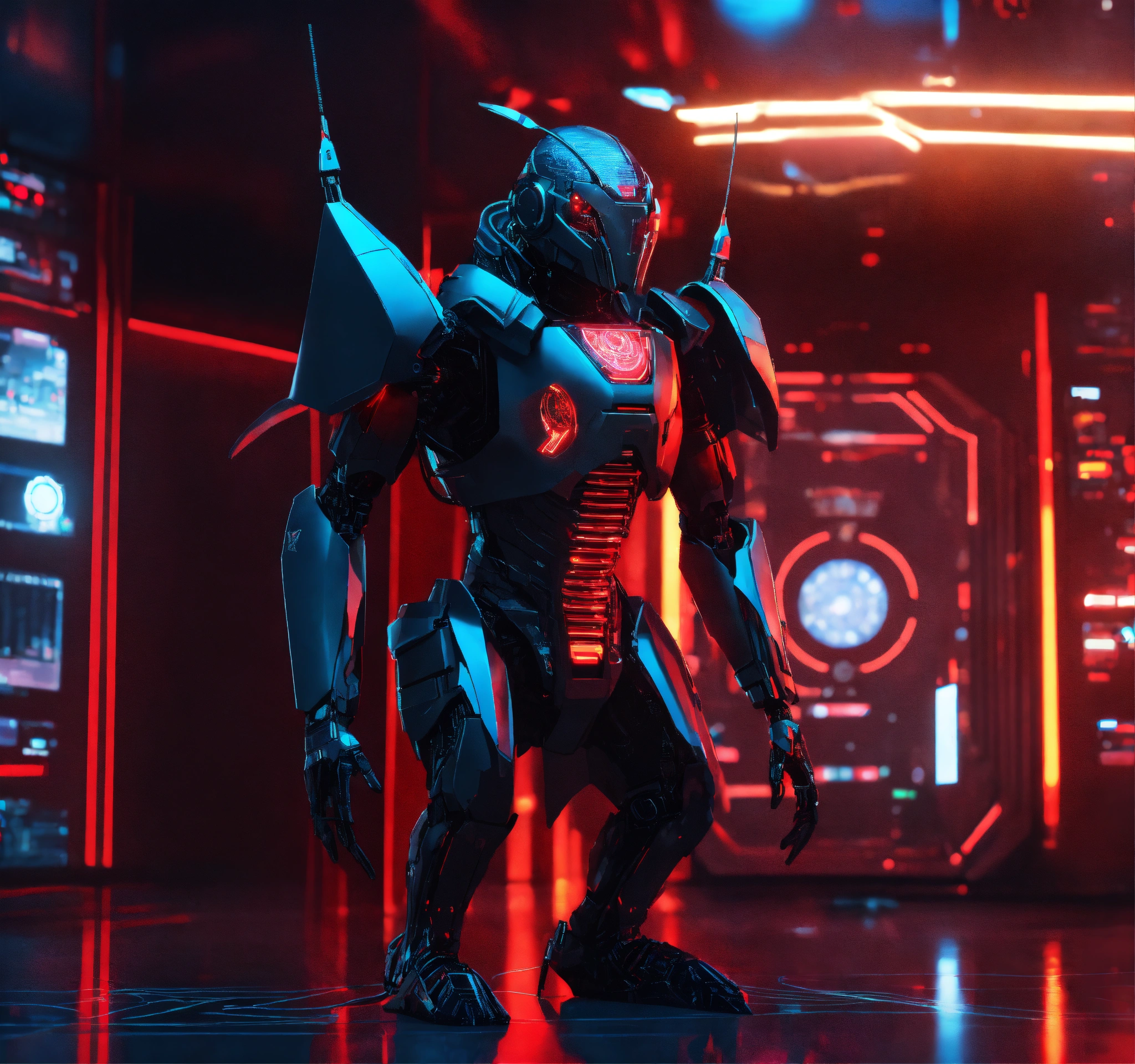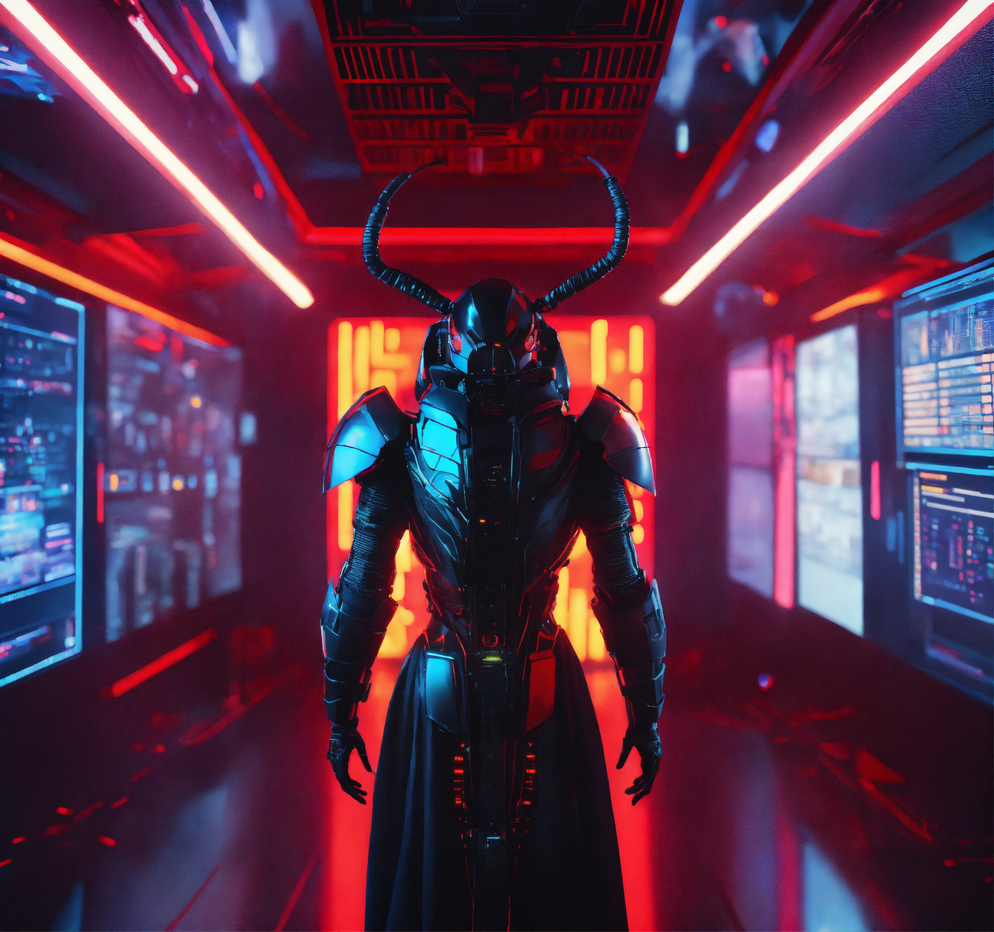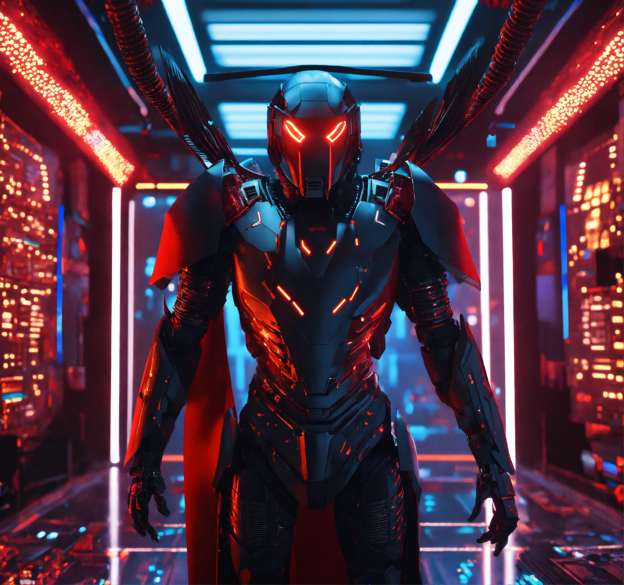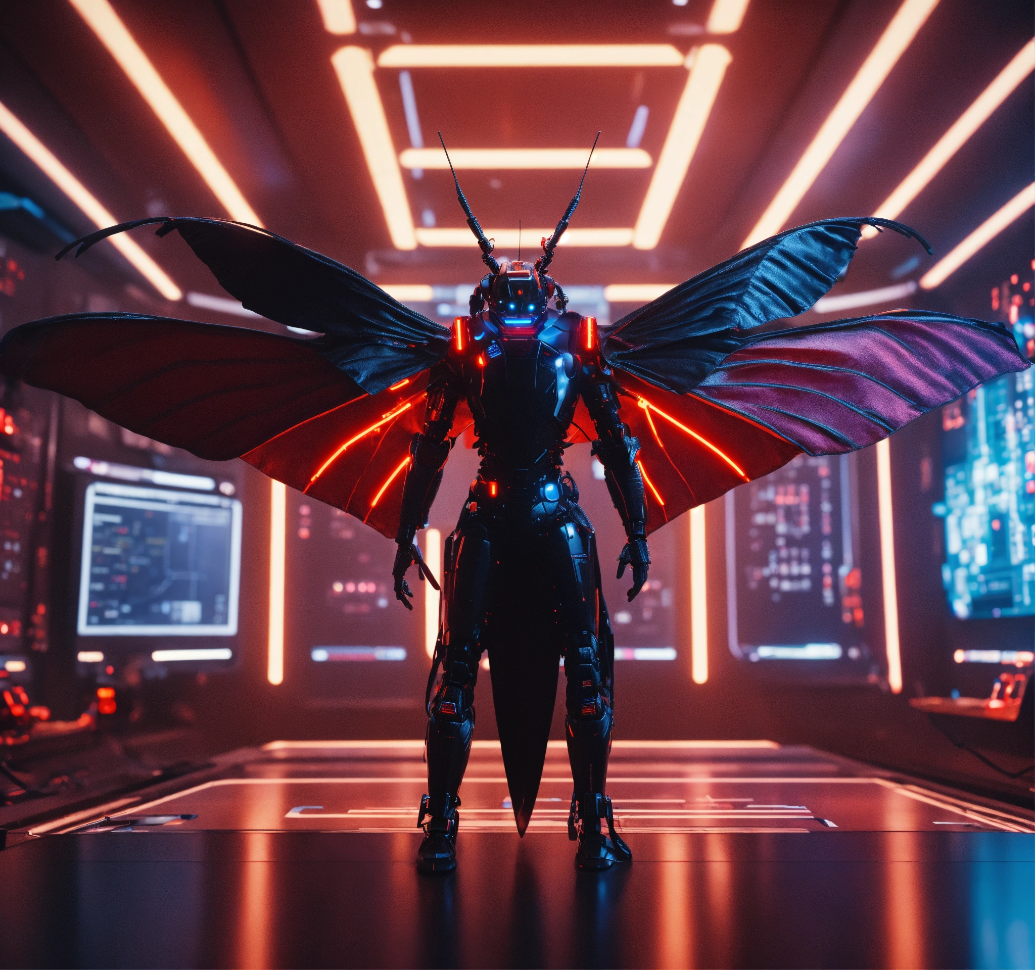 Zoom out of standing black cockroach faced humanoid with red glowing eyes, circuitry decor, and long draped down colorful cape like wings and hi-tech armored humanoid body, in a futuristic control room, realistic, 8k