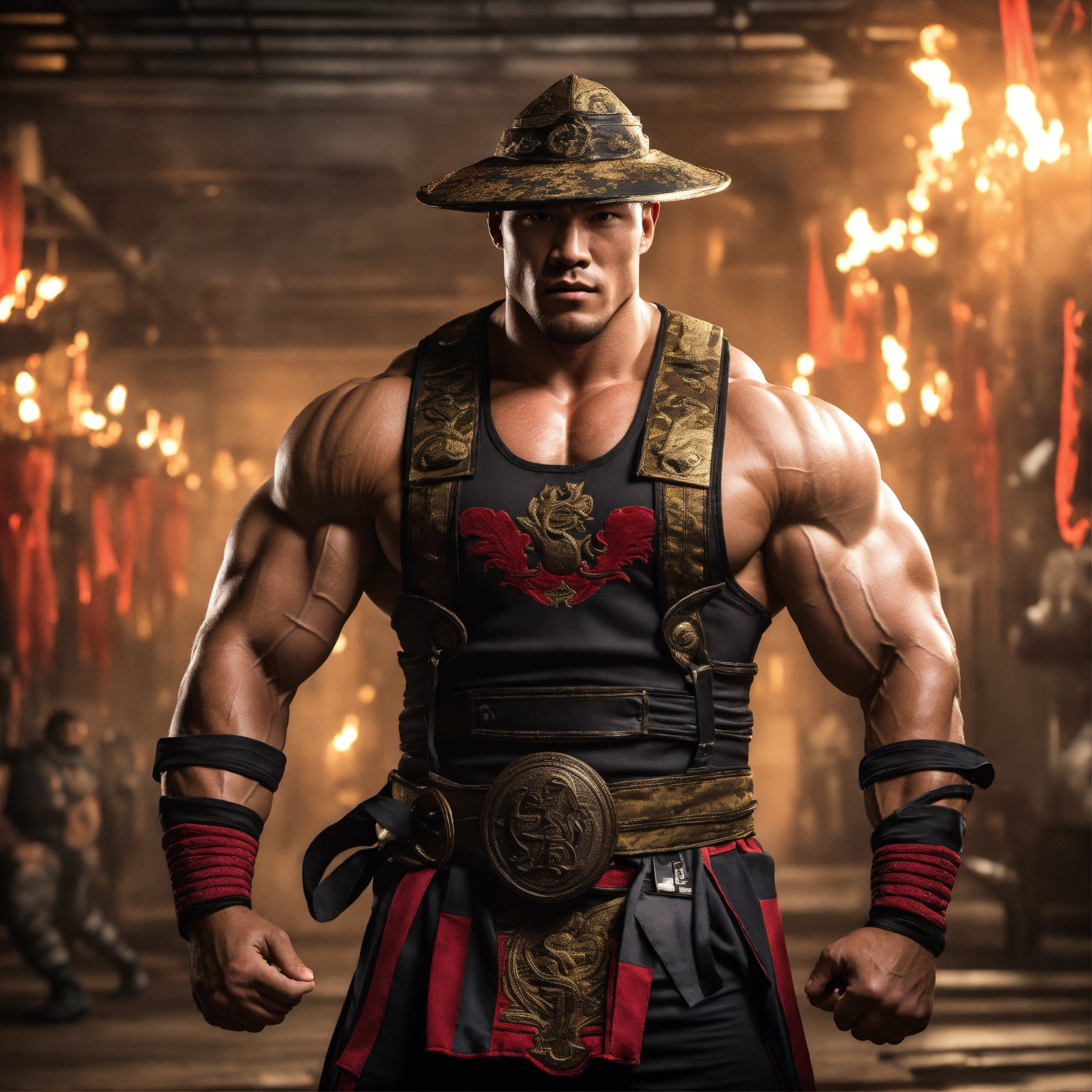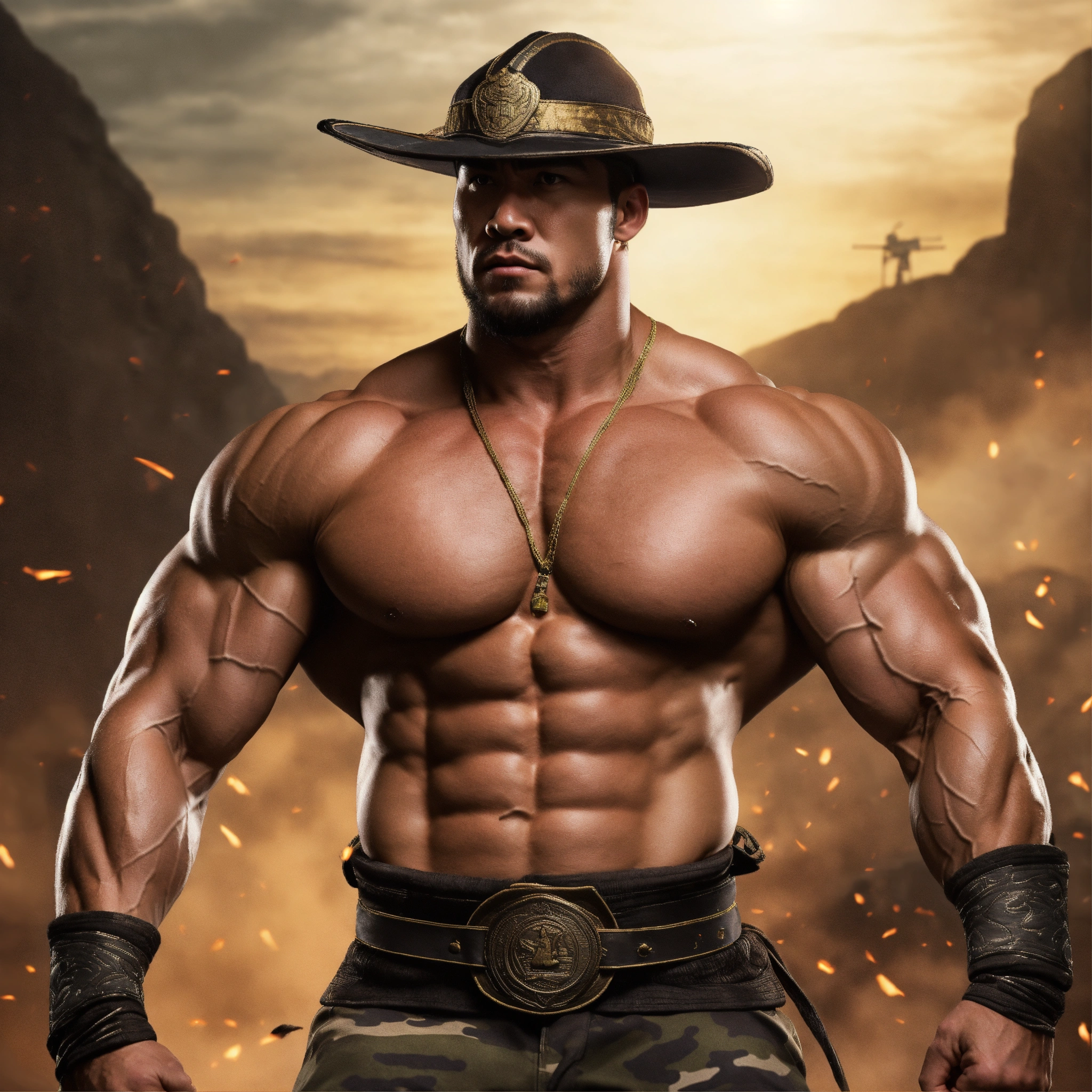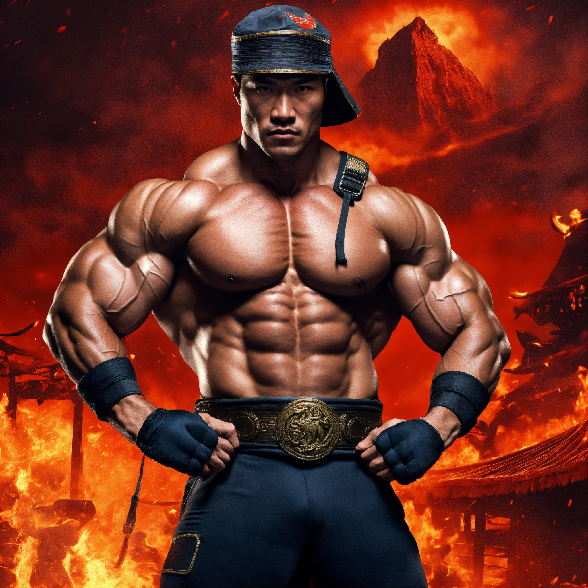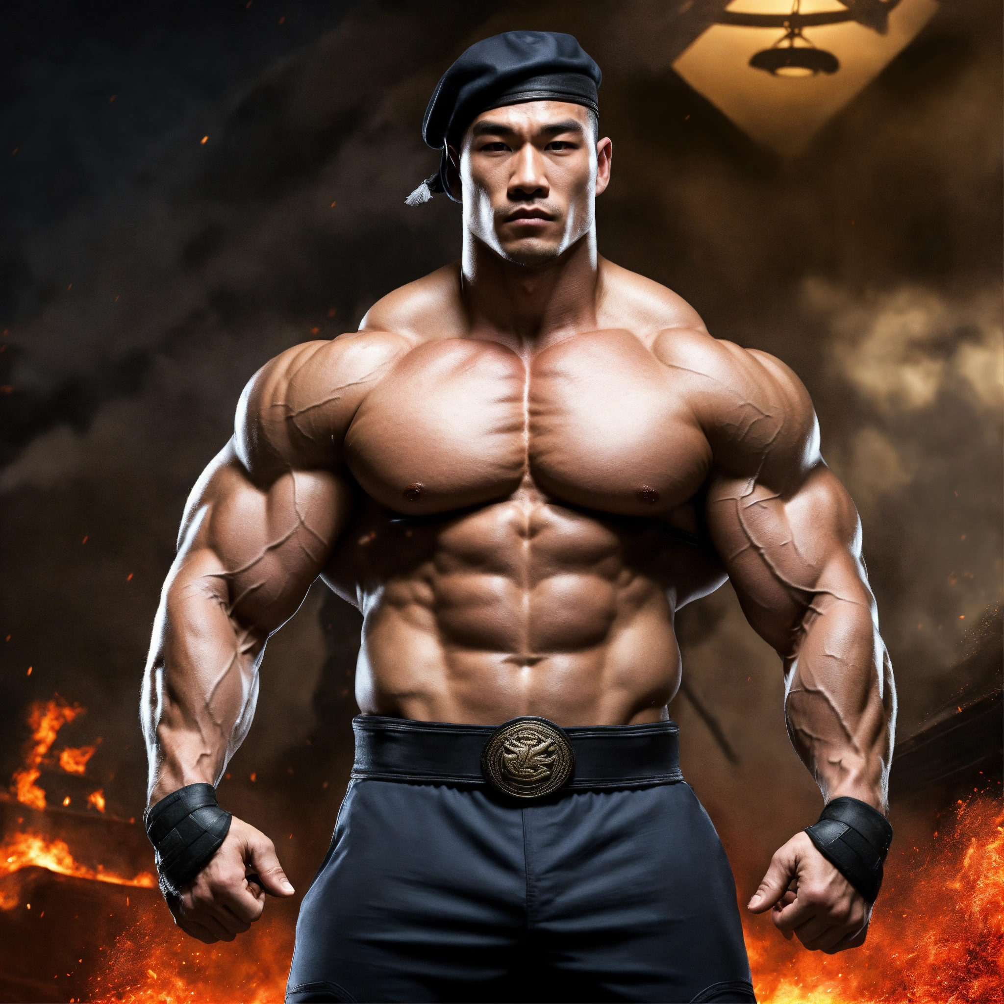 30-year-old man with big muscles, big bodybuilder, body like a wrestler, in the military, kung lao from mortal kombat