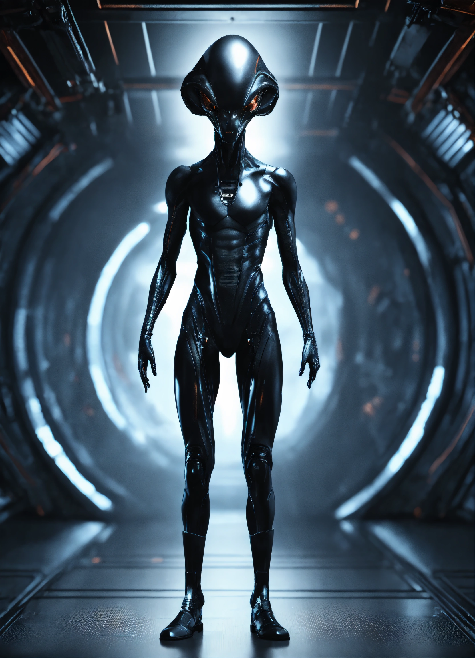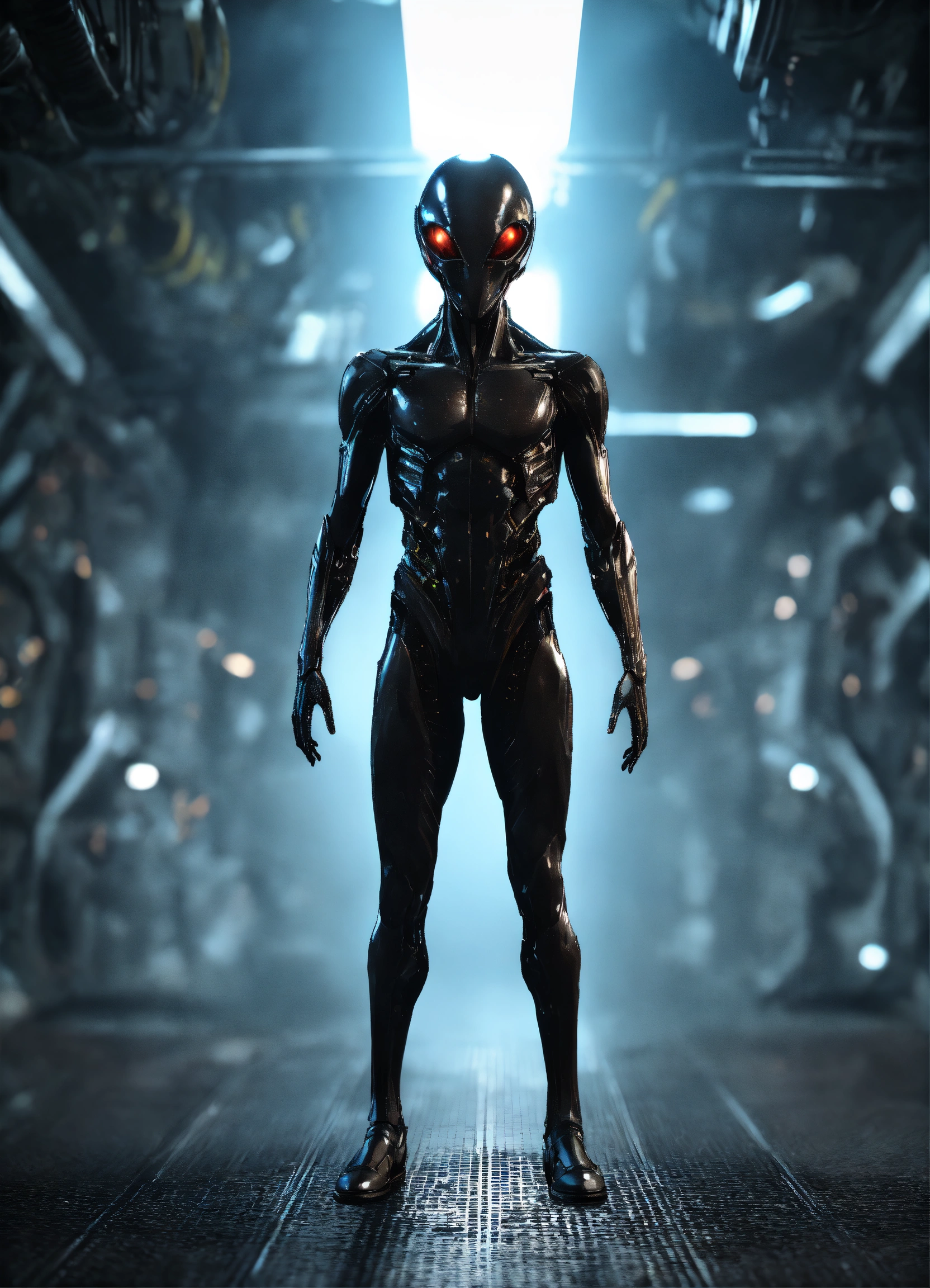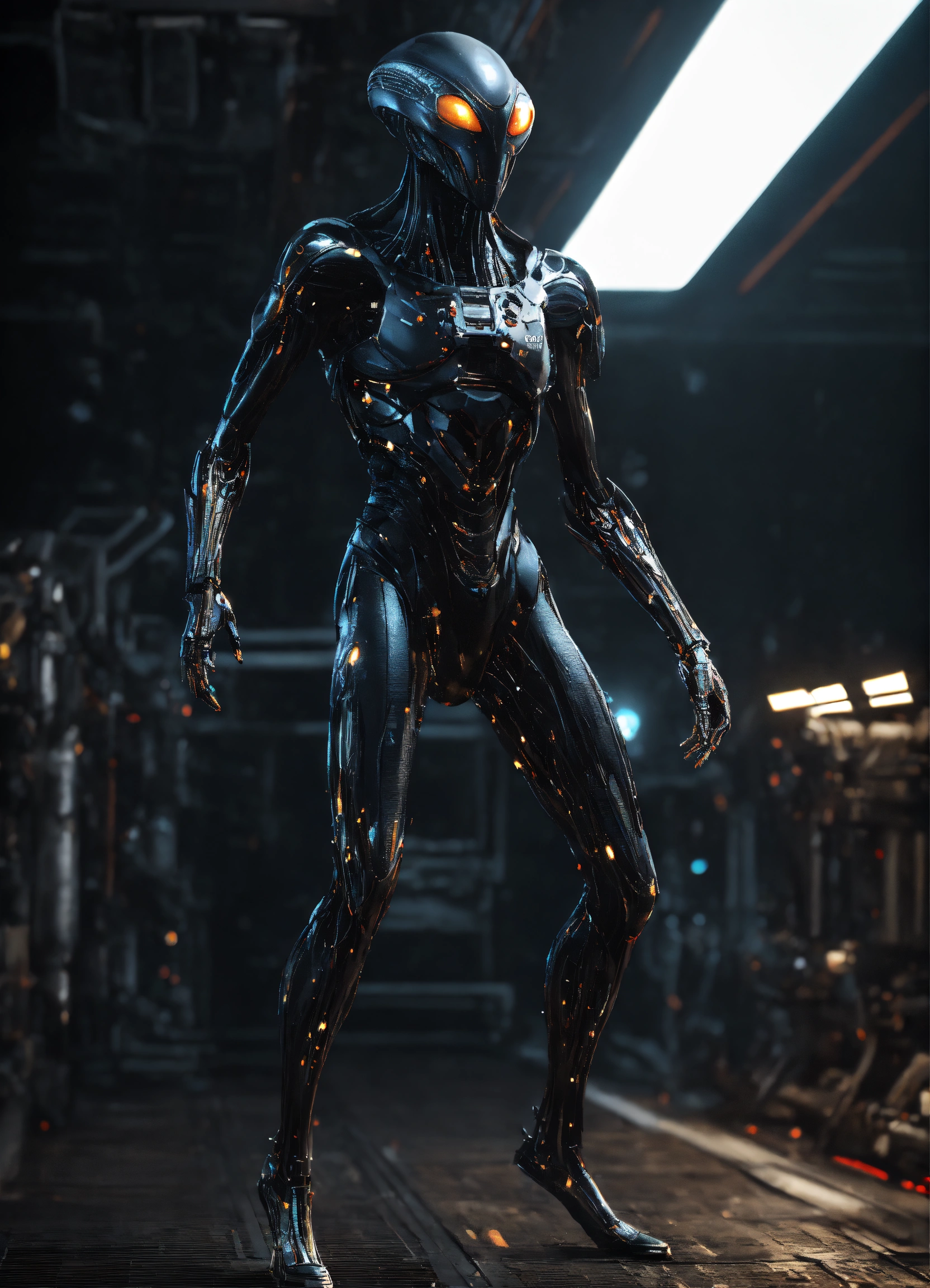 Image of a male alien being, non-threathing, full body, standing, solid black purely mechanical background, 4k render, hyperrealistic
