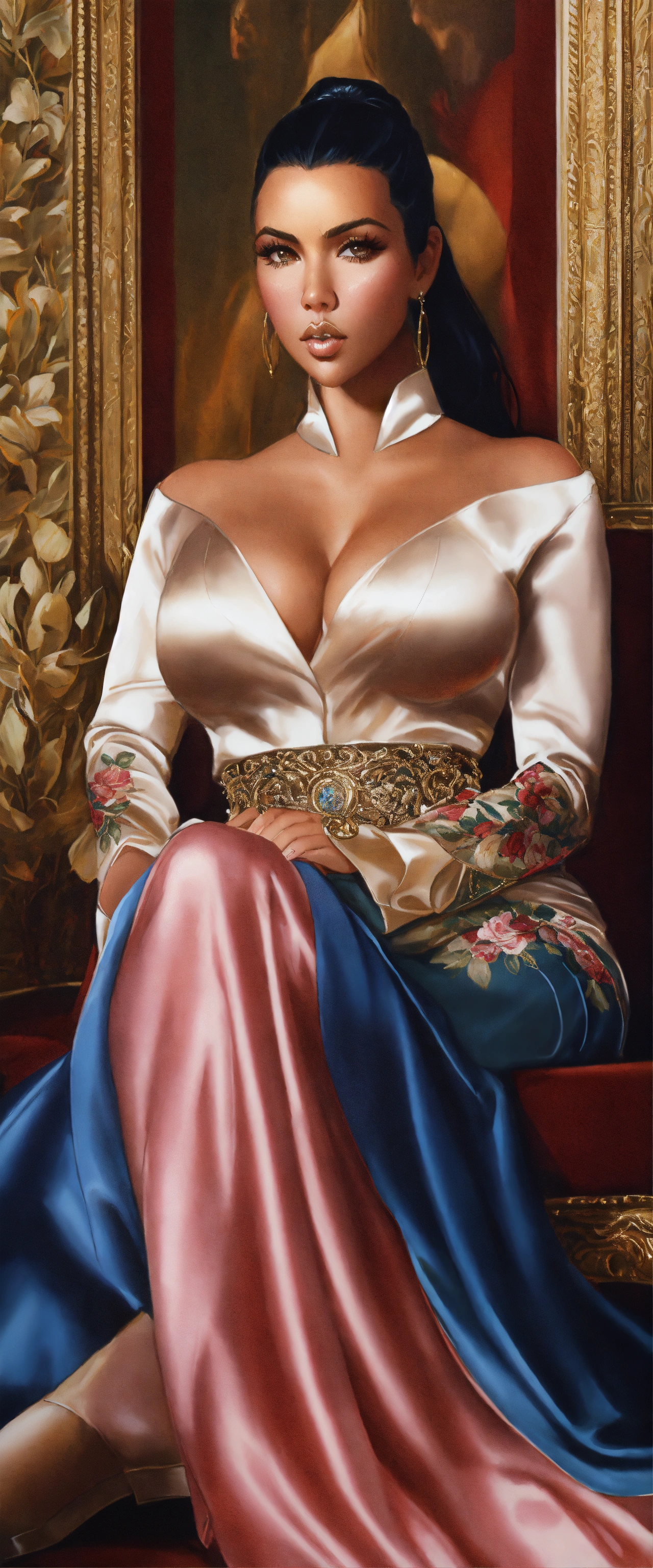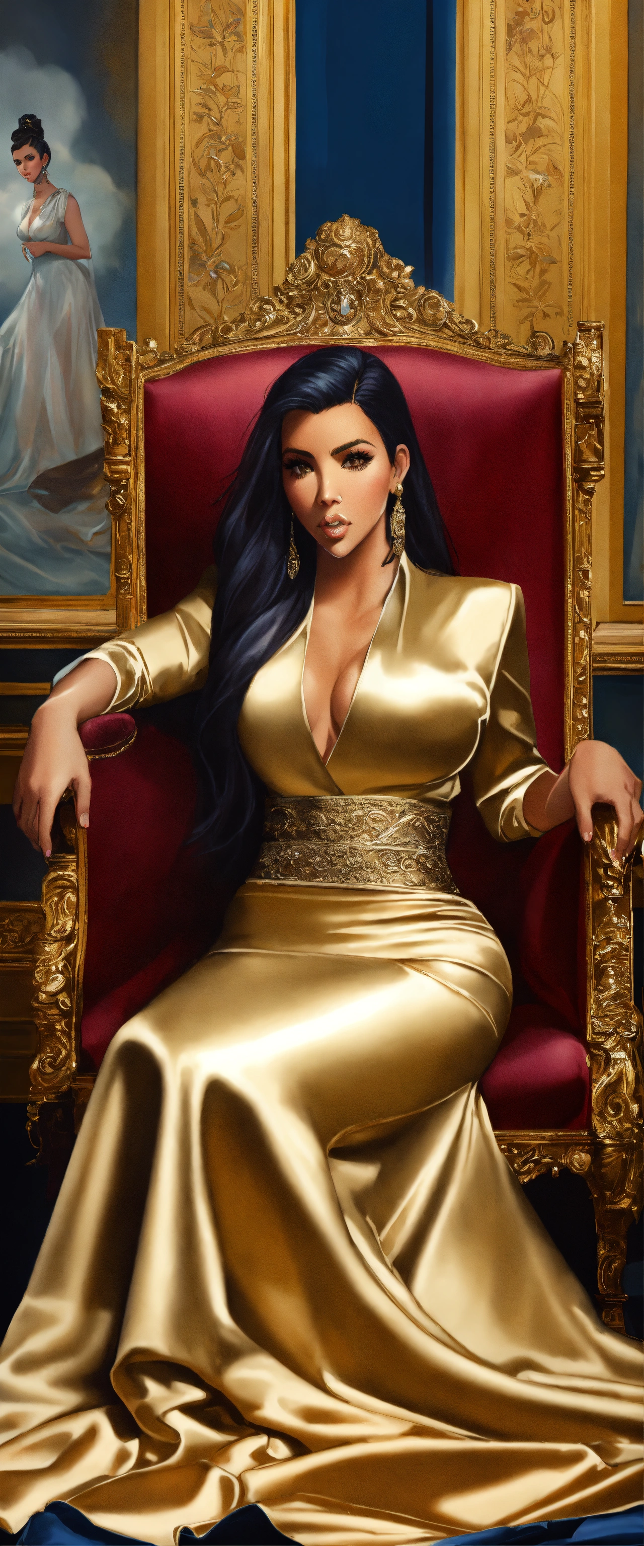 Kim kardashian, sat on throne, highly detailed, long satin maxi skirt, palace background, sharp focus, art by artgerm and greg rutkowski and magali villeneuve, wide hips, tiny waist, steam, 1980s portrait, realistic, silk blouse, photorealism