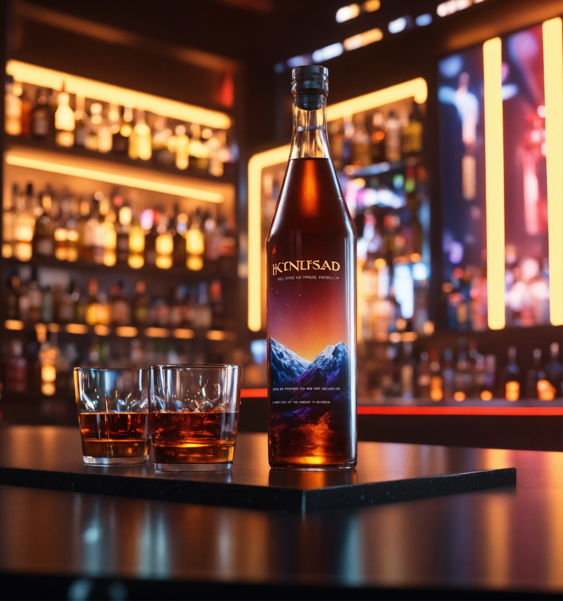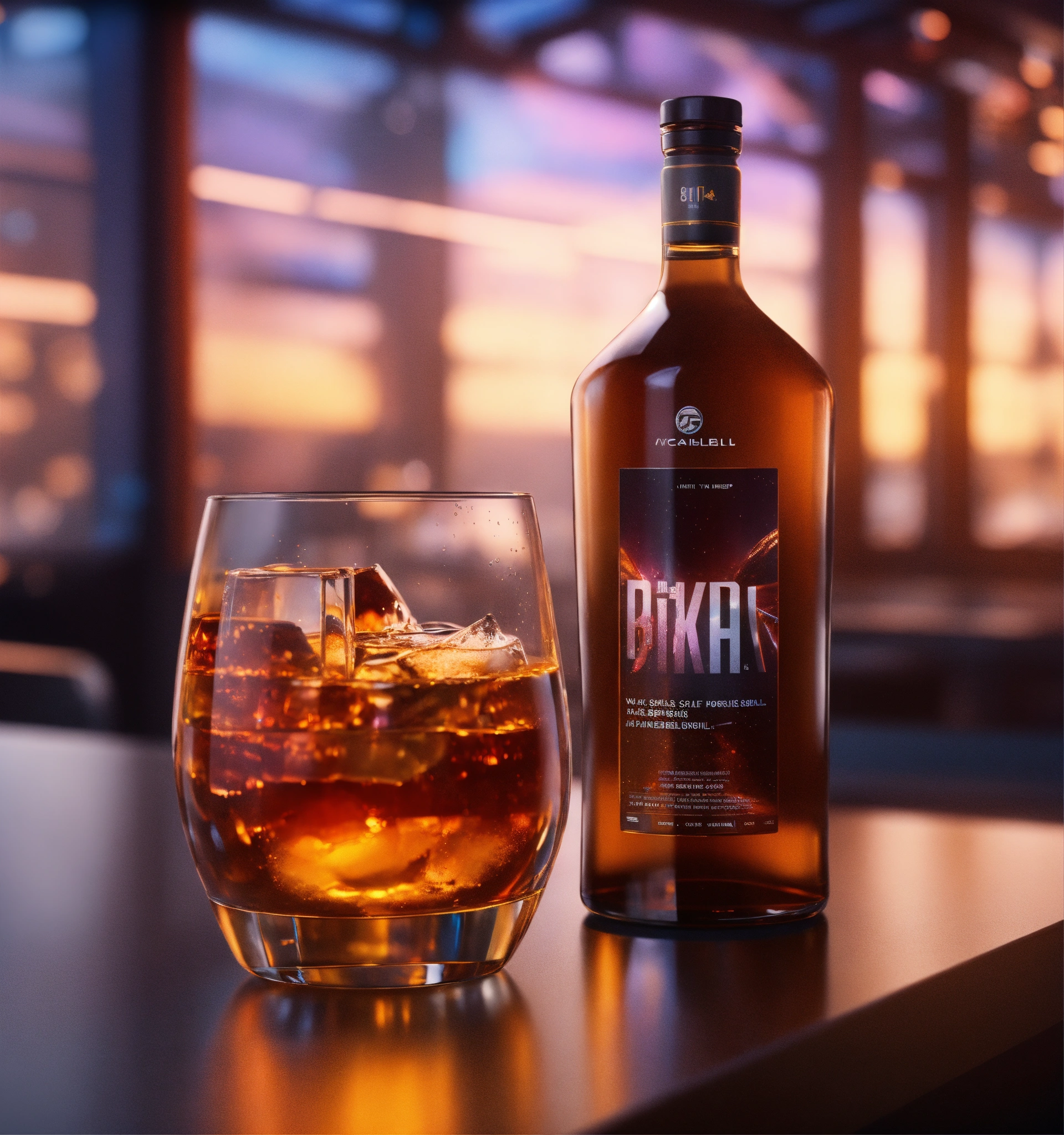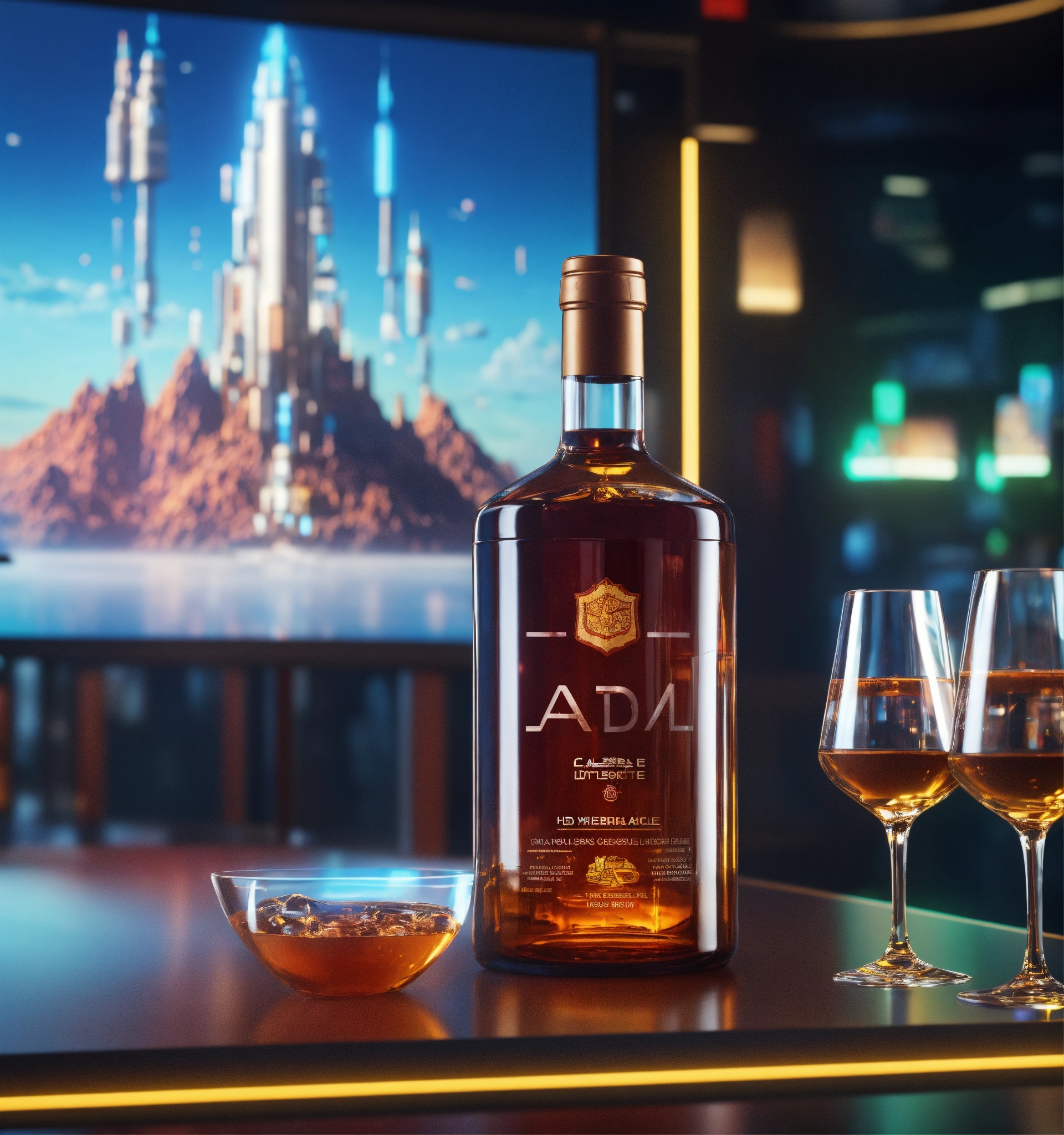 Close up of bottle and glasses in front of a vertical display ad poster on the wall in a futuristic space port bar, 8k, unreal engine