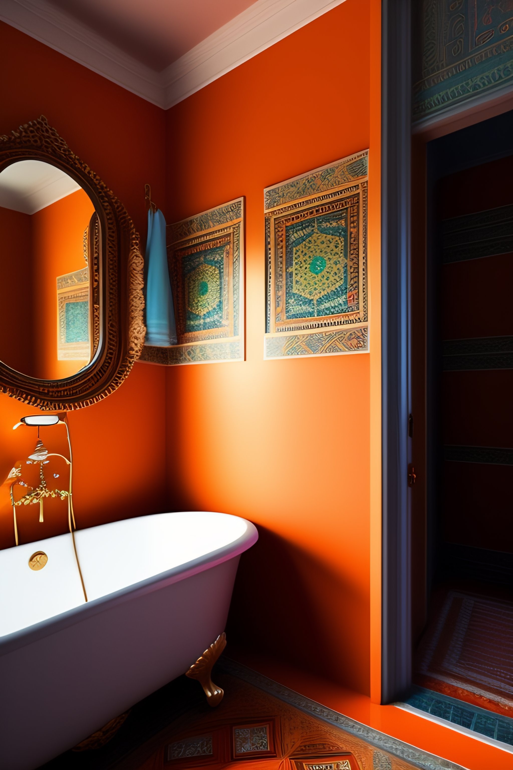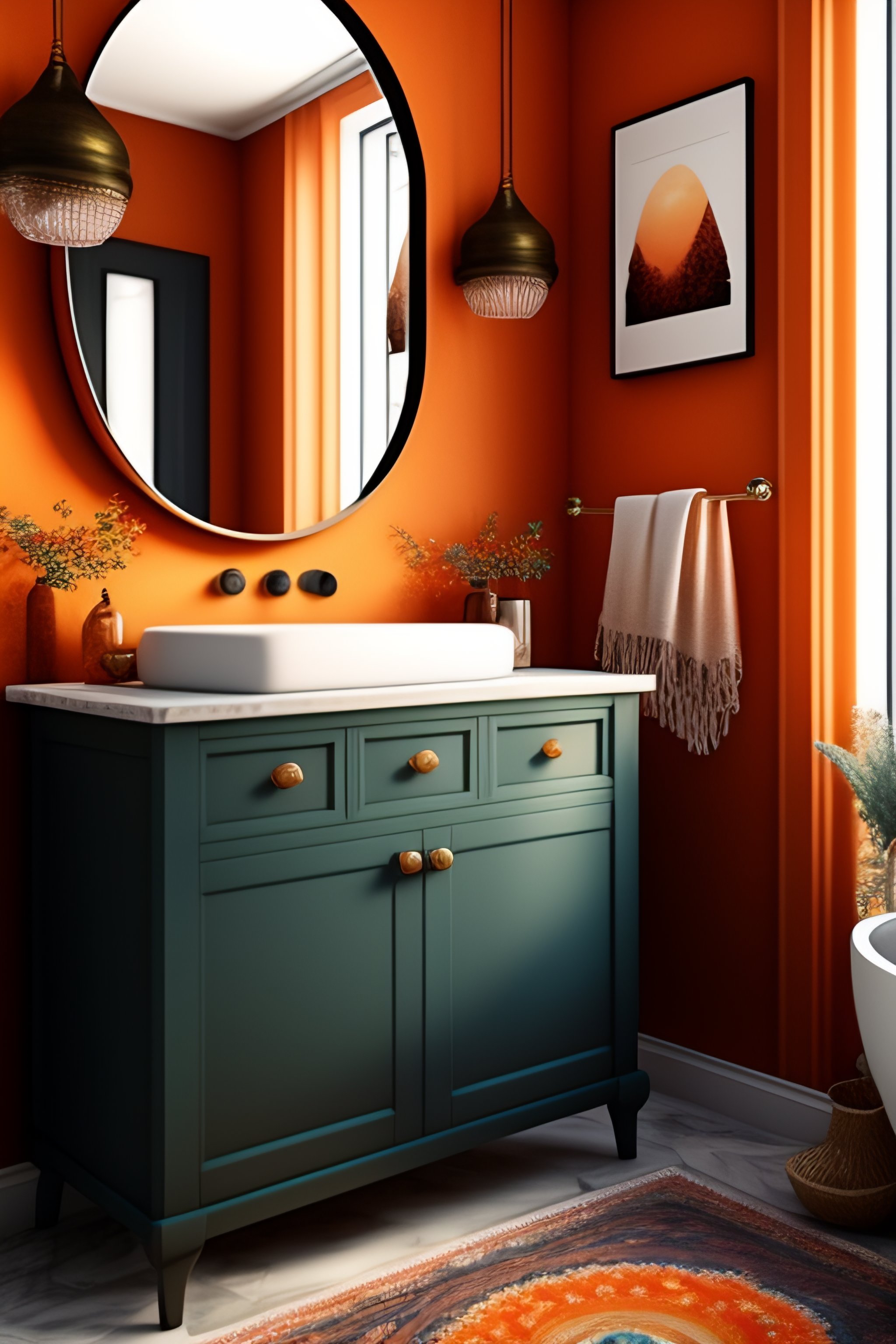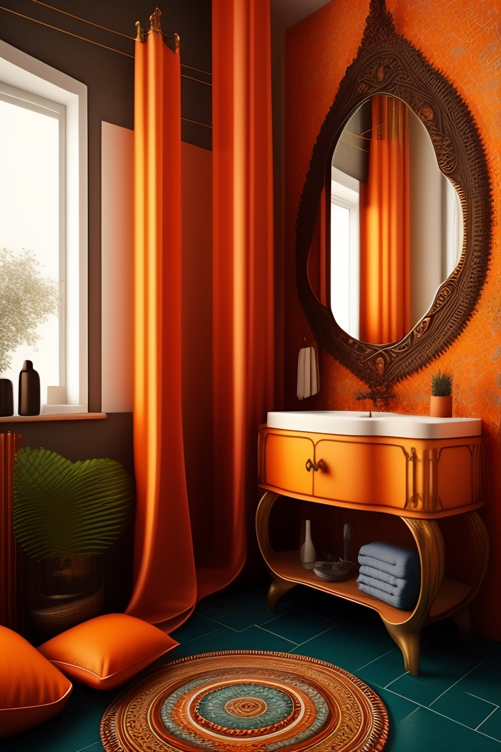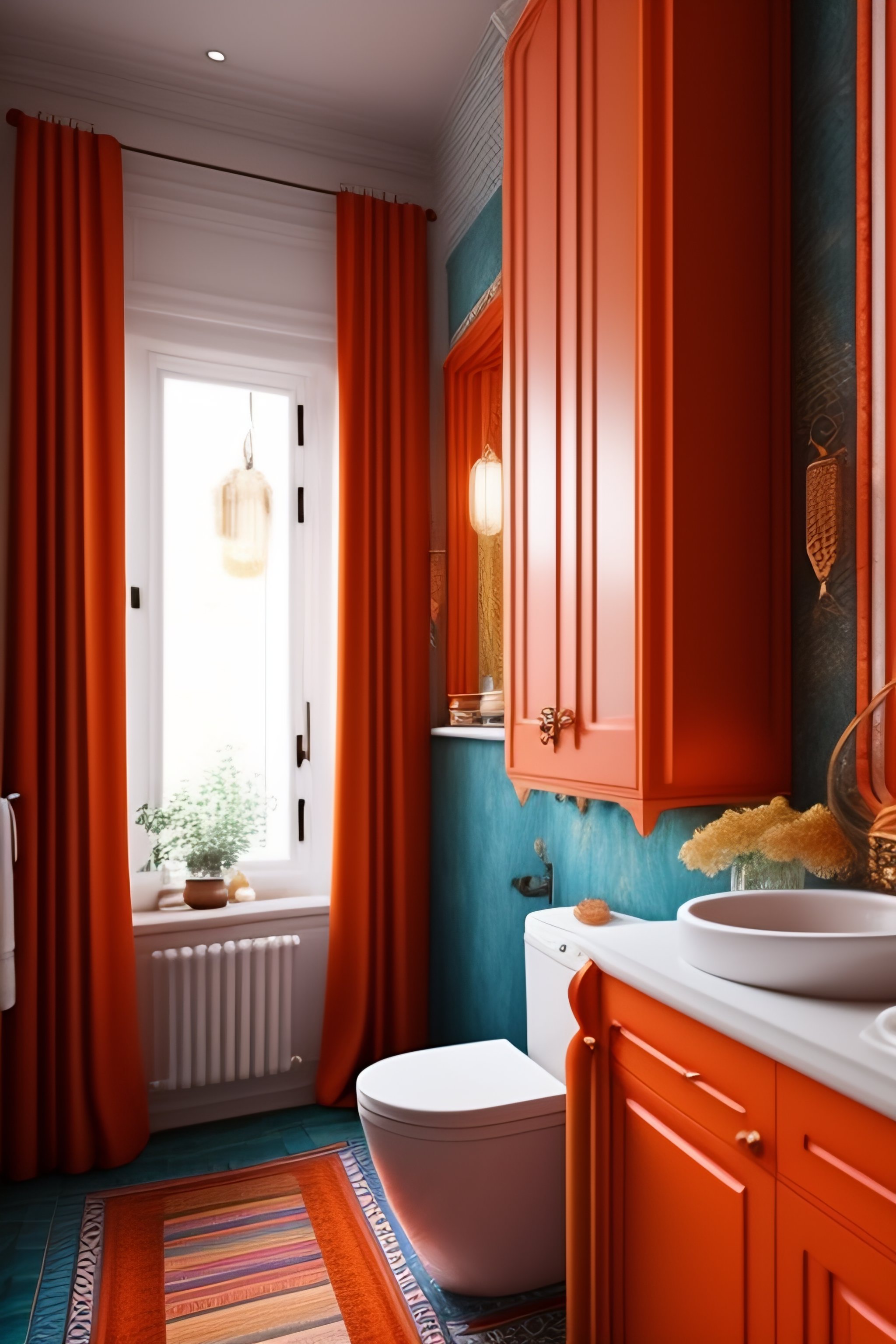 A bohemian styled bathroom in orange