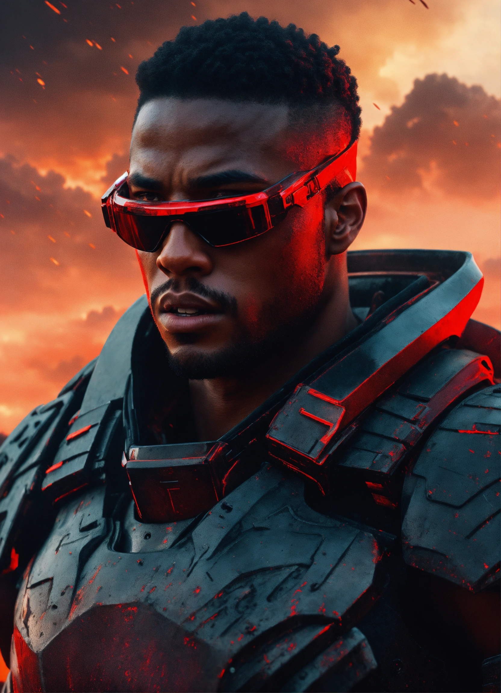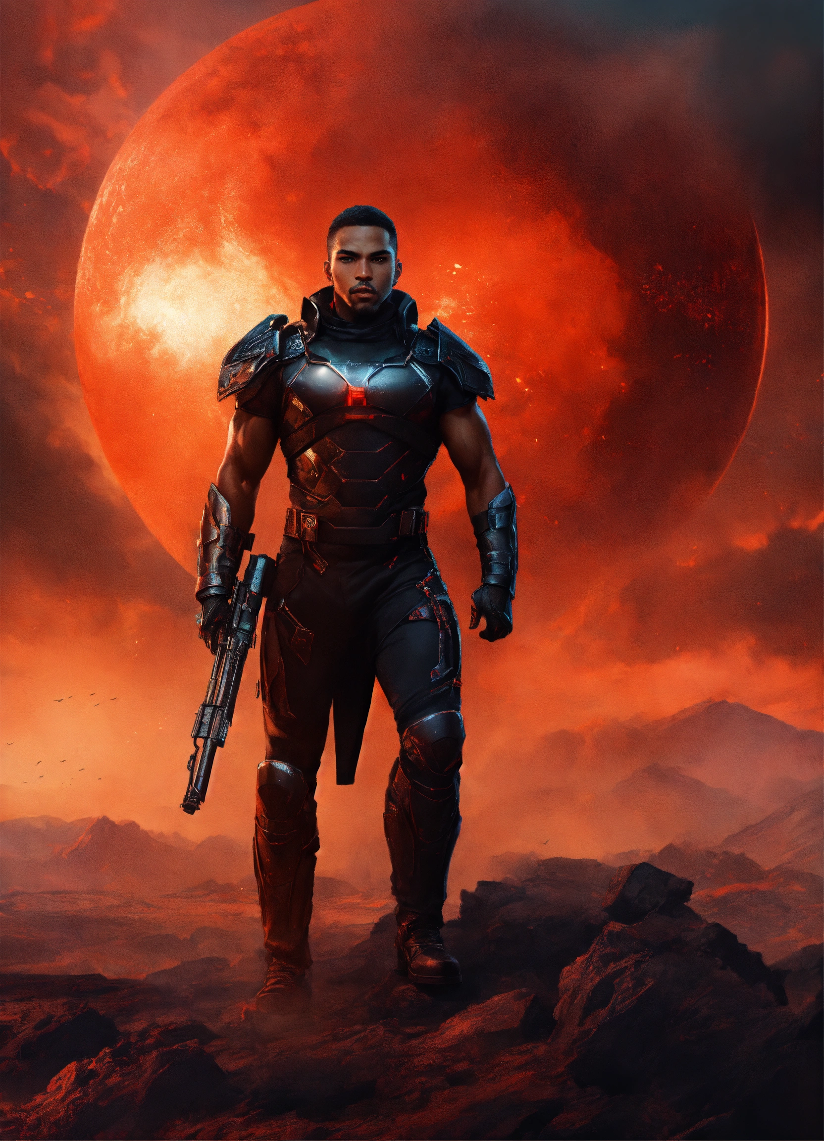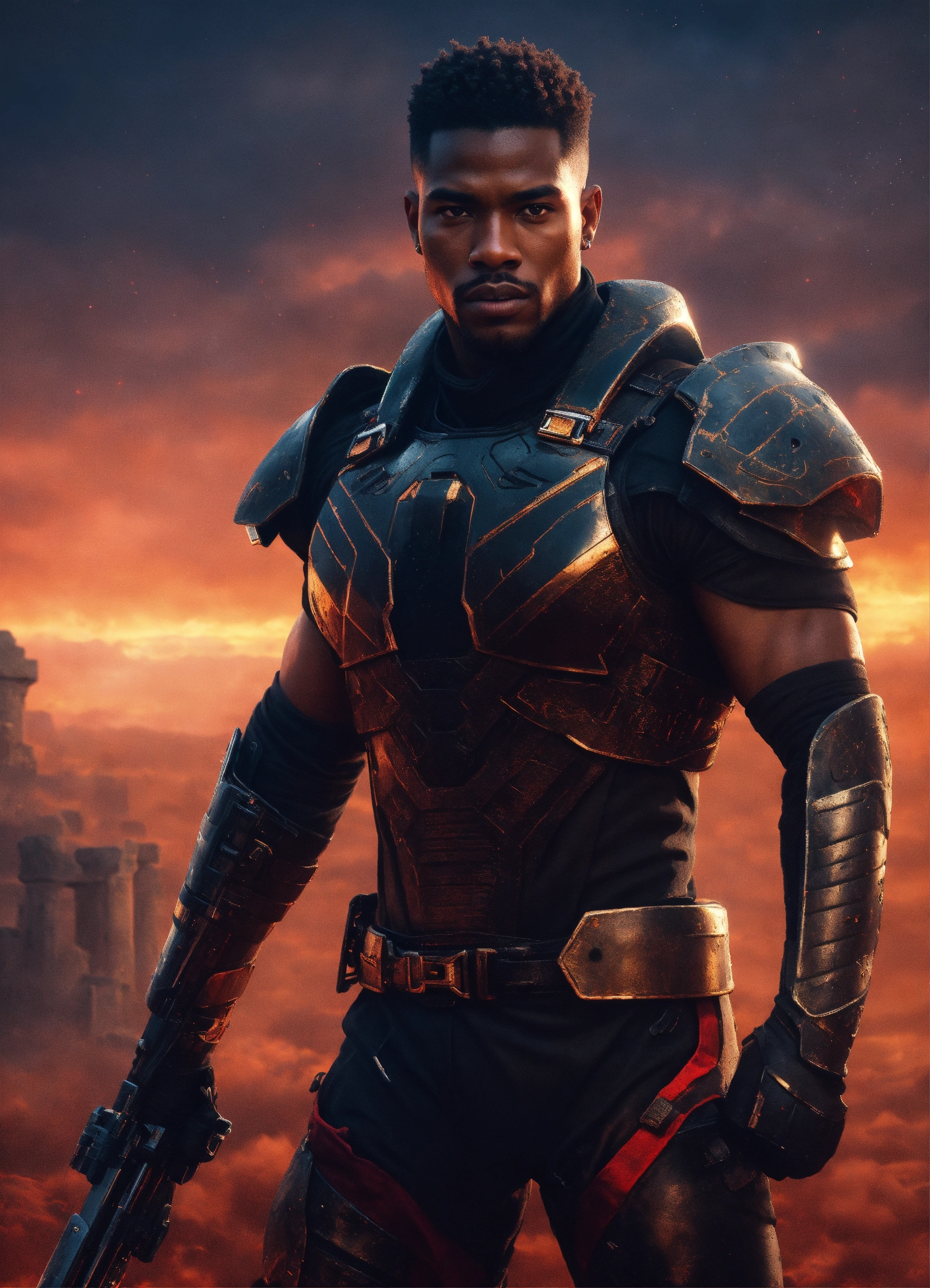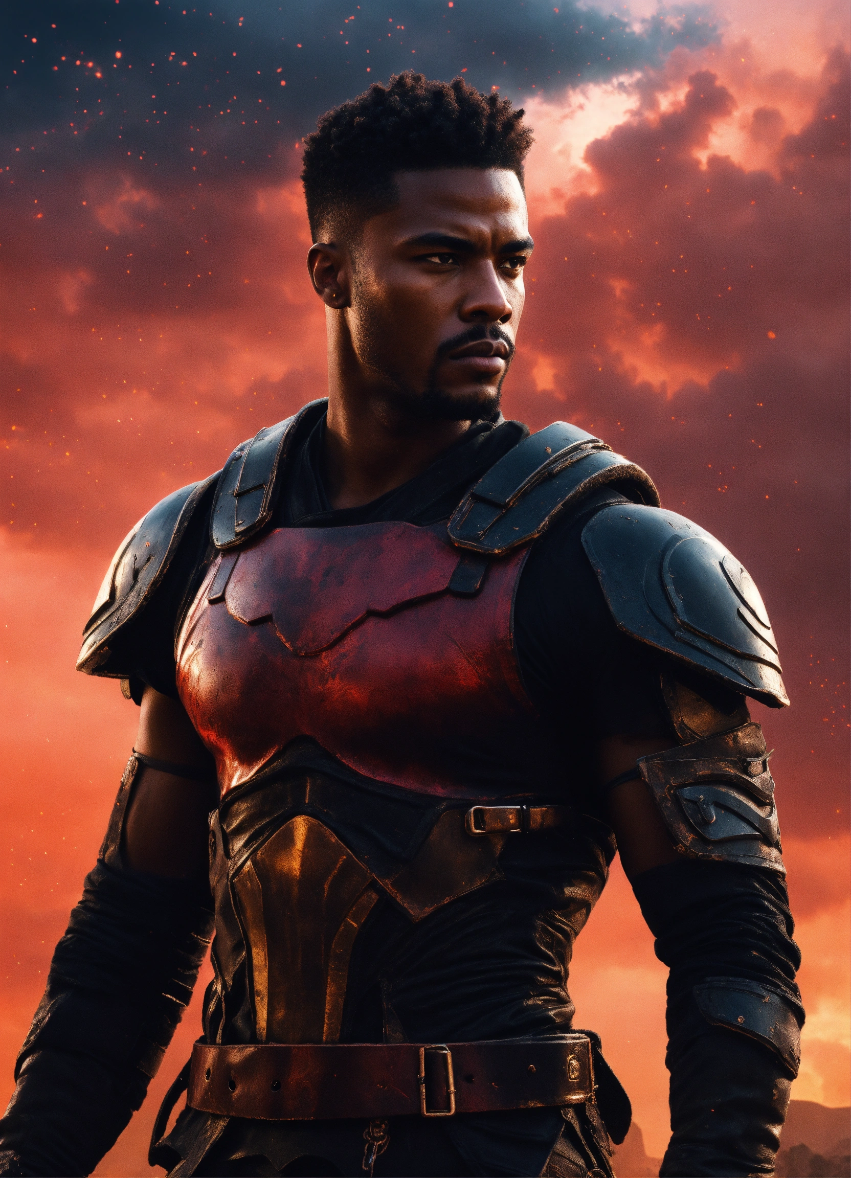Young strong handsome black futuristic warrior, front facing in an arena, front facing strong handsome god with short hair wearing a black leather super spy stealth suit, muscular dark skinned black male god warrior, short hair handsome male god, front facing, on a distant planet with ruins of an ancient arena and a violent red sky behind him and warriors in the mist watching him, fantasy, high detail, realistic photo, high detail, digital painting, cinematic, stunning, hyper-realistic, sharp focus, high resolution 8k, insanely detailed