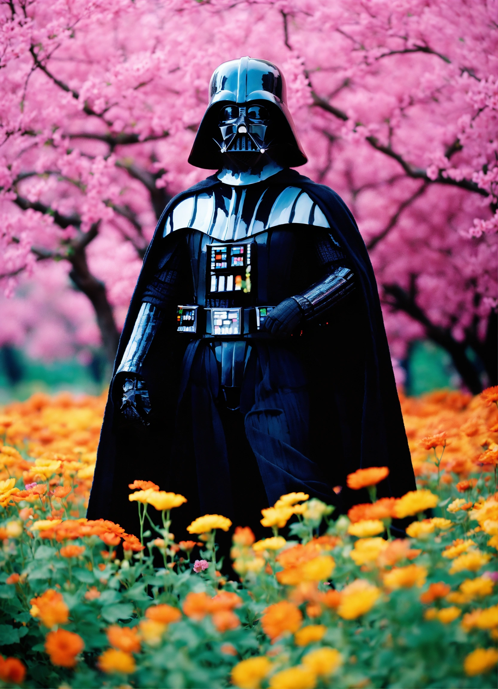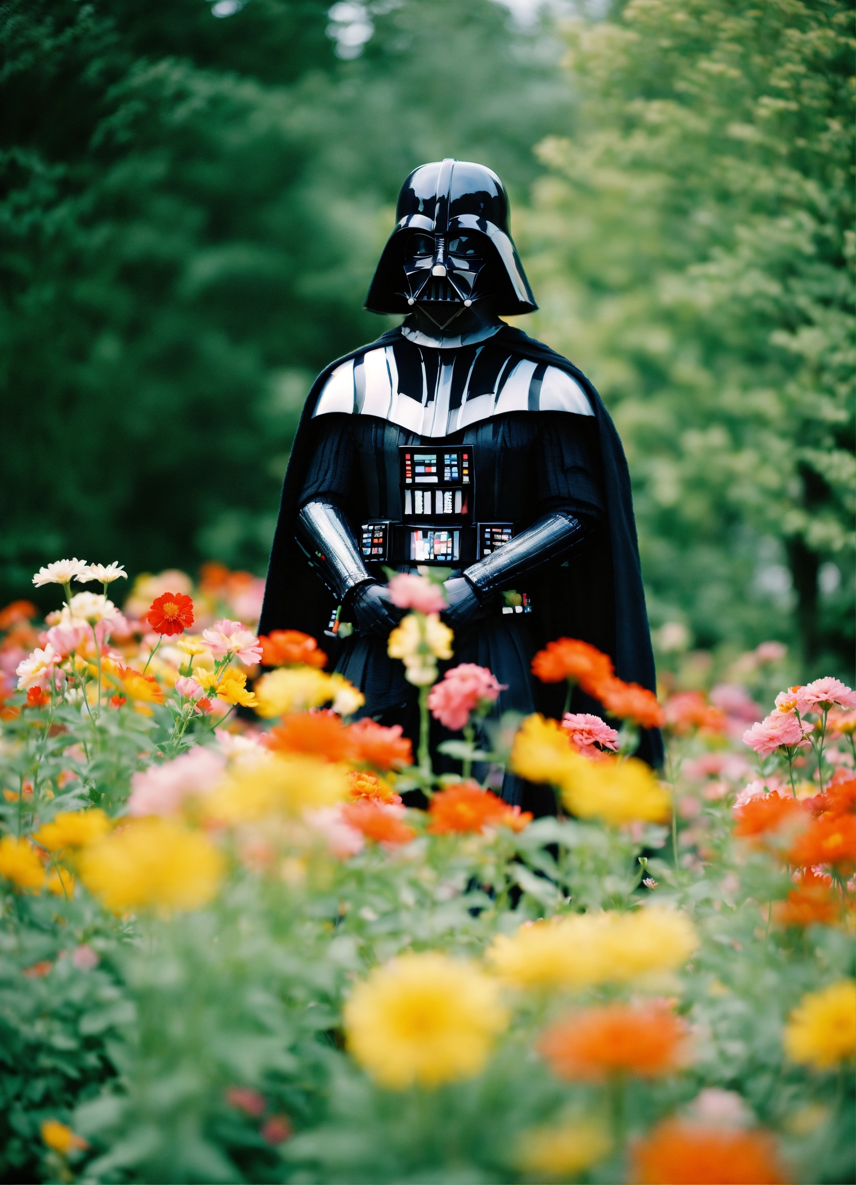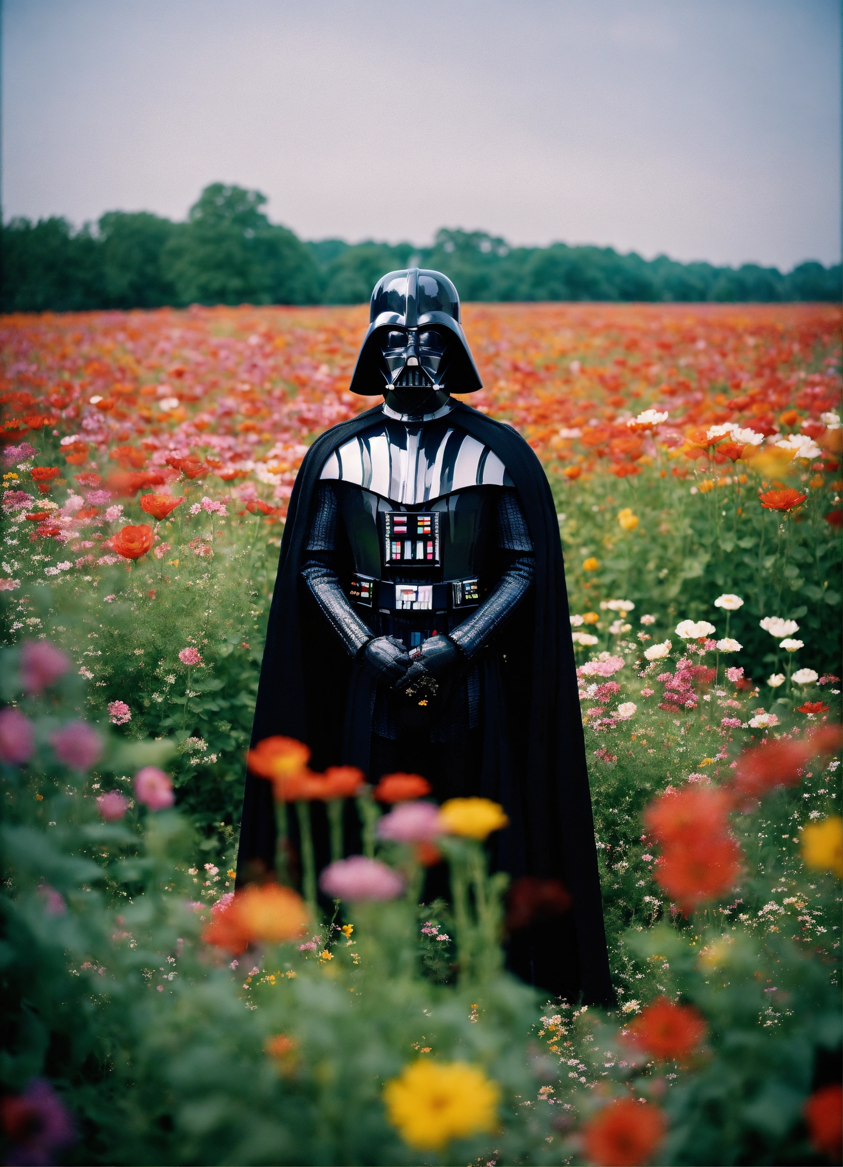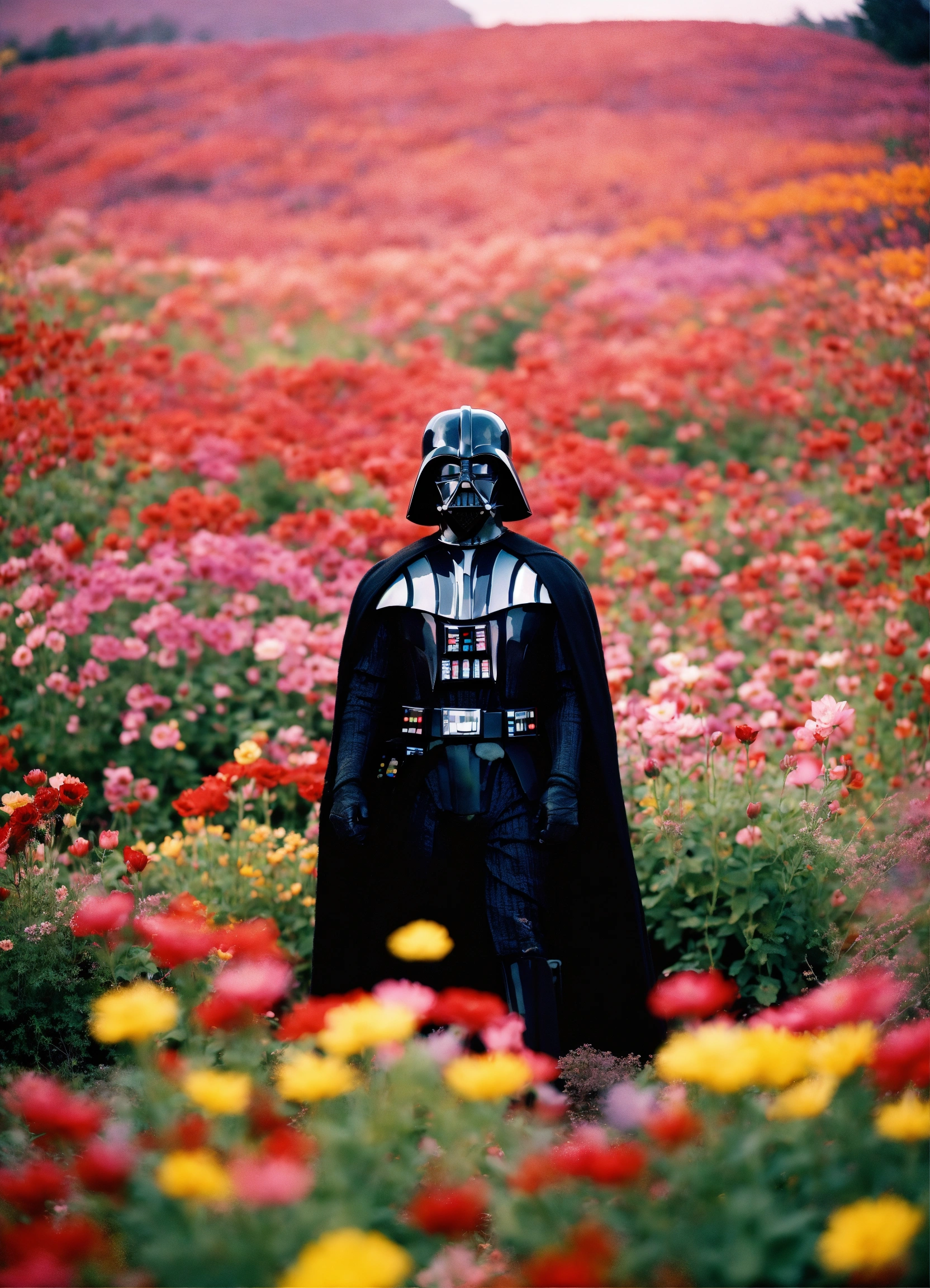 Darth vader in a beautiful field of flowers, colorful flowers everywhere, perfect lighting, leica summicron 35mm f2.0, kodak portra 400, film grain, naruto fan art