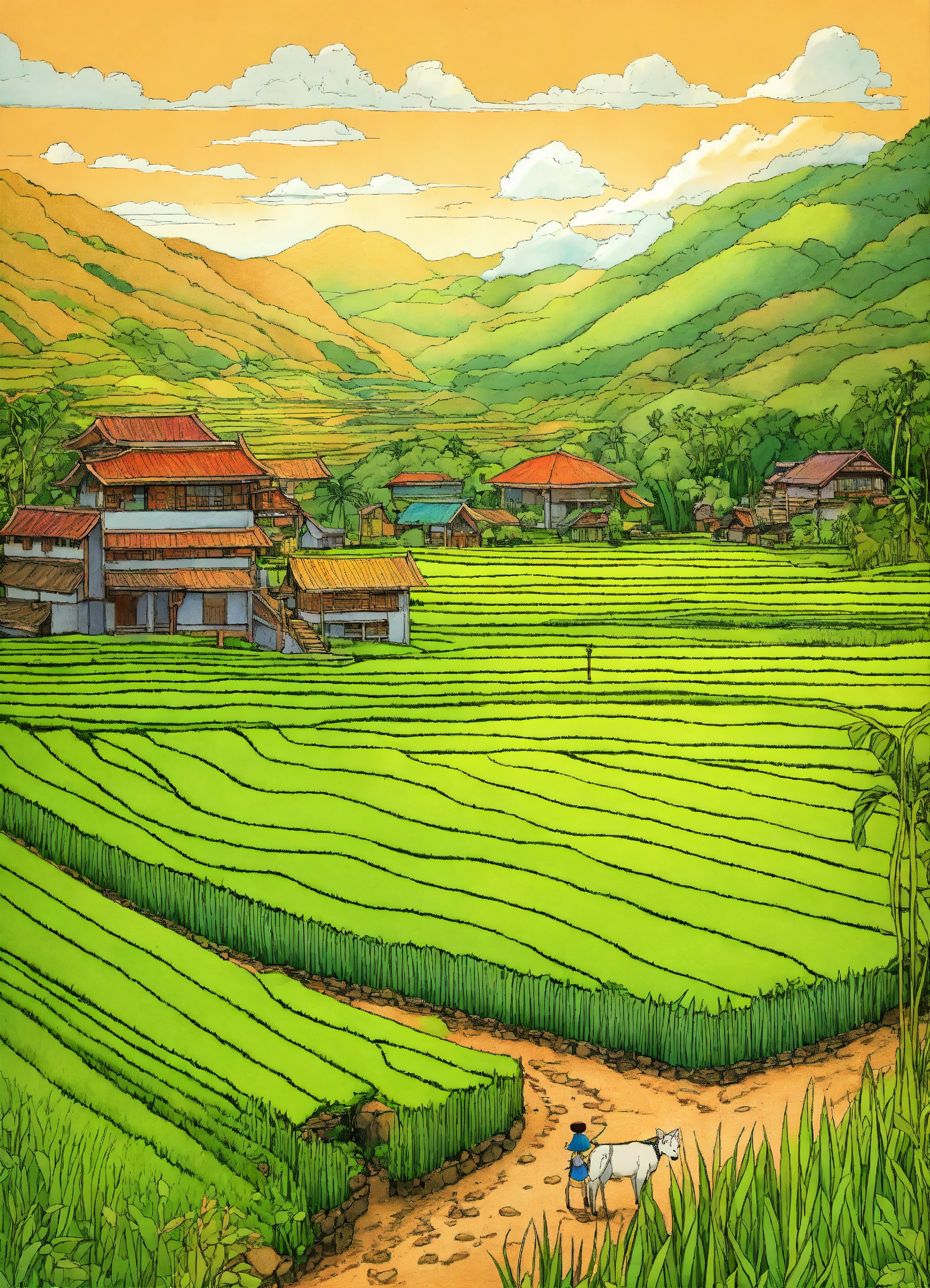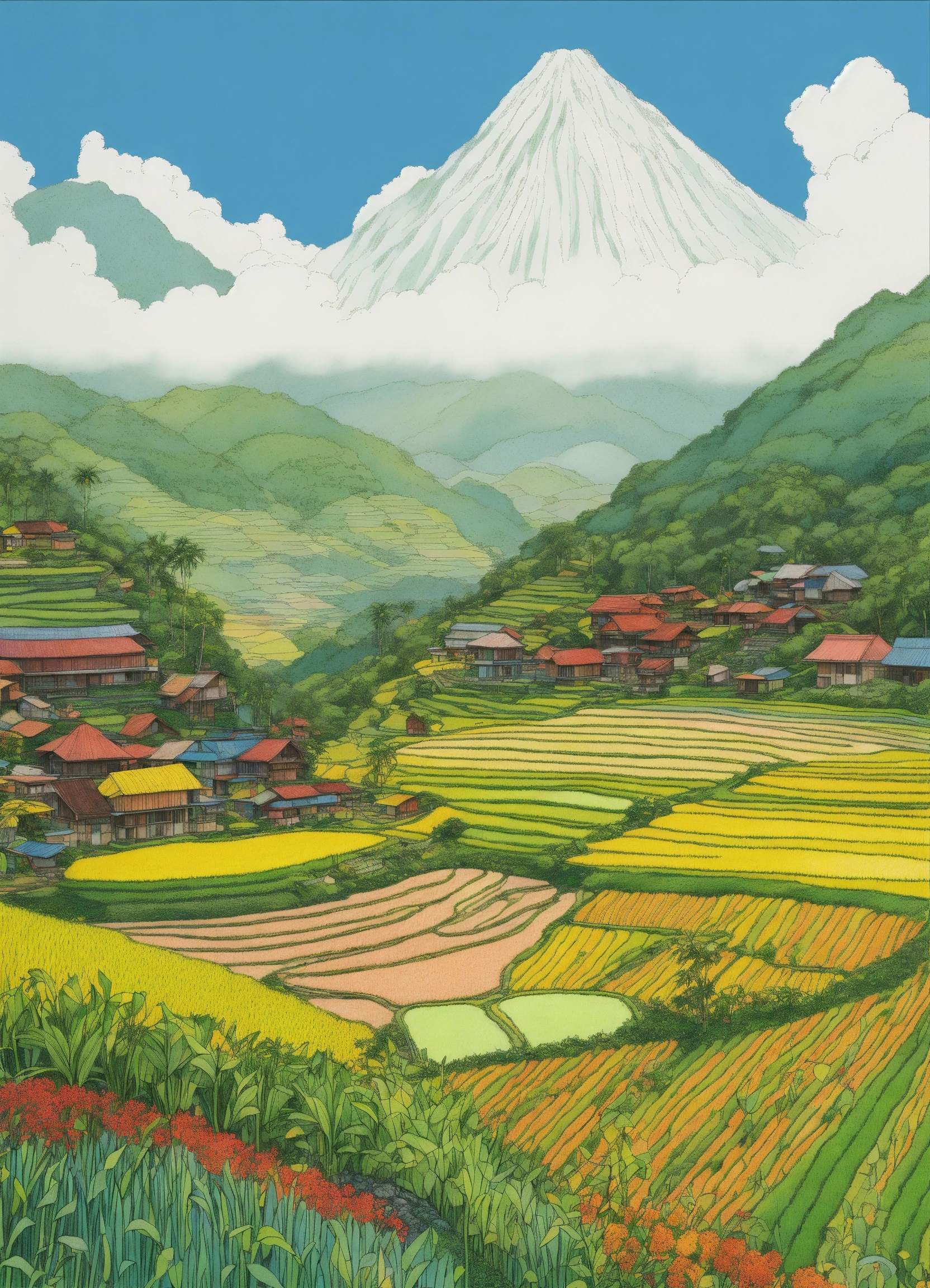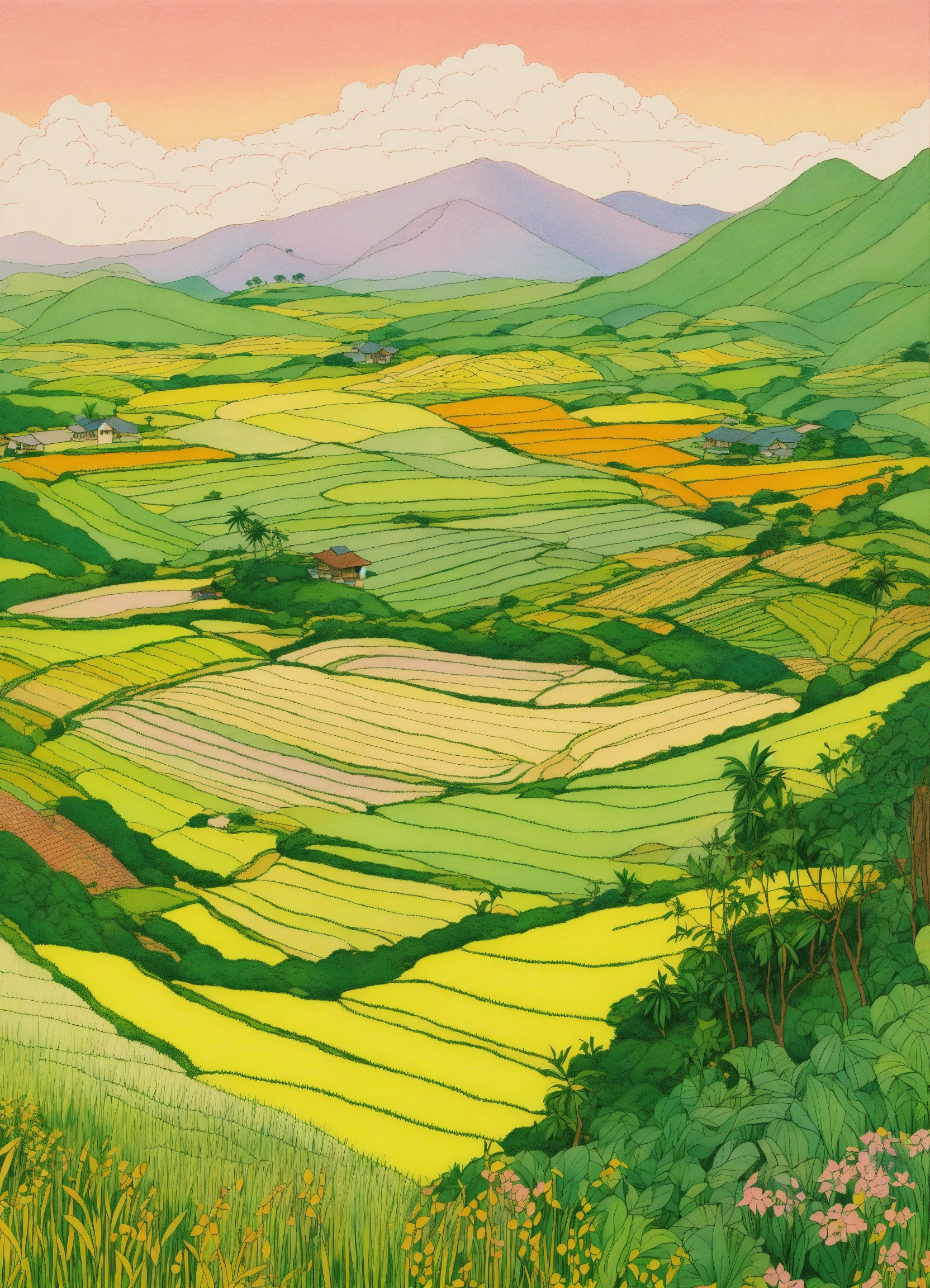 Drawing rice field terrasses on mountains in the philippines. line drawing, clean clear lines, coloring book style, bright colors, intricate details, elegant, discreete, serene, magical, peaceful, fine detail, pastel pencils, winsor mccay style.