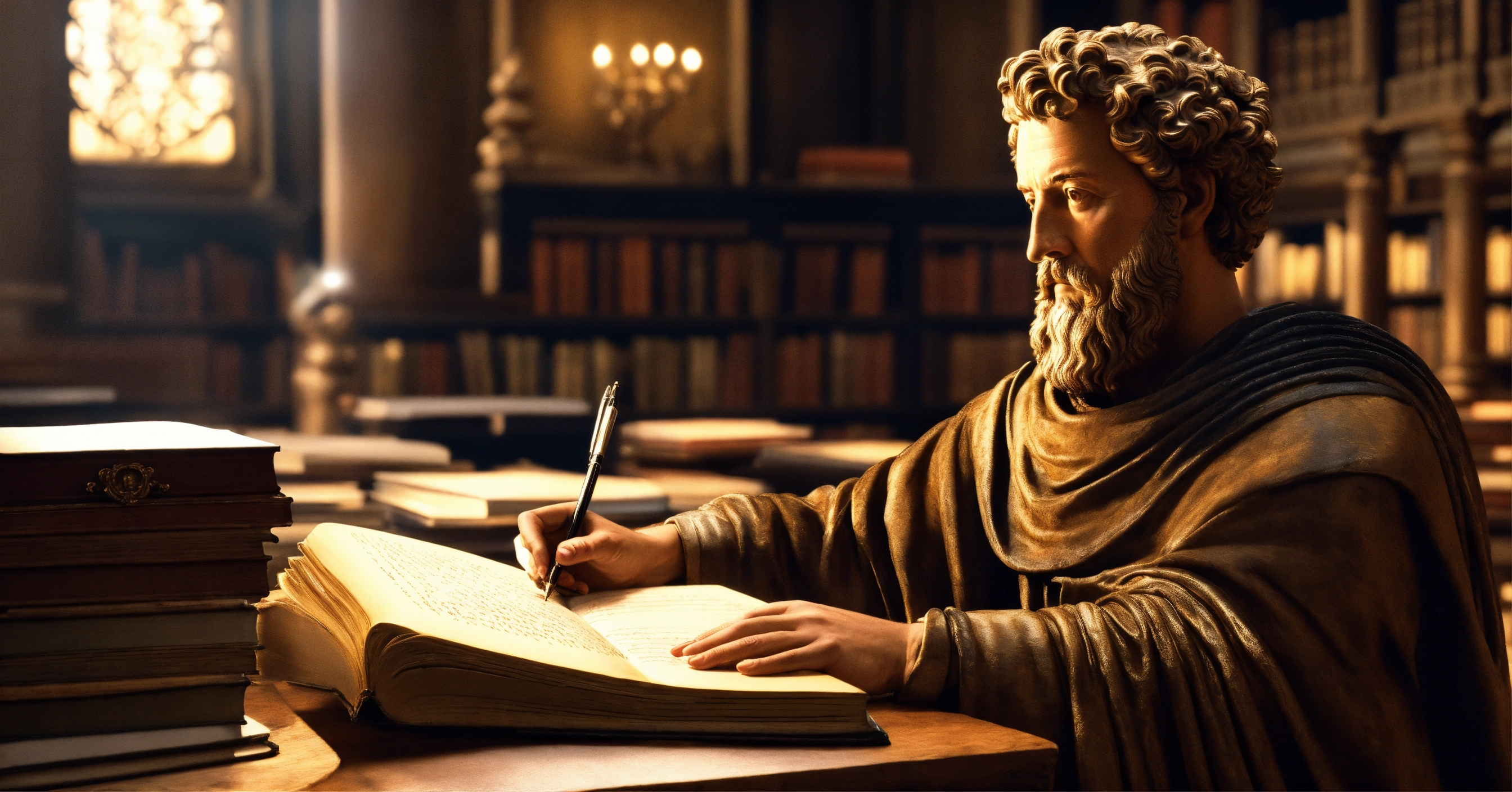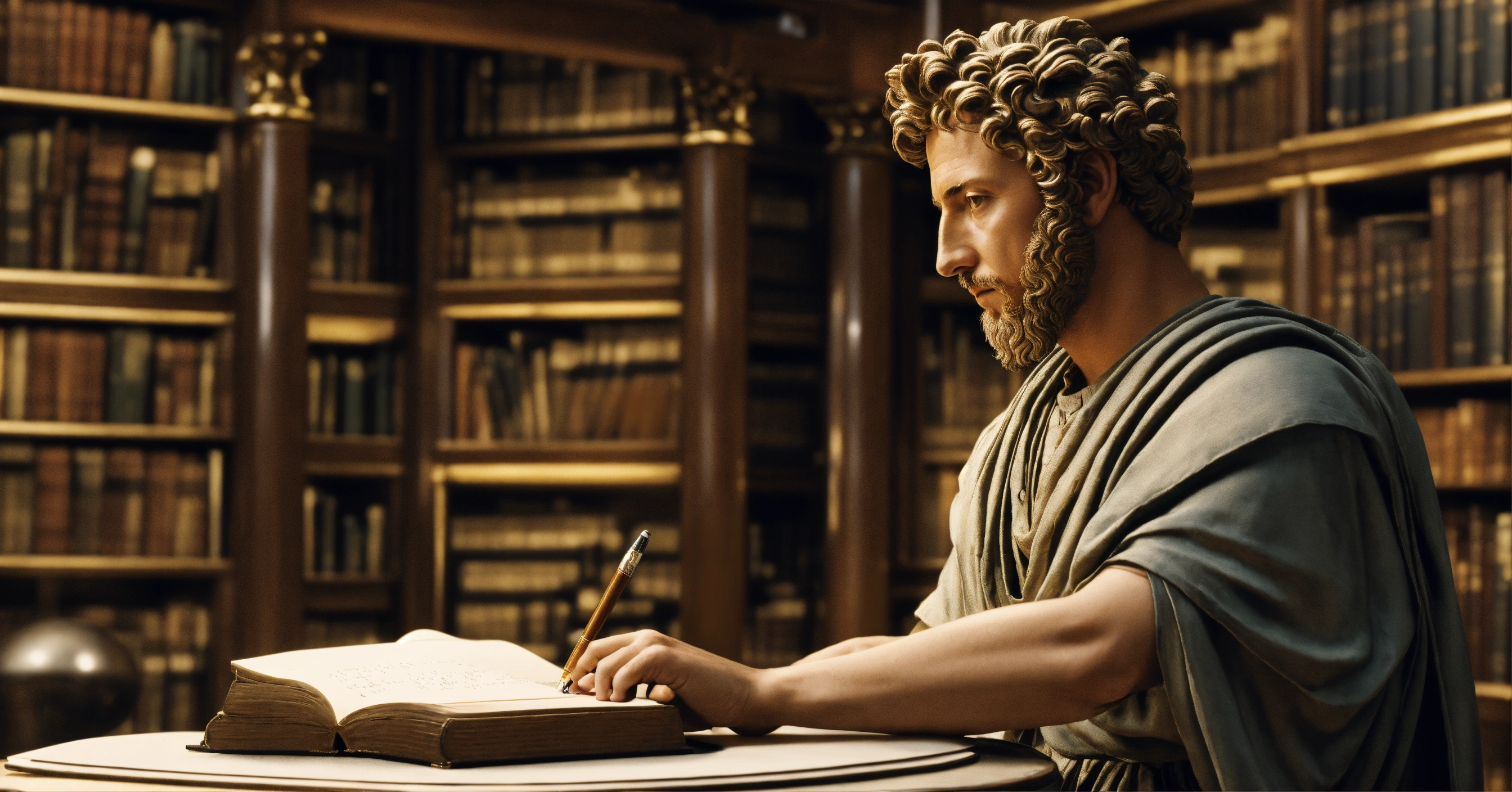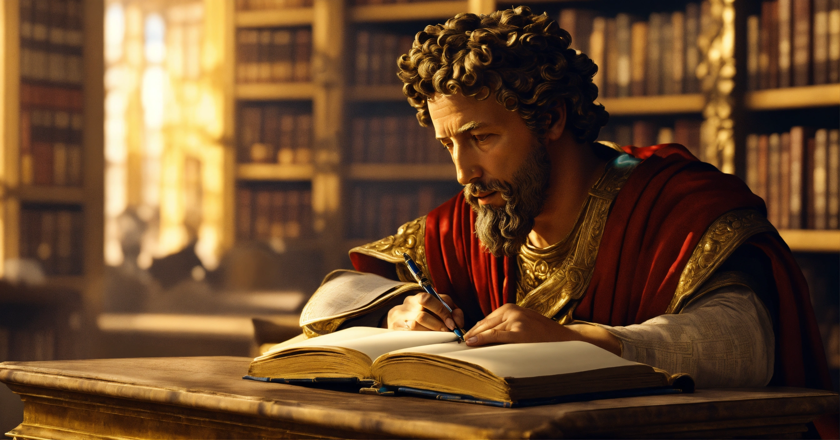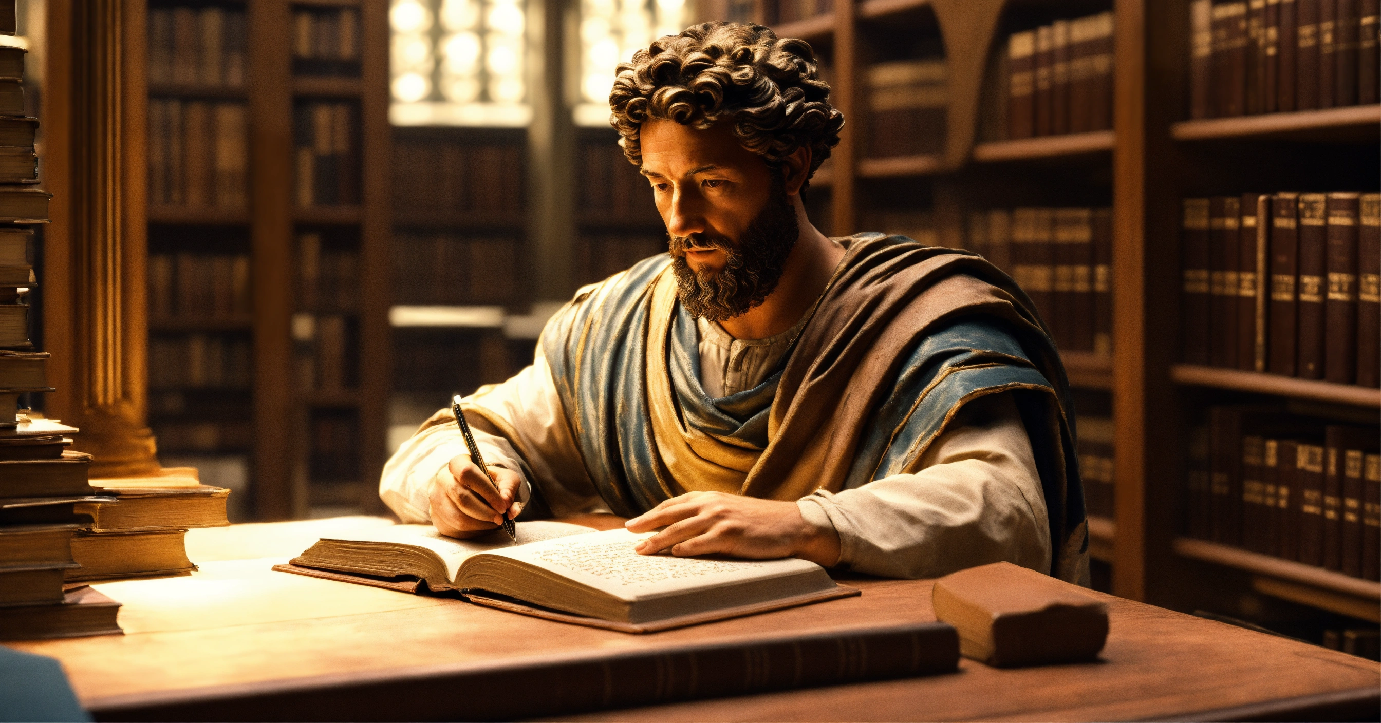 Marcus aurelius, learning, writing, in a library, accumulates facts, realistic, well done, detailed, 8k