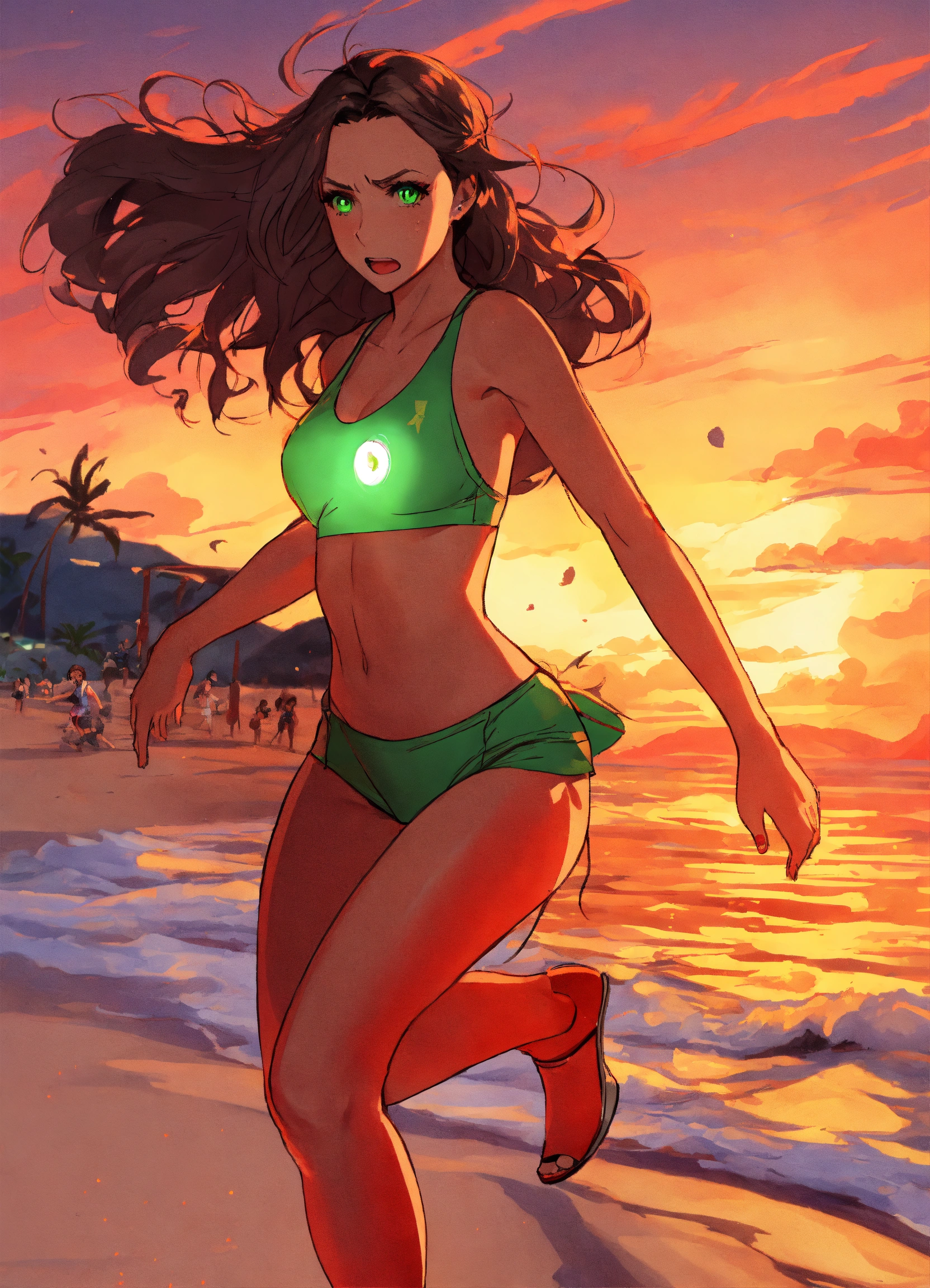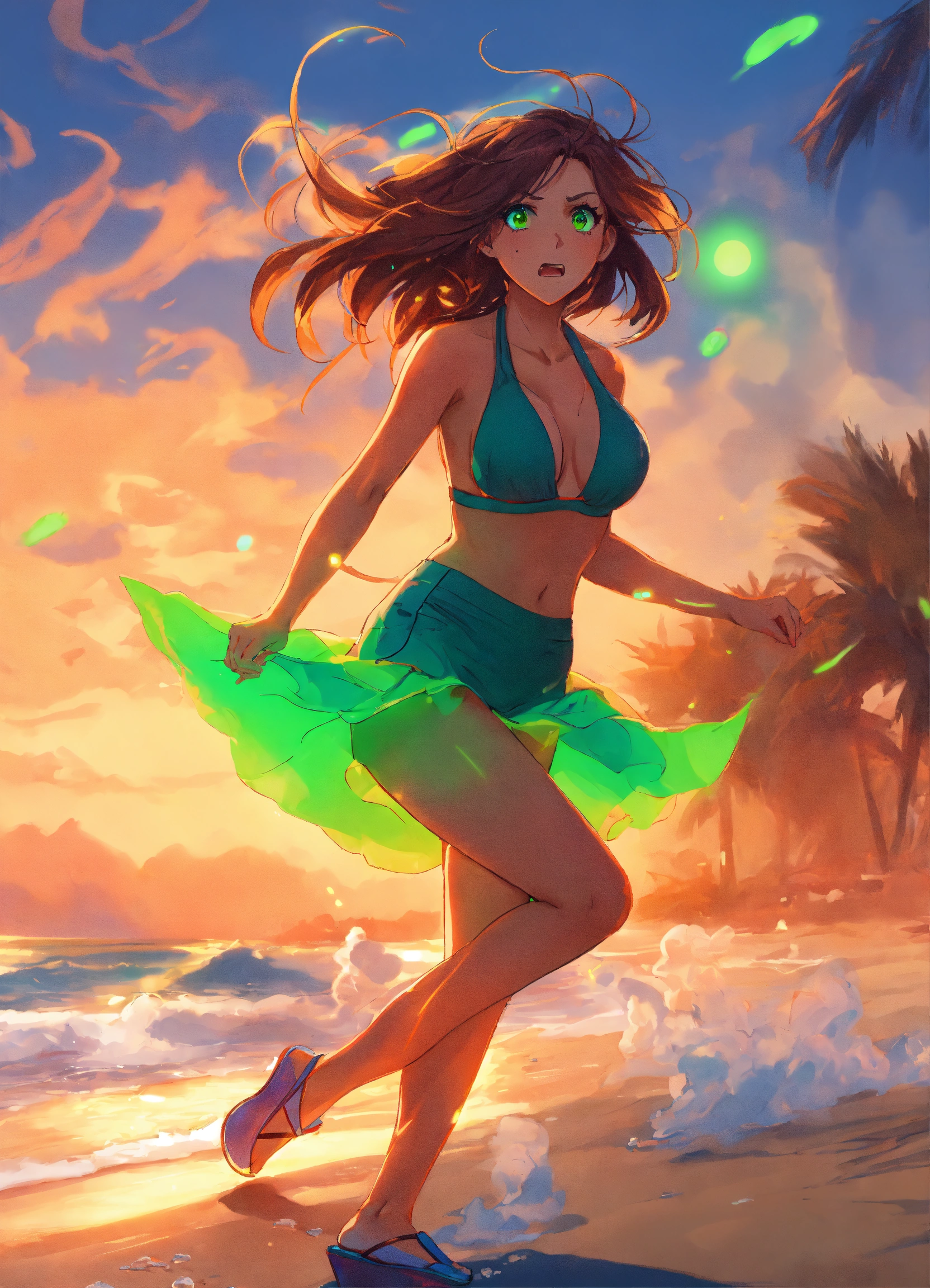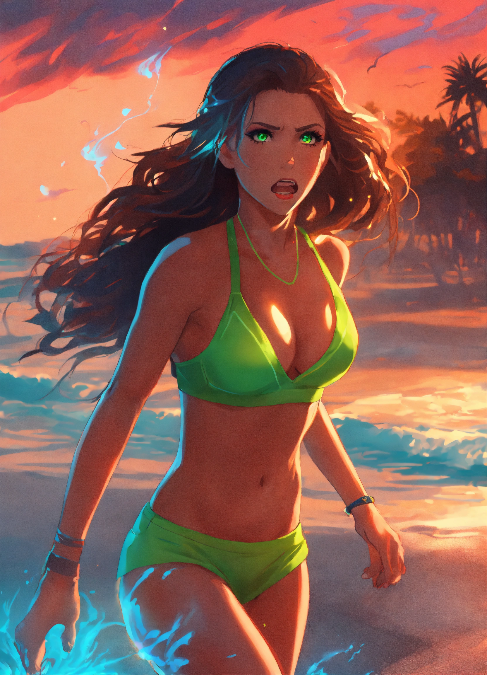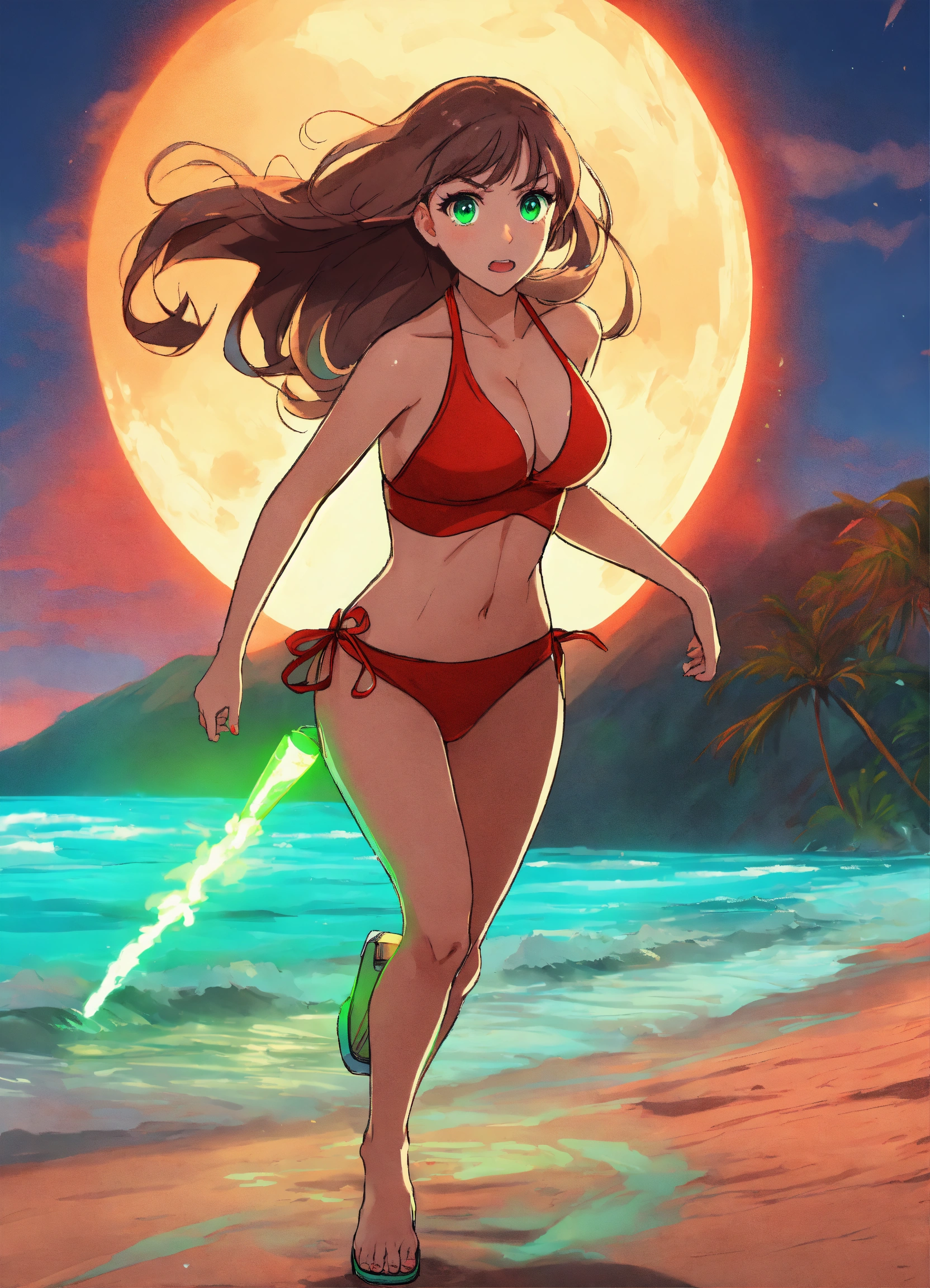 Anime illustration full body image of scared and afraid lacey chabert with neon green glowing eyes, being chased and running away from a tiny blue smoky orb with a smoky trail, on a day beach wearing a red two-piece swim suit, wearing wedges, shein short cover up skirt, wearing wedges, walking out, angry, swim suit, wearing wedges on feet, heavy makeup, wedge heels, glowing green eyes