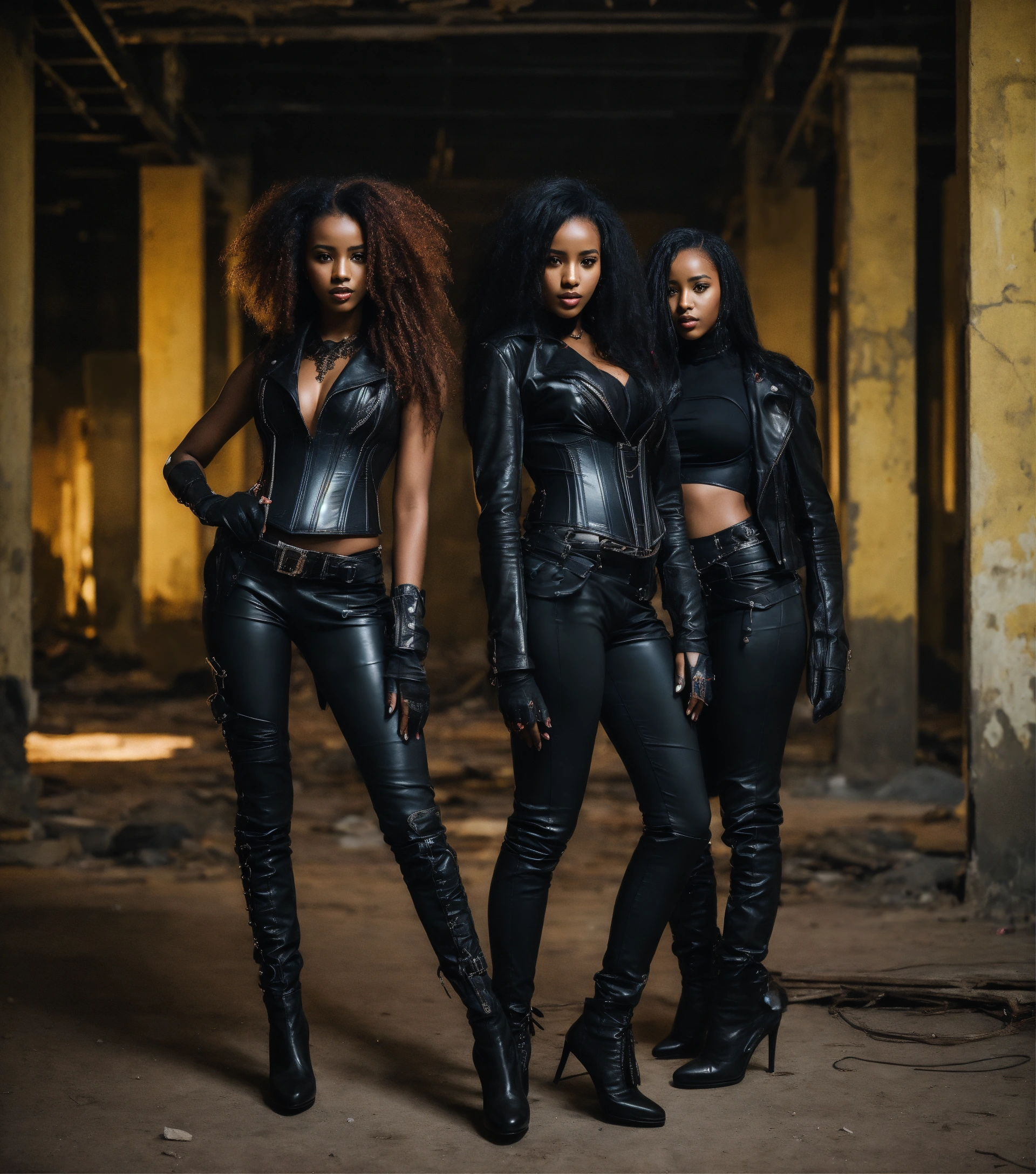 Three stunning young ethiopian metal women with very long hair posing in in a dark abandoned bulding wearing a black leather corset and black leather gloves, leather jackets and pants, hyper-realistic, photographic portrait