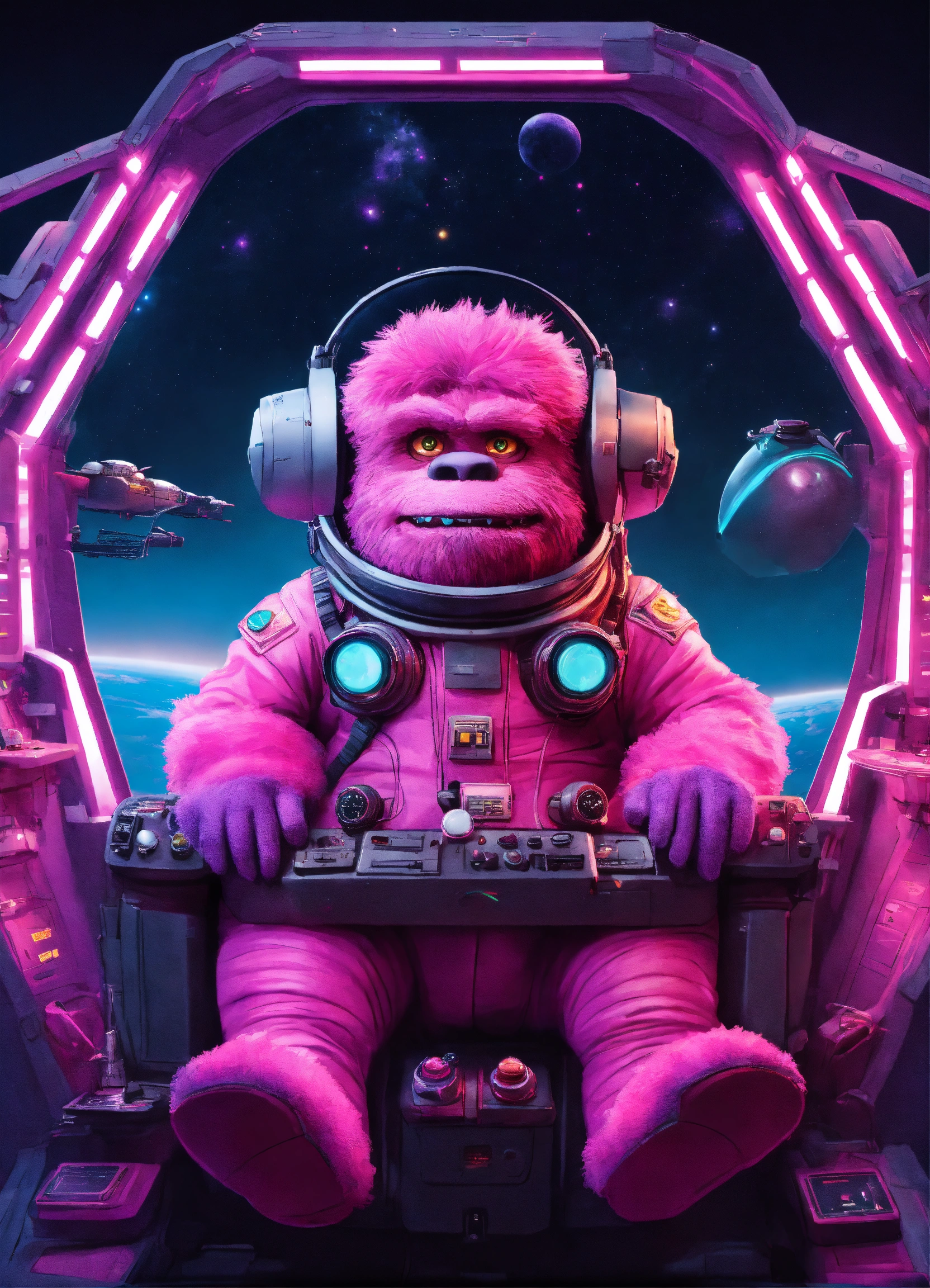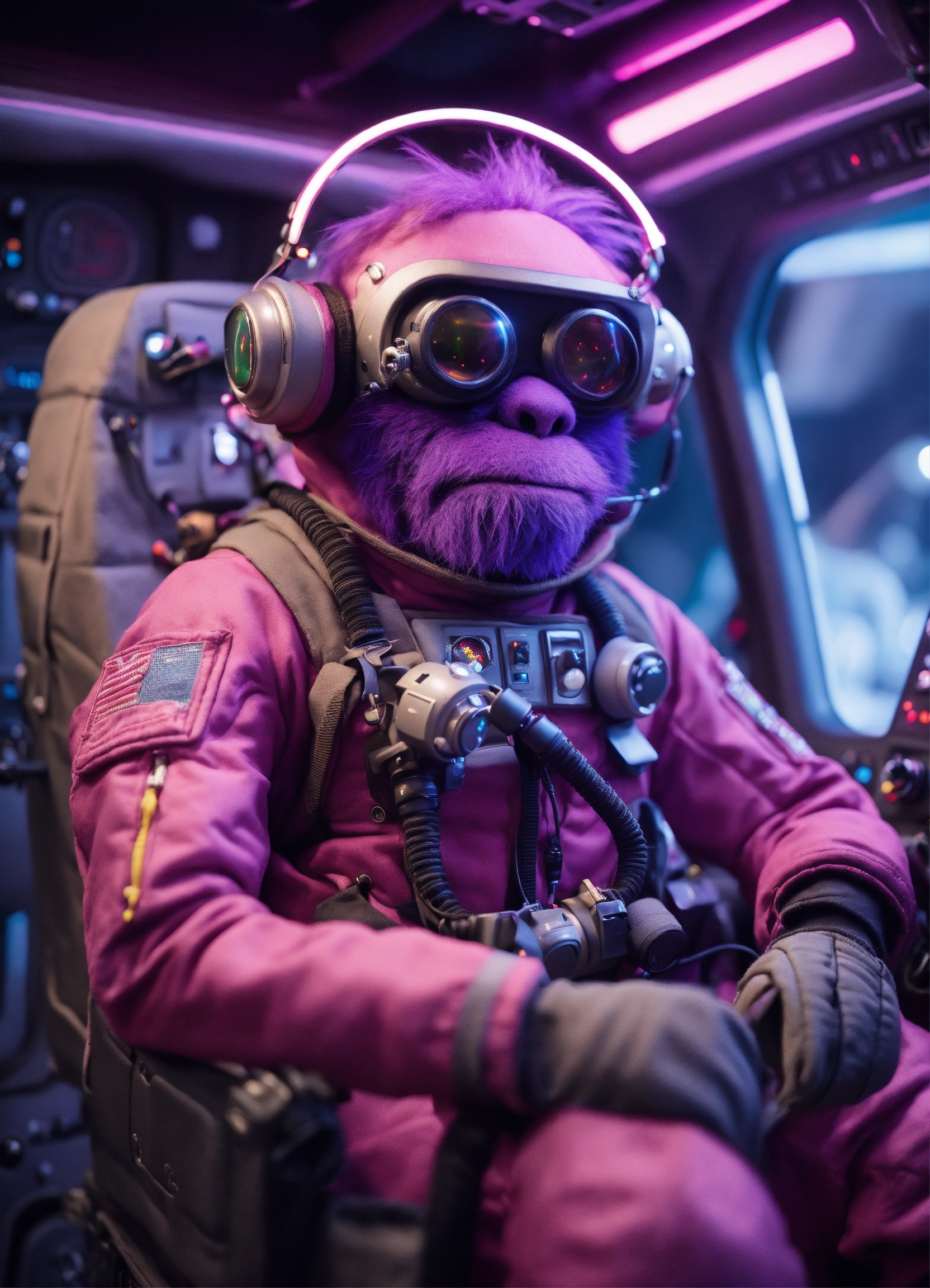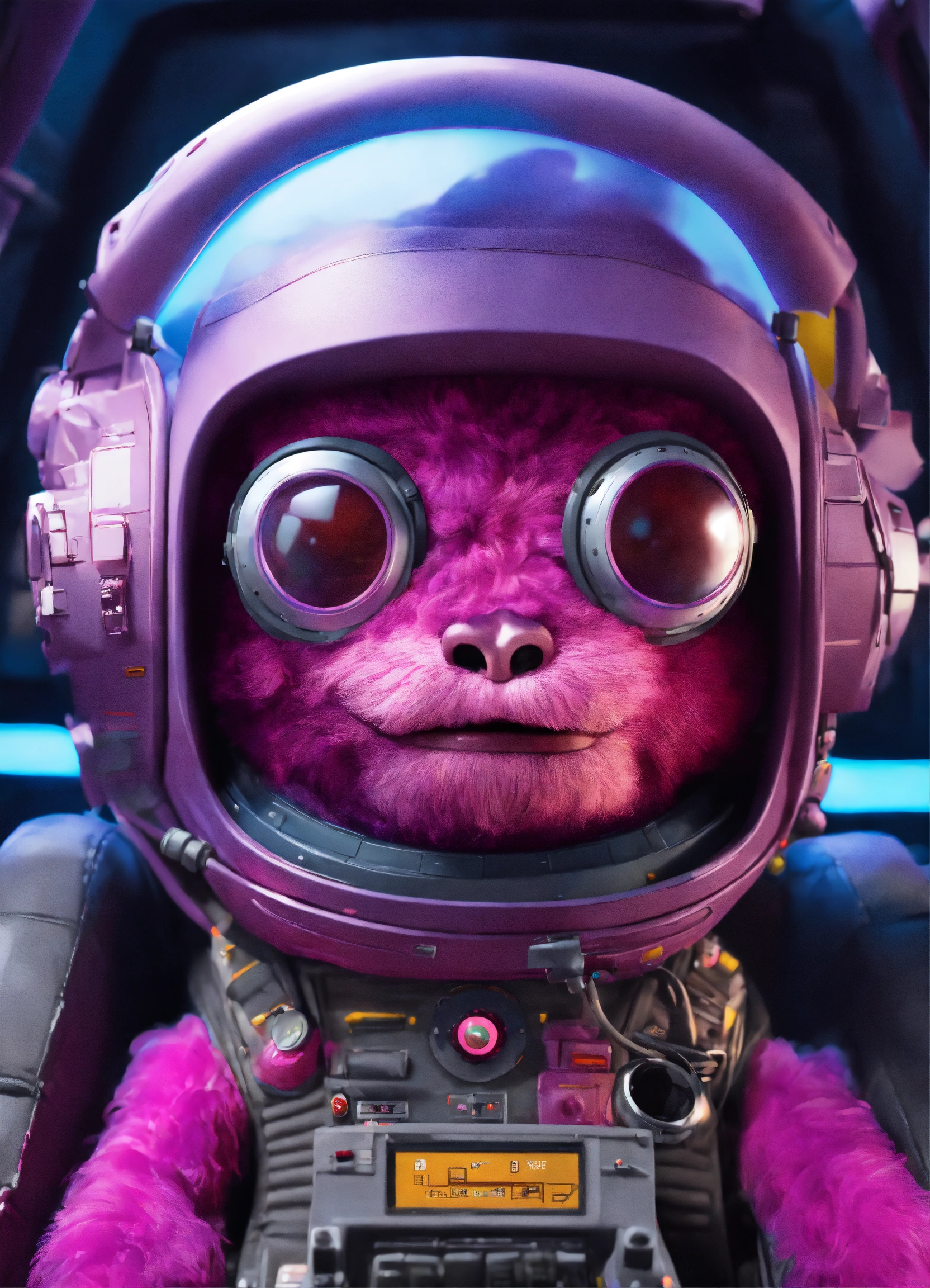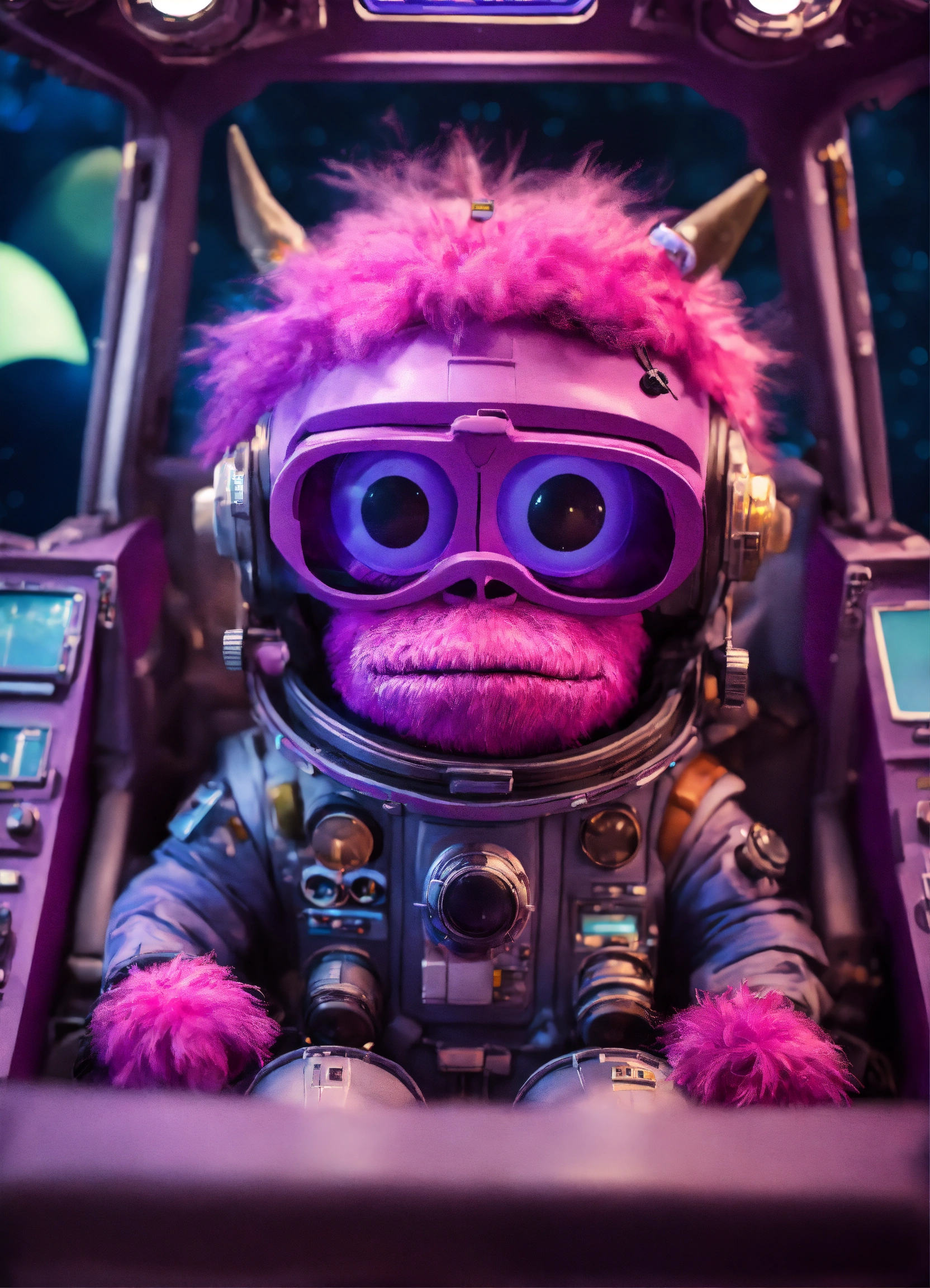 Big pink and purple hairy grimace face monster wearing space goggles and gray pilot suit, sitting in cockpit with high tech controls, knobs, and lighted buttons, pixar, realistic, fantasy