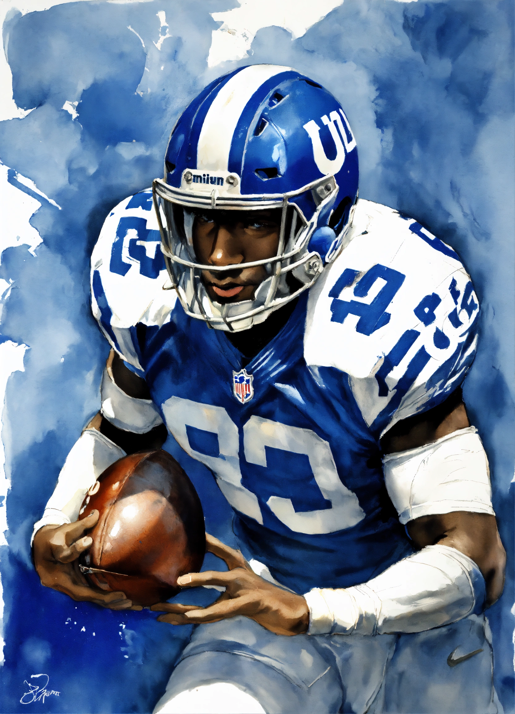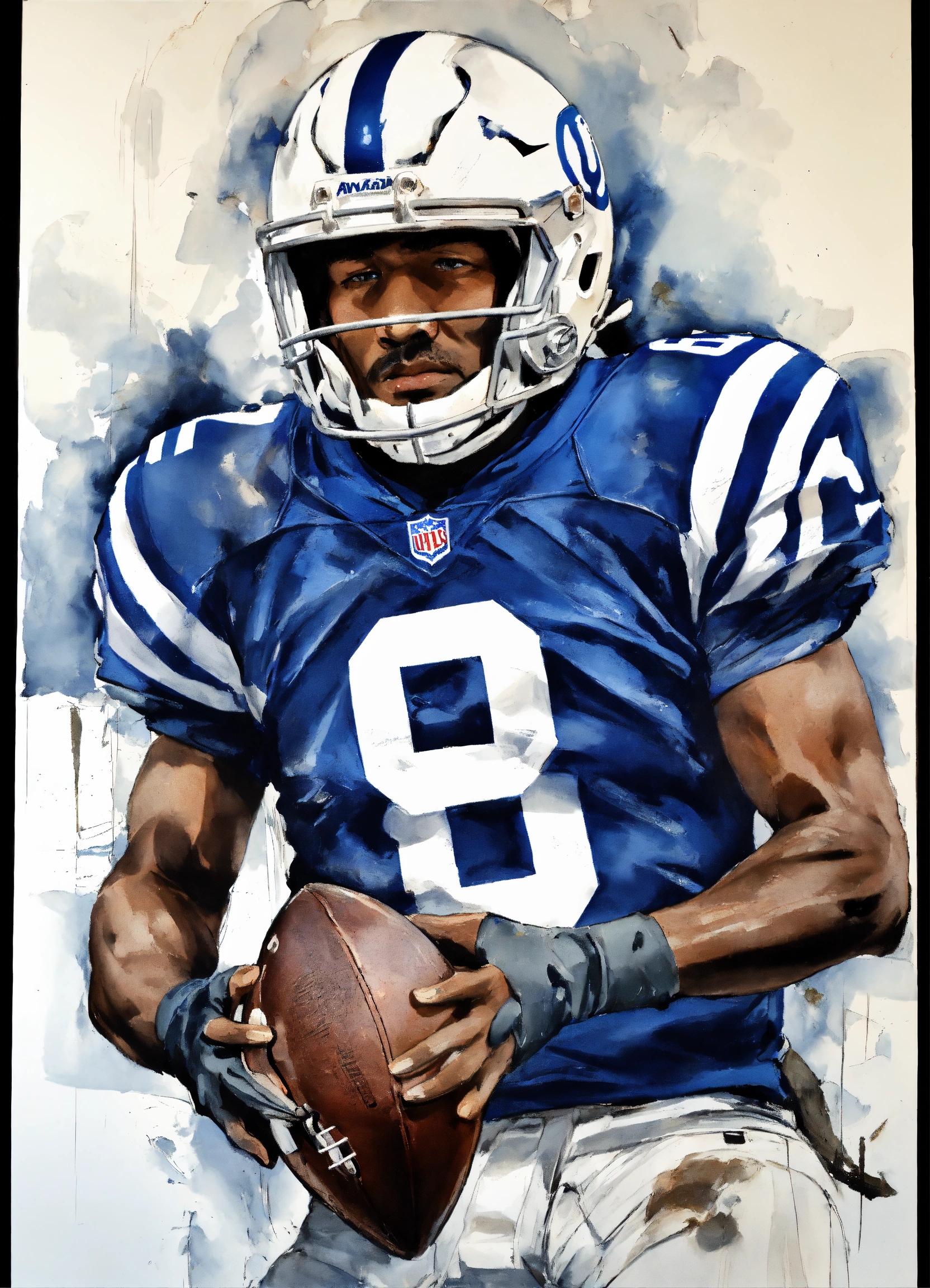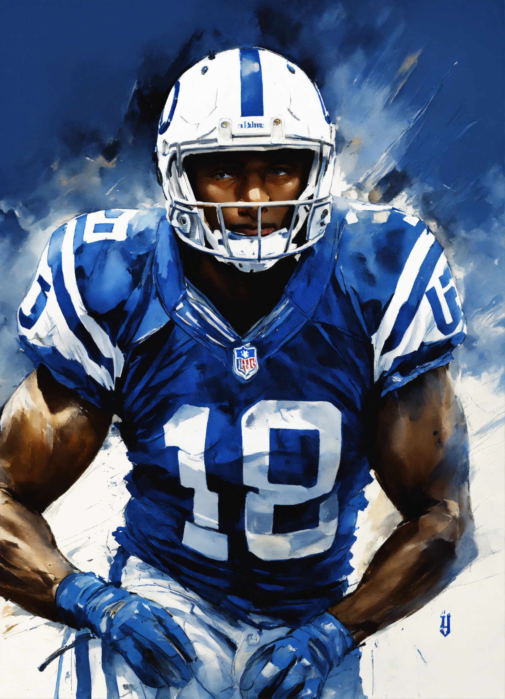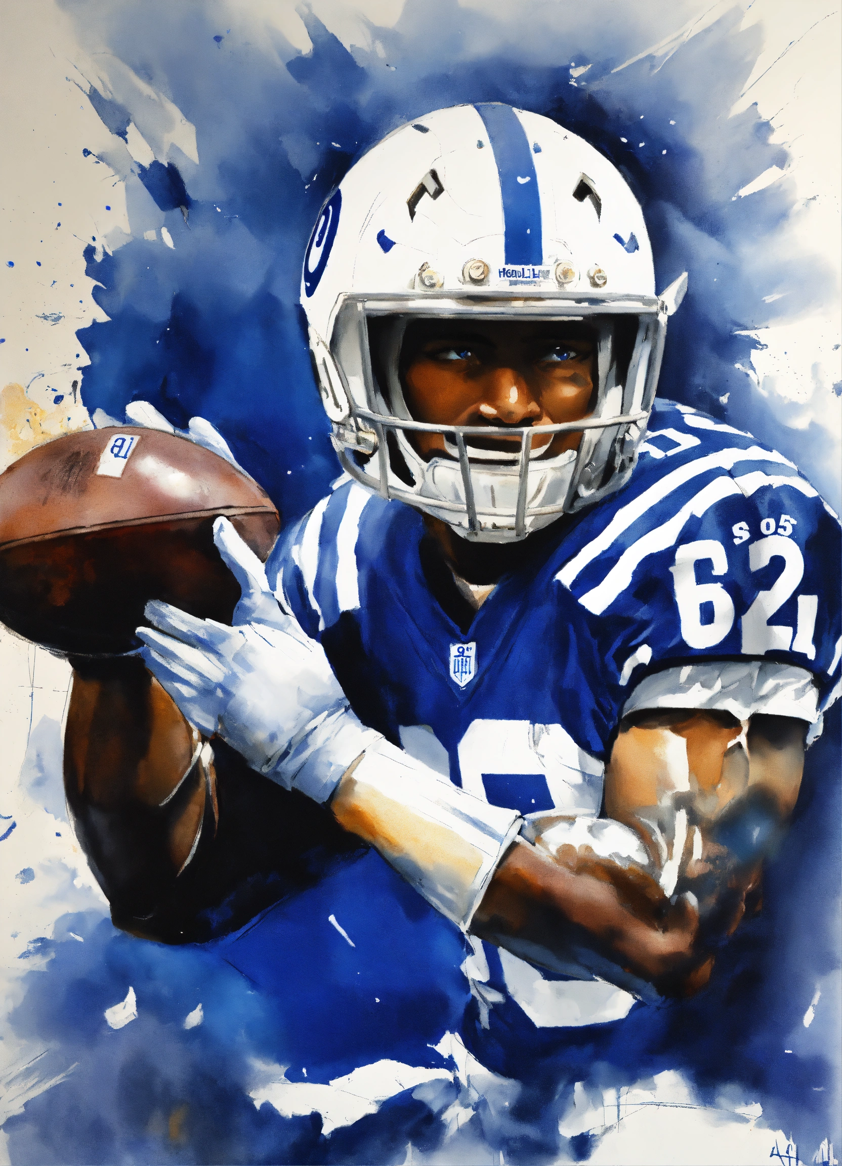 Full photo shot of a indianapolis colts, american football player, blue horseshoe on helmet yoji shinkawa style, jean-baptiste monge, bird's-eye view composition, entirely on a sheet, painting, ultra-fine detailed brushstrokes, concept art, cinematic lighting, white, (speed blue 1.3), speed blue, white, style, stylize, intricate detail, 32k, transparent background, (speed blue, white background -- ar 916) --v5.1 --seed 44444