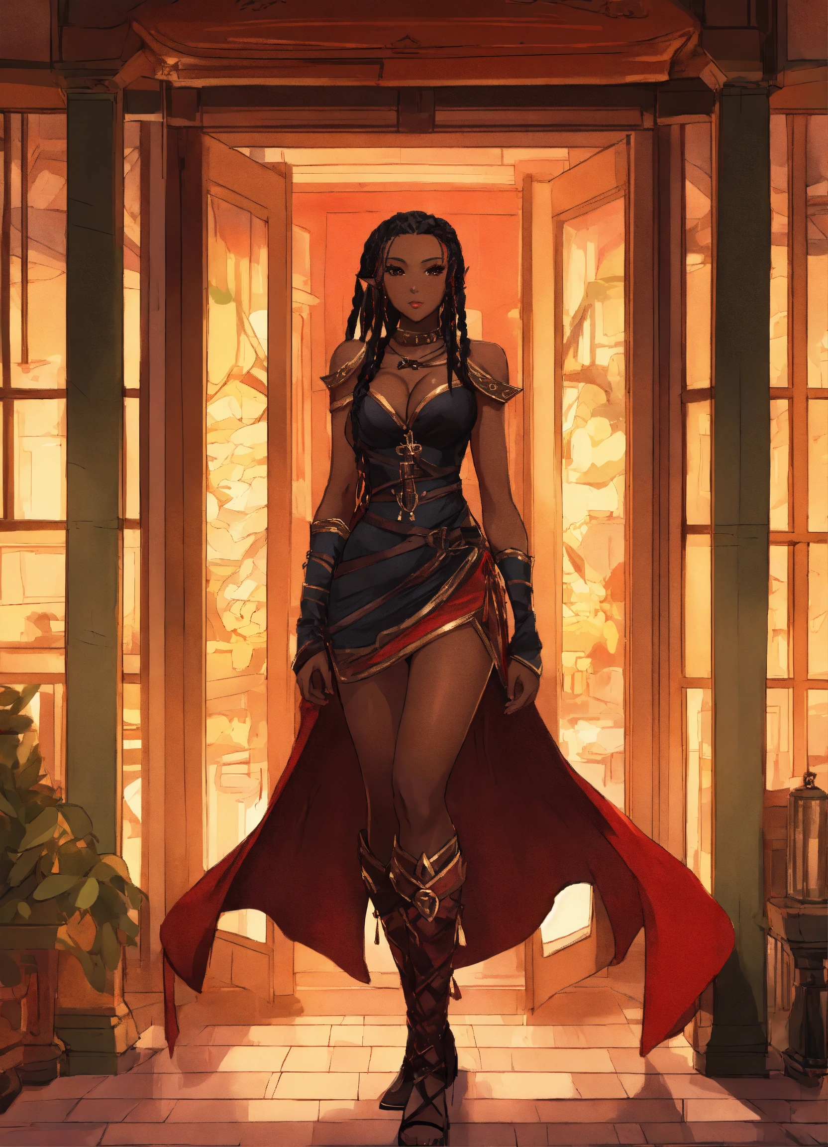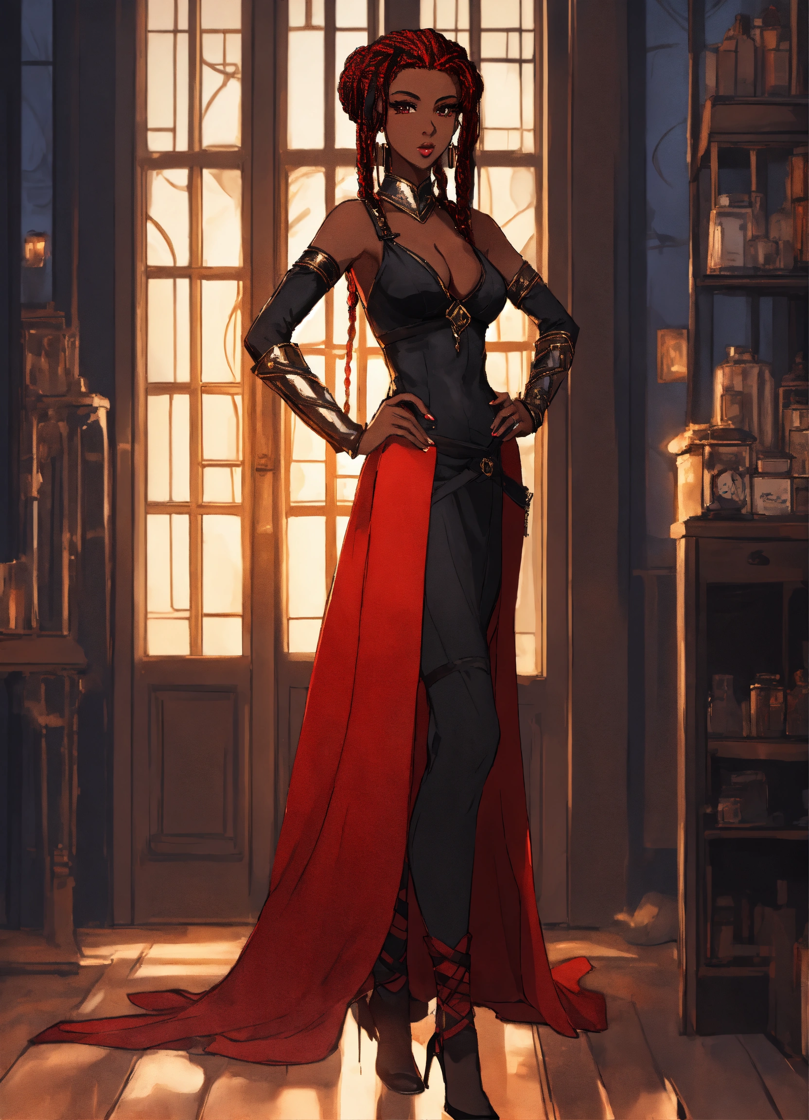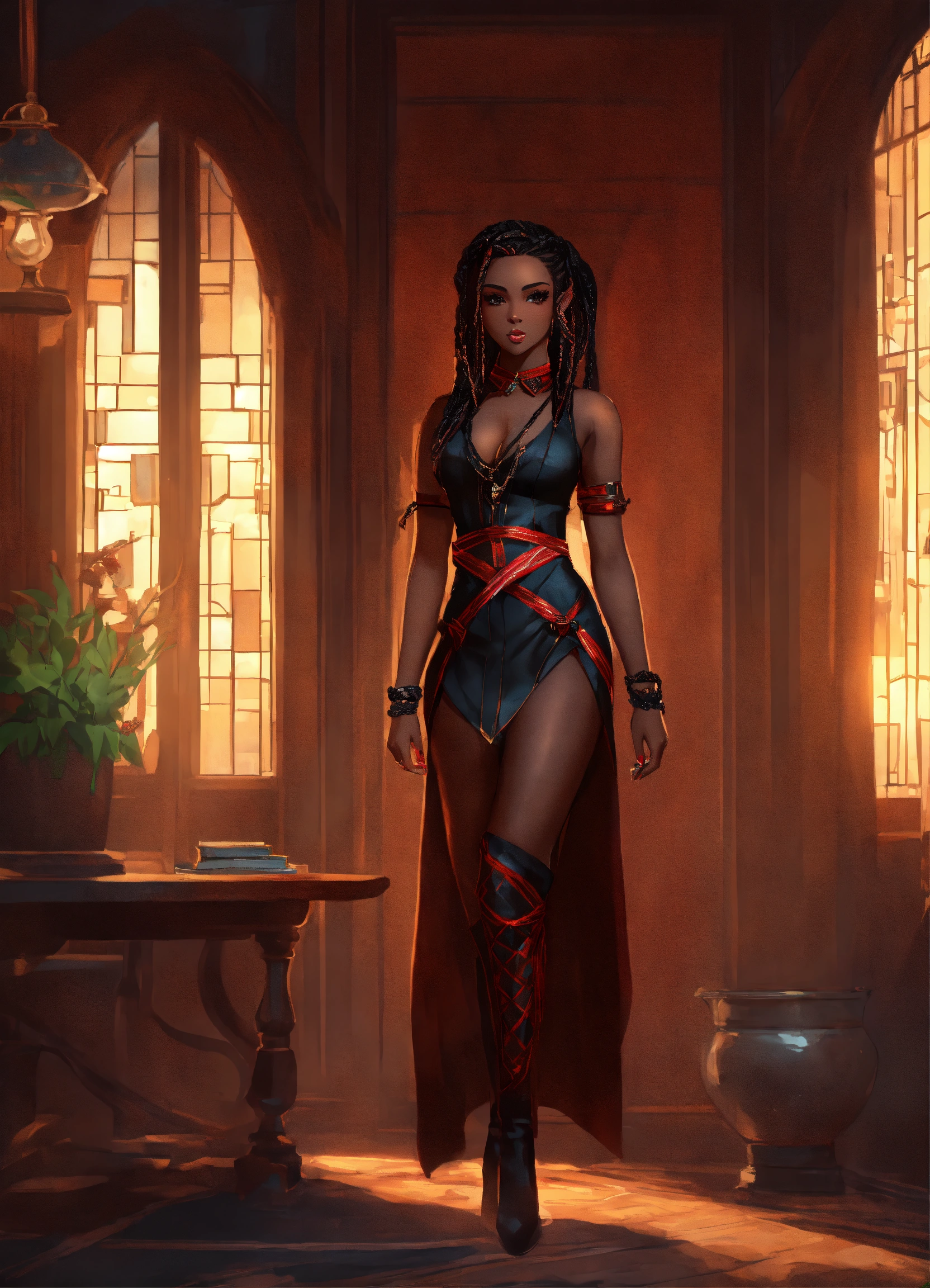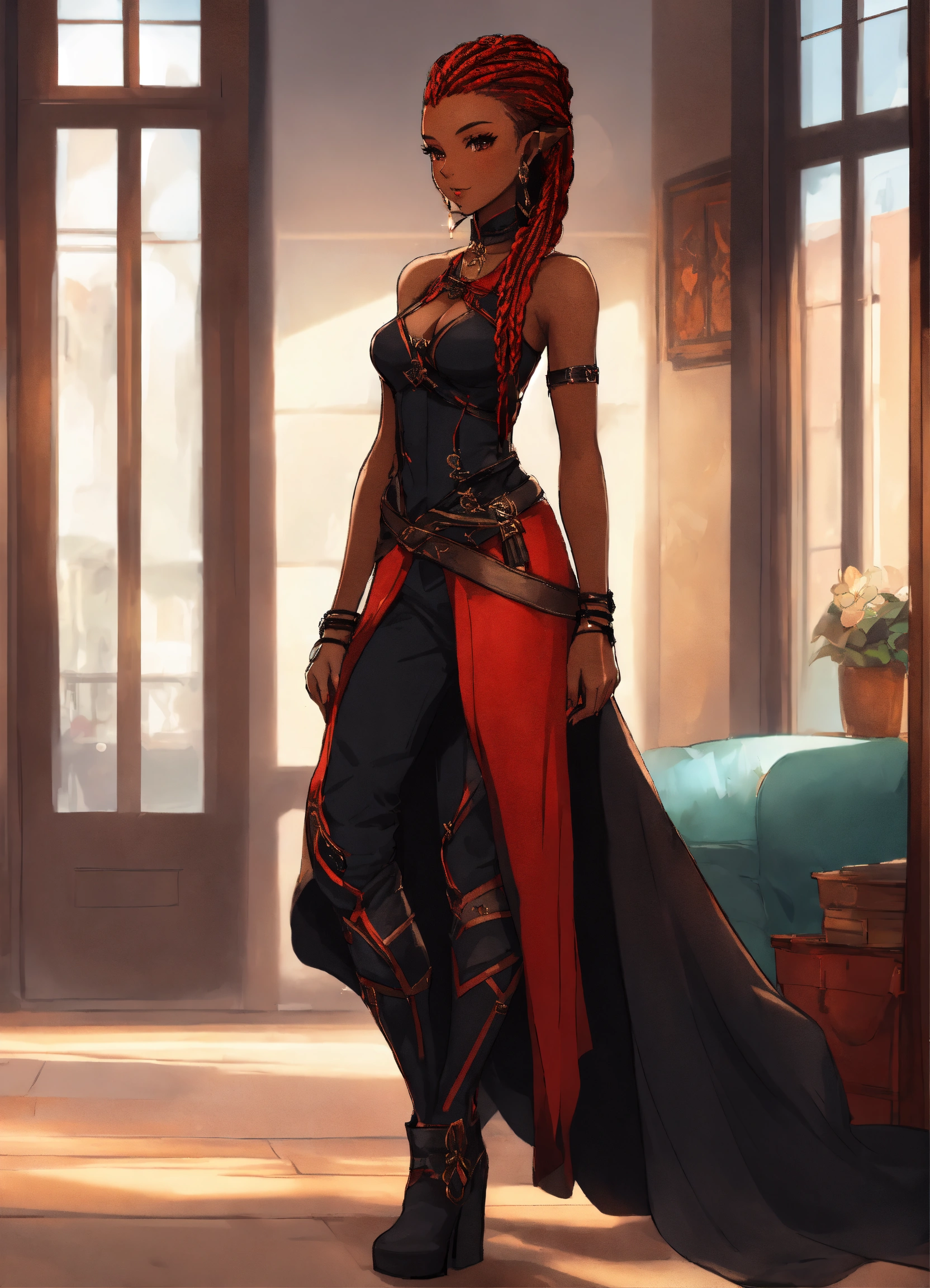 Full body of a shapely black female high elf n red and black braided hair, hour- glass figure, casually dressed in a little black dress, in a metropolitan apartment, full body, hd