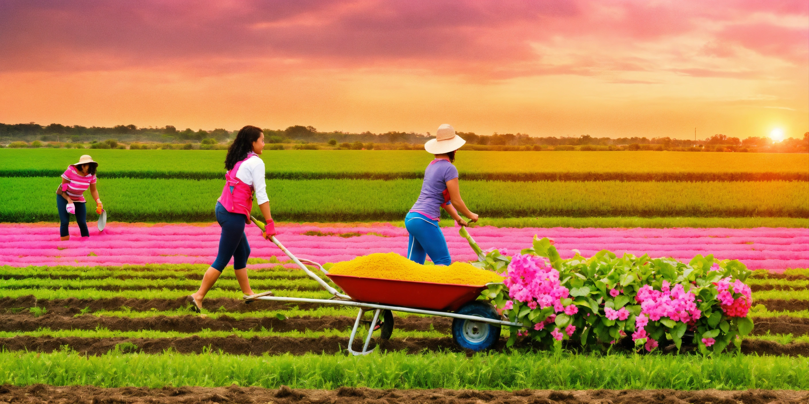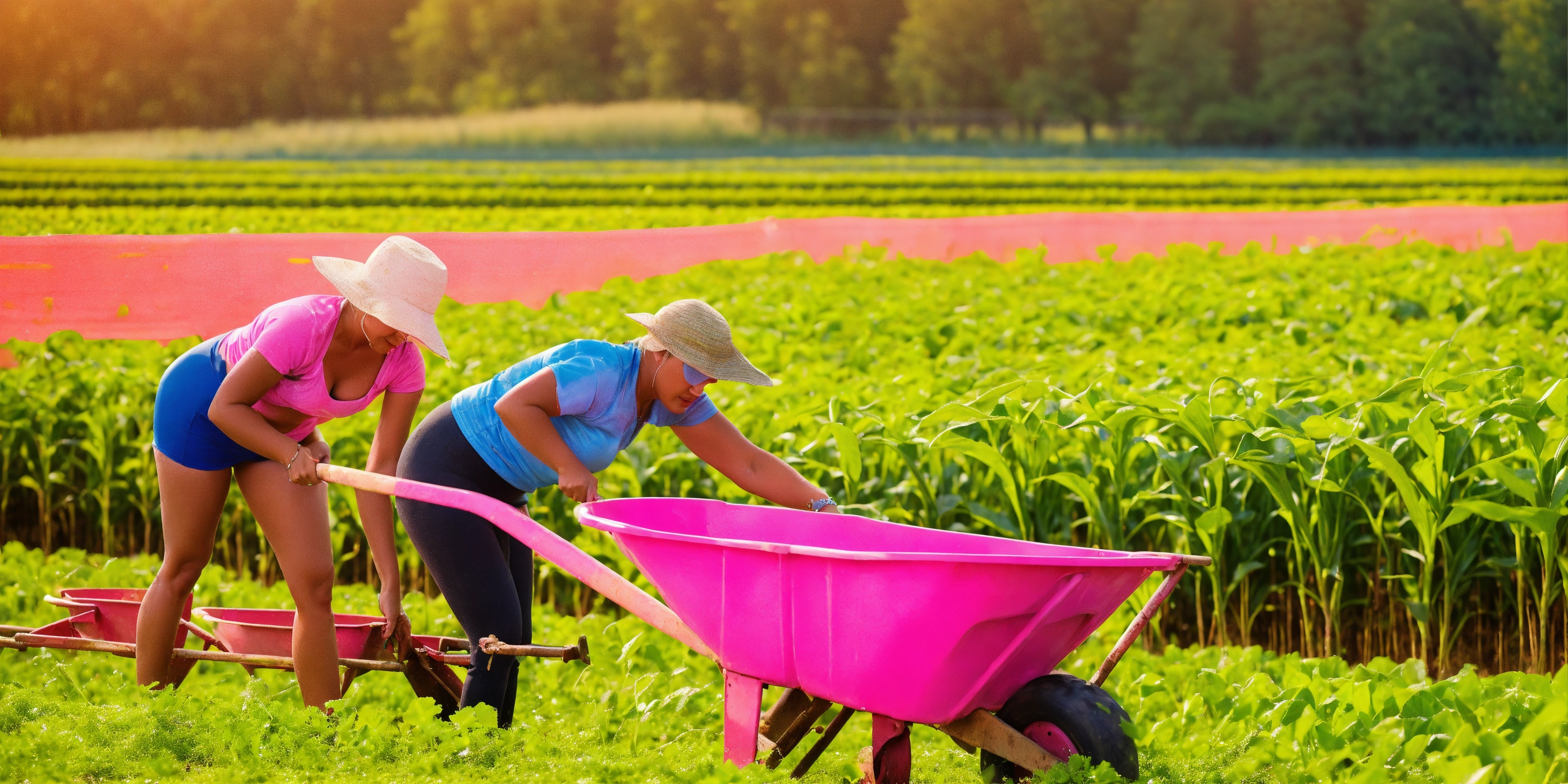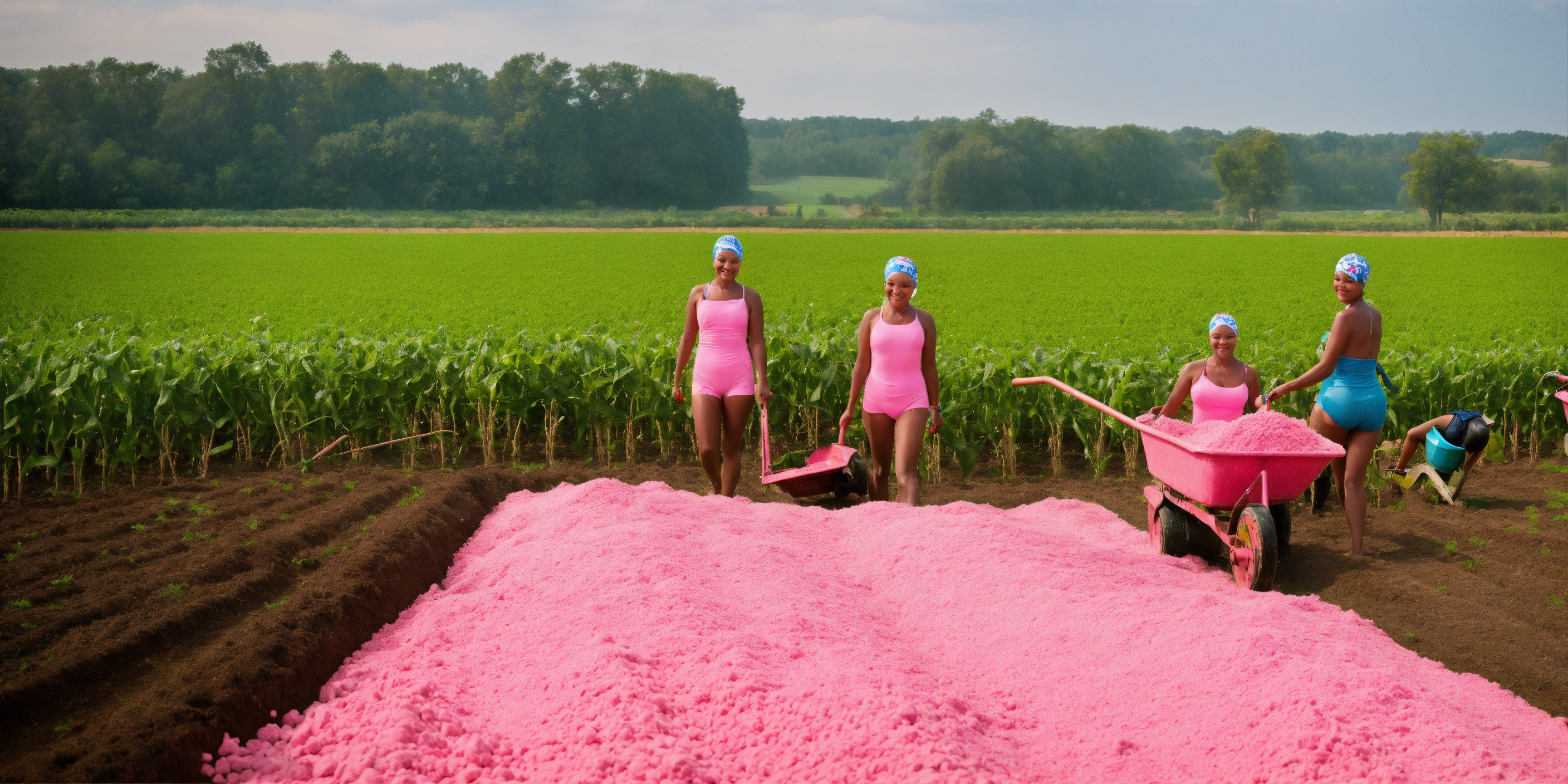 Many womans of 25 years of a different ethnicity in a pink swimming pulling wheelbarrow full of fertilizer from the farm to the field of maze