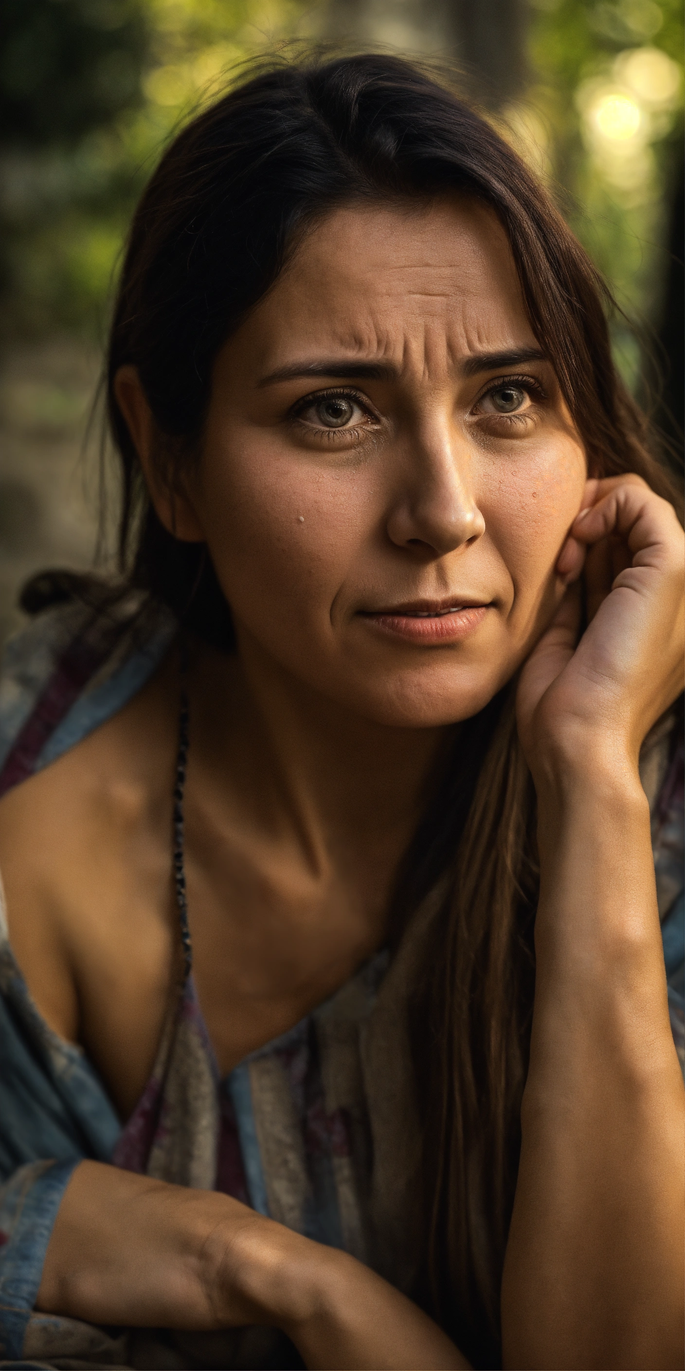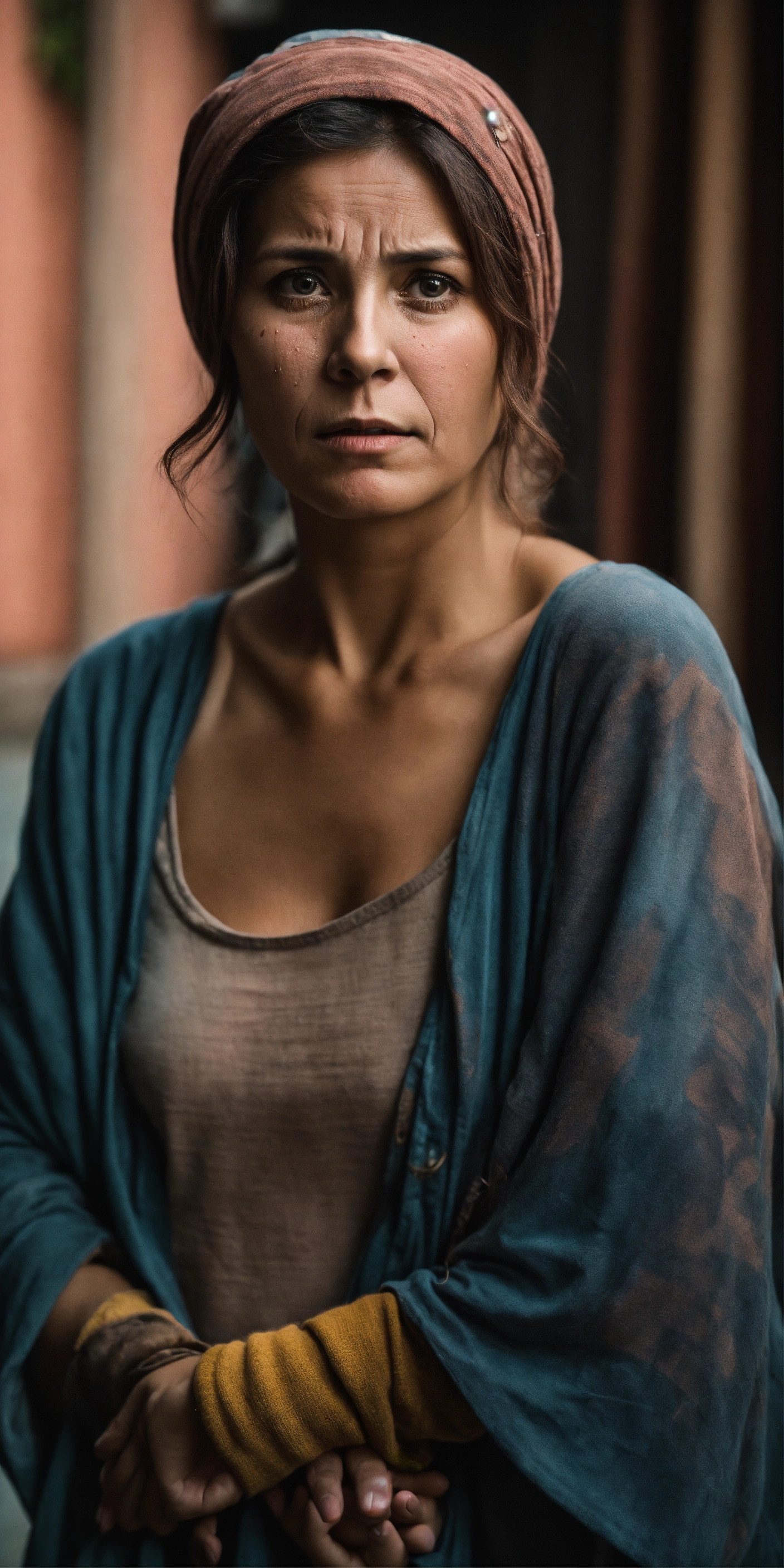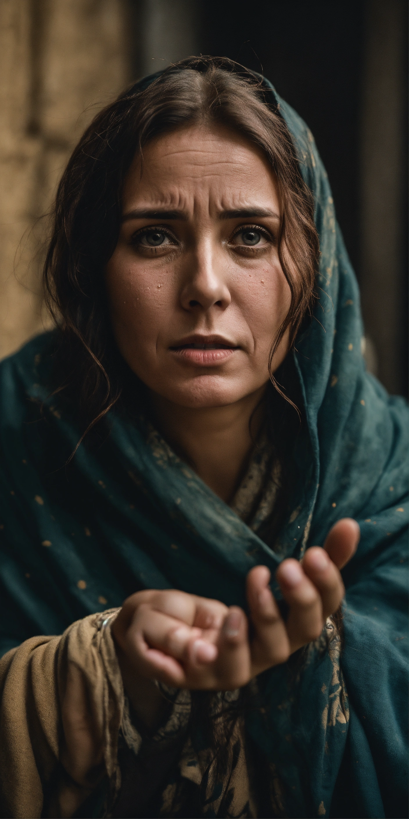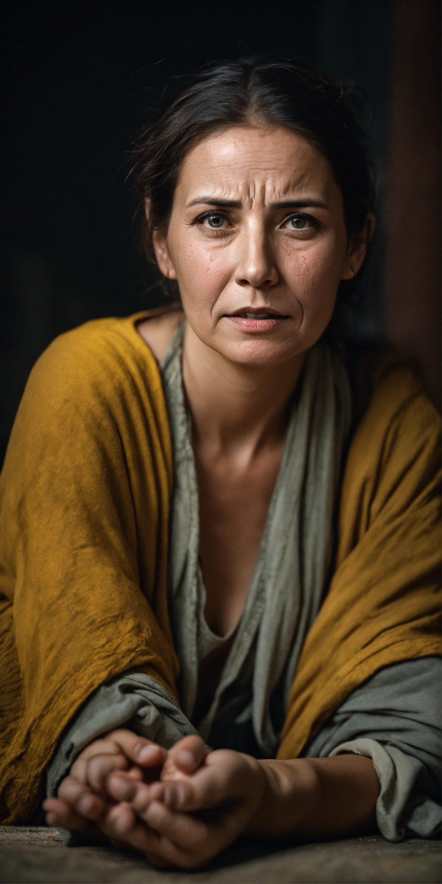 A woman in her thirties, like a beggar with her hand outstretched. the woman pitifully and tearfully looks at the camera. realistic photo