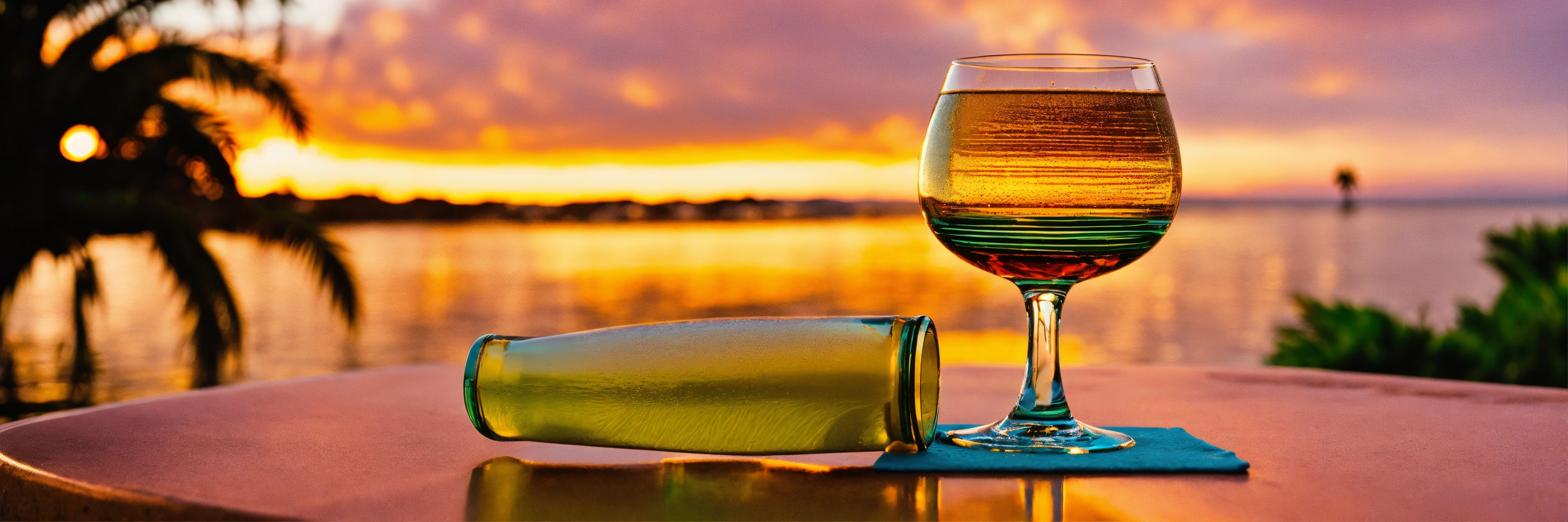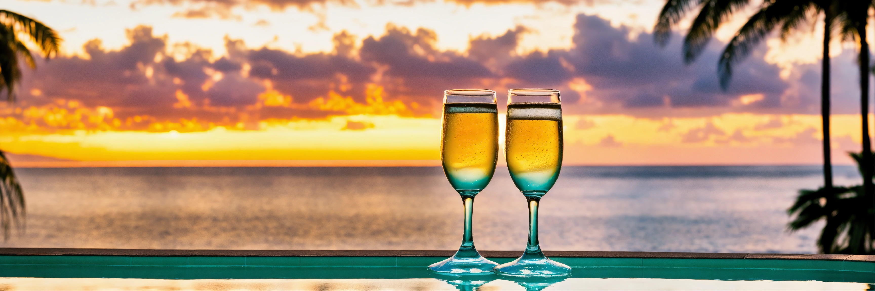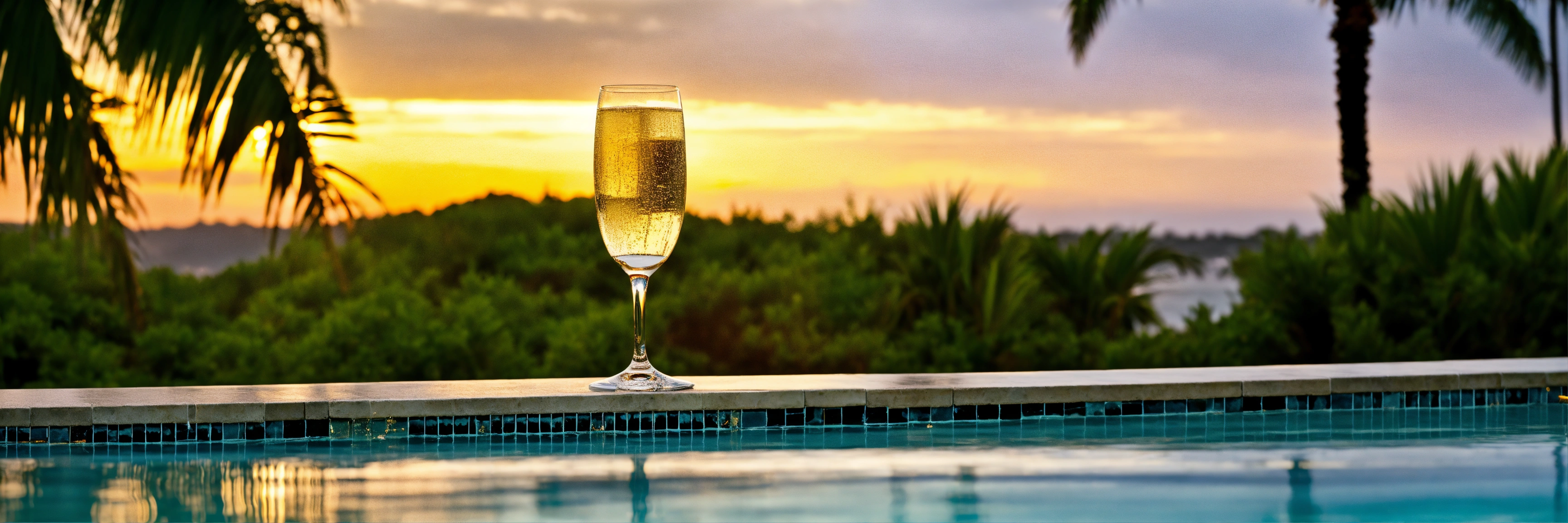 Image high-end champagne glass and bottle outdoor pool setting with palmtrees keywords performance, durability, exploration, versatility, ruggedness camera lens telephoto lens time of day sunset style of photograph romantic type of film n/a (digital) camera settings capture the watch in action, utilize natural lighting and dramatic angles post-processing techniques enhance details and colors, increase contrast, emphasize natural elements