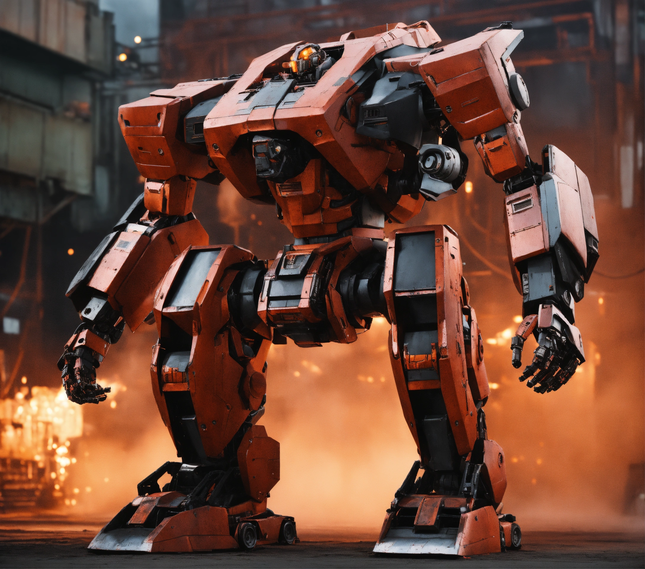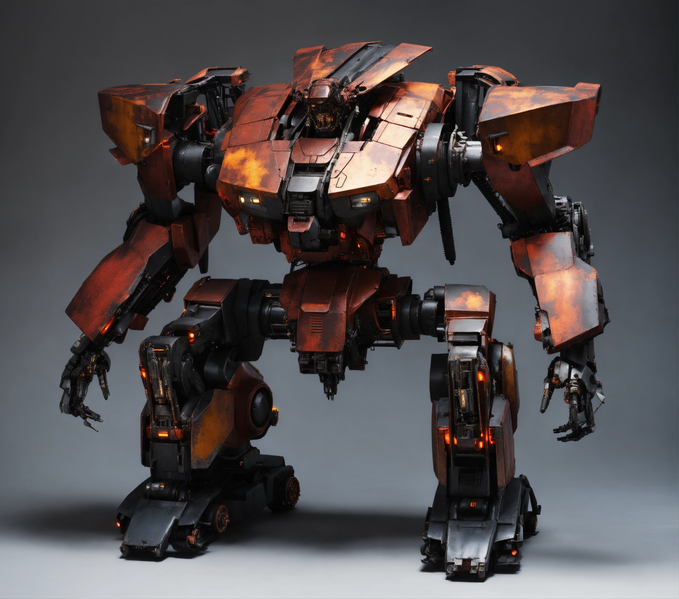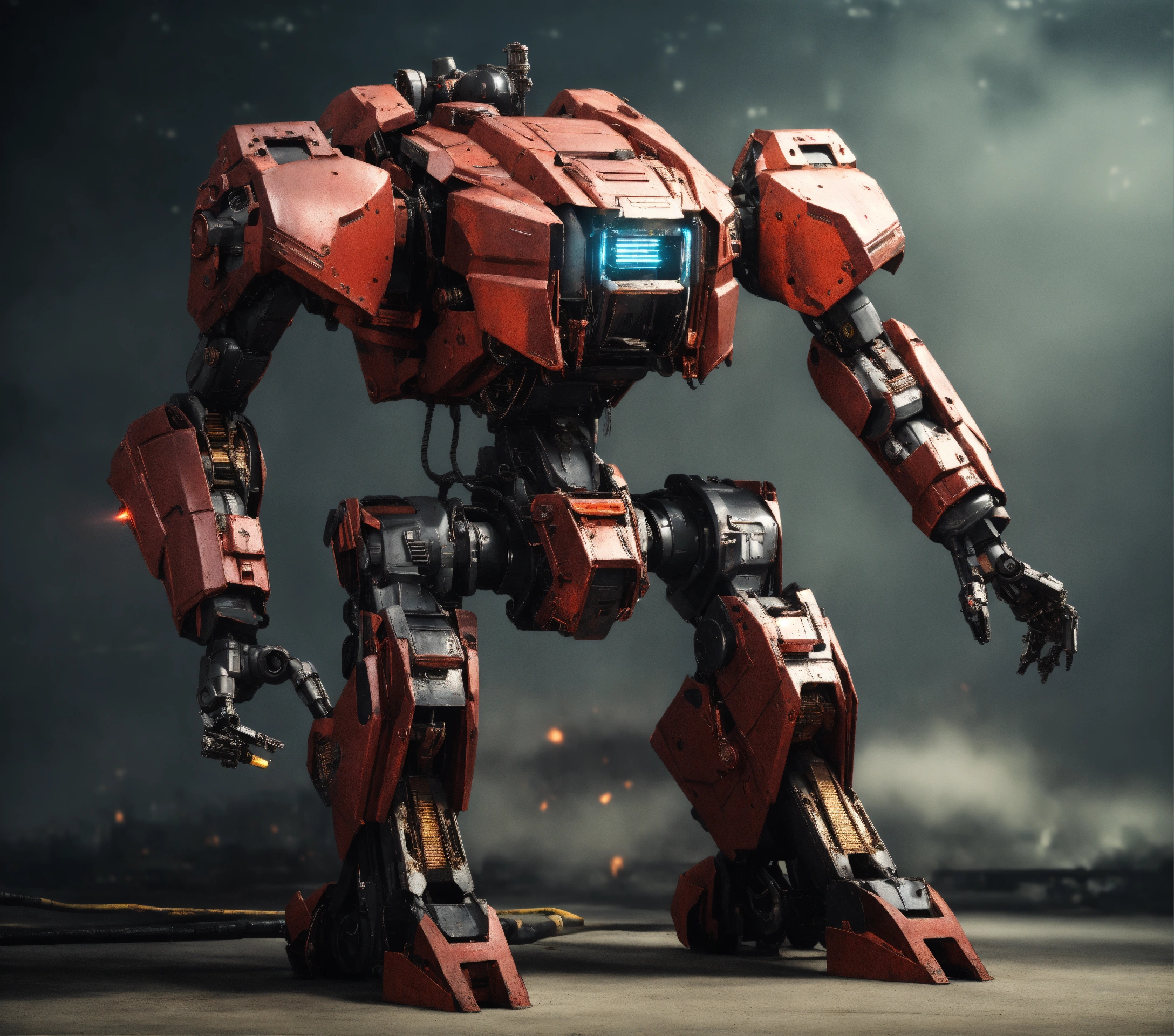 Full body shot of a realistic giant mecha with rectangular shoulders with wide set skinny legs and one massive arm that is larger than the whole body and touches the ground made of glowing engine parts and used as a grabbing tool with a black paint job with rusted red accent plating