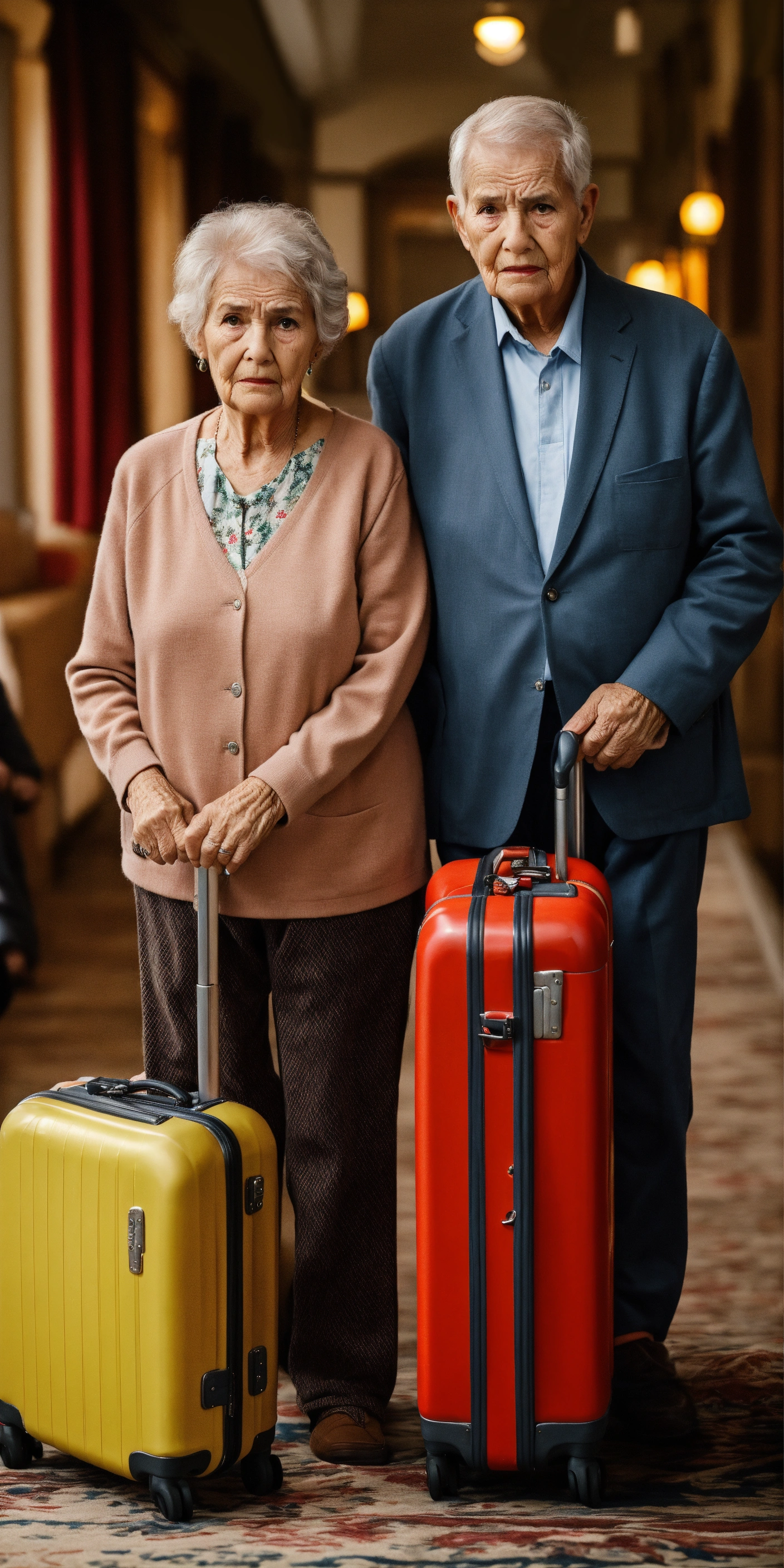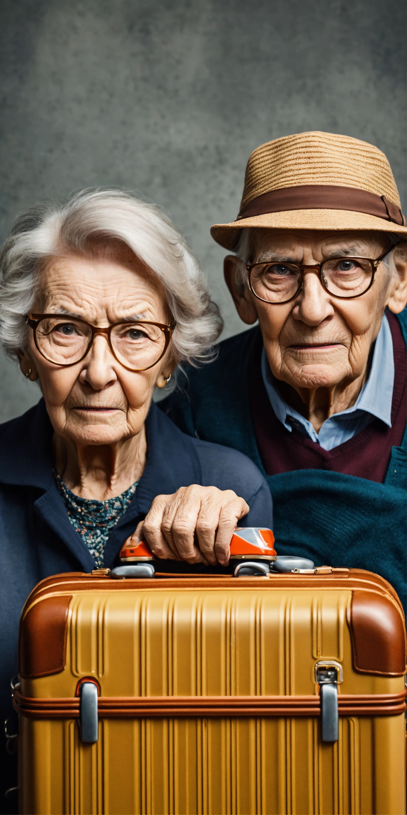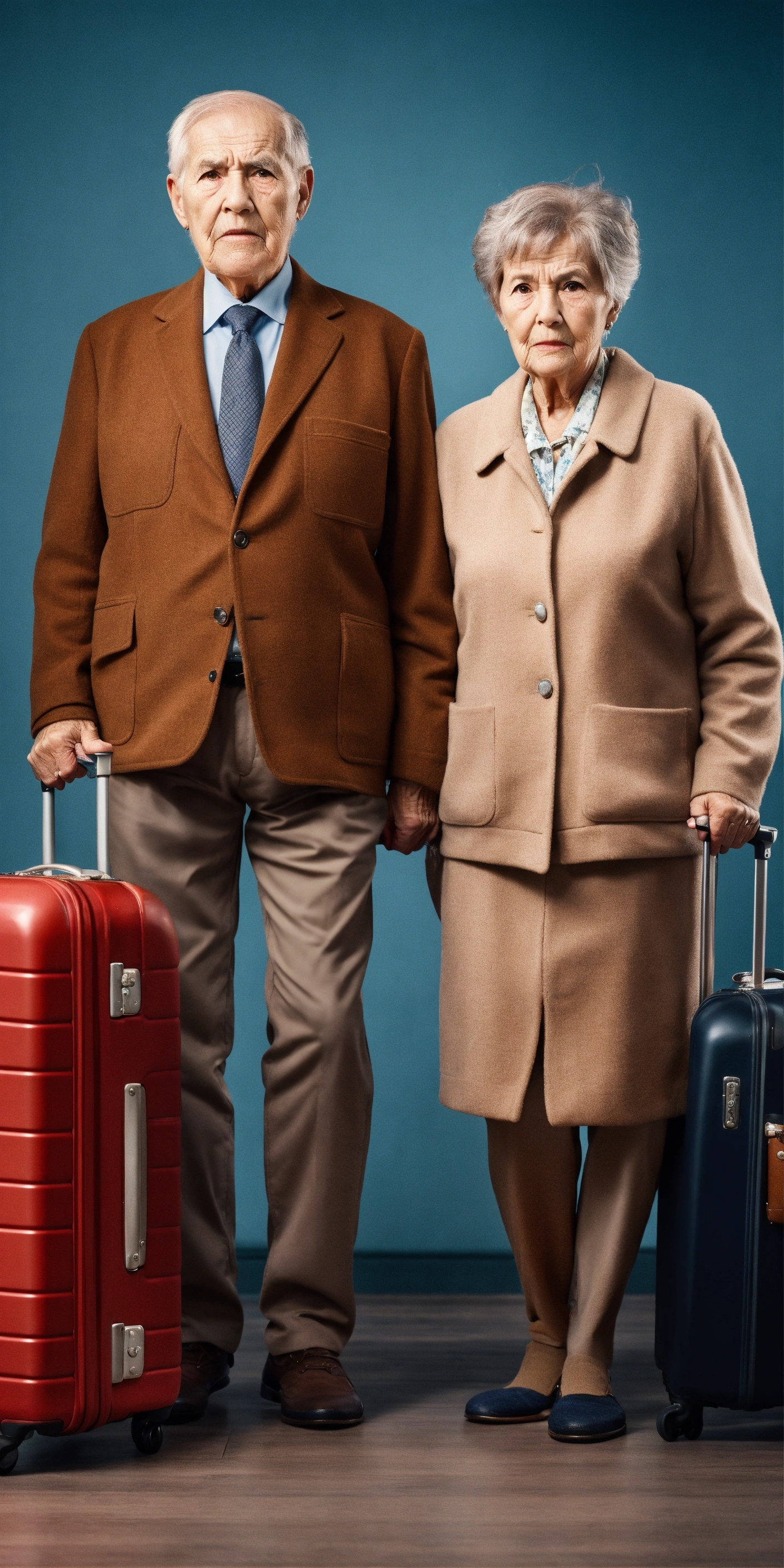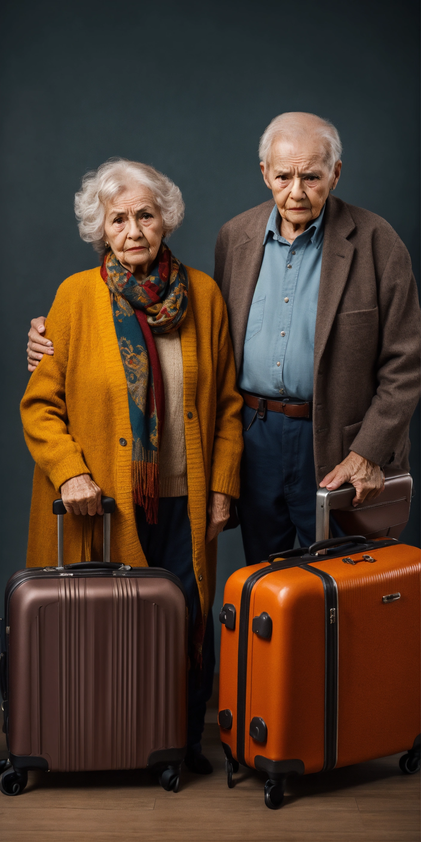 An elderly couple in their 60s with suitcases. their faces are stern, they are upset and offended about something. people look at the camera. realistic photo