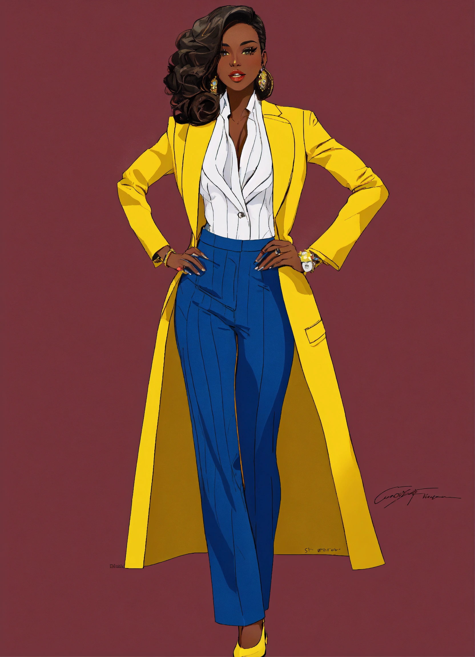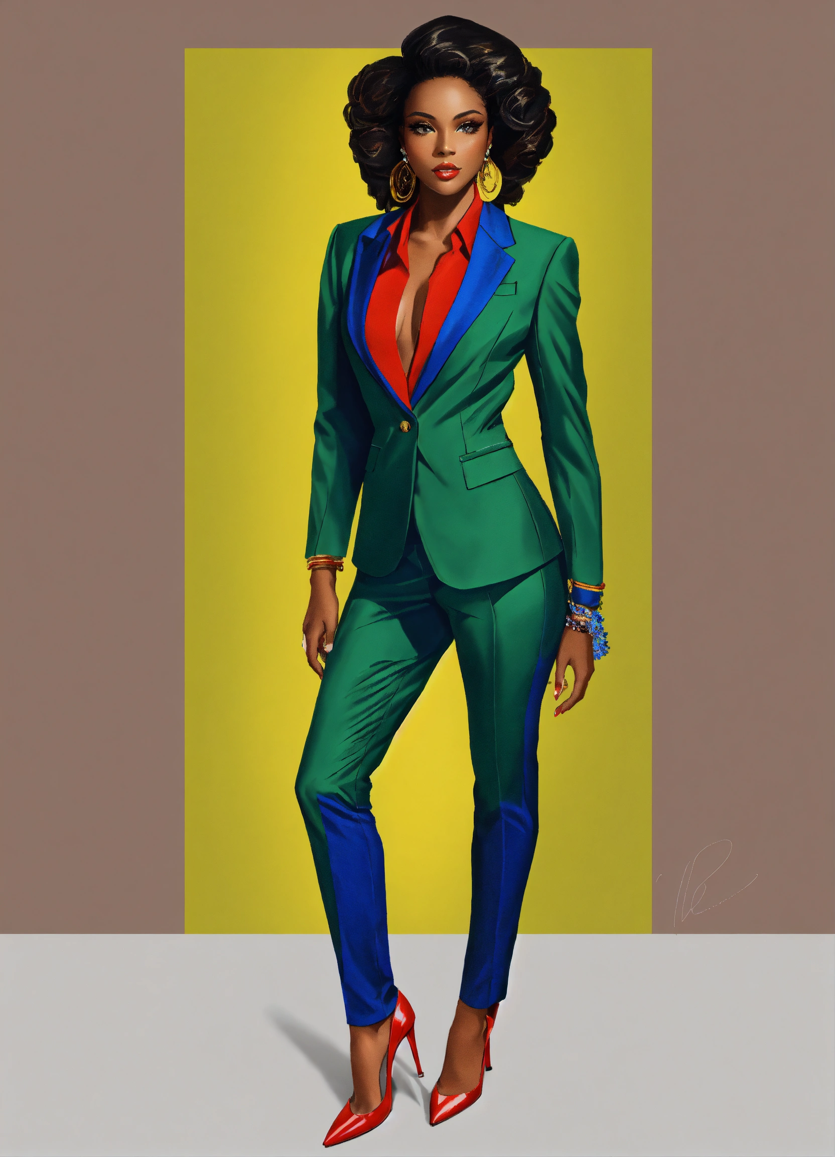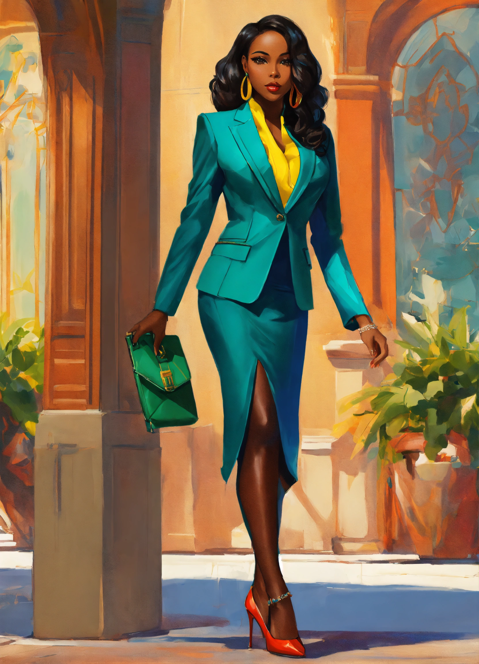 Beautiful black businesswoman gorgeous "dark face skin, " wearing stylish haute couture conservative haute couture business suit jacket and pants outfit, in colors, "bright red, bright blue, "dark green, " bright yellow and stark white, " stiletto heels, detailed line art, fine details, no background full body view, head to toe, clear white background, center, greg rutkowski