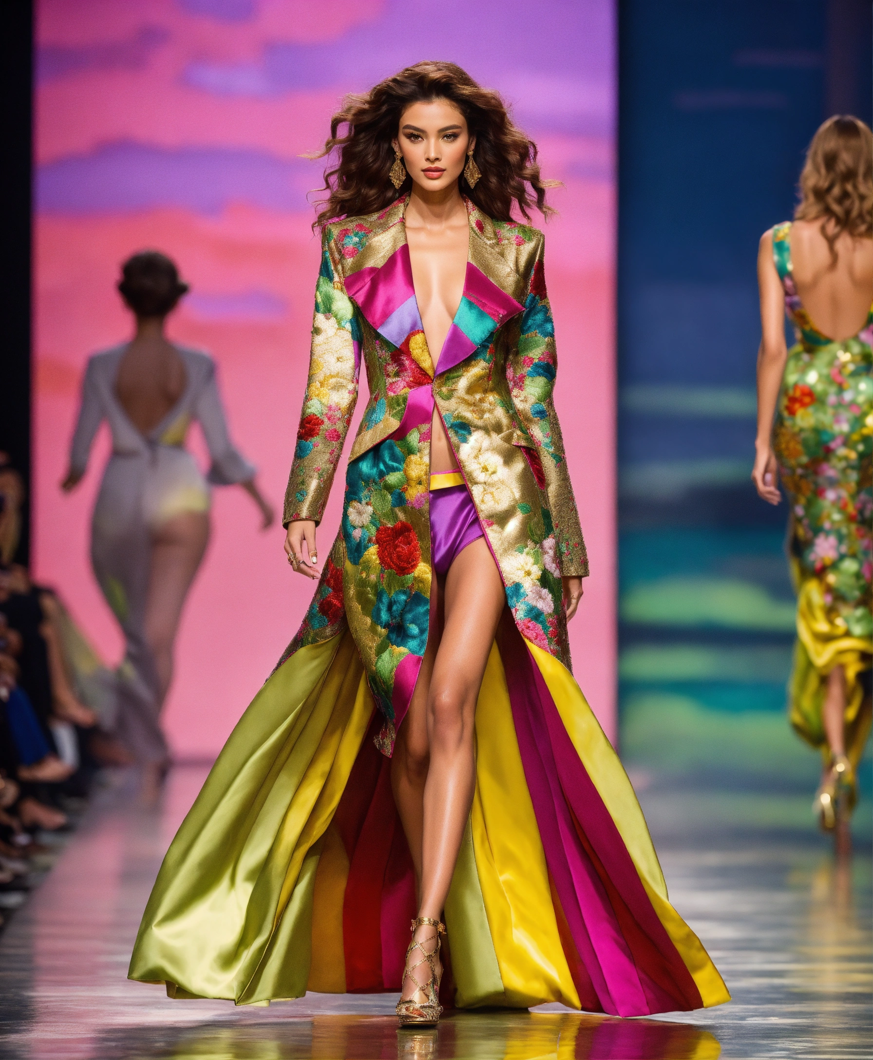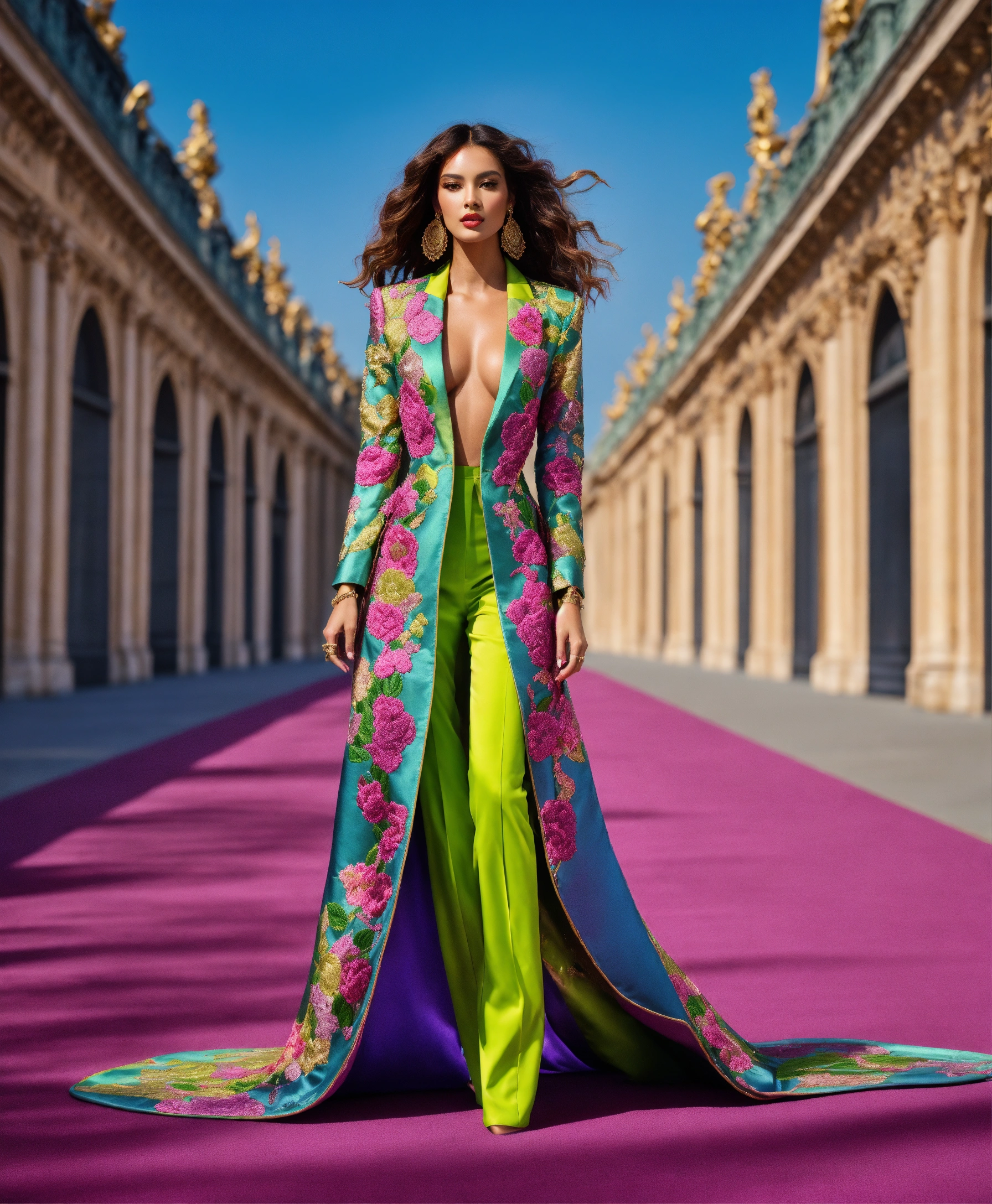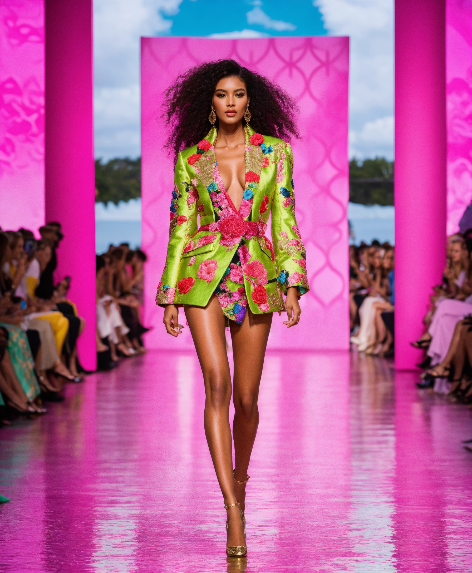 Ultra realistic full body photo of a stylish beautiful elegant attractive supermodel voluminous wavy hair walking the runway modeling summer beach wear brave, paris versailles details cutouts and gold geometric pattern floral structured tailored jacket pink gold green lilac peridot silver magenta lime fuchsia yellow blue black gray copper mauve bronze haute couture embroidered gorgeous contrasting colors vivid intricate bold vibrant glamorous ultimate elegance beautiful luxurious awesome wealthy opulent exquisite resplendent sheen magnificent sublime 12k