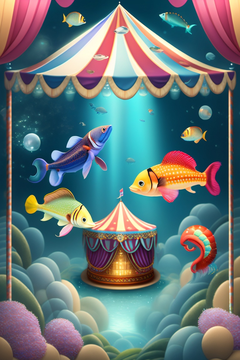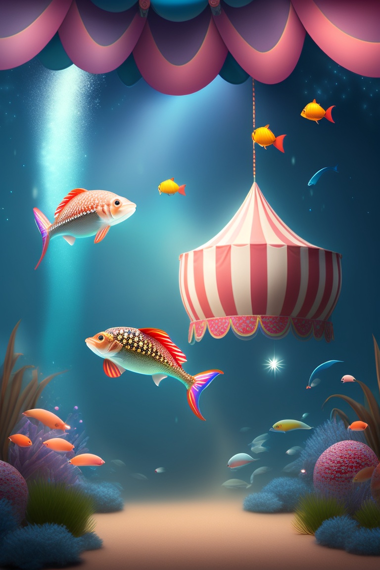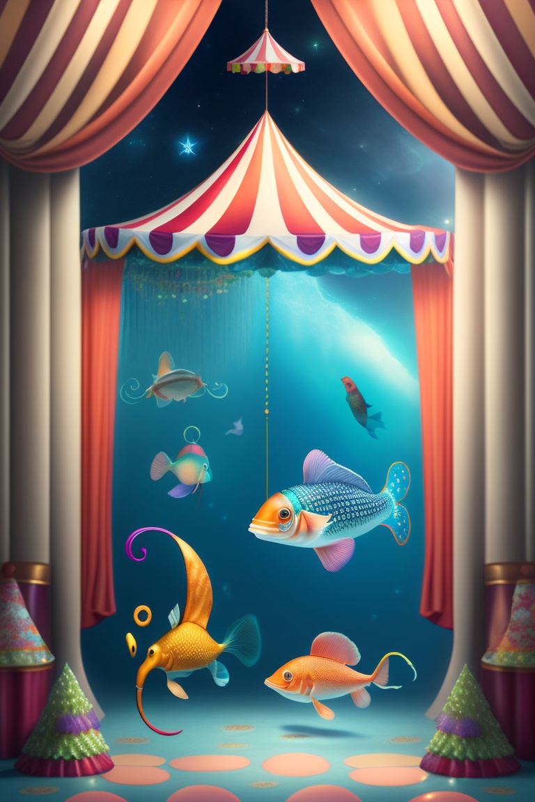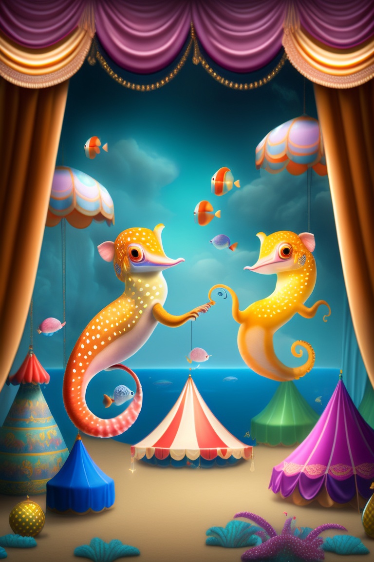 Background: underwater circus, circus tent, octopuses, fish in the background: two fish dancing with hats. in the distance, the circus tent is standing. in the foreground, two seahorses perform a magic trick, with curtains on the left and right.