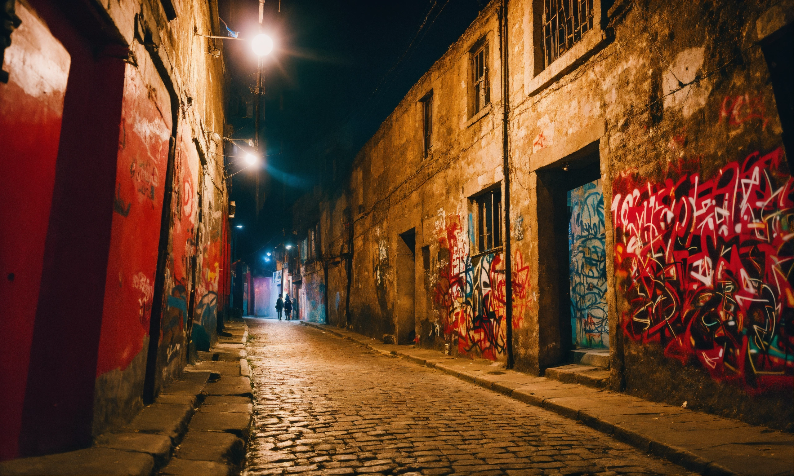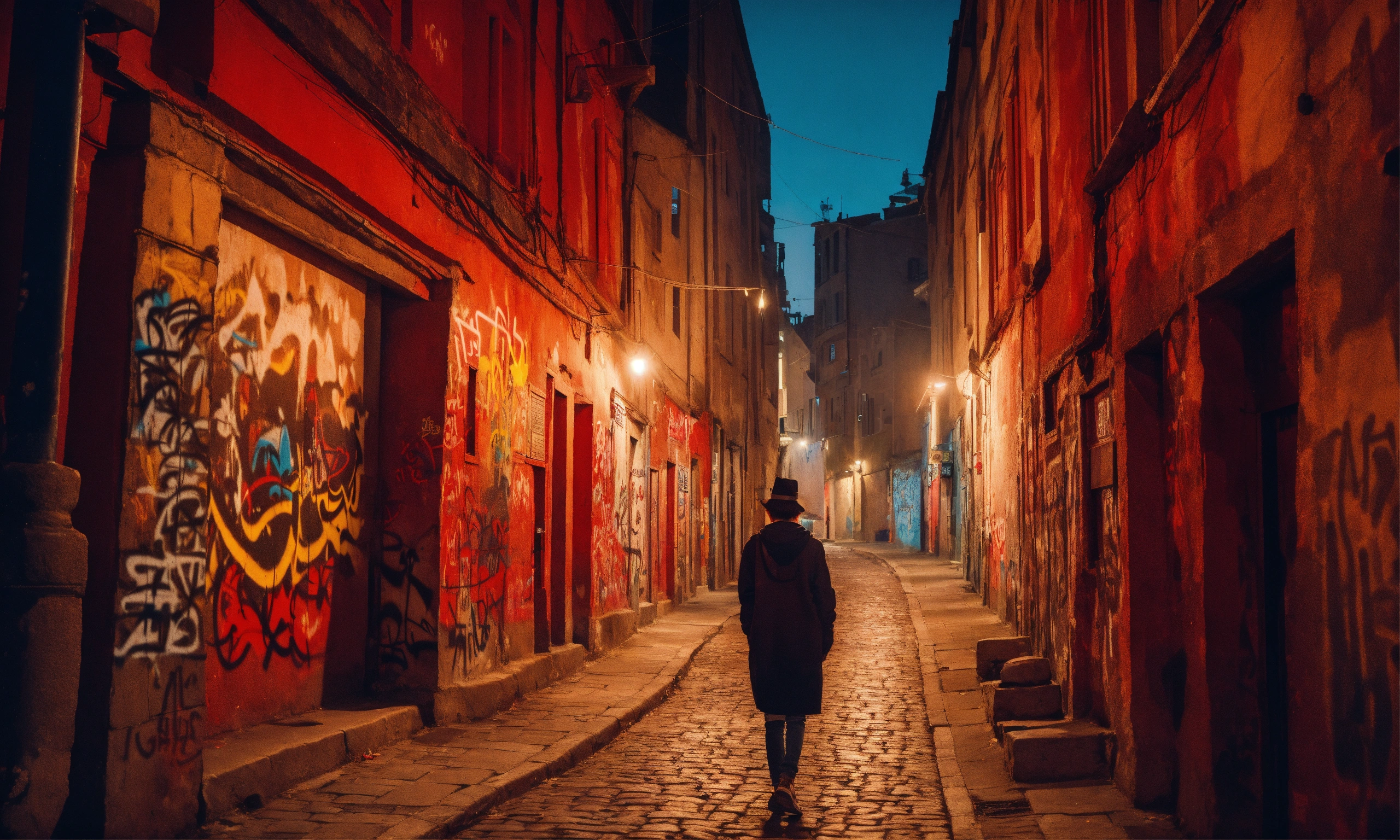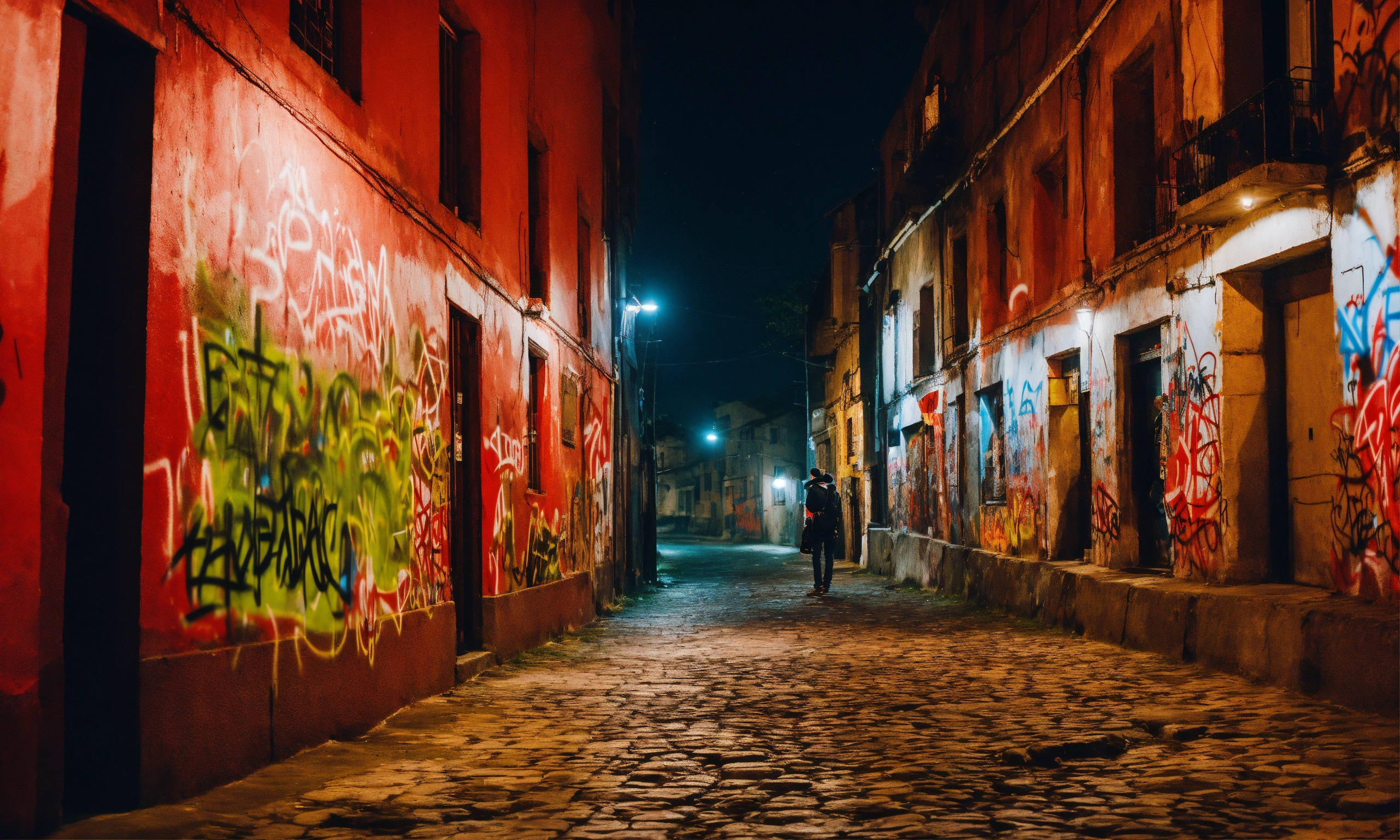 A wide shot of a person standing in a stone city at night, in narrow streets, engaged in graffiti art, with many moths fluttering around them. reduce the overall red tone in the image to create a more balanced look