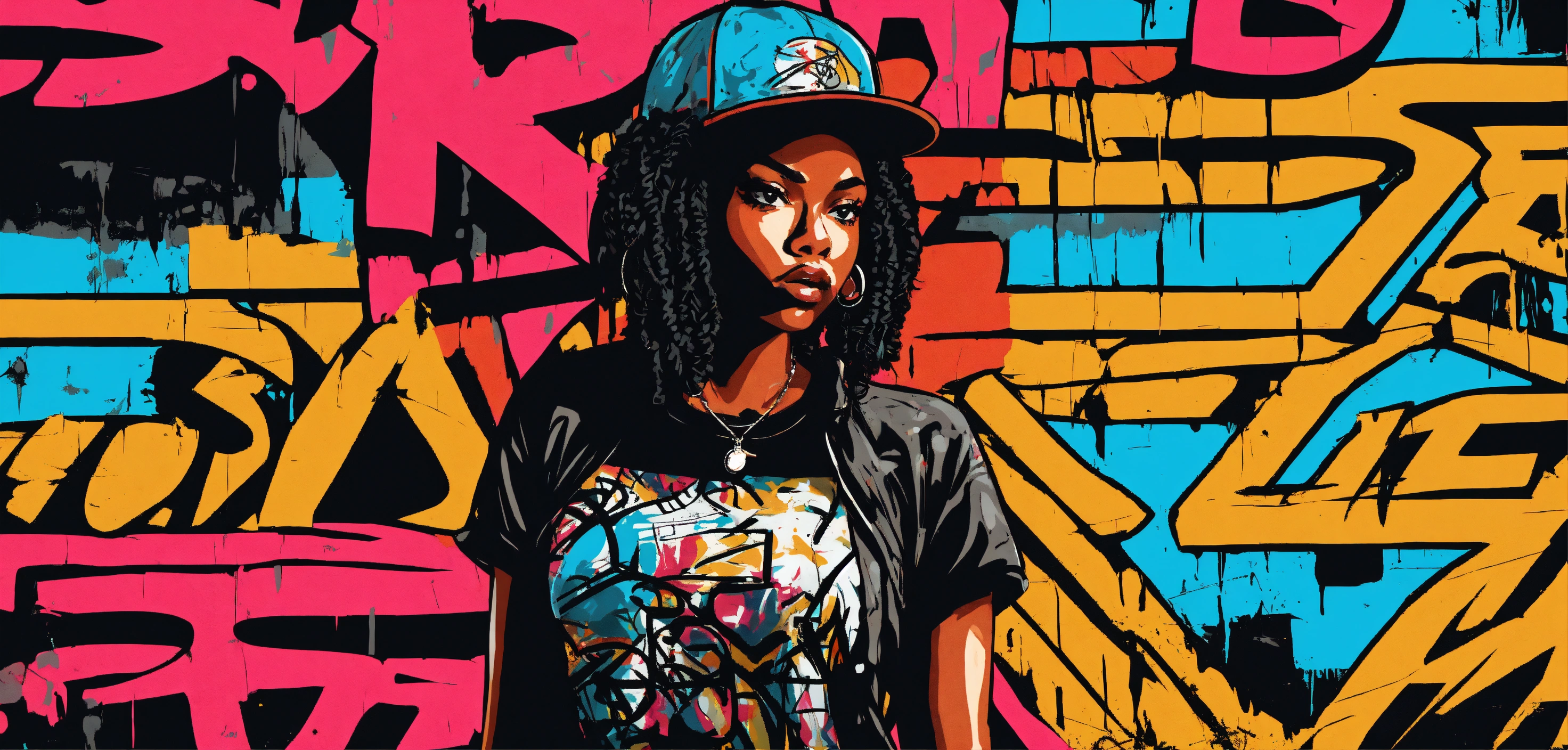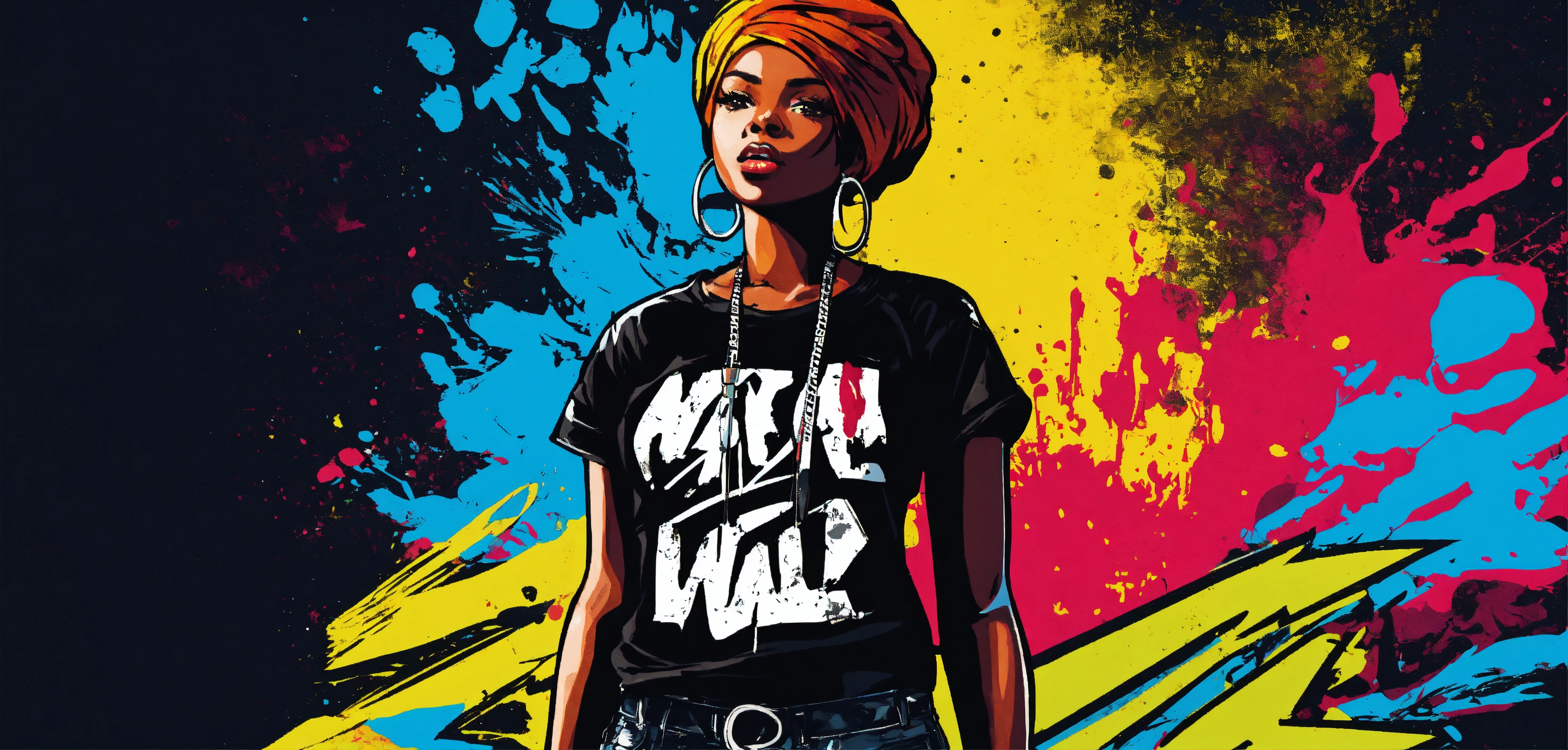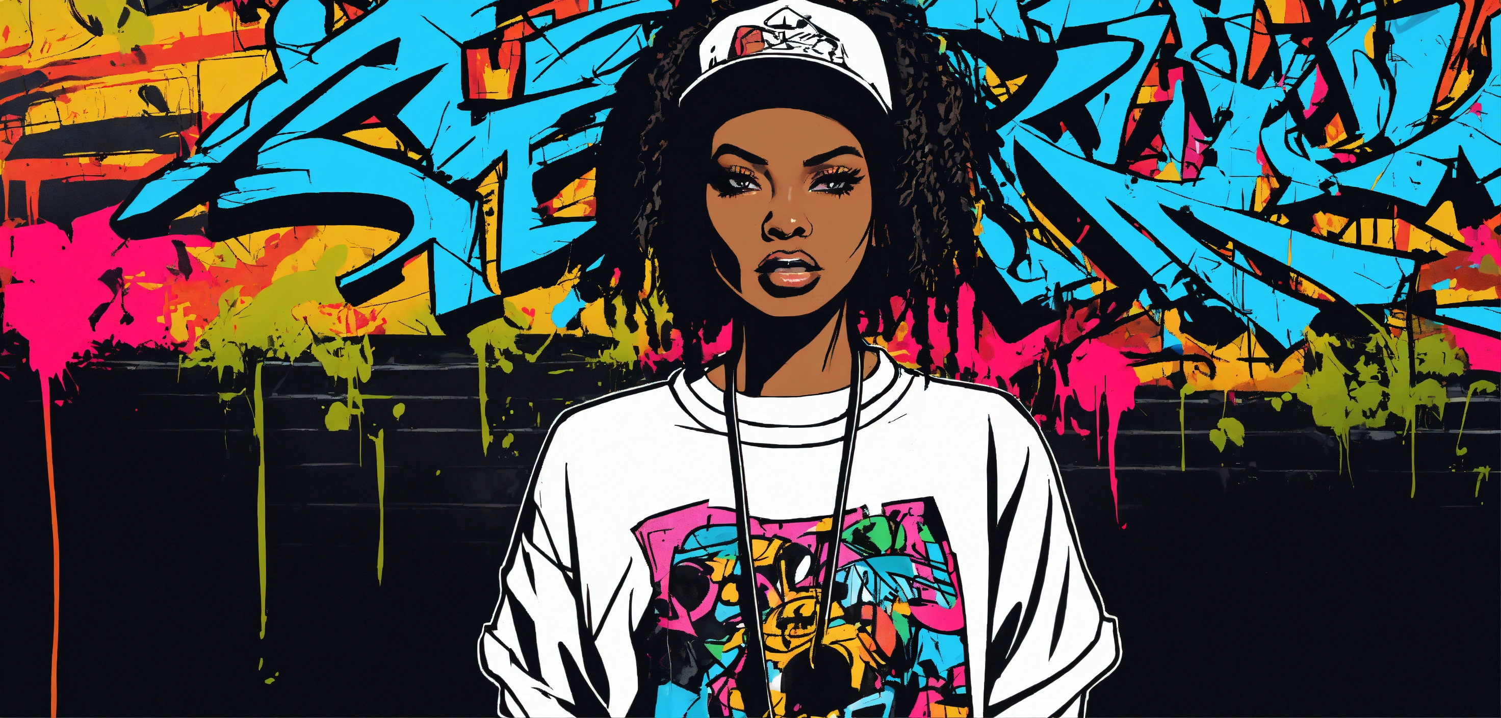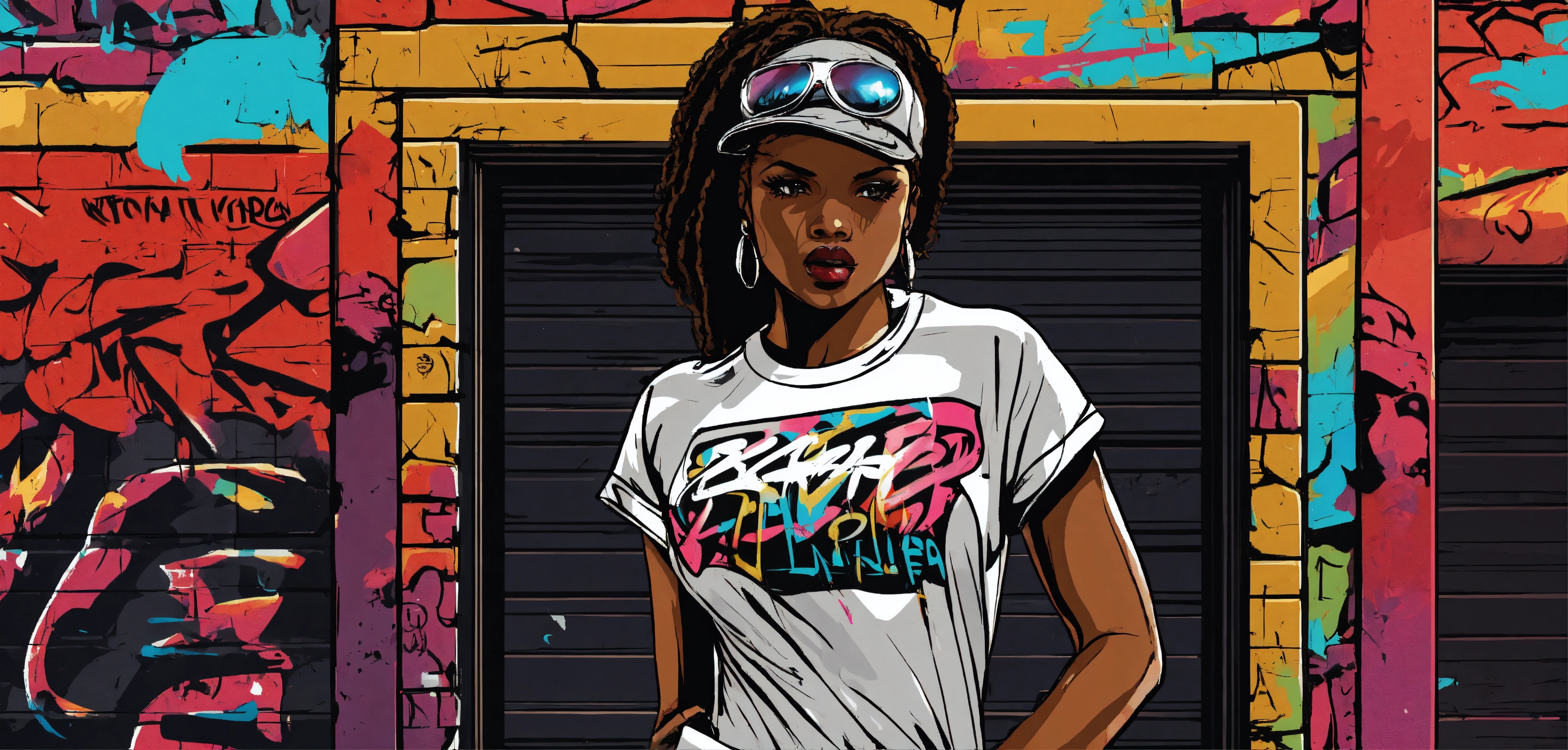 Street art rebel black woman in edgy graffitistyle clothing, standing against a graffiti-covered wall with attitude — t-shirt design graphic, vector, contour, black background.