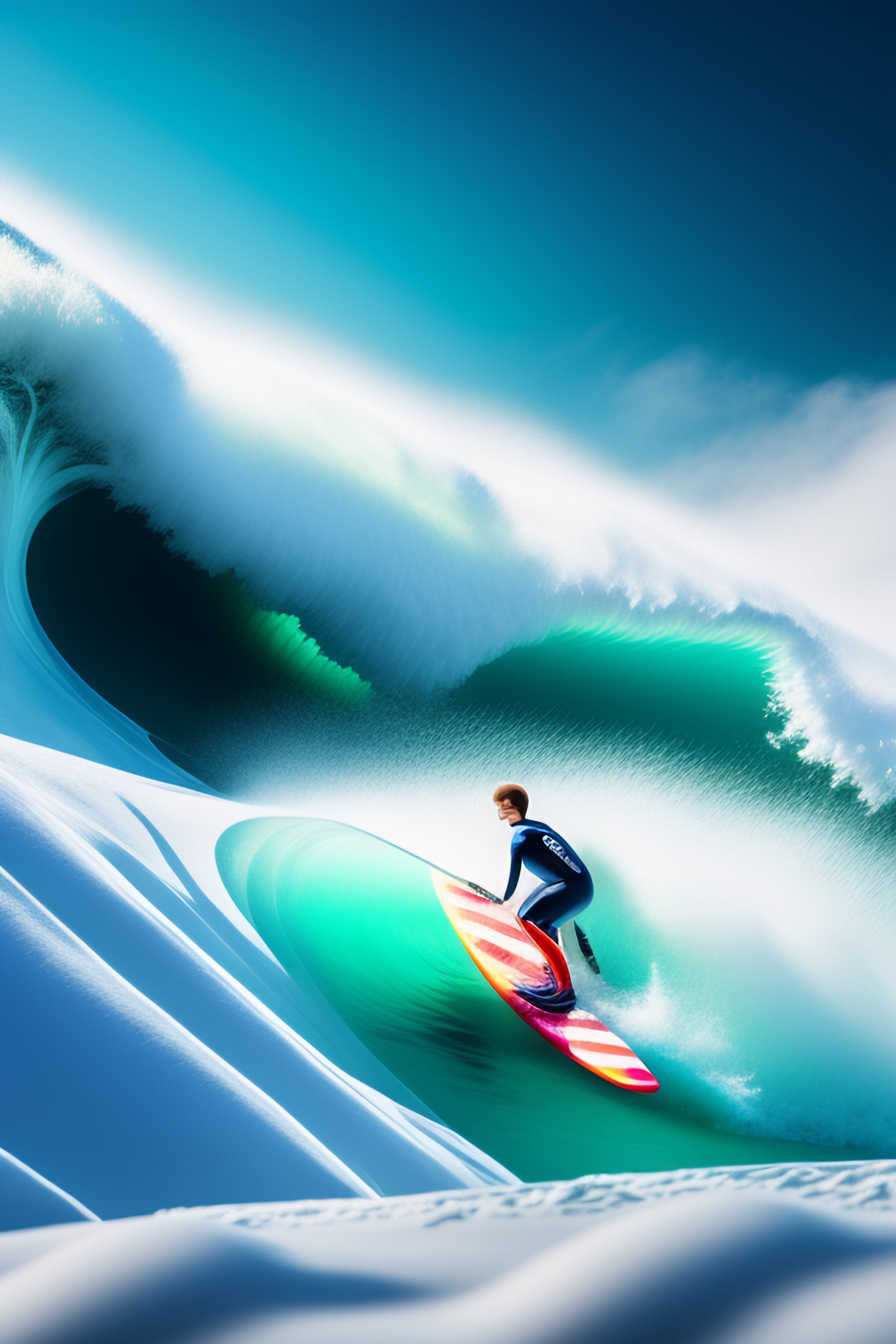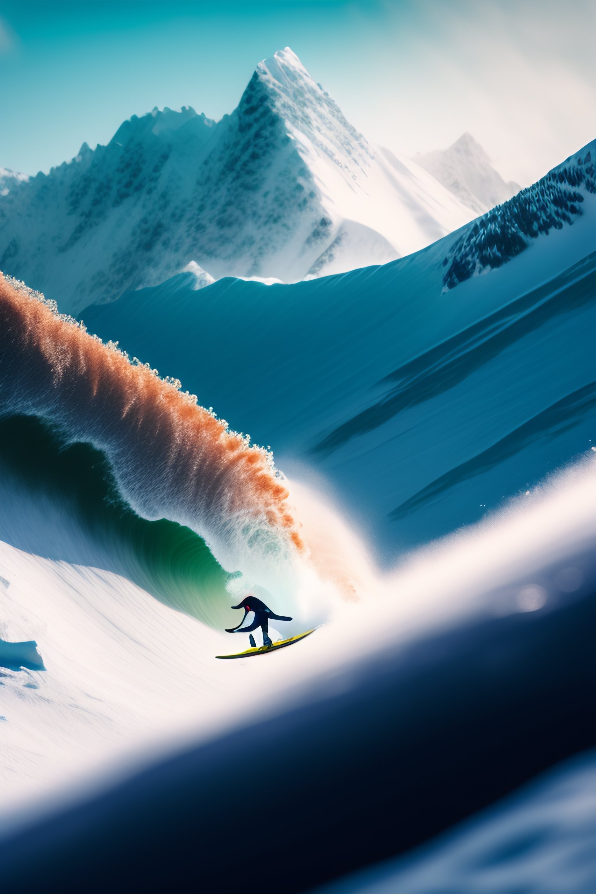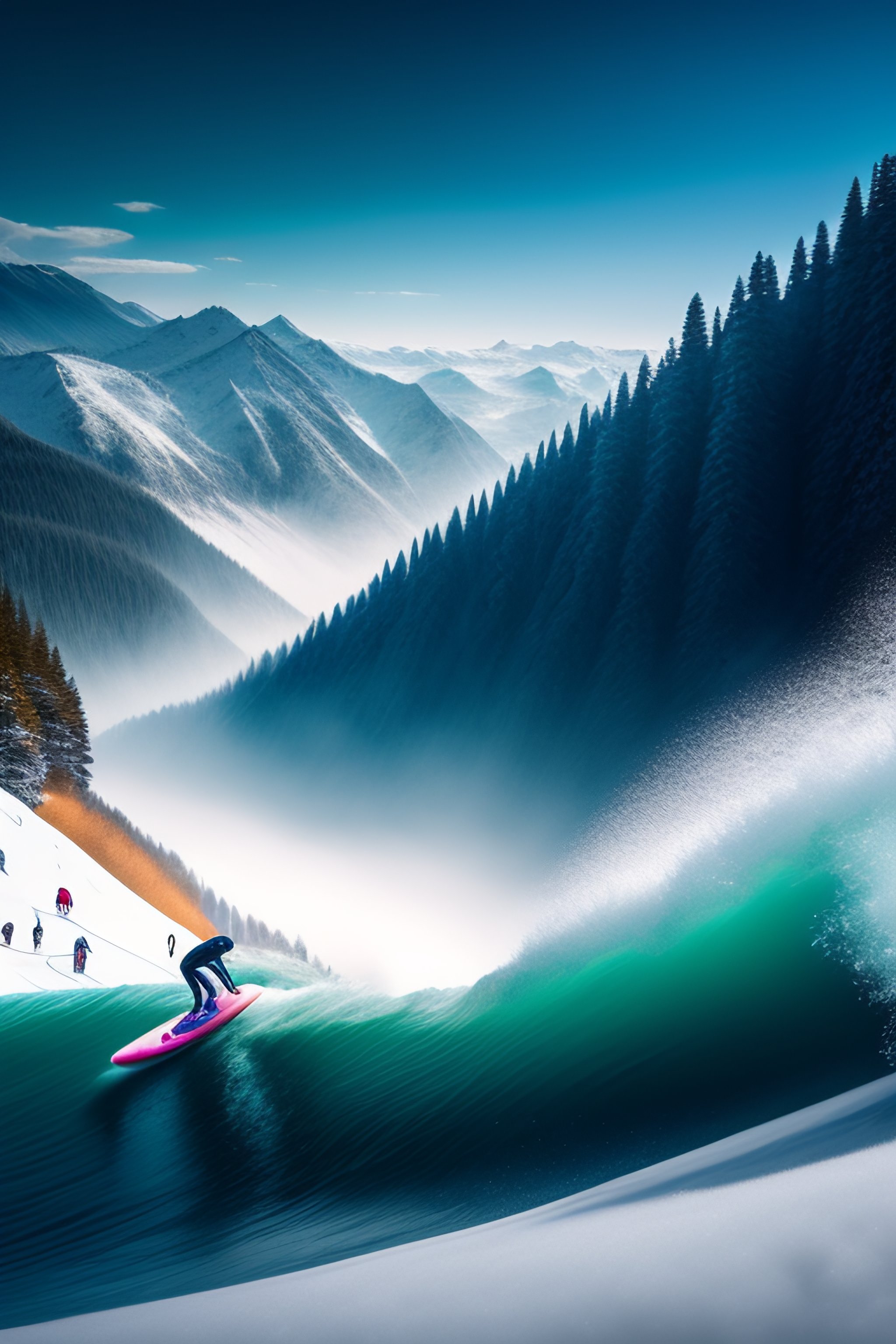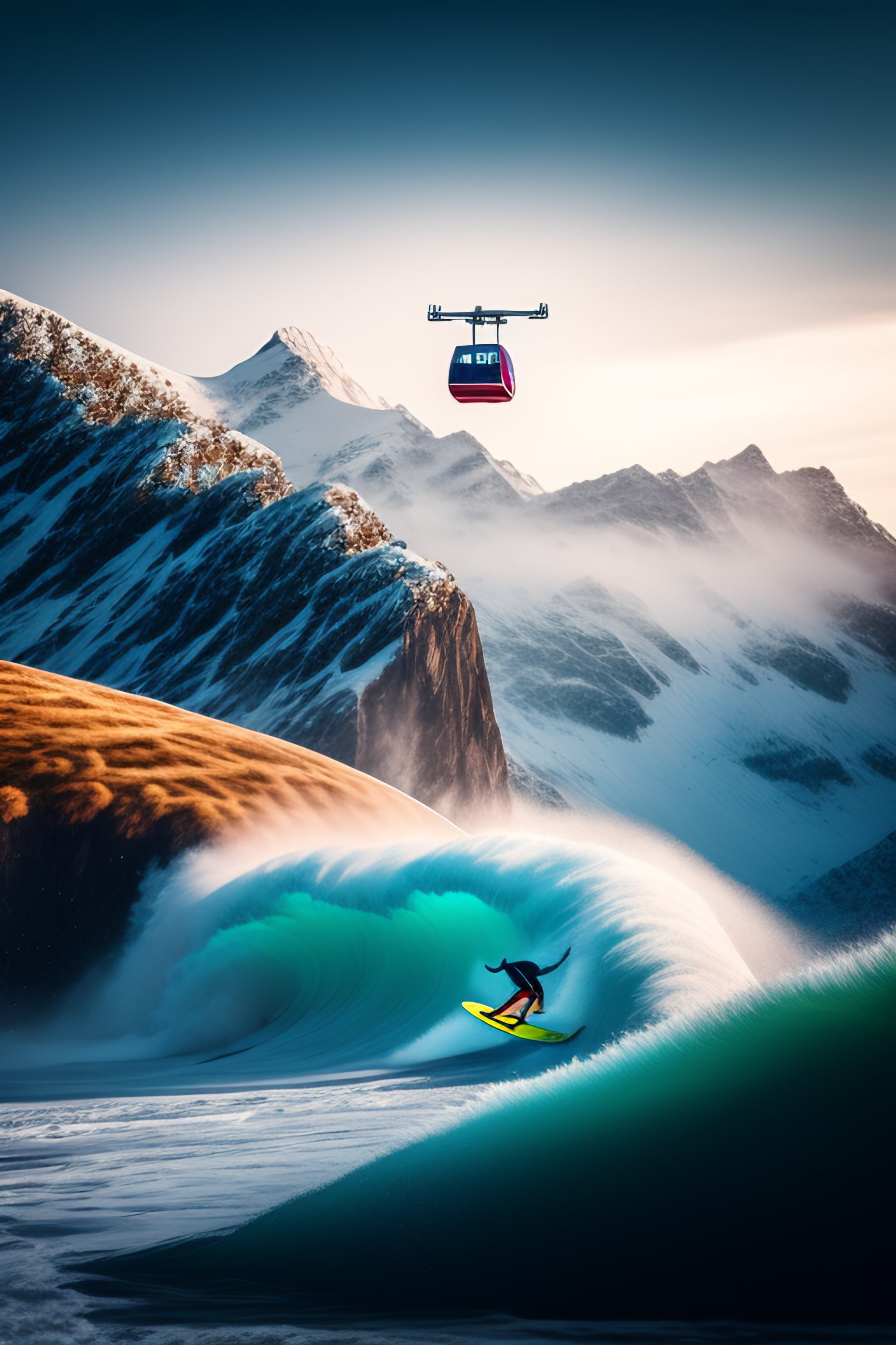 A boy surfing with a surfboard down a snowy mountain, passing a cable car that takes the surfers back up. realistic picture, 4k, dramatic and warm picture