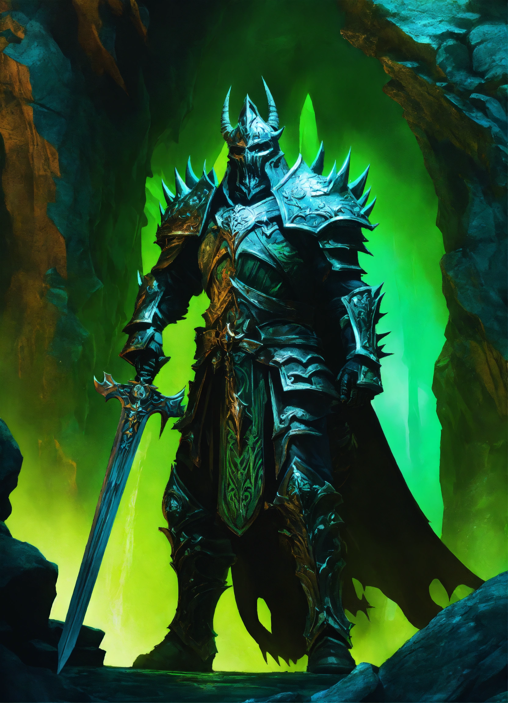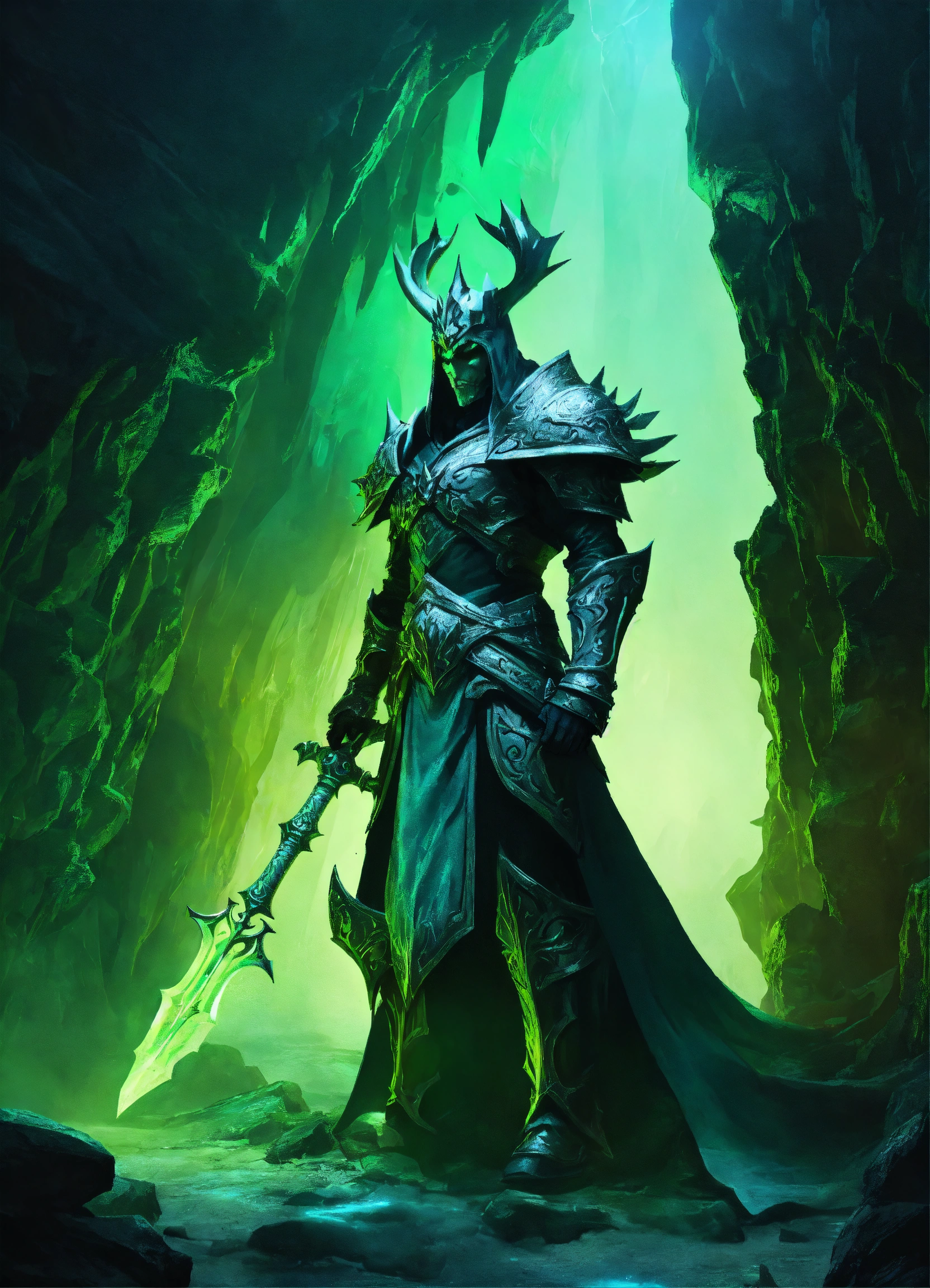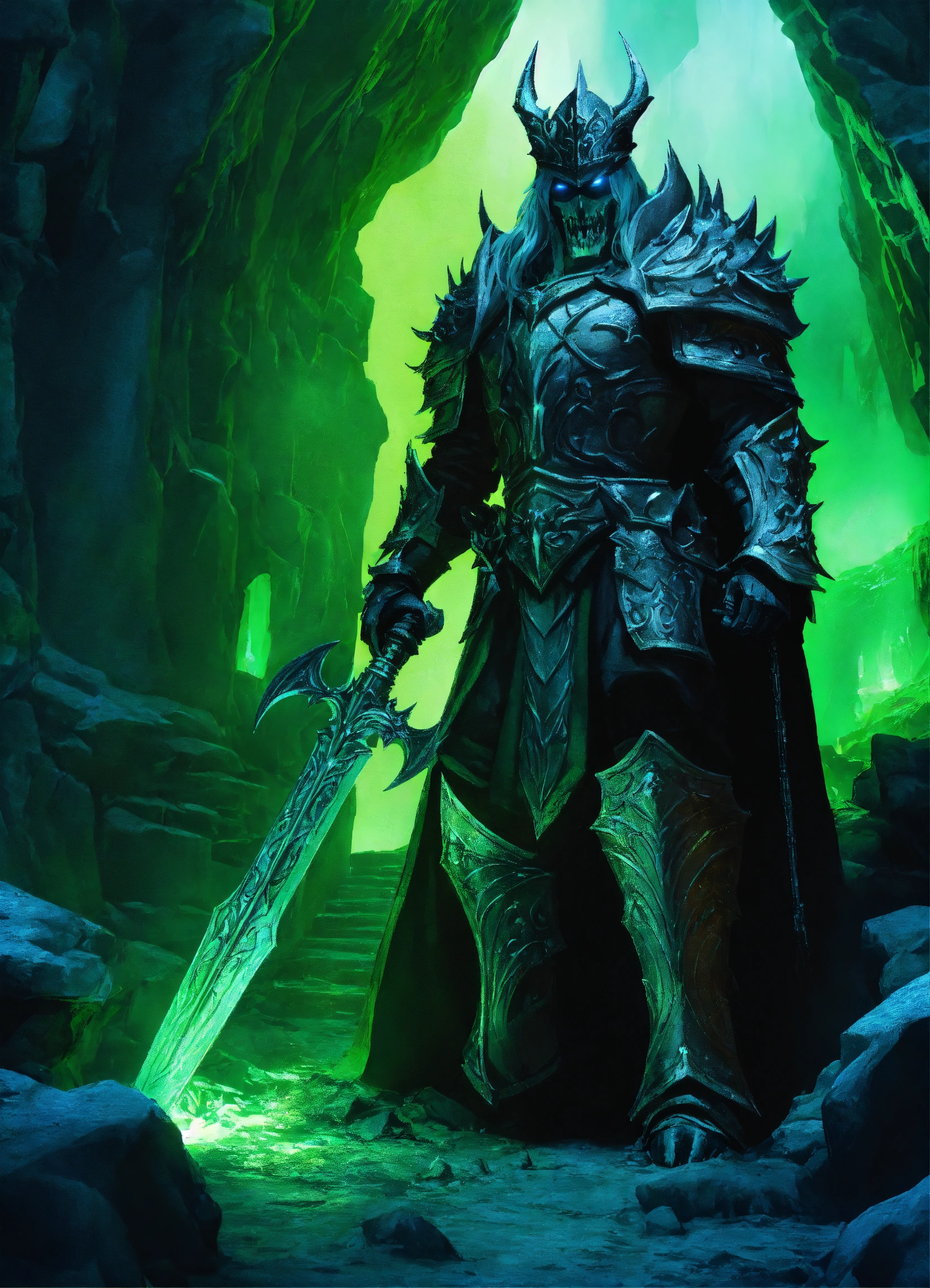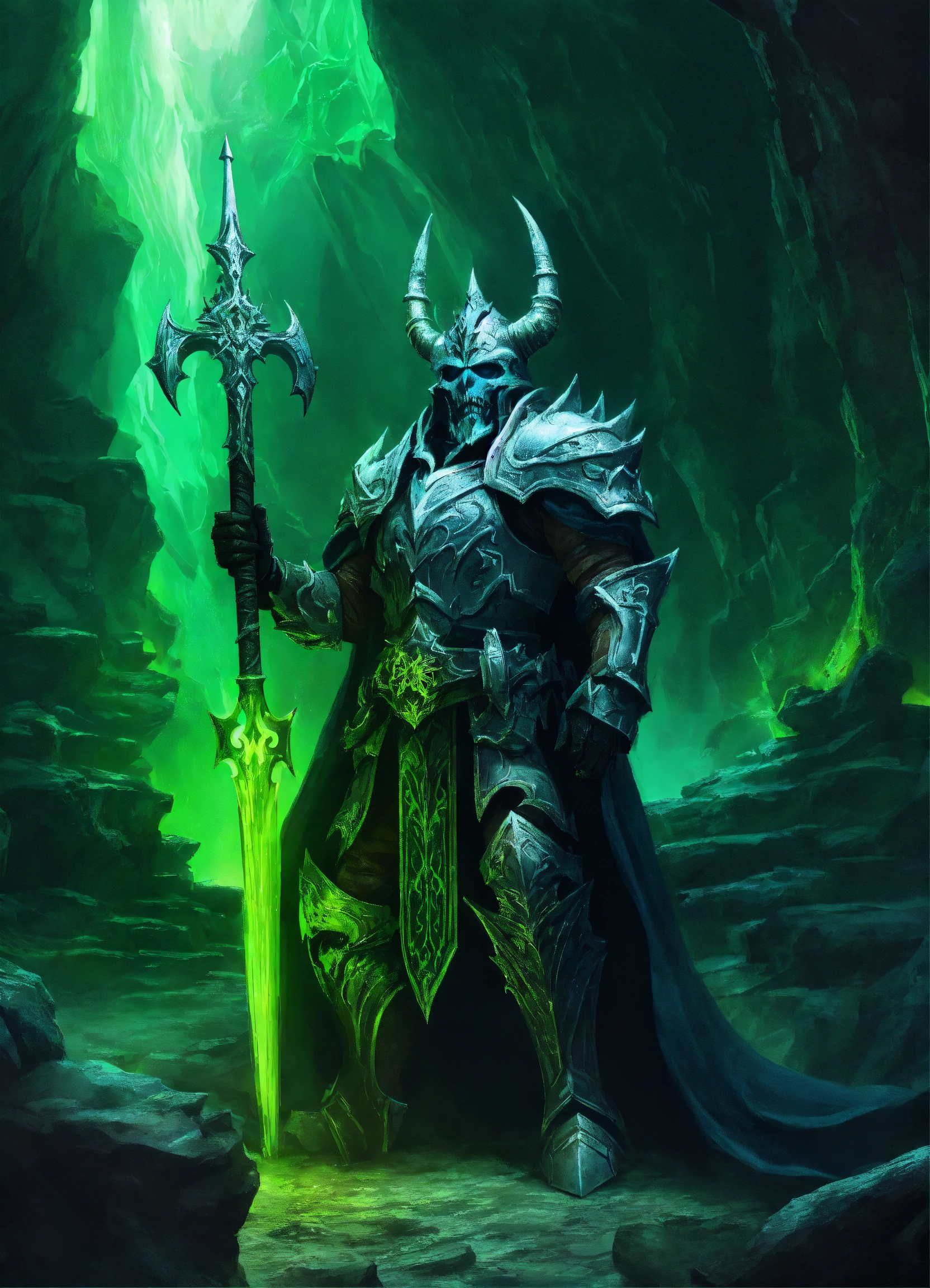 A fearsome lich king guarding the entrance to a cavern, dramatic green lighting, high definition, detailed