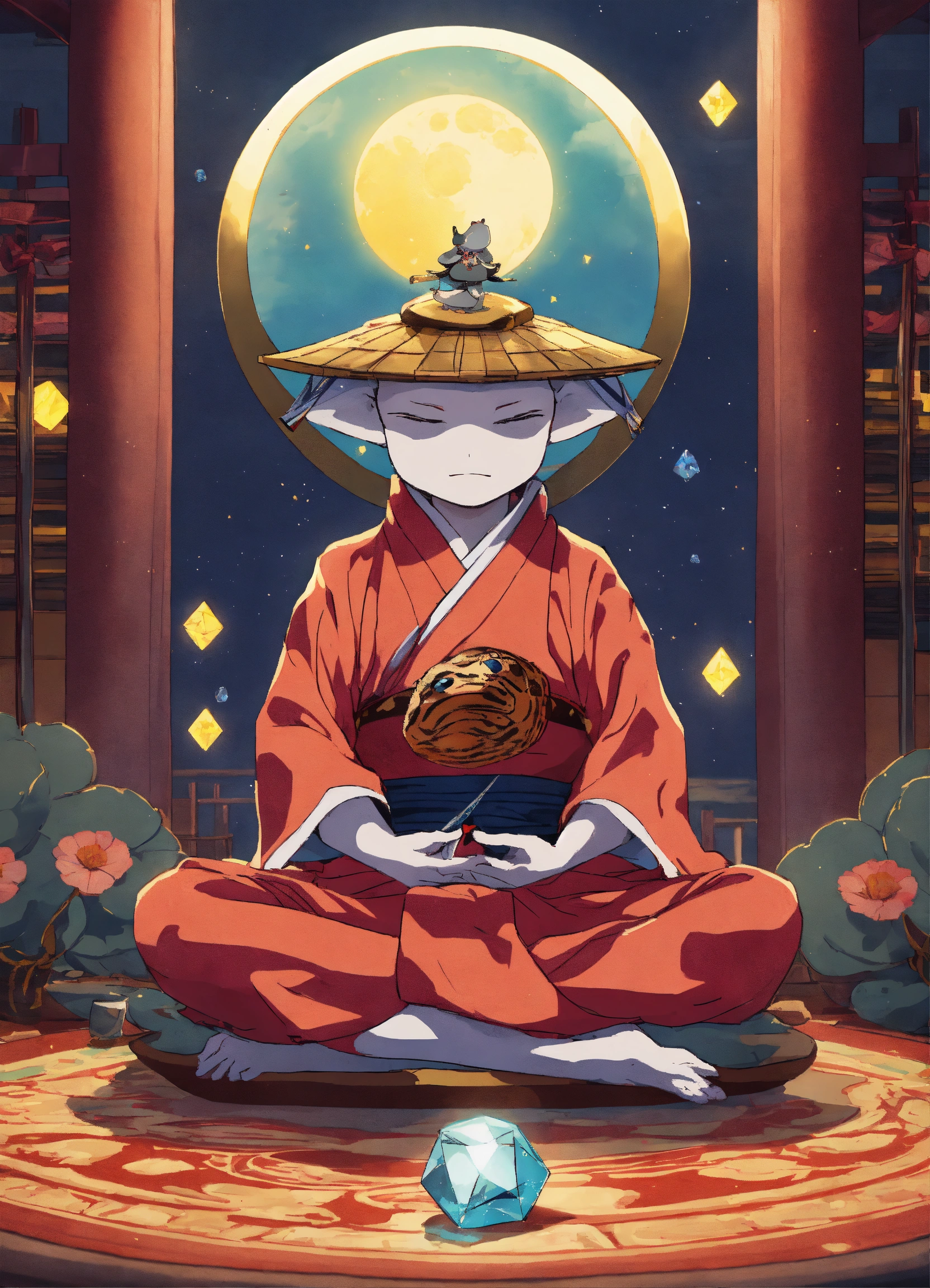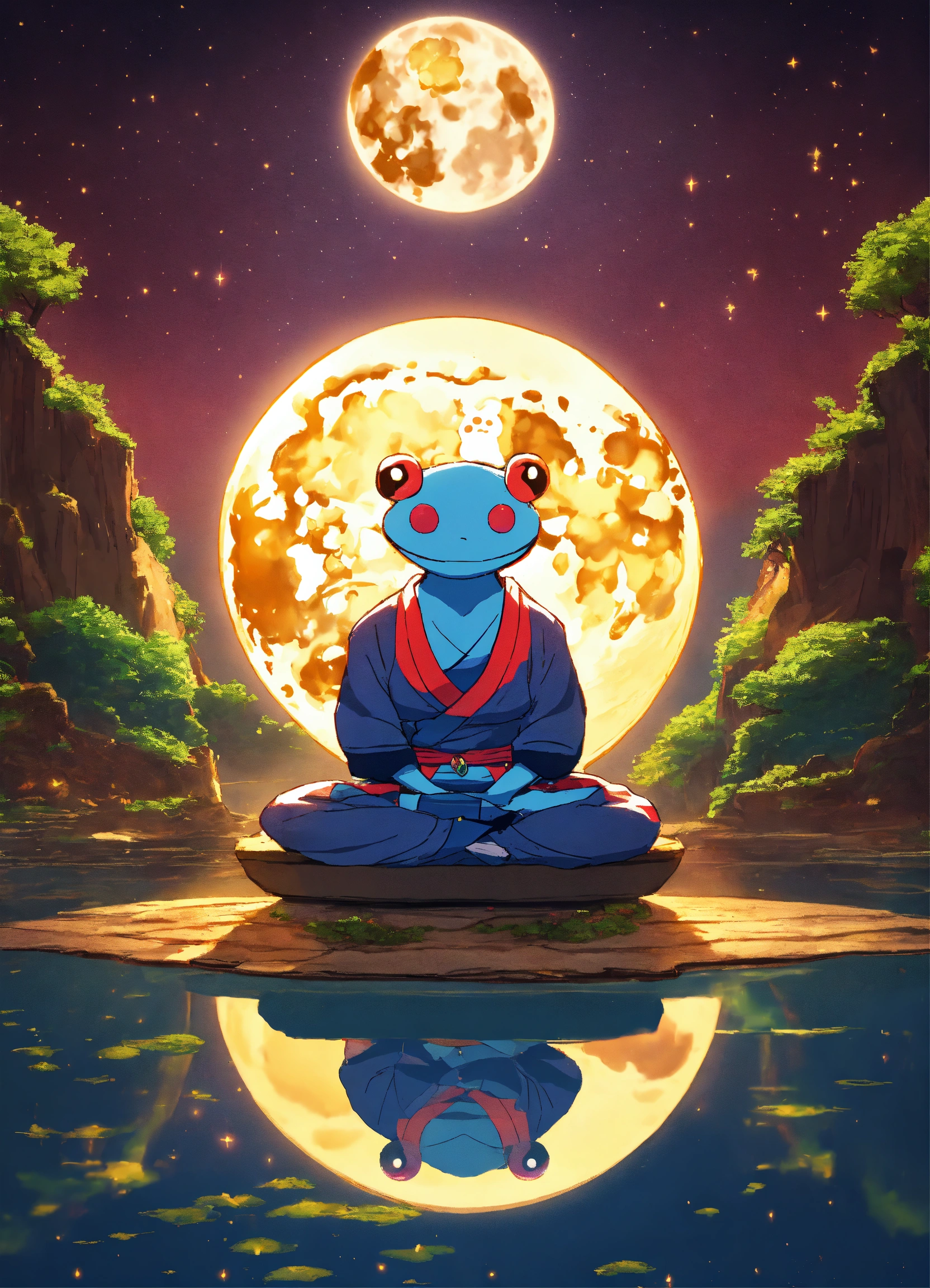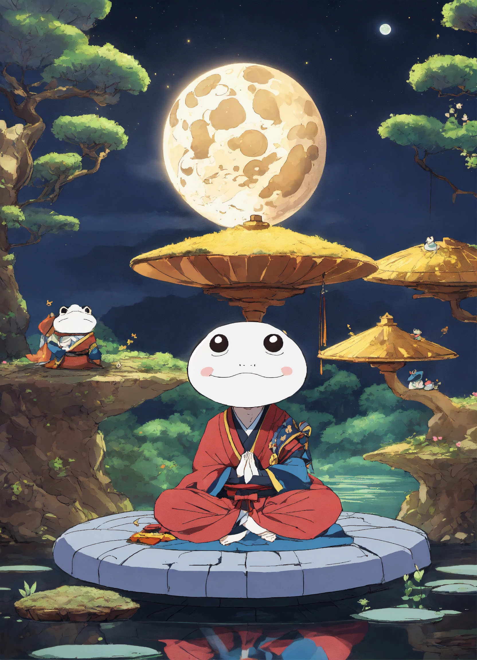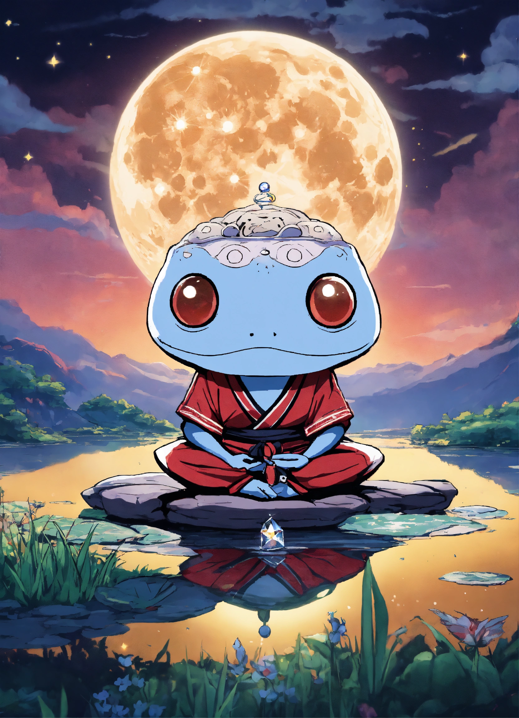 A cartoon anime moon floating with a face in meditation with a diamond toad samurai in meditation in a slice of life anime