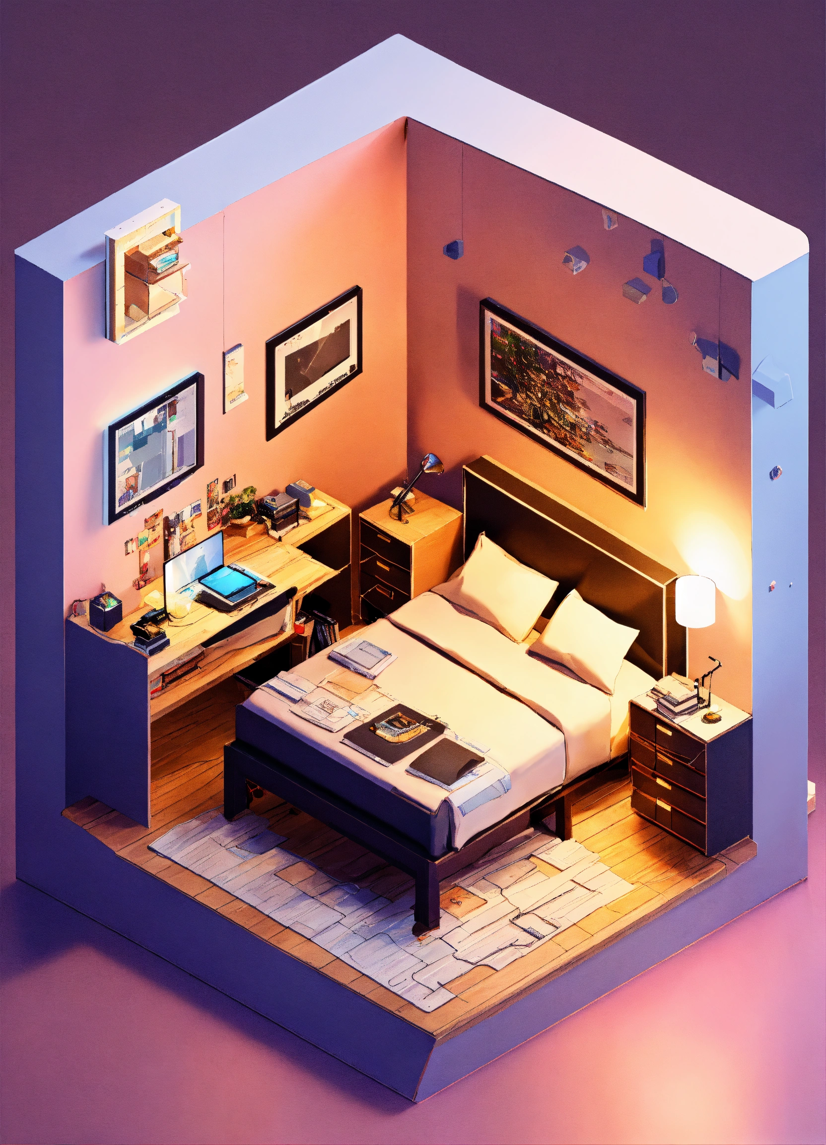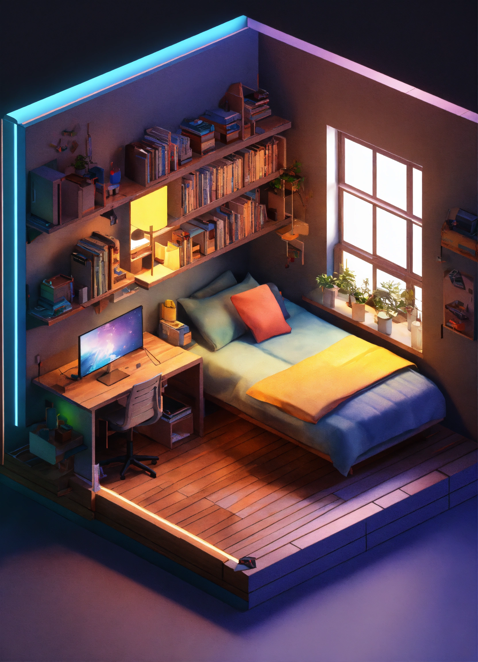 Cube cutout of an isometric programmer's bedroom, 3d art, professional colors, soft lighting, high detail, artstation, concept art, behance, ray tracing