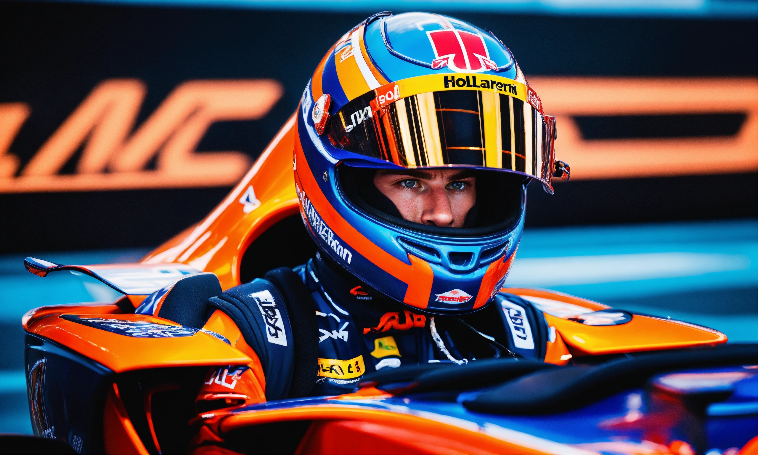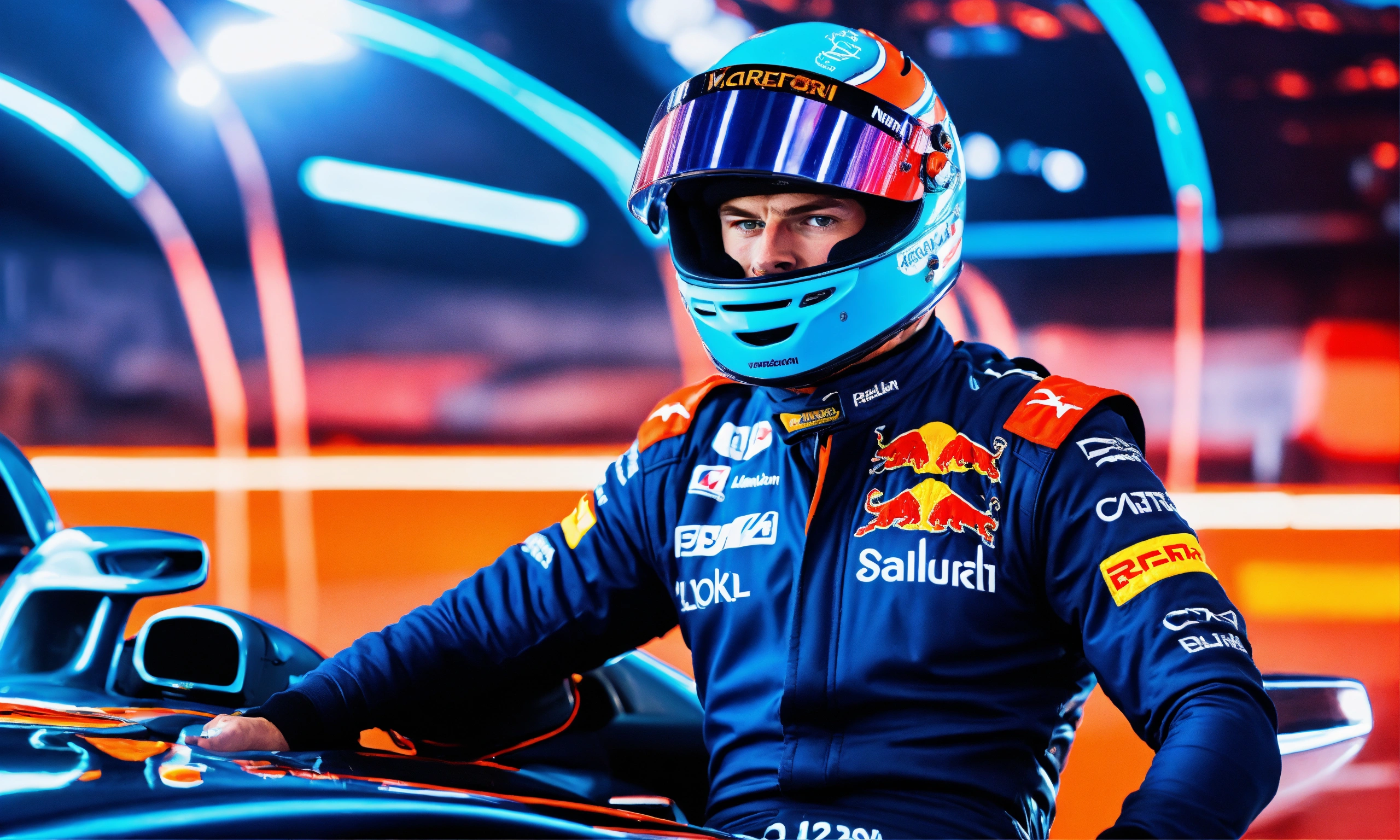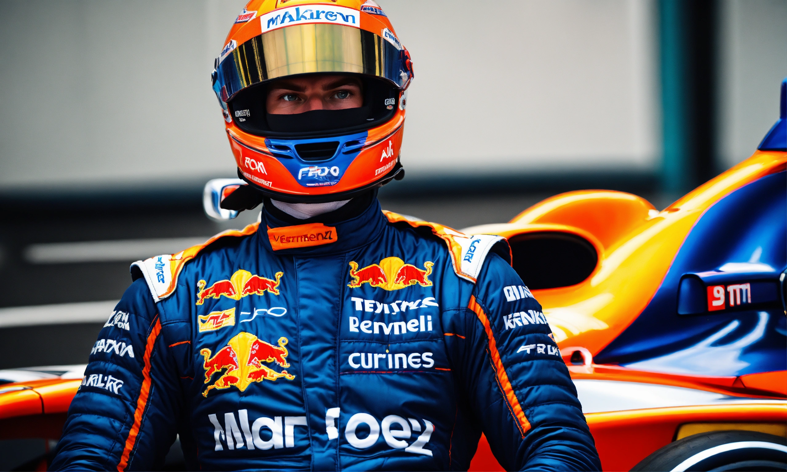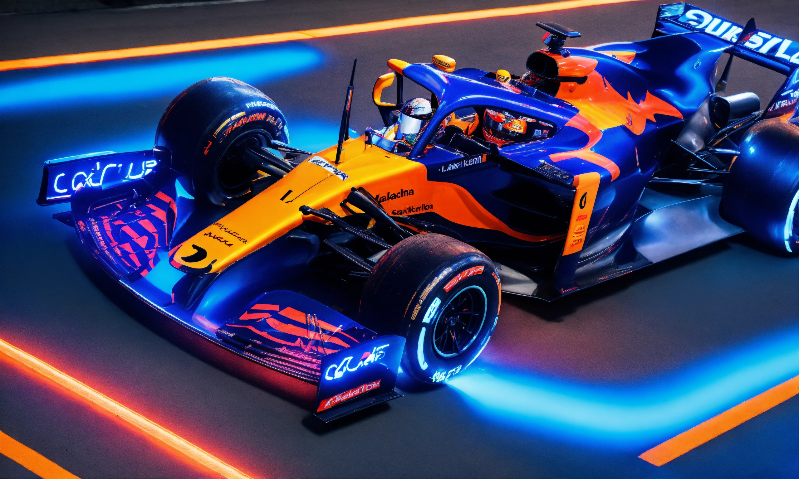 F1 pilot max verstappen sainz, lokking victorious, showing his face and his body in hos mclaren outfit, retrofuturistic, neon blue, with him on the top of his car