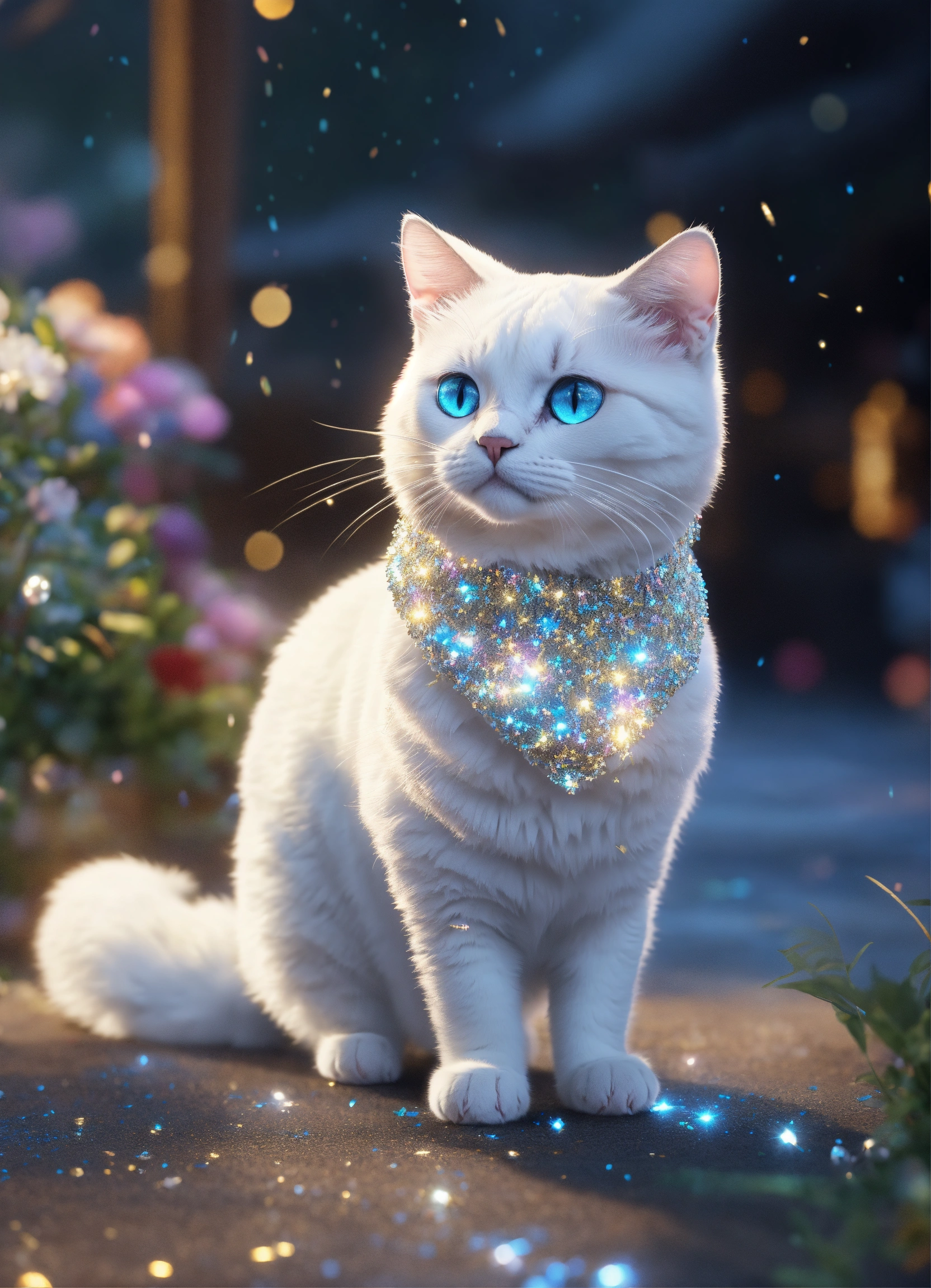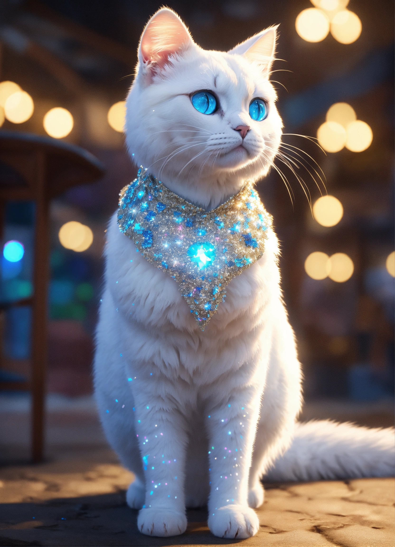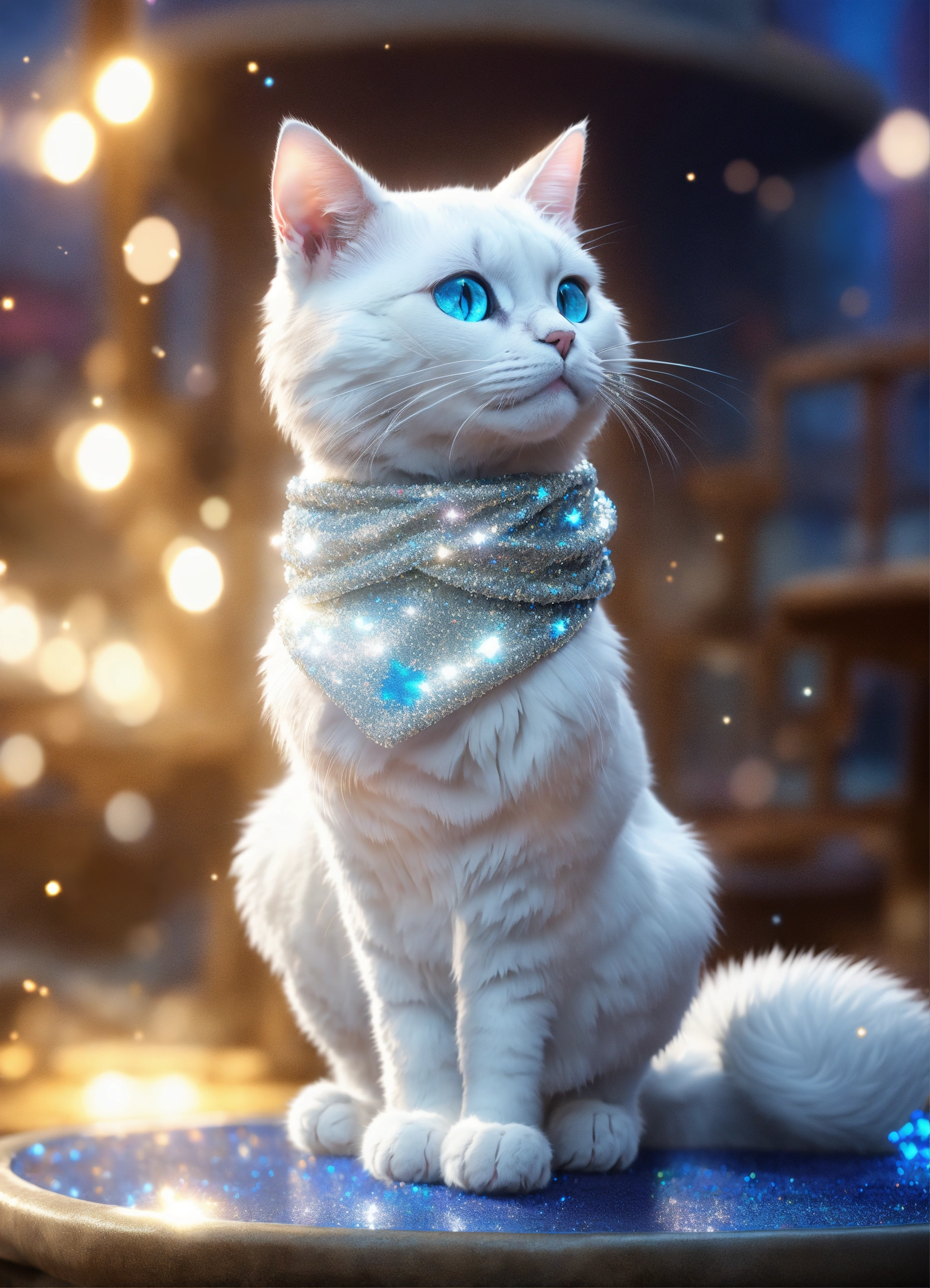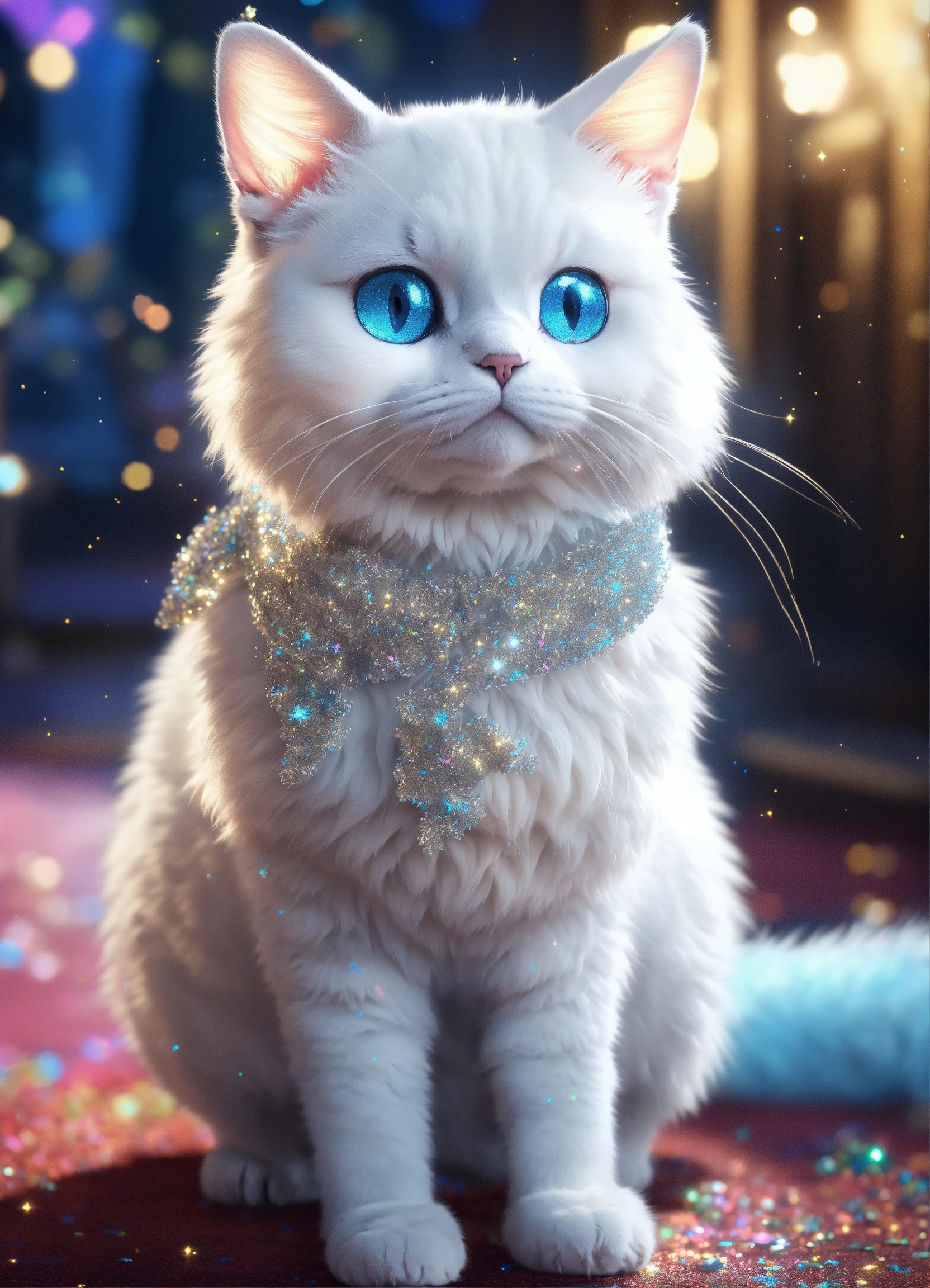 Character a white cat with a silver coat and sparkling blue eyes, the coat is sprinkled with glitter dust, a magic tail of sequins, full - length, ghibli_ studio meets disney style, unreal engine render, 8k, realistic photo, 4k realistic photo
