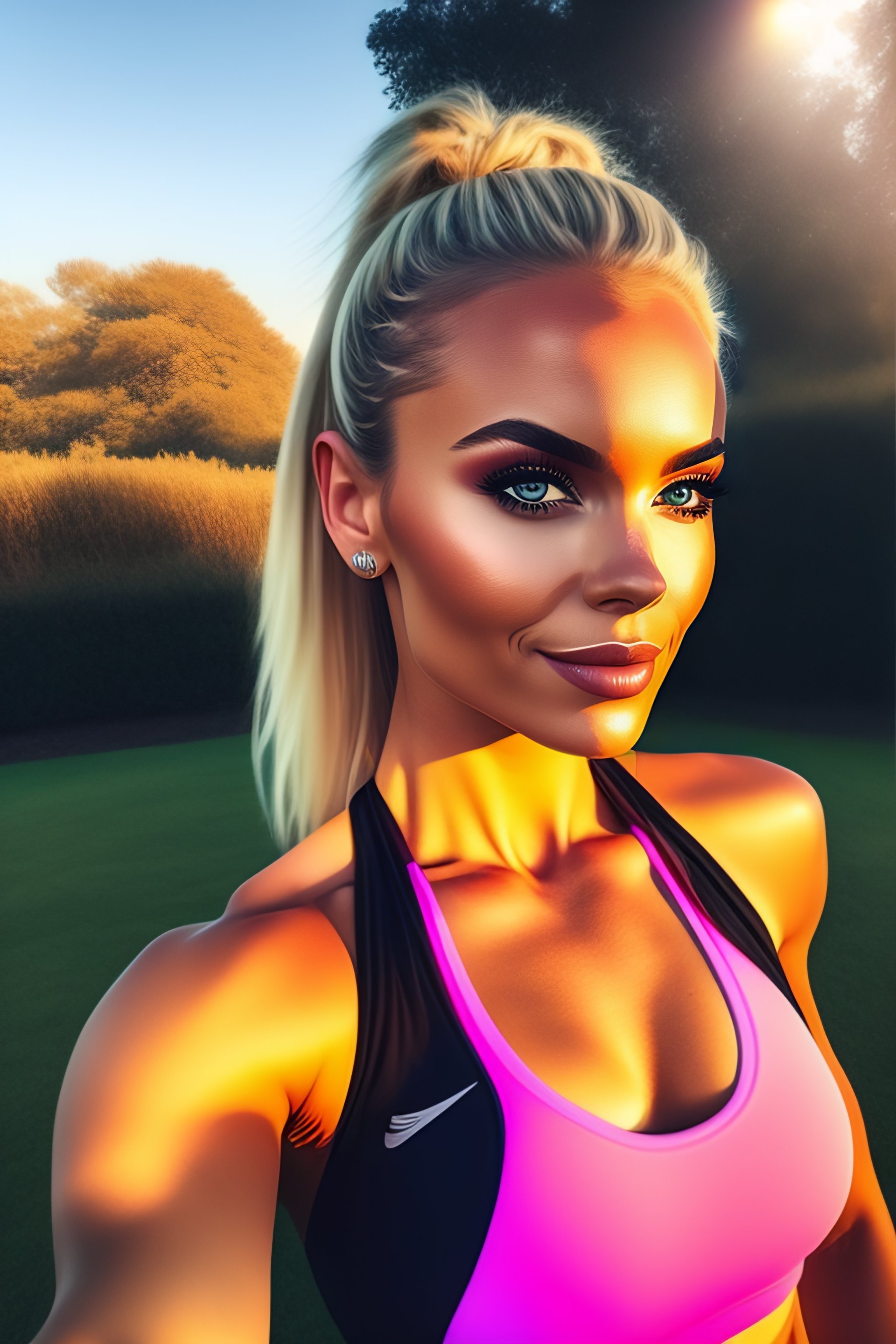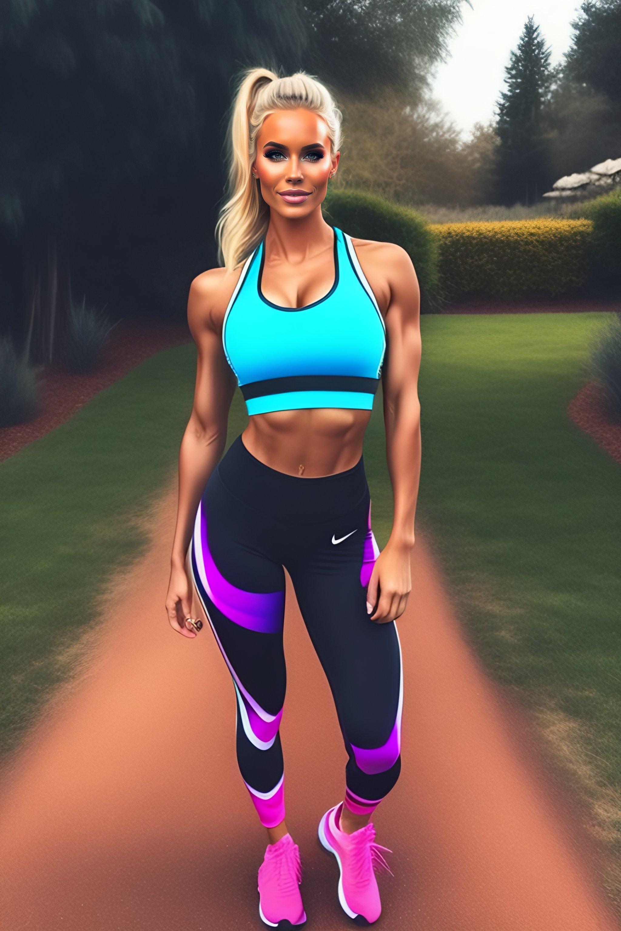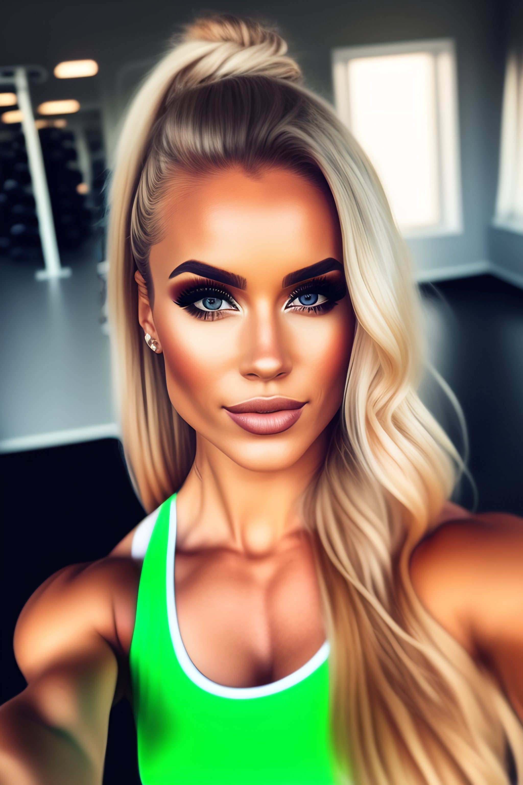 Blonde girl on instagram posing in gym clothes, blonde ponytail, leggins, sports bra, selfi, relistic, photo, full body, fitness, aesthetic, stunning