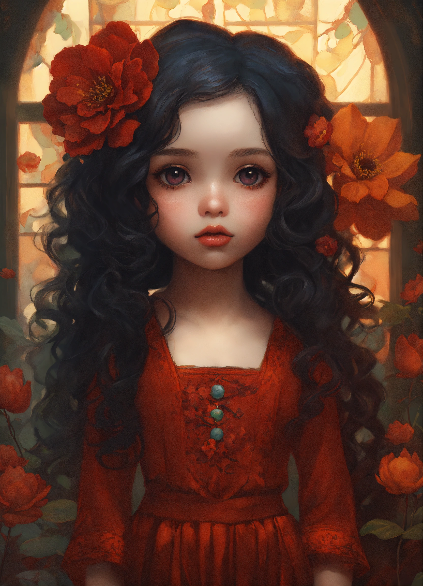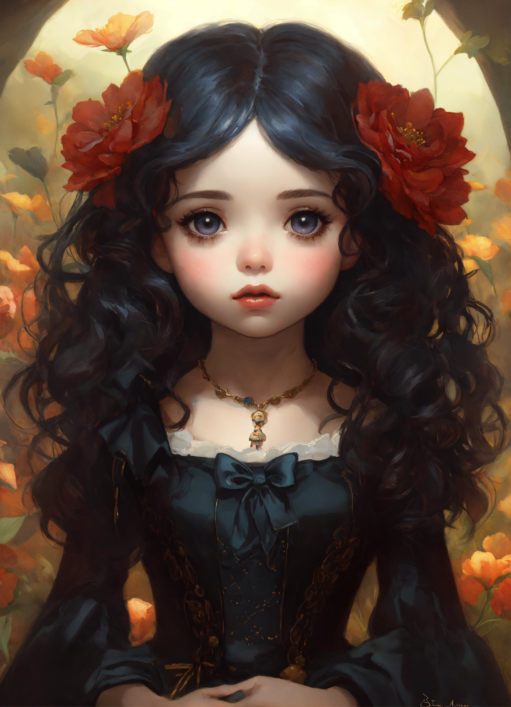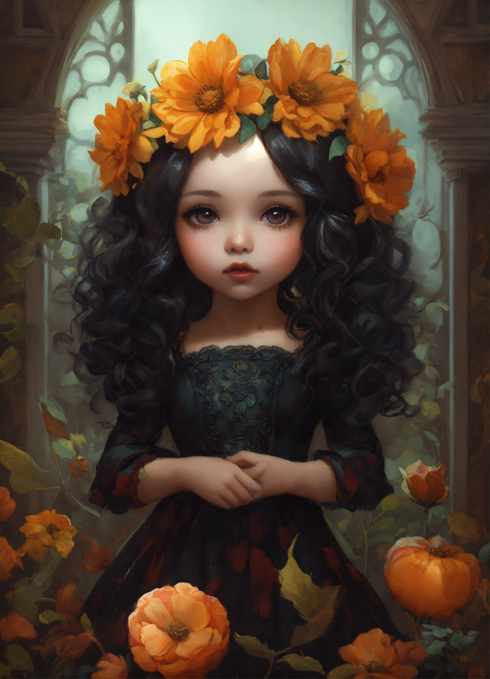 Portrait of a cute gothic chibi girl kewpie autmn clothes, long curly hair oil paint vray, and flowers by stanley artgerm and tom bagshaw