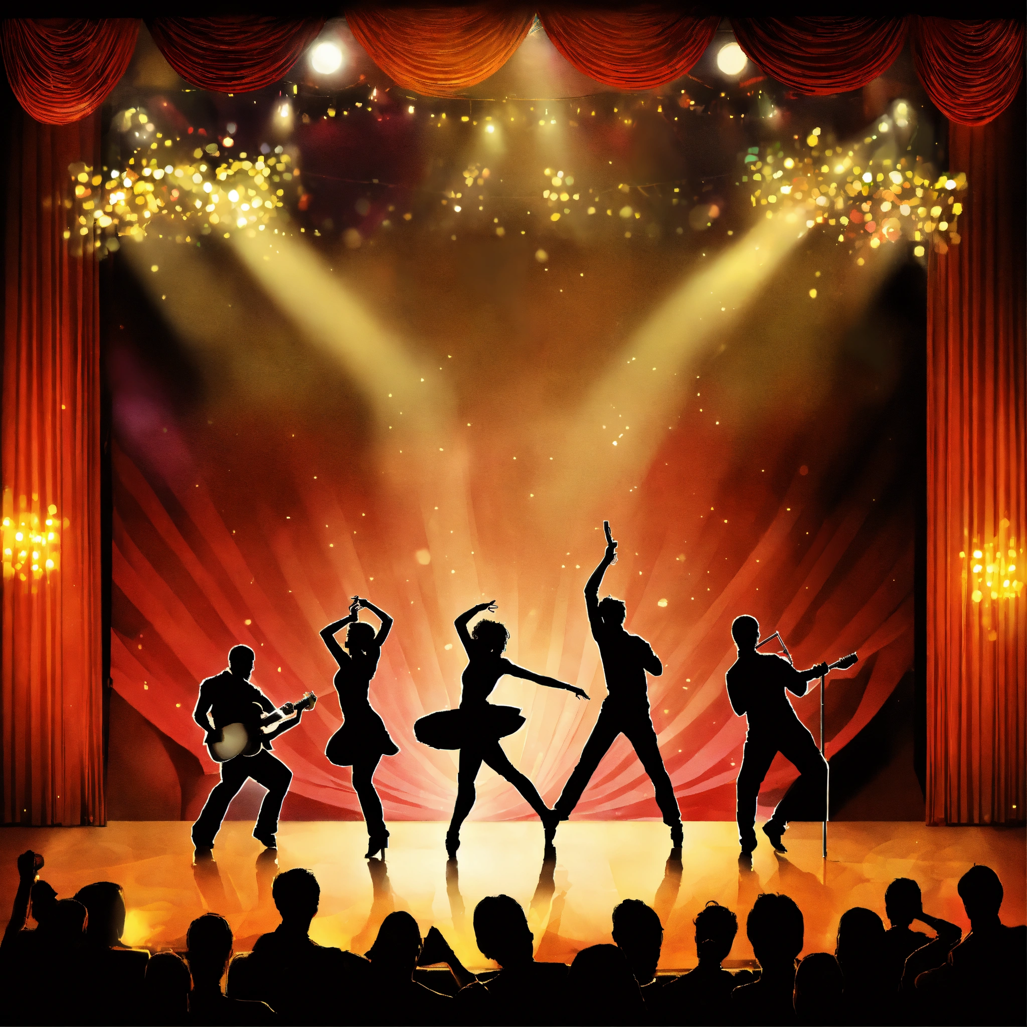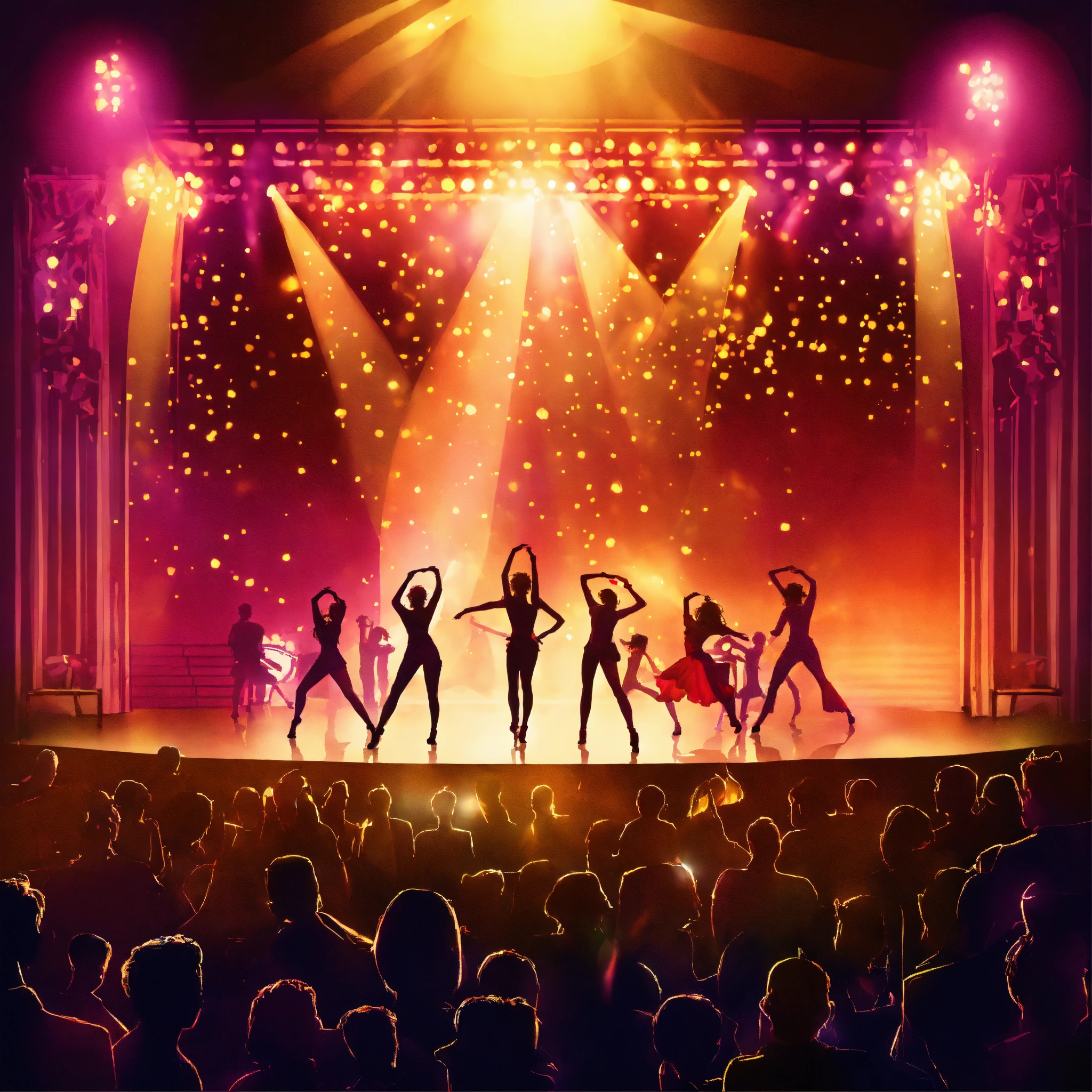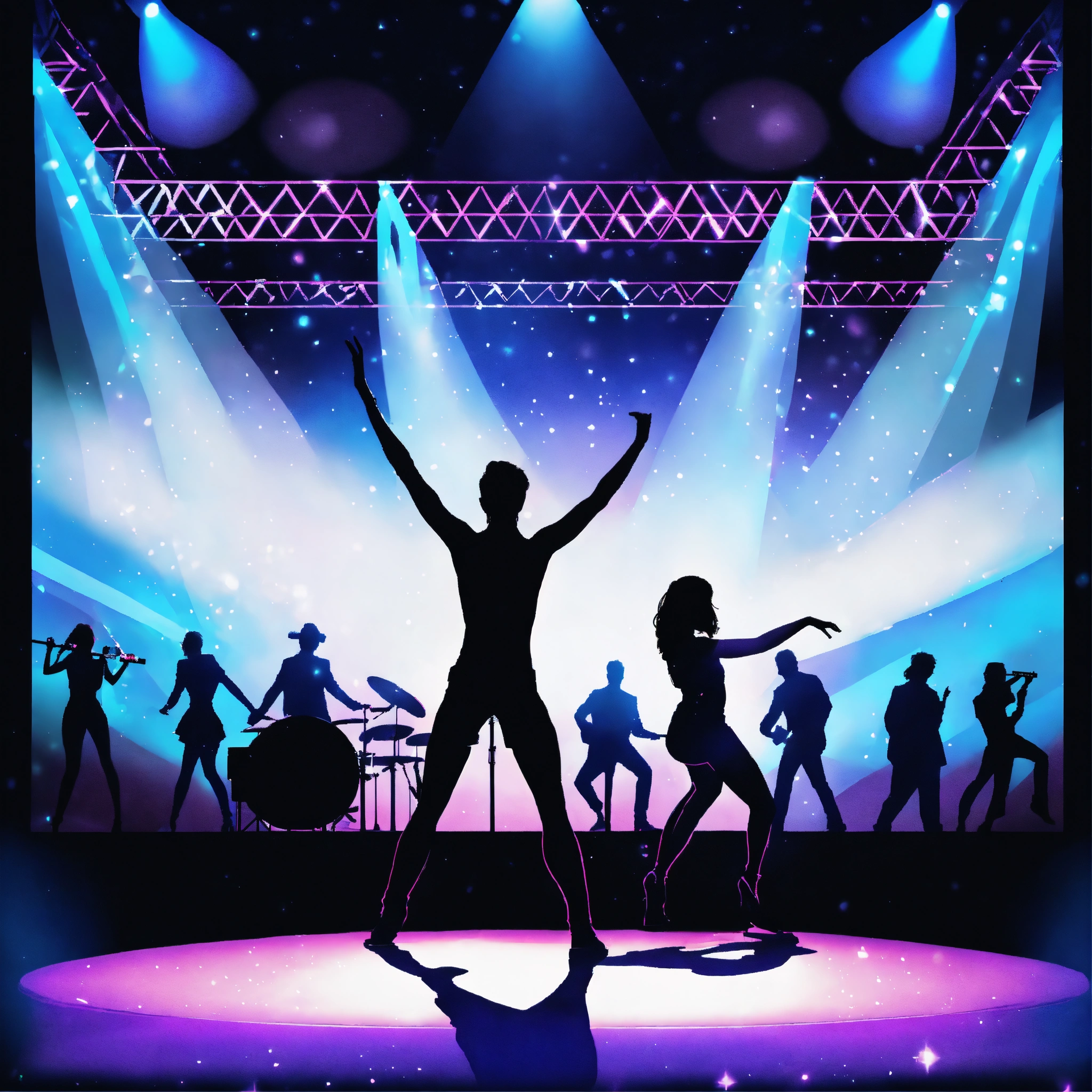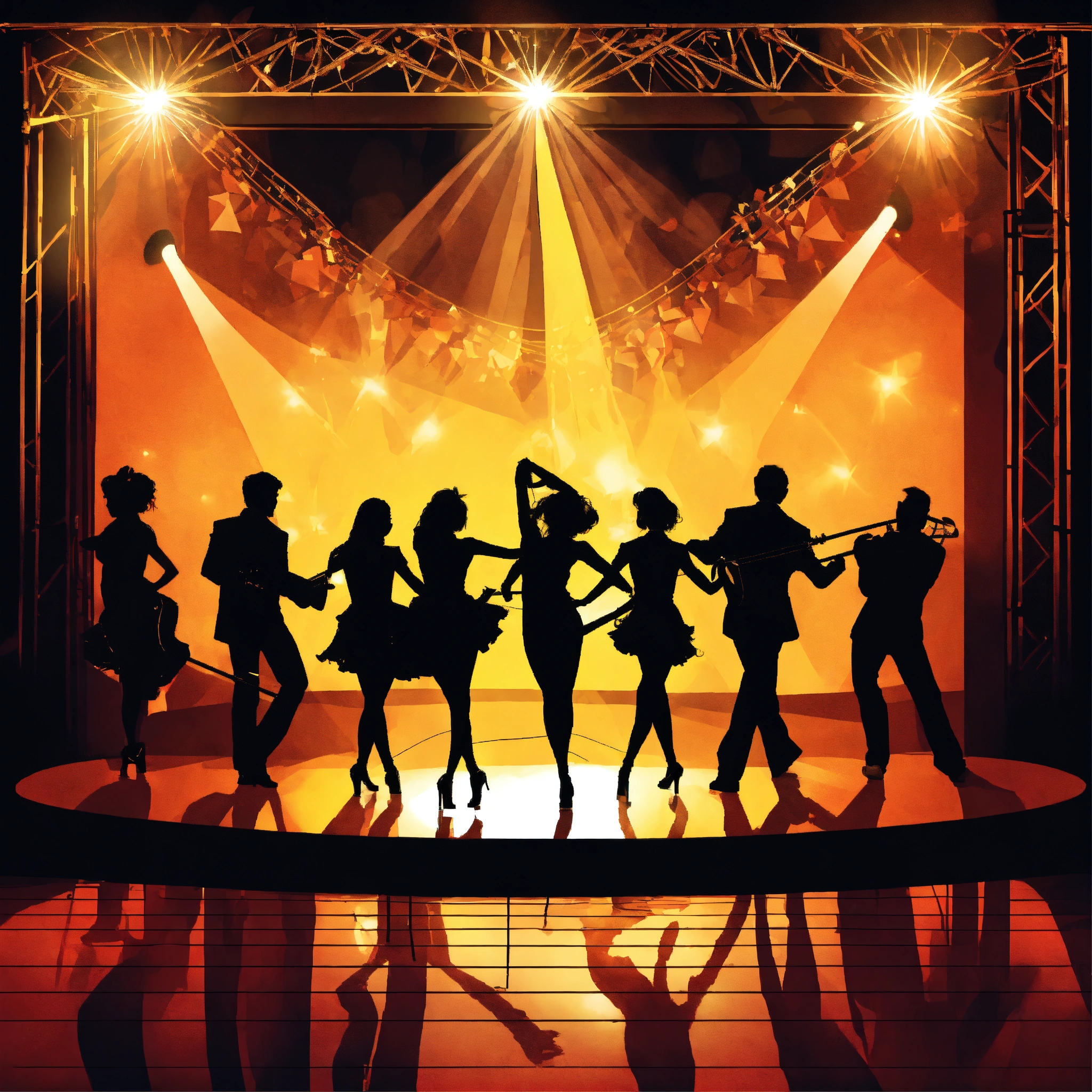 A dance and musical concert poster with stage view, include dancers and a live band on stage, dont include any text