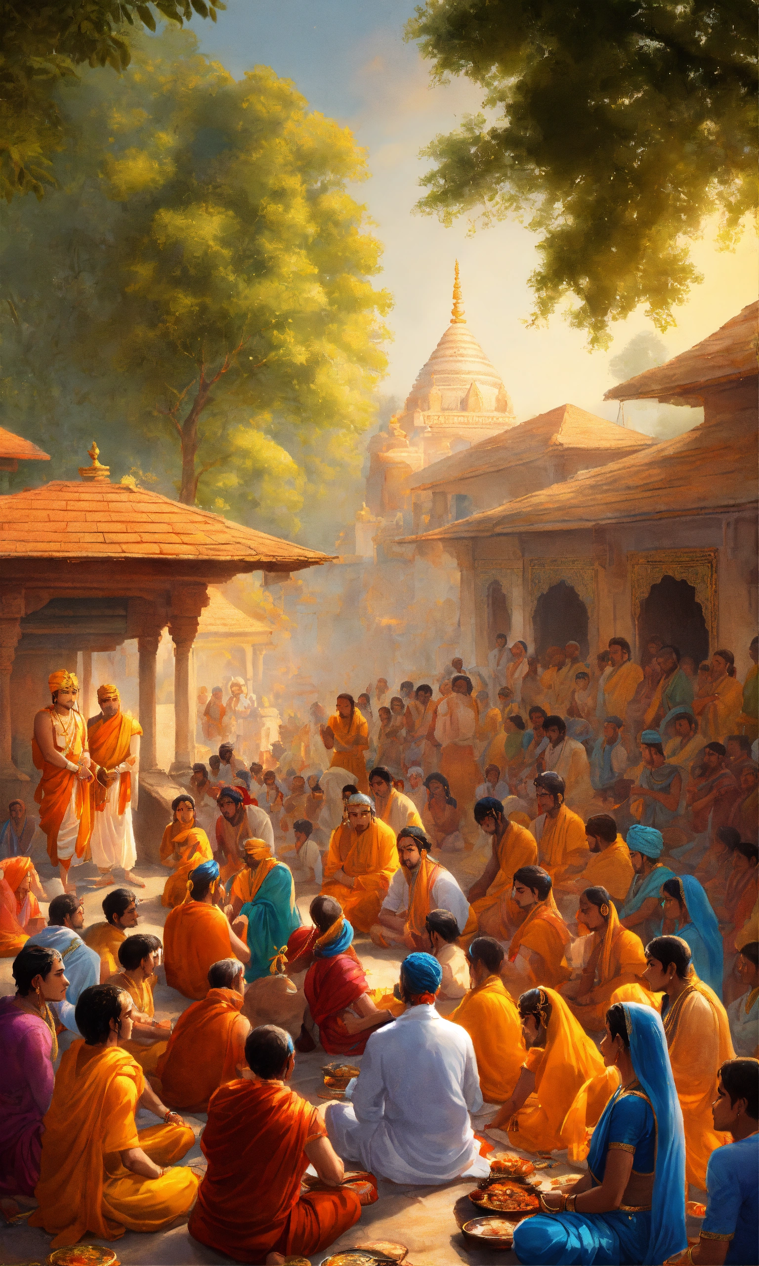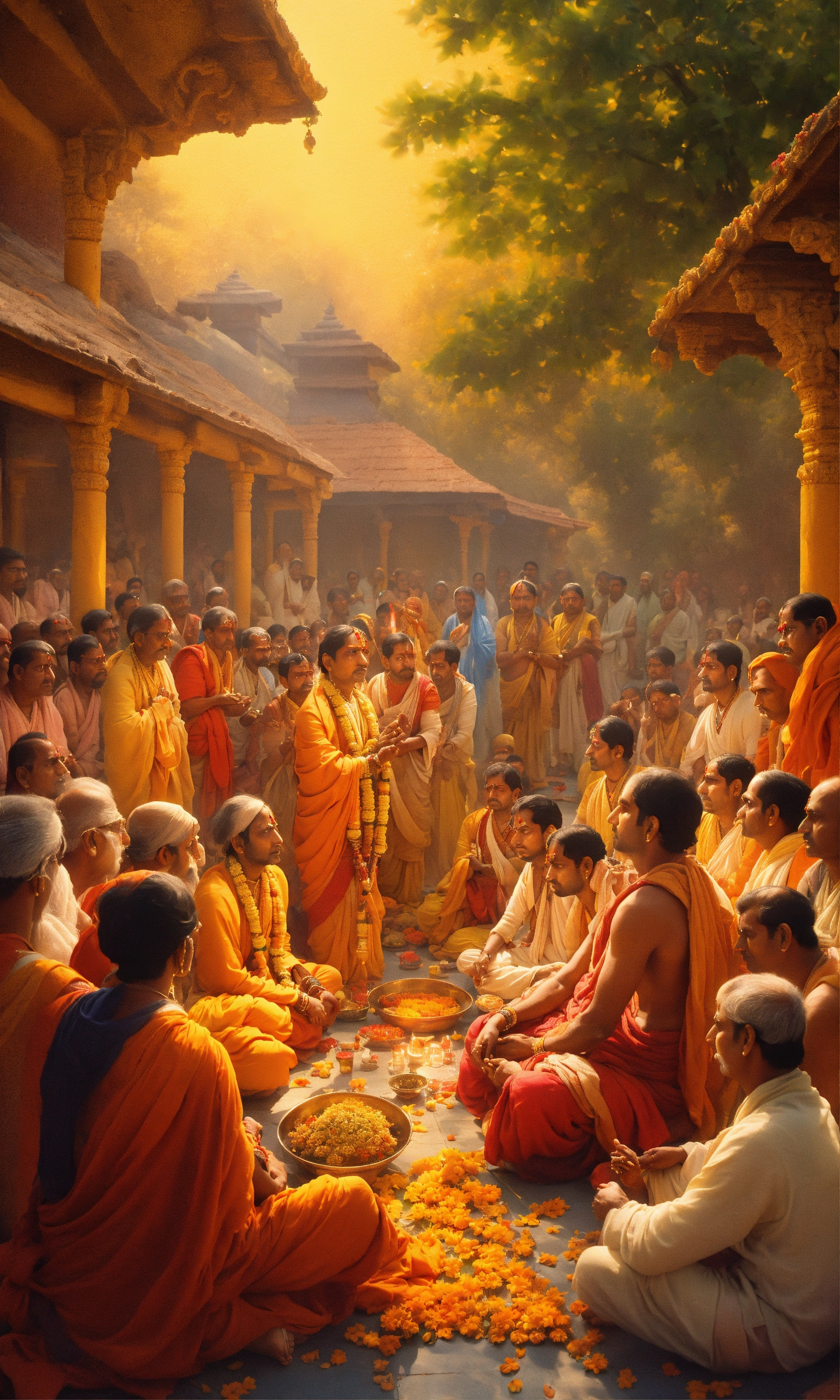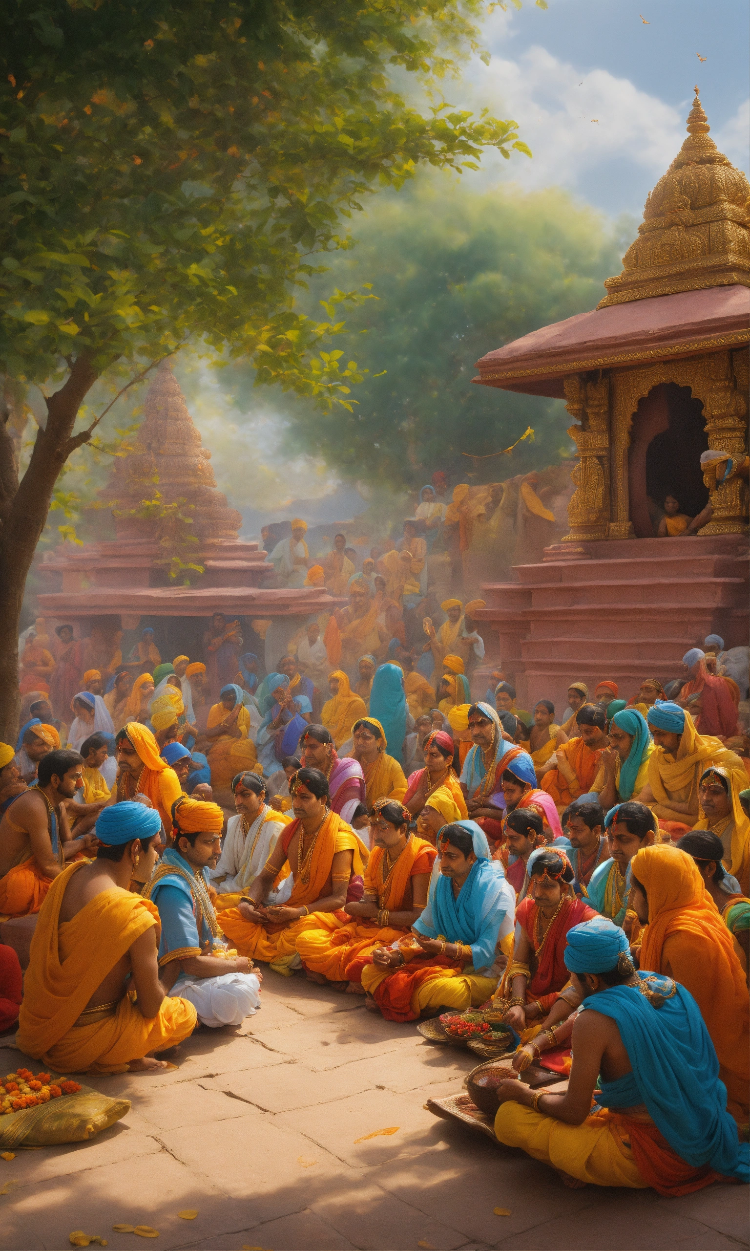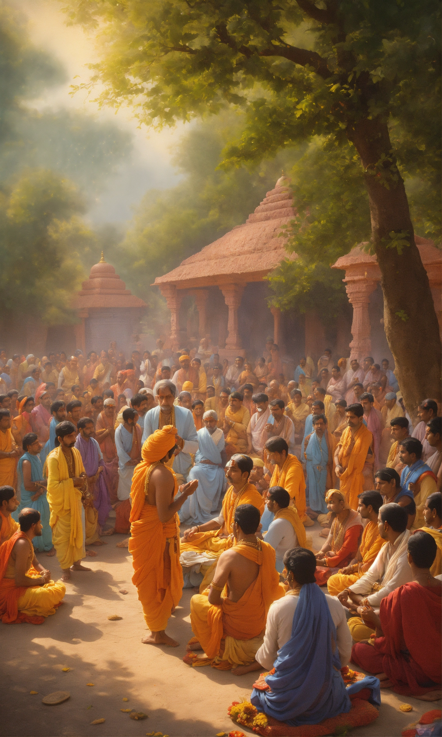 Over the course of the day, word spread throughout the village that lord krishna was offering his guidance and assistance. devotees gathered at his feet, seeking counsel for various aspects of their lives. he listened attentively to their problems and provided profound solutions, all while imparting the teachings of dharma and karma.