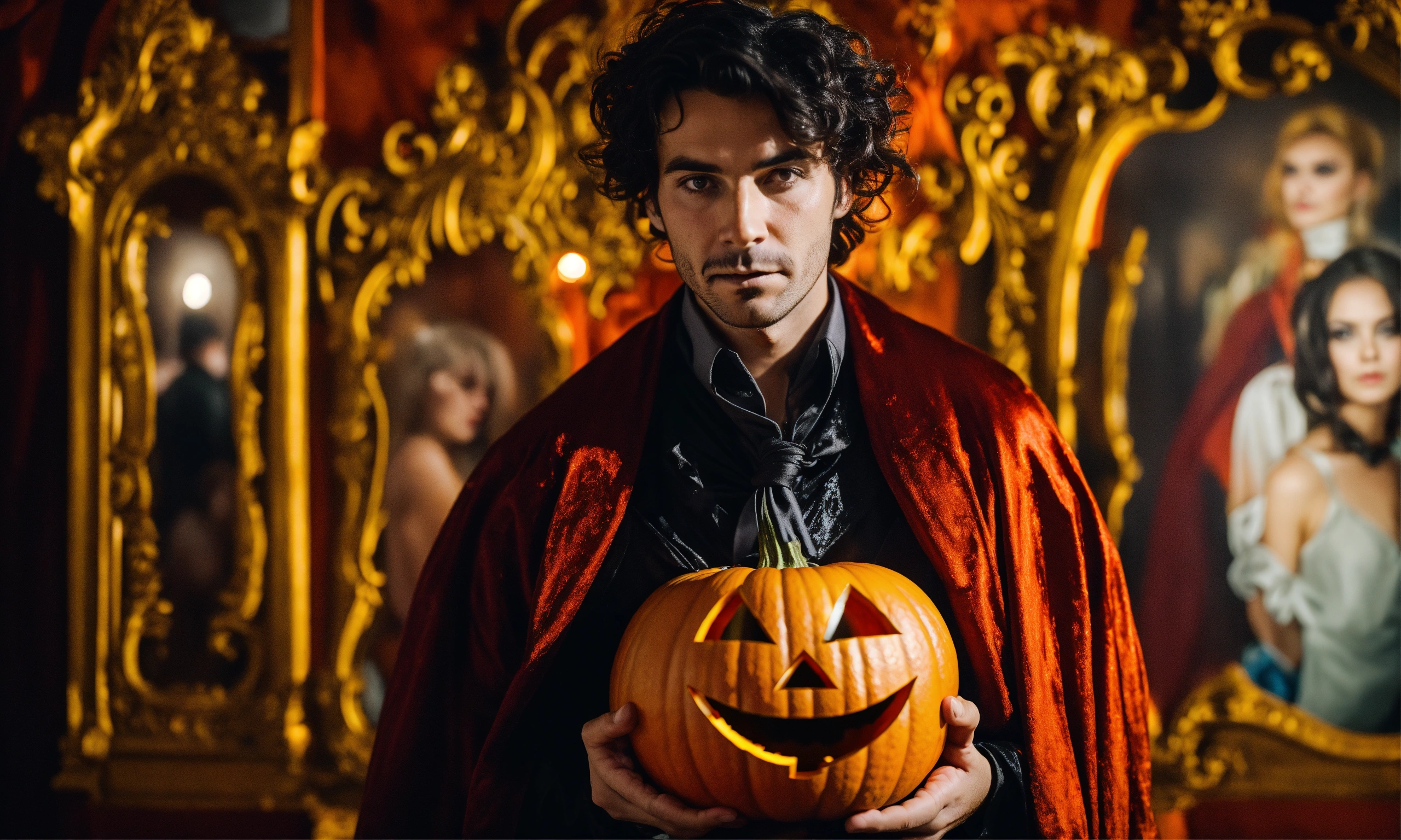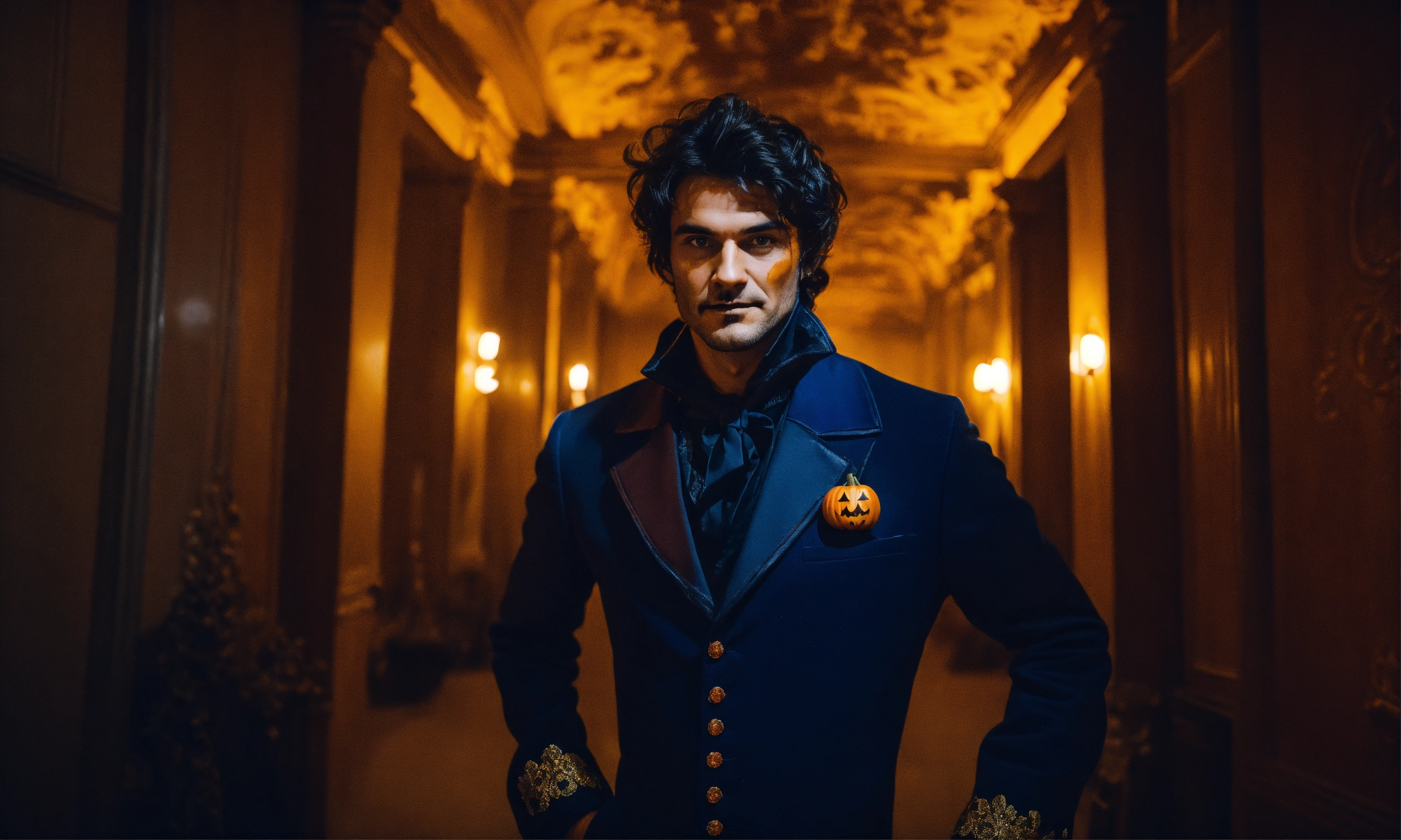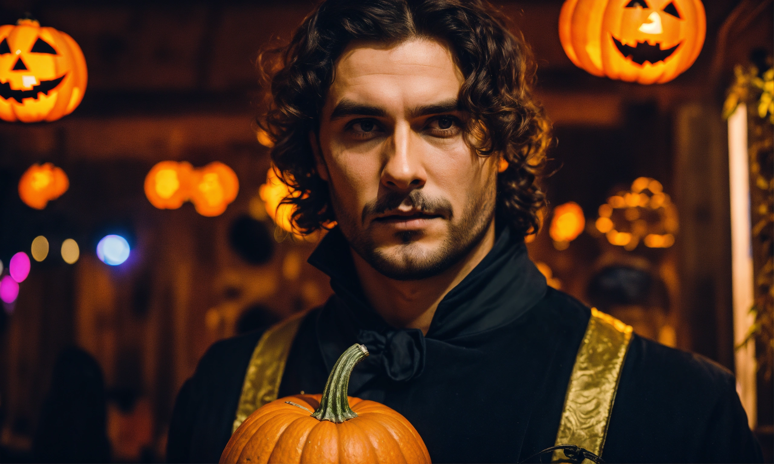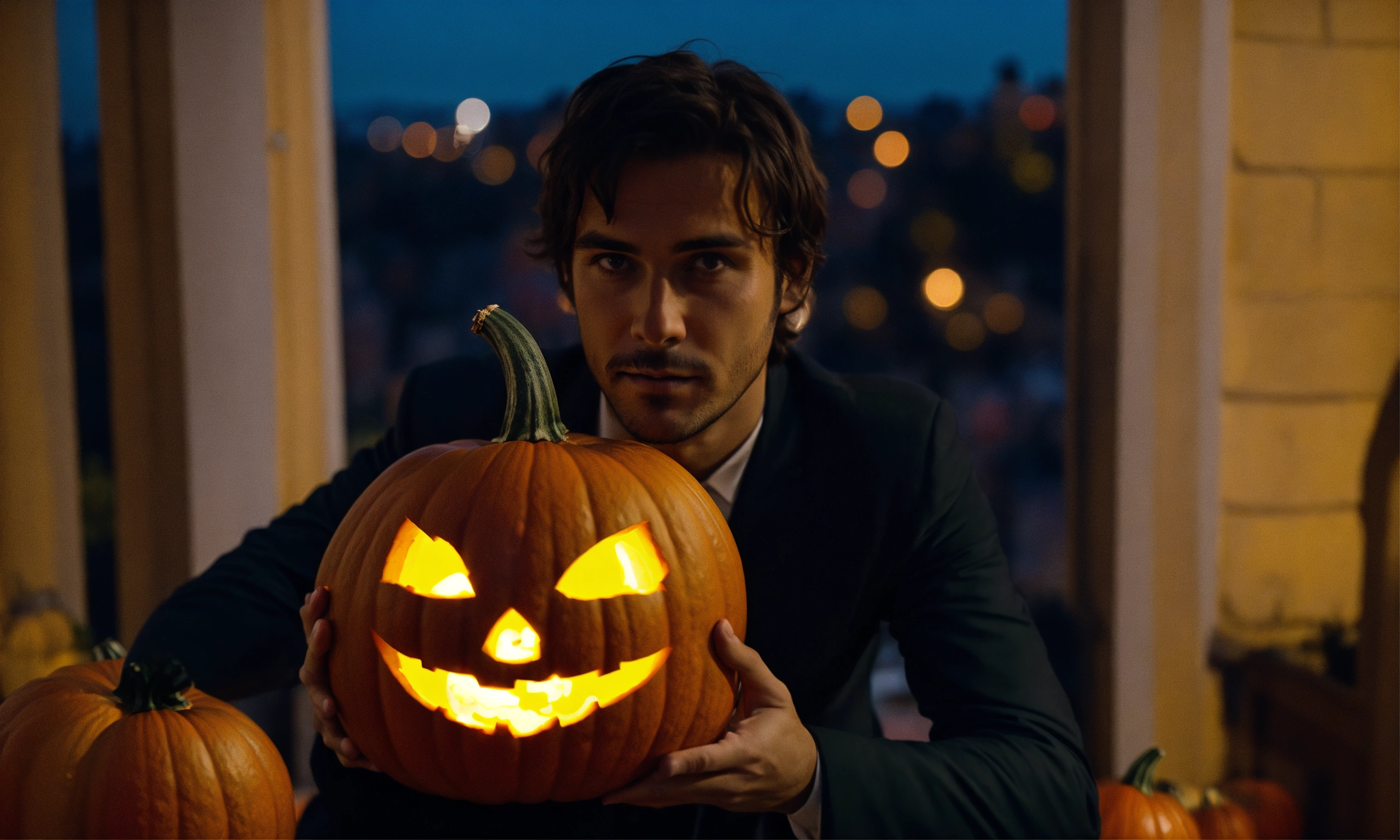 Сute man with dark average hair, at a halloween party, in poland, in a halloween costume, warsaw, poland, at the top of the riviera lookinag at the camera at half height, focus on the face, carved face on a pumpkin