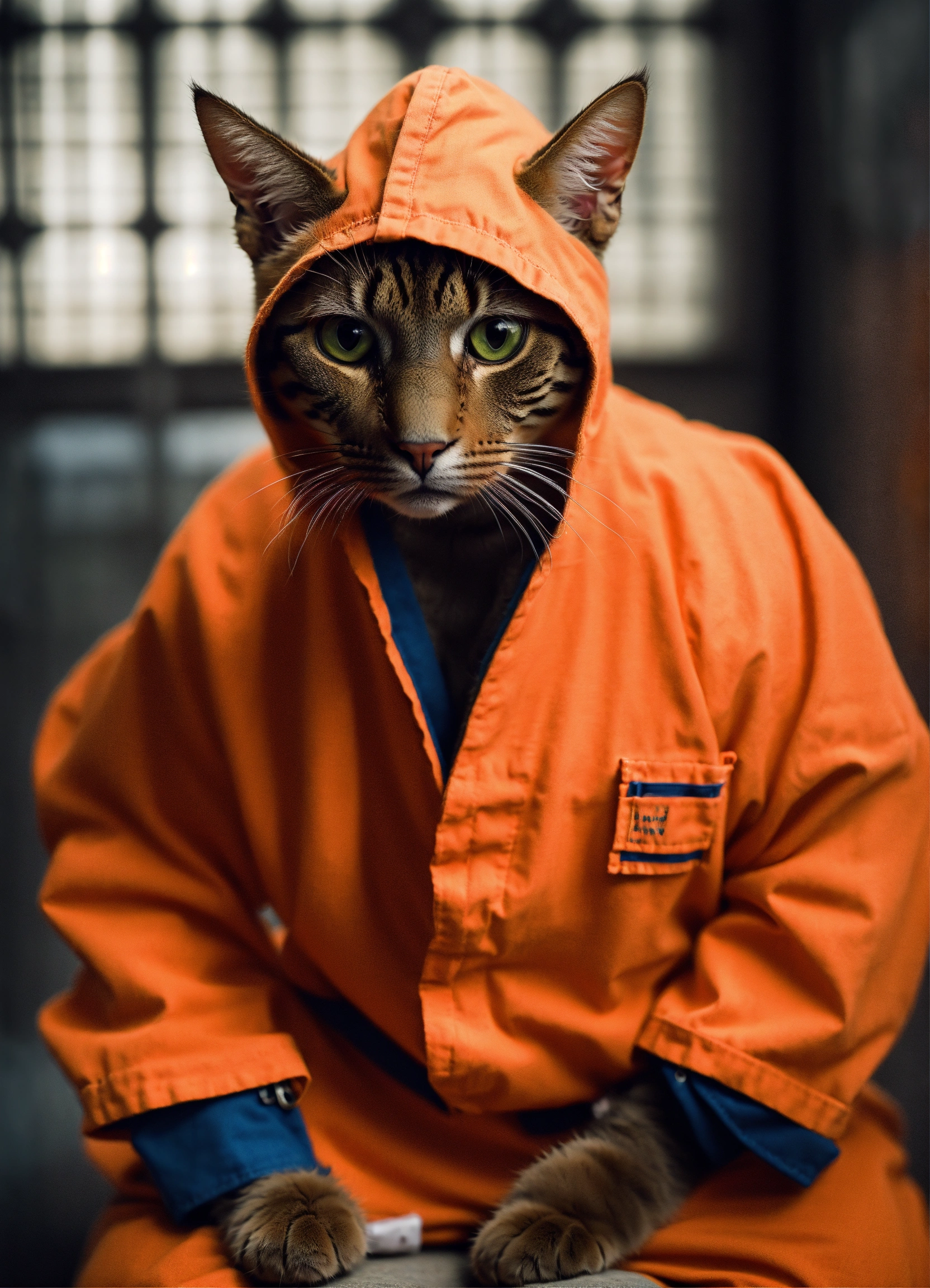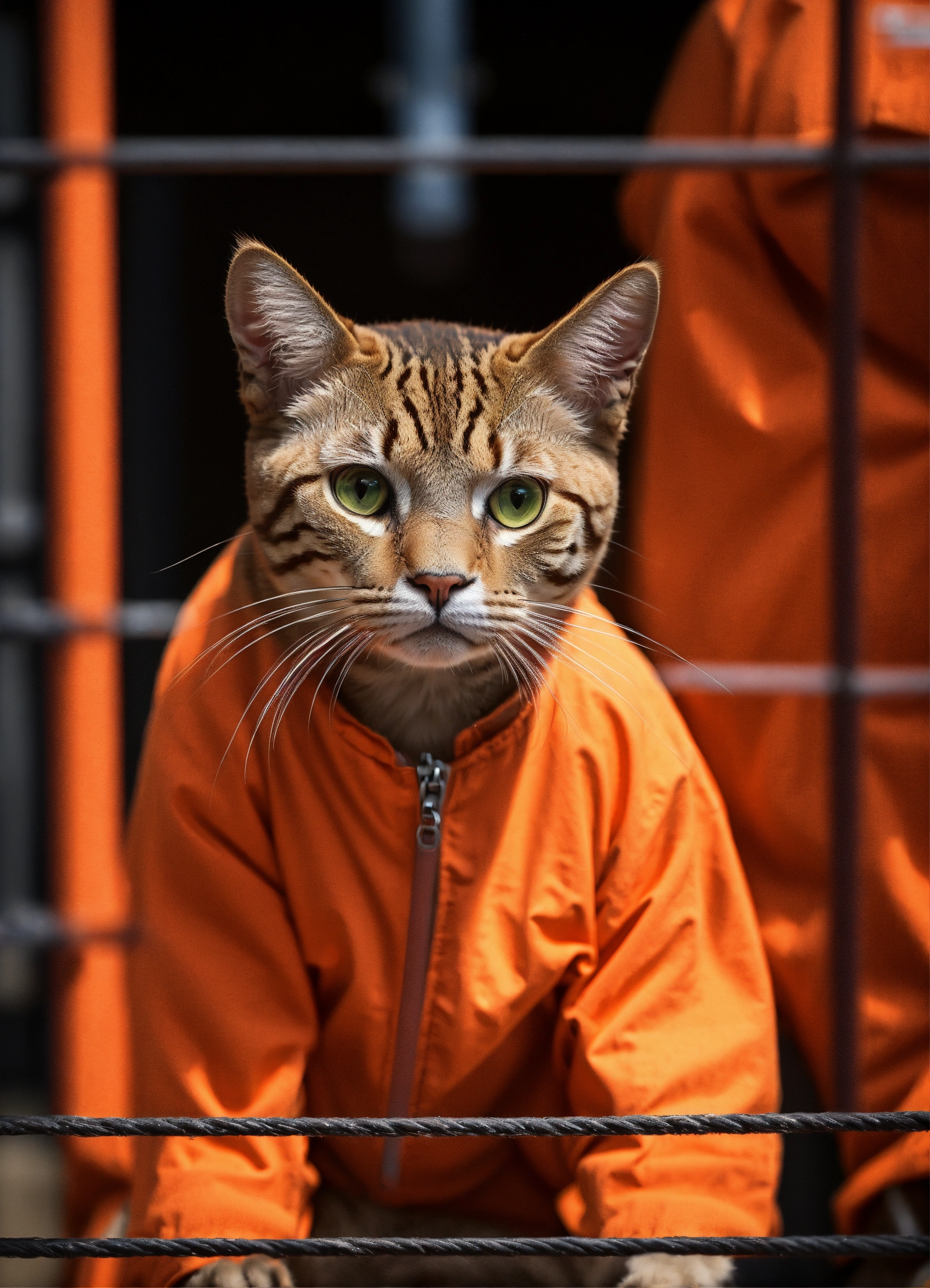 A humanoid havana brown cat wearing inmate orange jumpsuit outfit in prison, high detail, high-resolution photograph, professional photography, ultra-detail