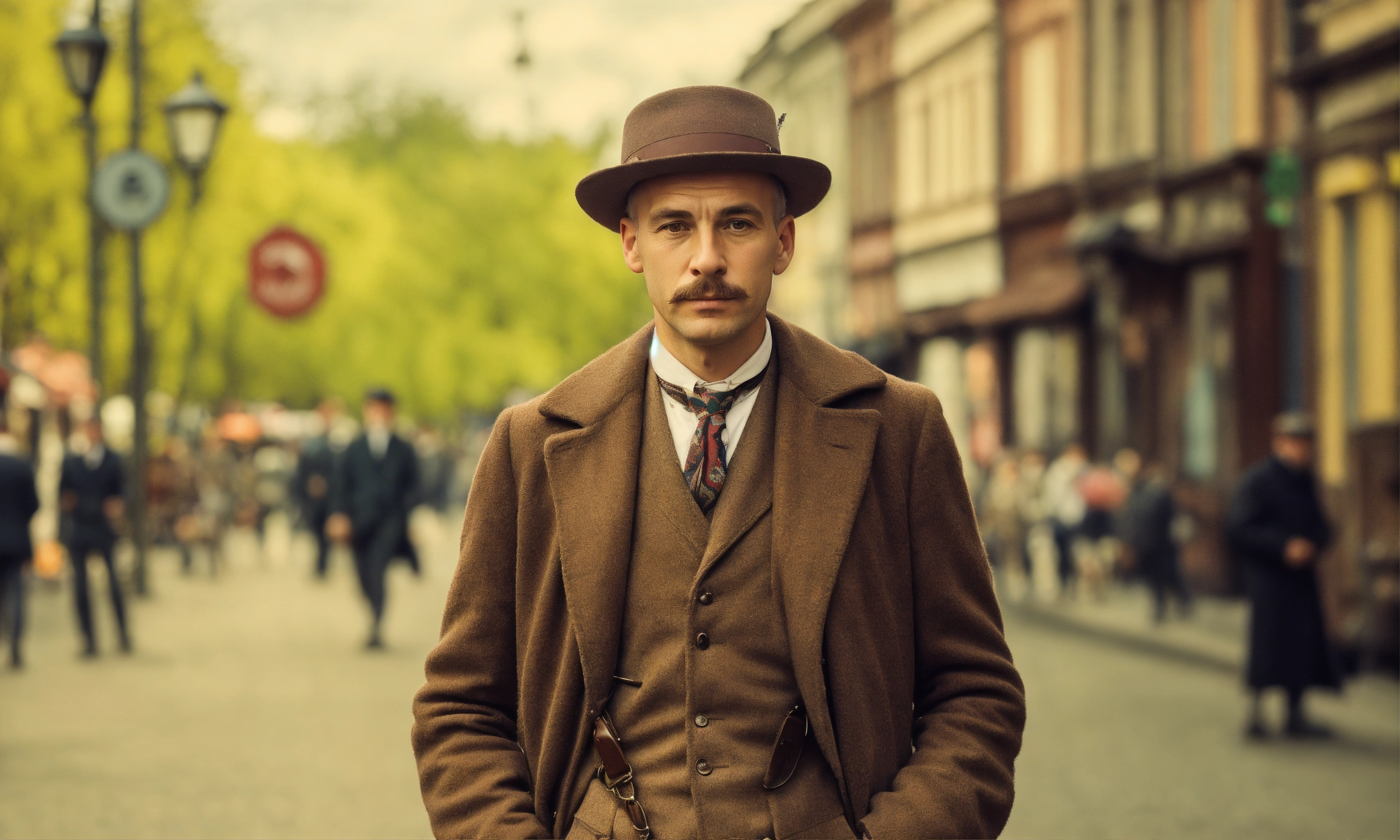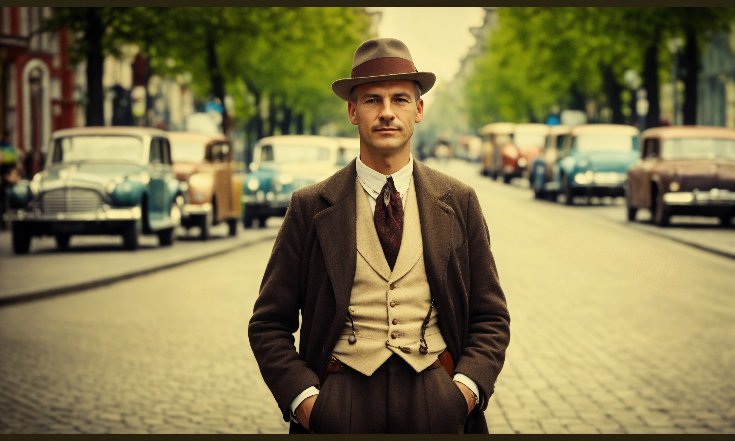 Cute poland man in full haight 1920-1930 on streen in warshaw. retro style photo full height. without people. focus camera on face man. season summer, keep in mind that the street must be without people