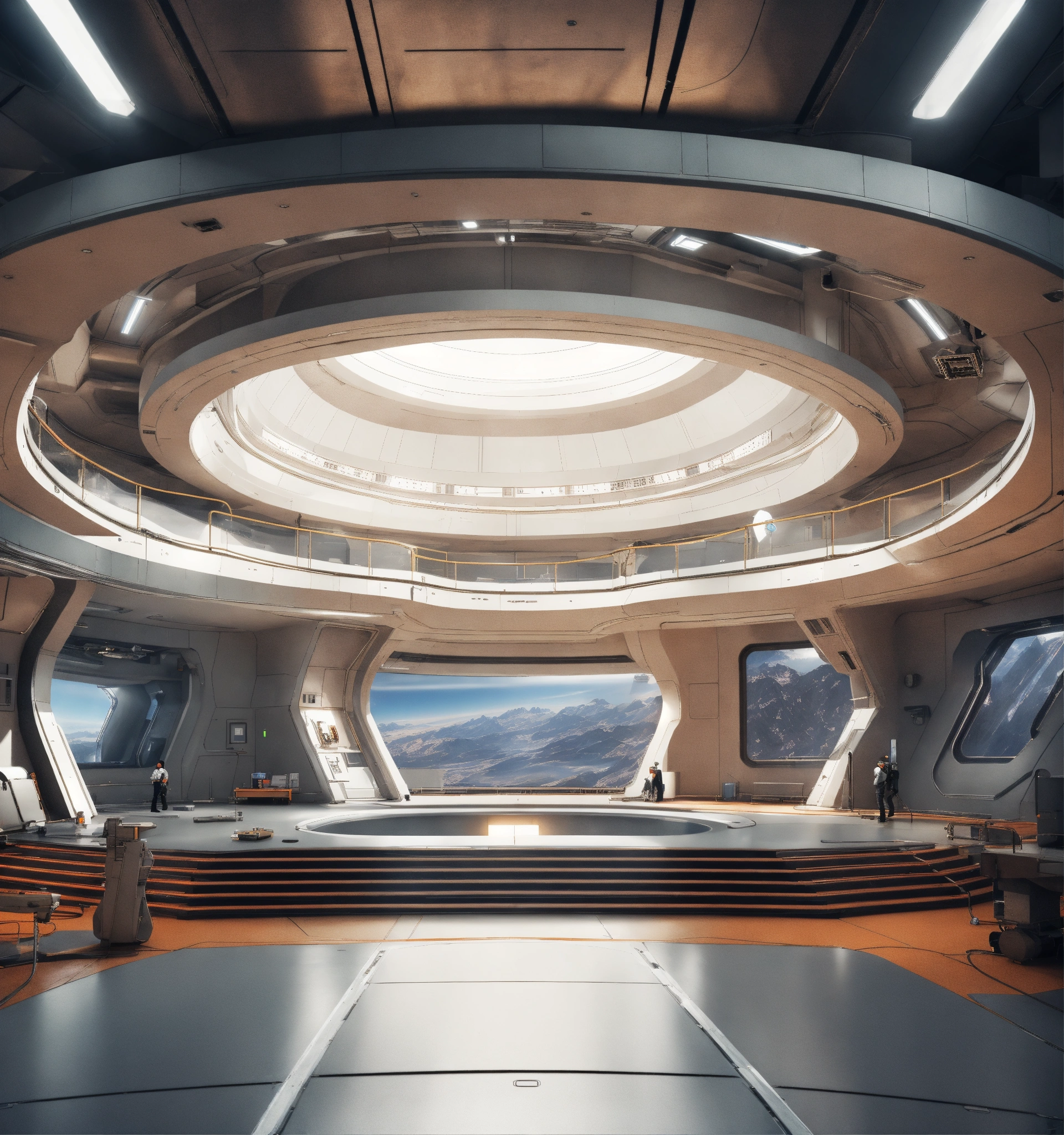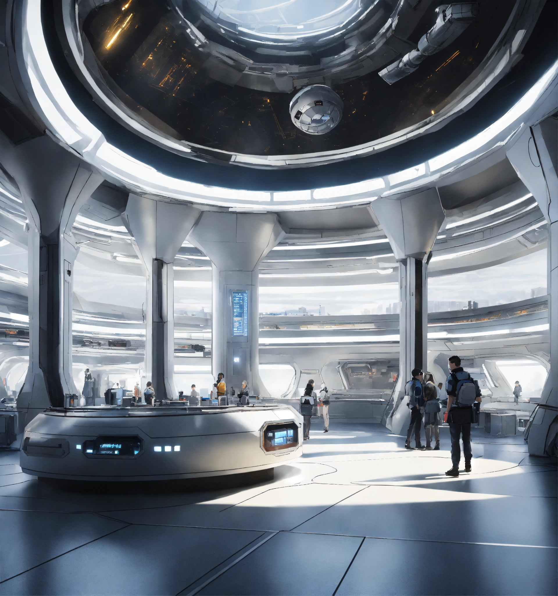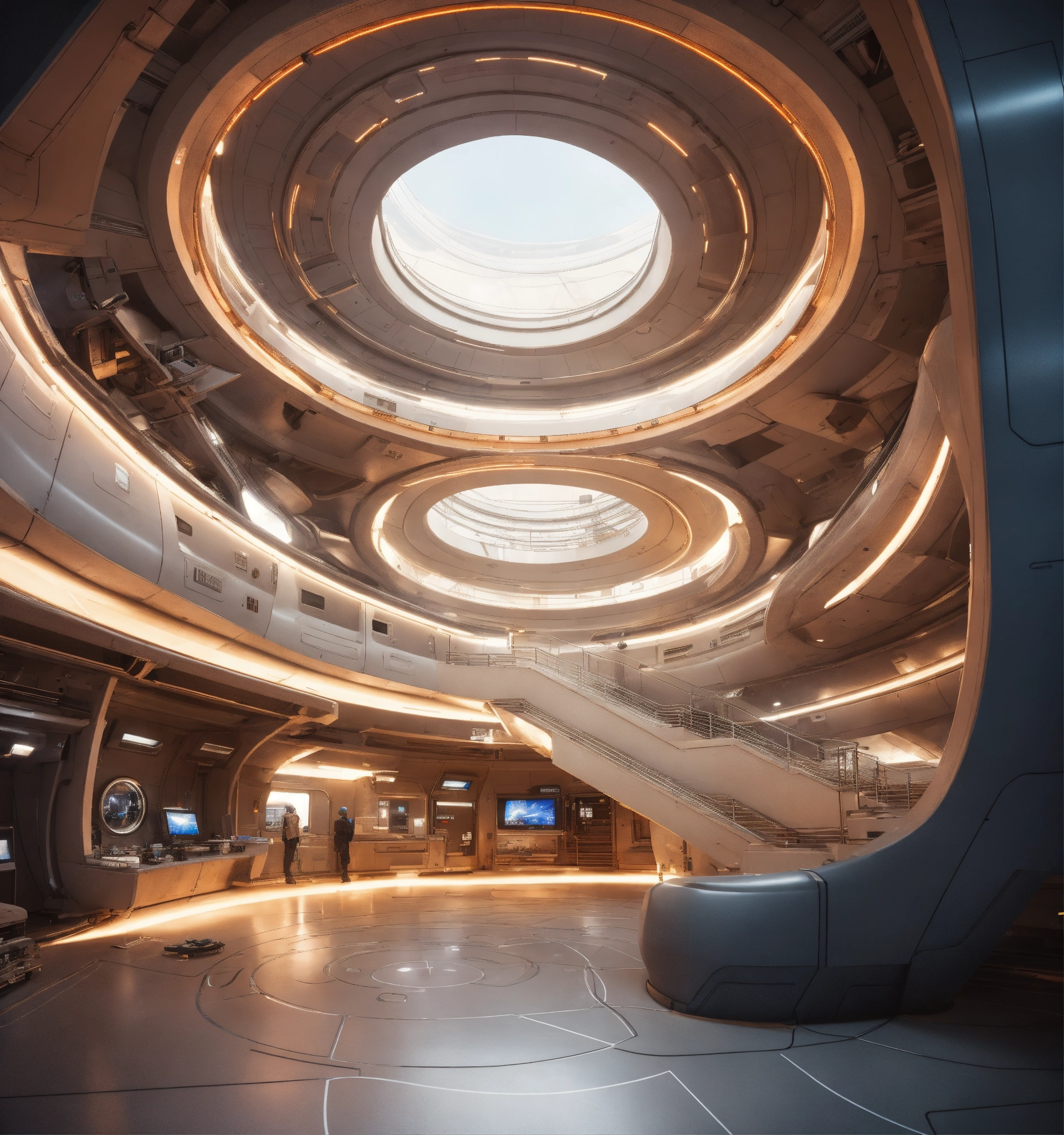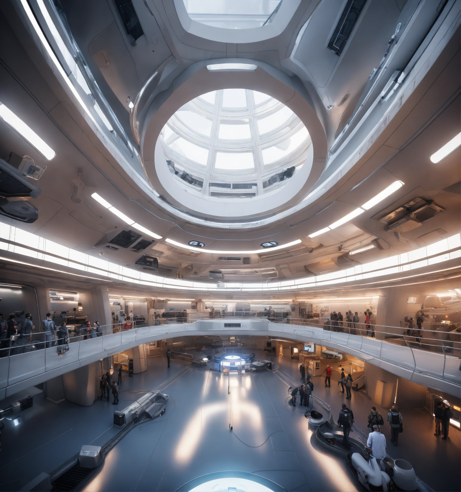 A realistic highly detailed photo from the floor of a very crowded futuristic infinitely high huge cylindrical hall, futuristic style, with white metal walls, with a circular-shaped hole in the center, with high crowded balconies and walkways at great highs, non-visible ceiling, no windows, without outside views, completely close, sci-fi, modern minimalism, in the interior of a space station, hyperrealistic, hyperdetailed