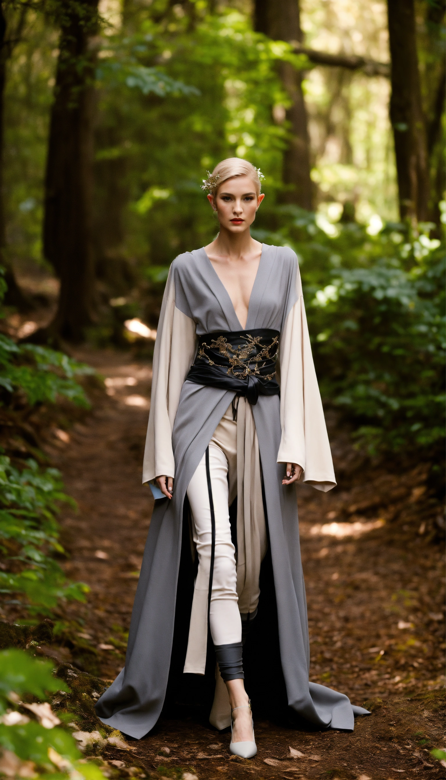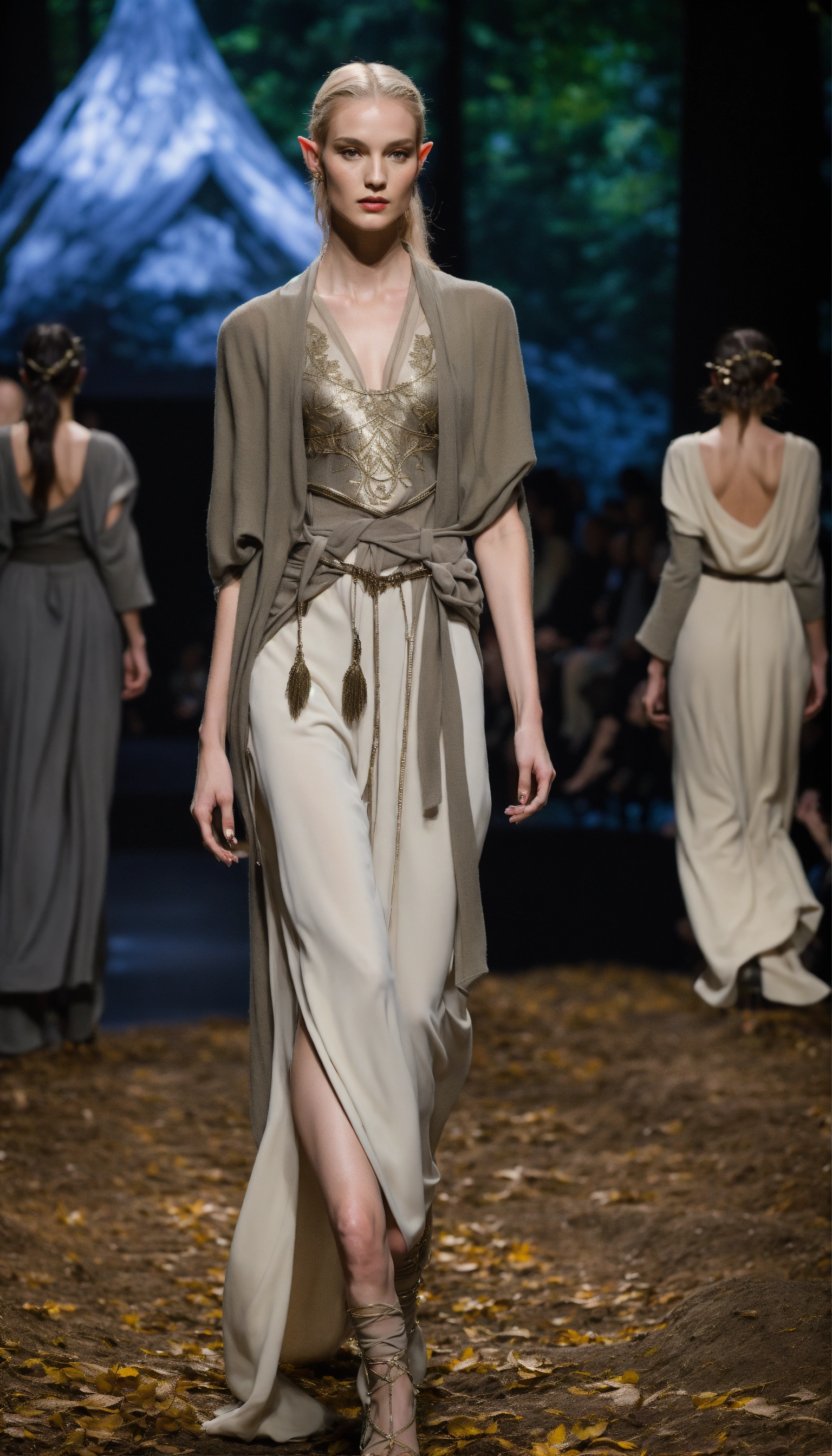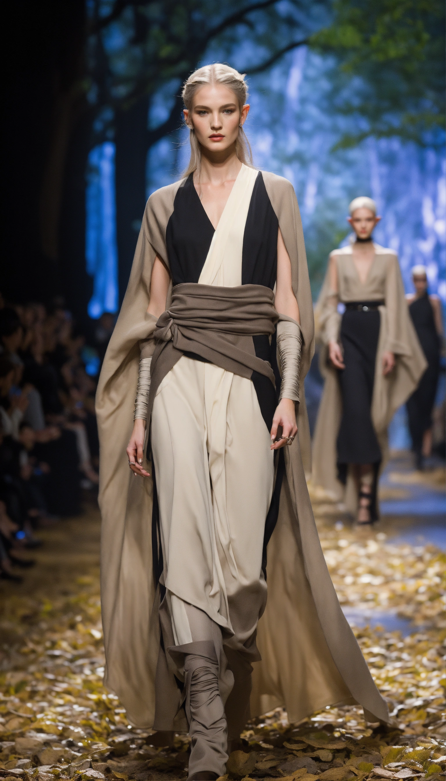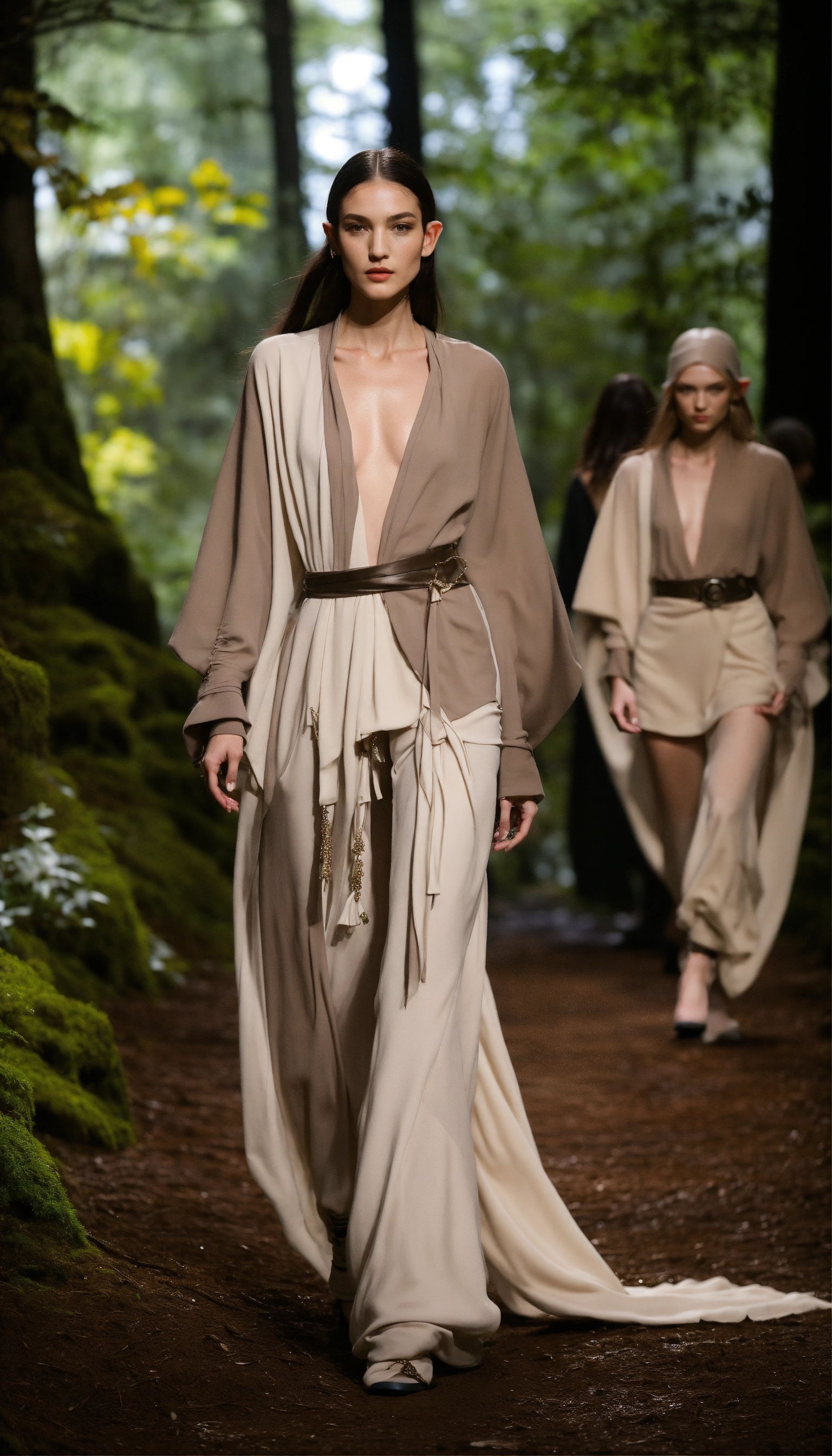 Lothlorien androgynous elves walking runway during elvin fashion week wearing dolman sleeve elvish donna karan fashion in black, white, grey, beige, stone, metallics at a woodland enchanted runway