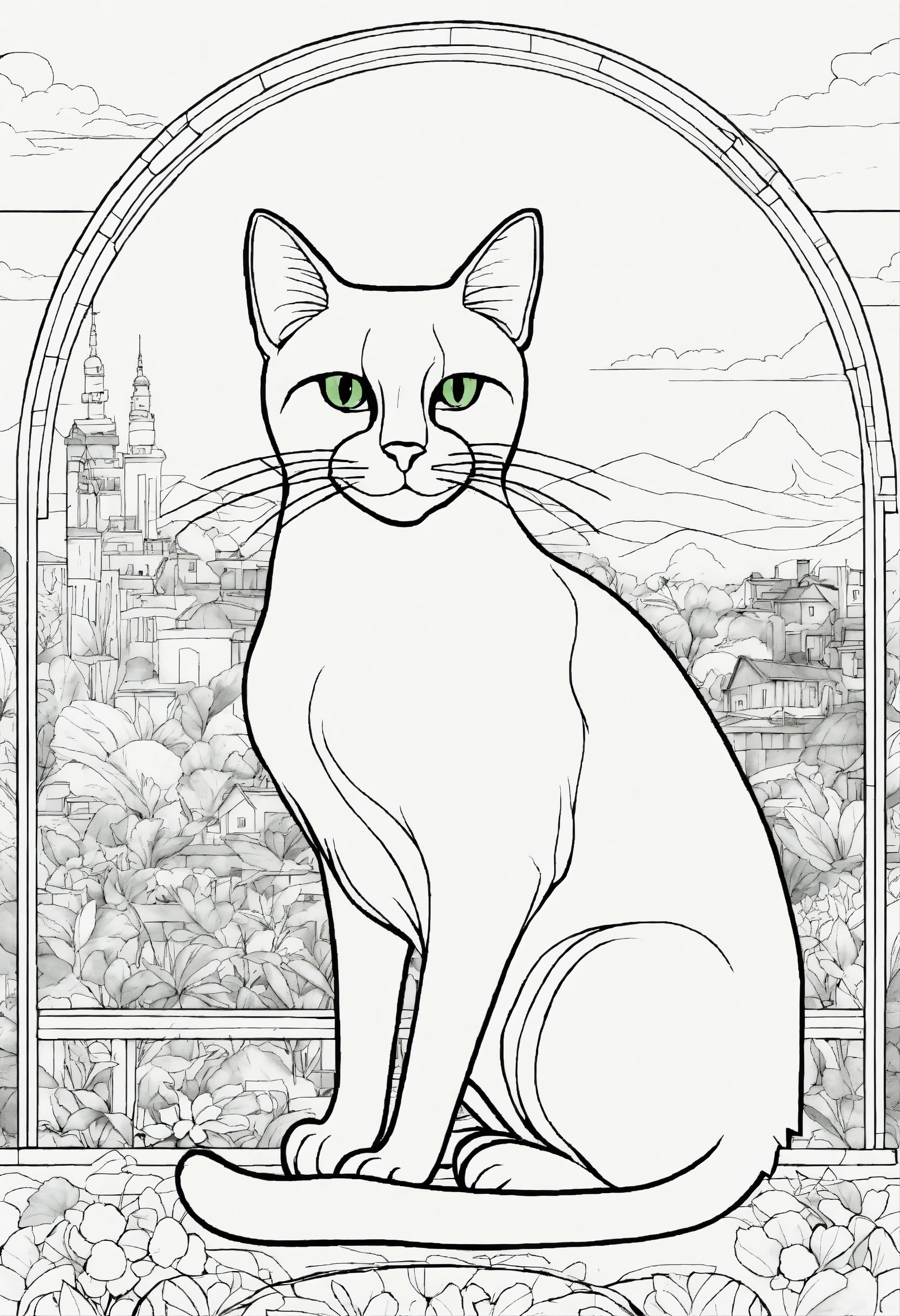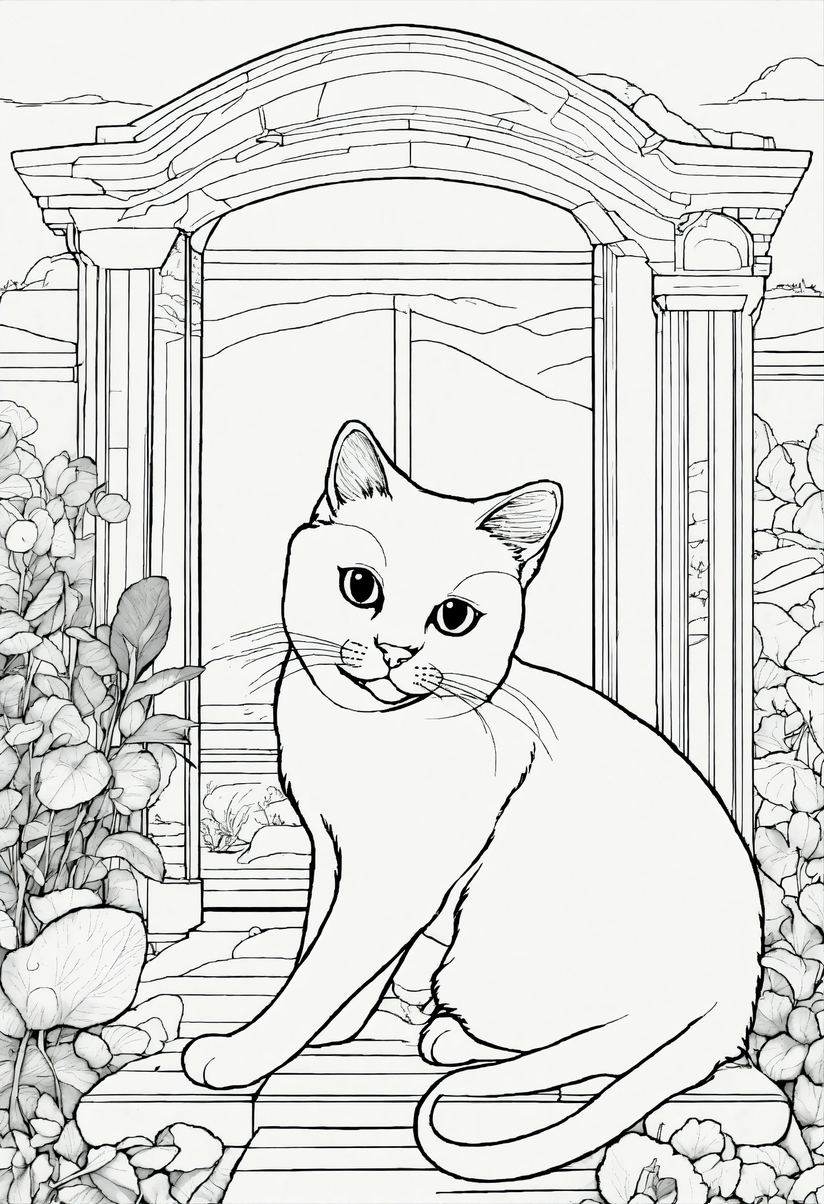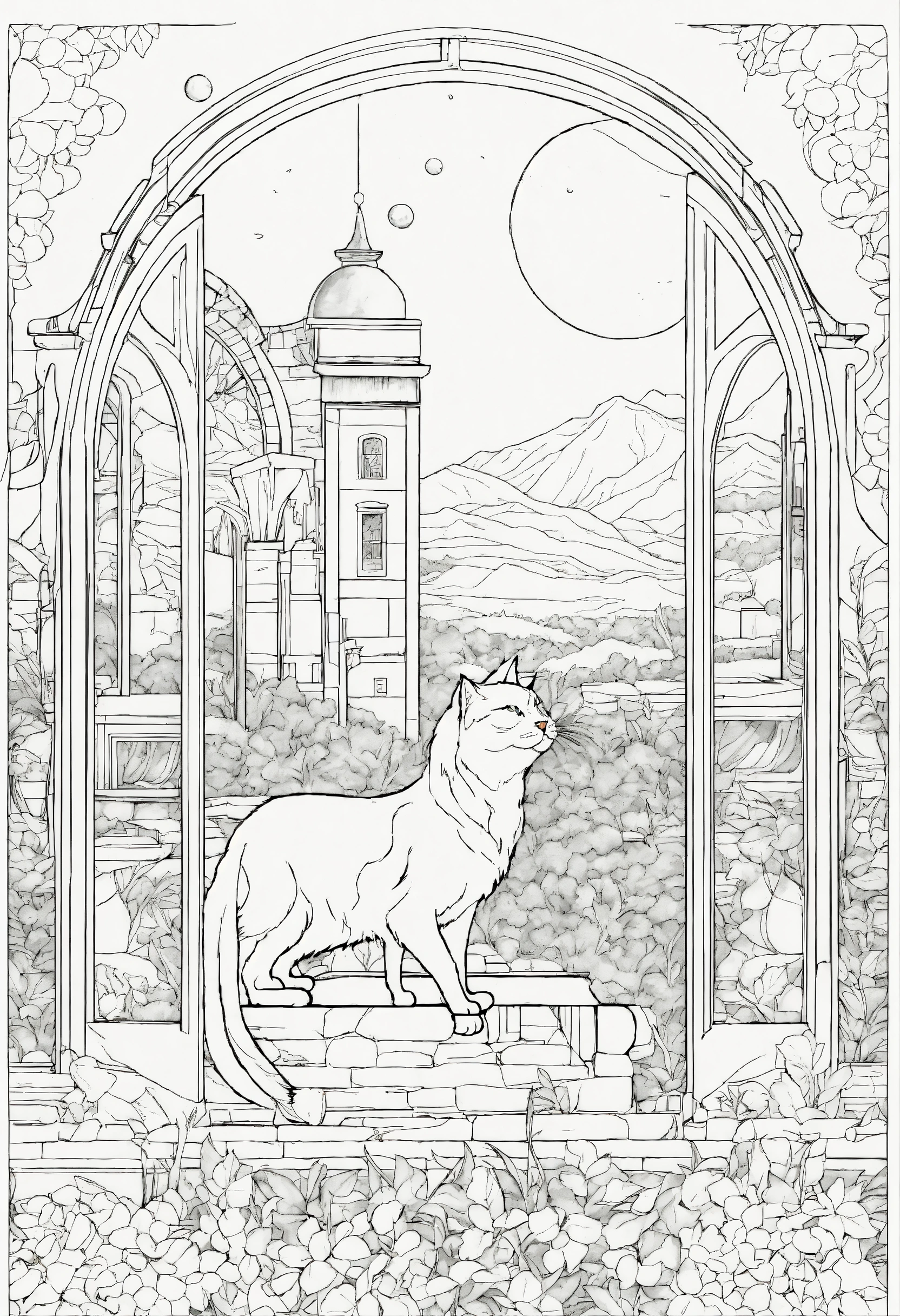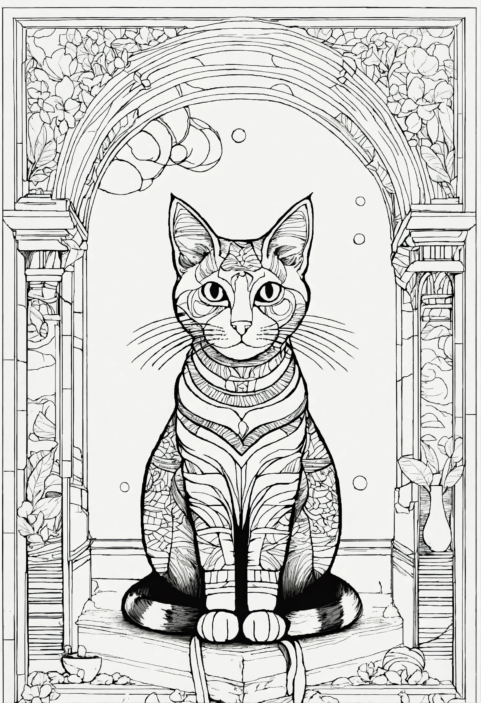 Coloring pages, all solid ink lines, minimalistic, whimsical world, ink outlines, arch design, realistic cat