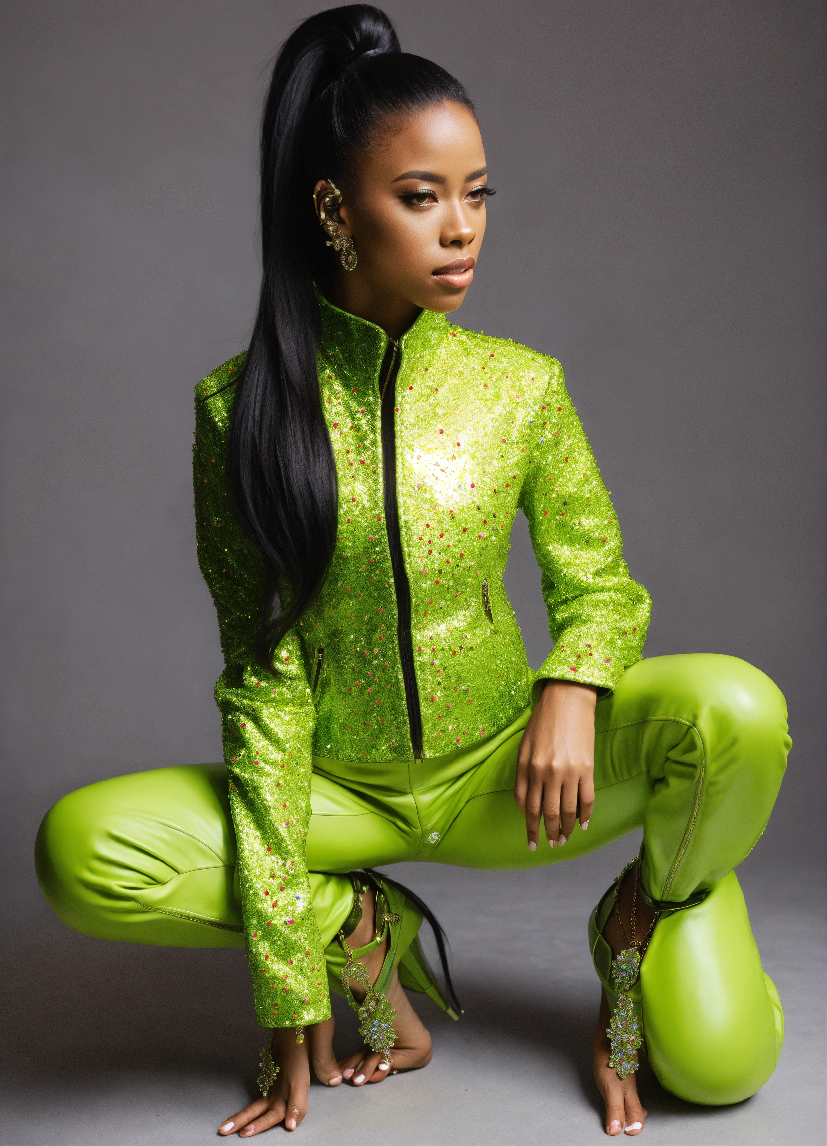Aaliyah glamorous sparkly lime leather full outfit with ponytail