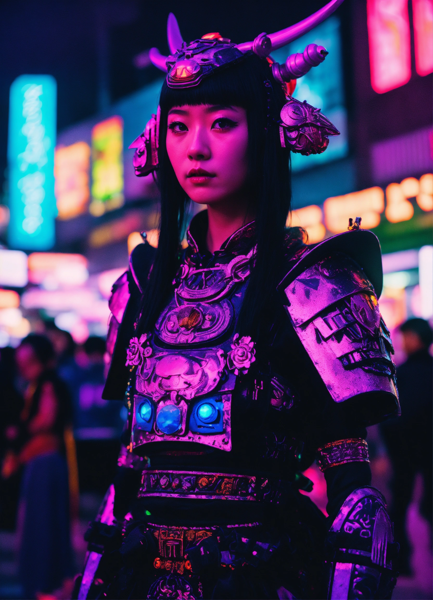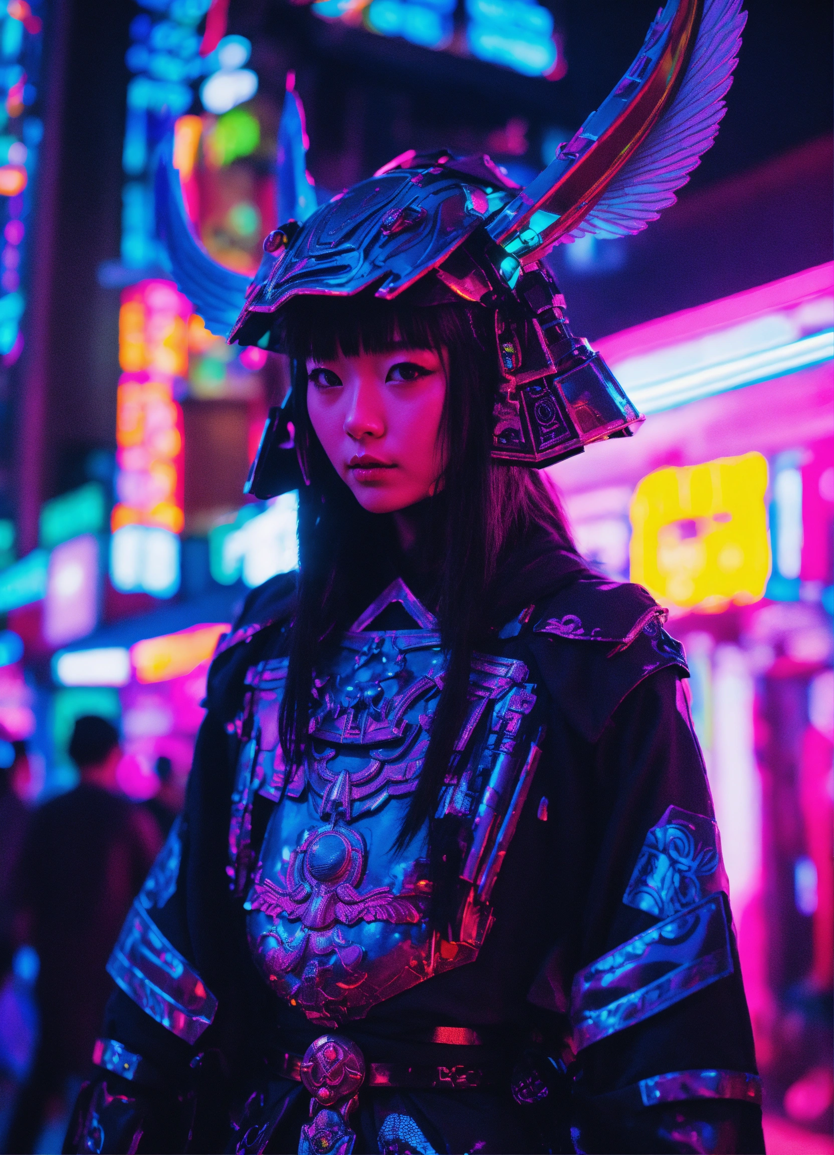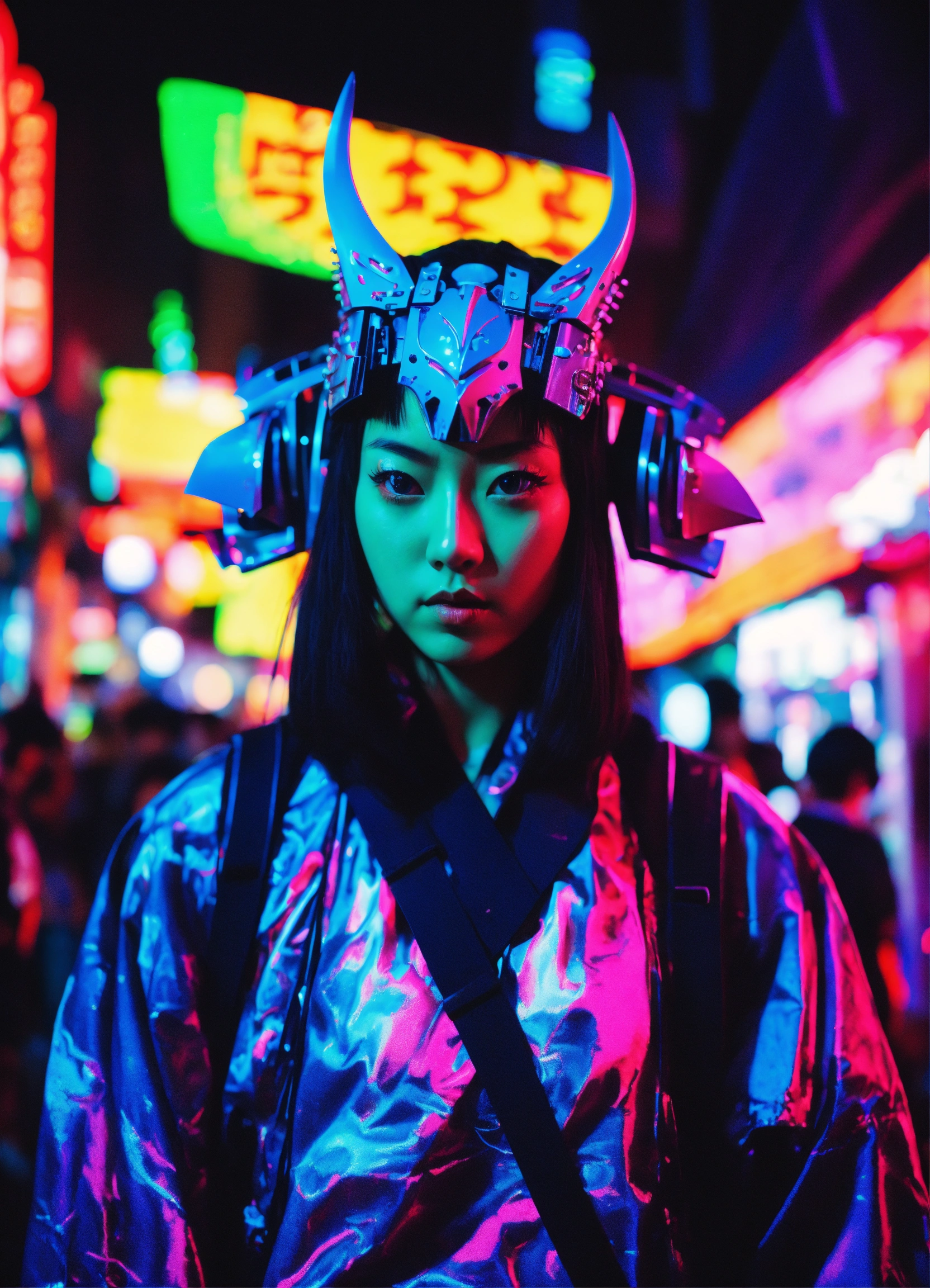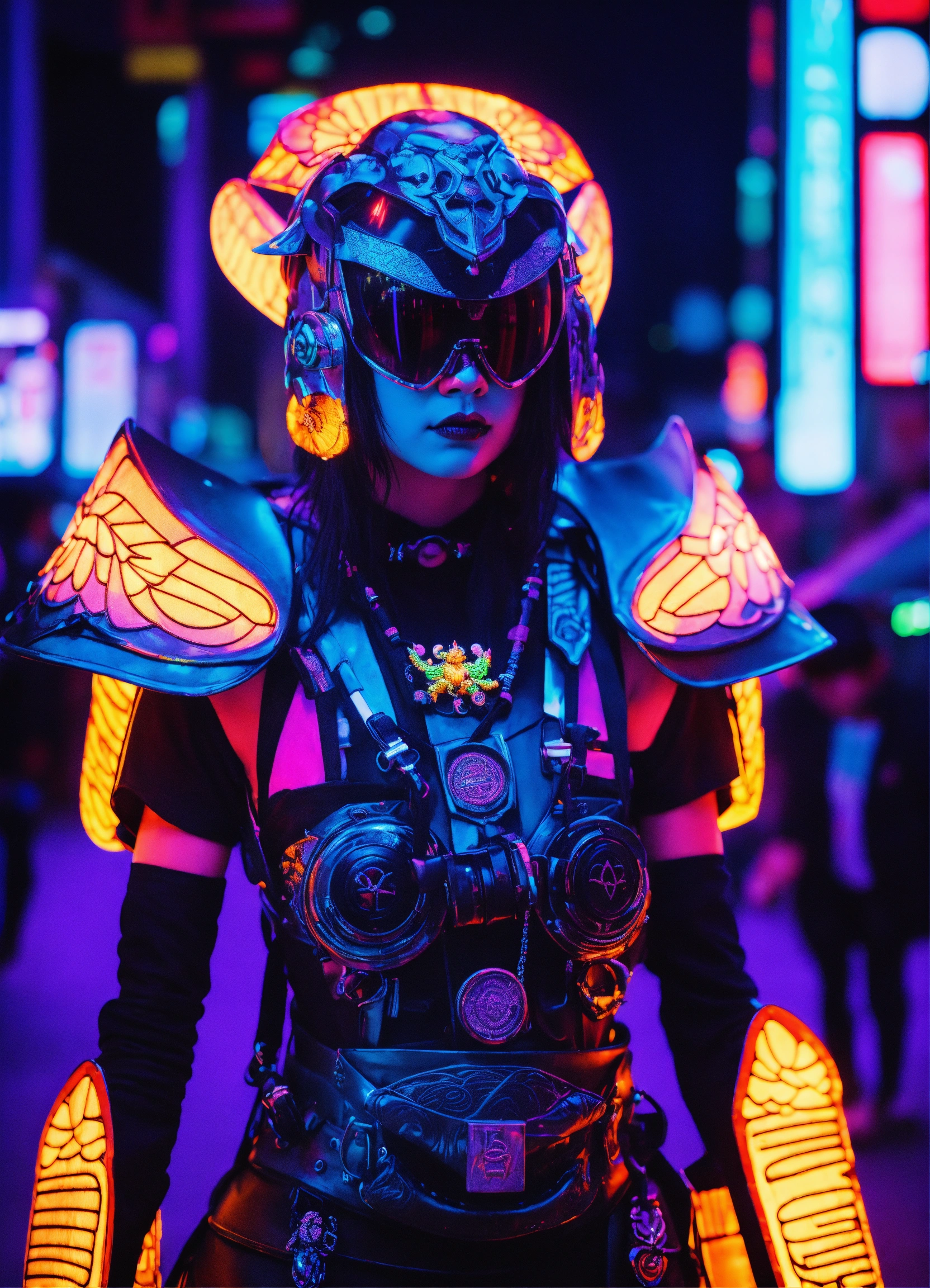 Photorealistic 3d portrait samurai alien mech angels in goth folk kawaii festival raver outfit in dmt black light neon fashion street tokyo city night 35mm film, akira anime.