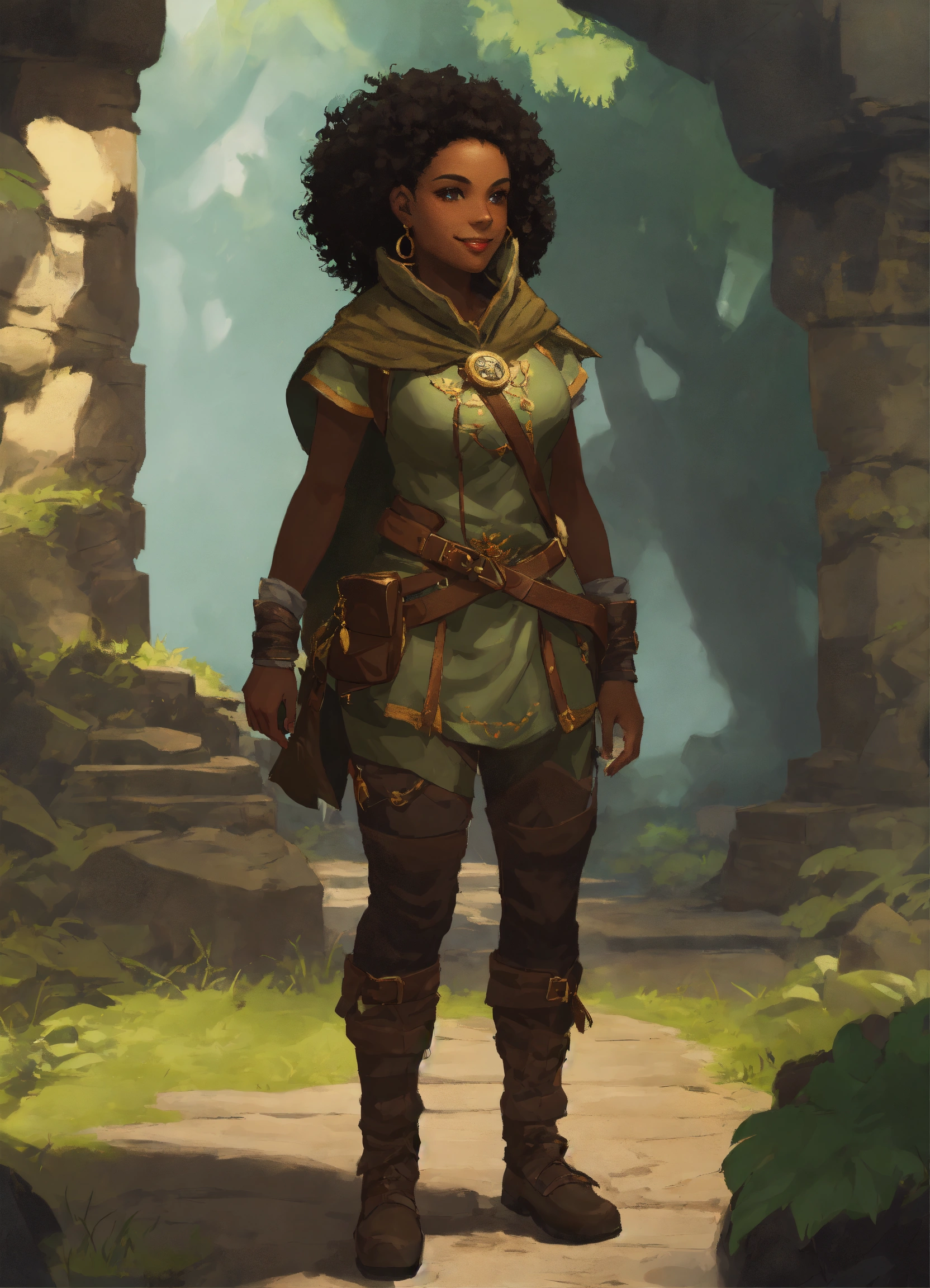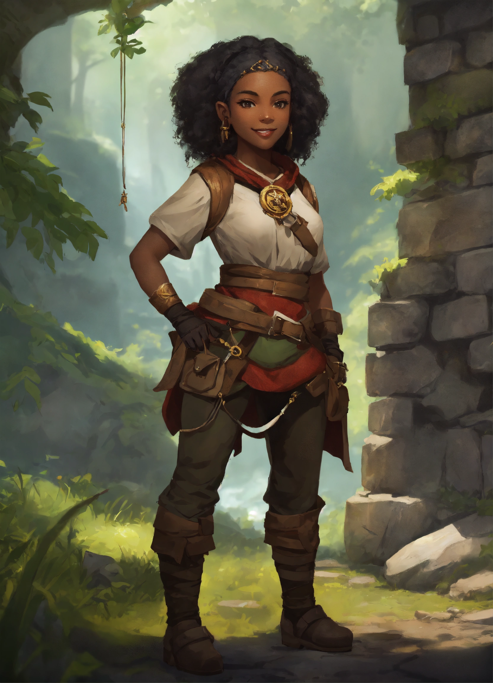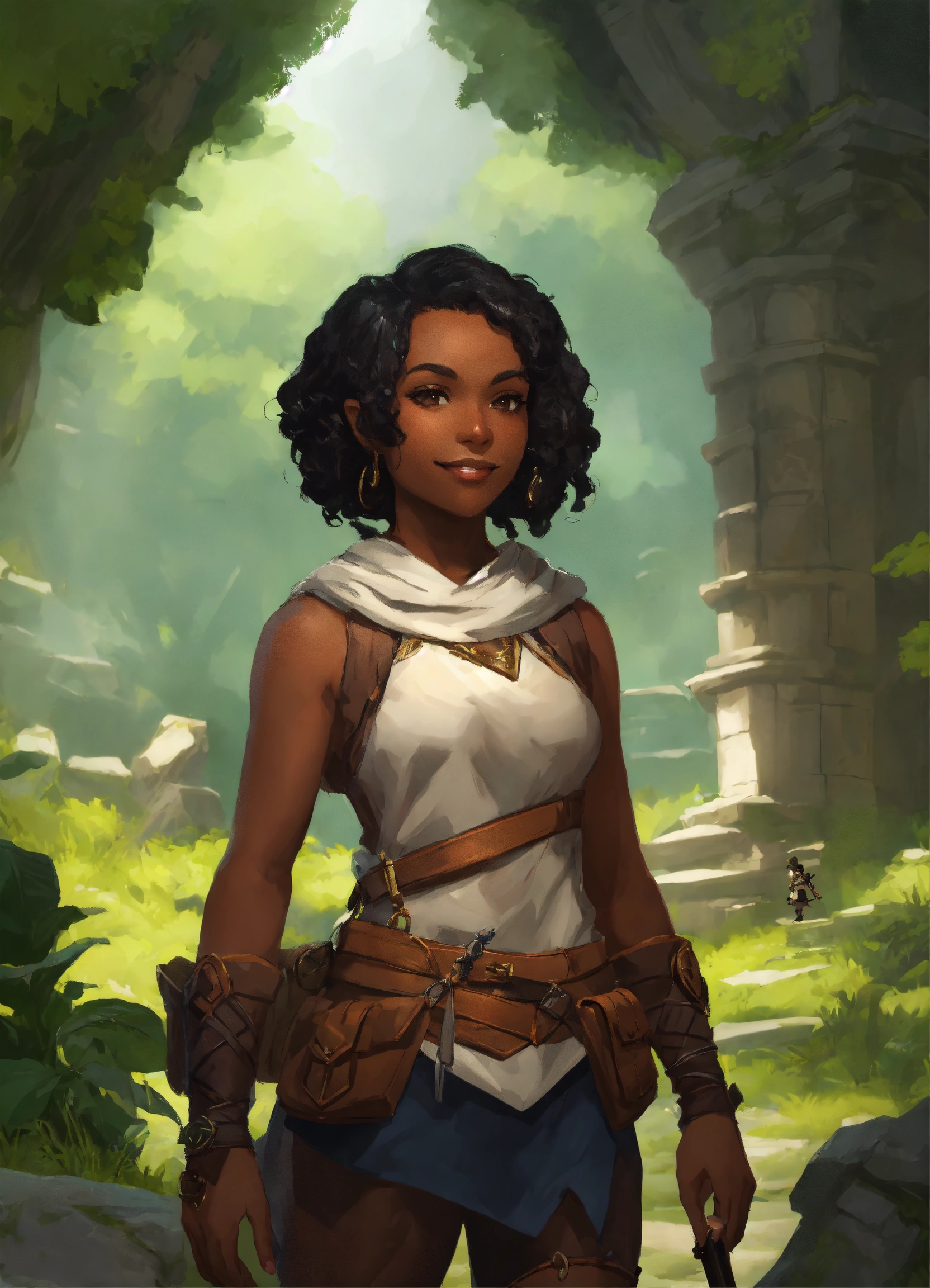 Medium-length shot, female halfling, black skin, adventurer explorer, occultist, smirk, character concept art, artstation, artgem, exploring ancient ruins forest background, dark magic, dnd character