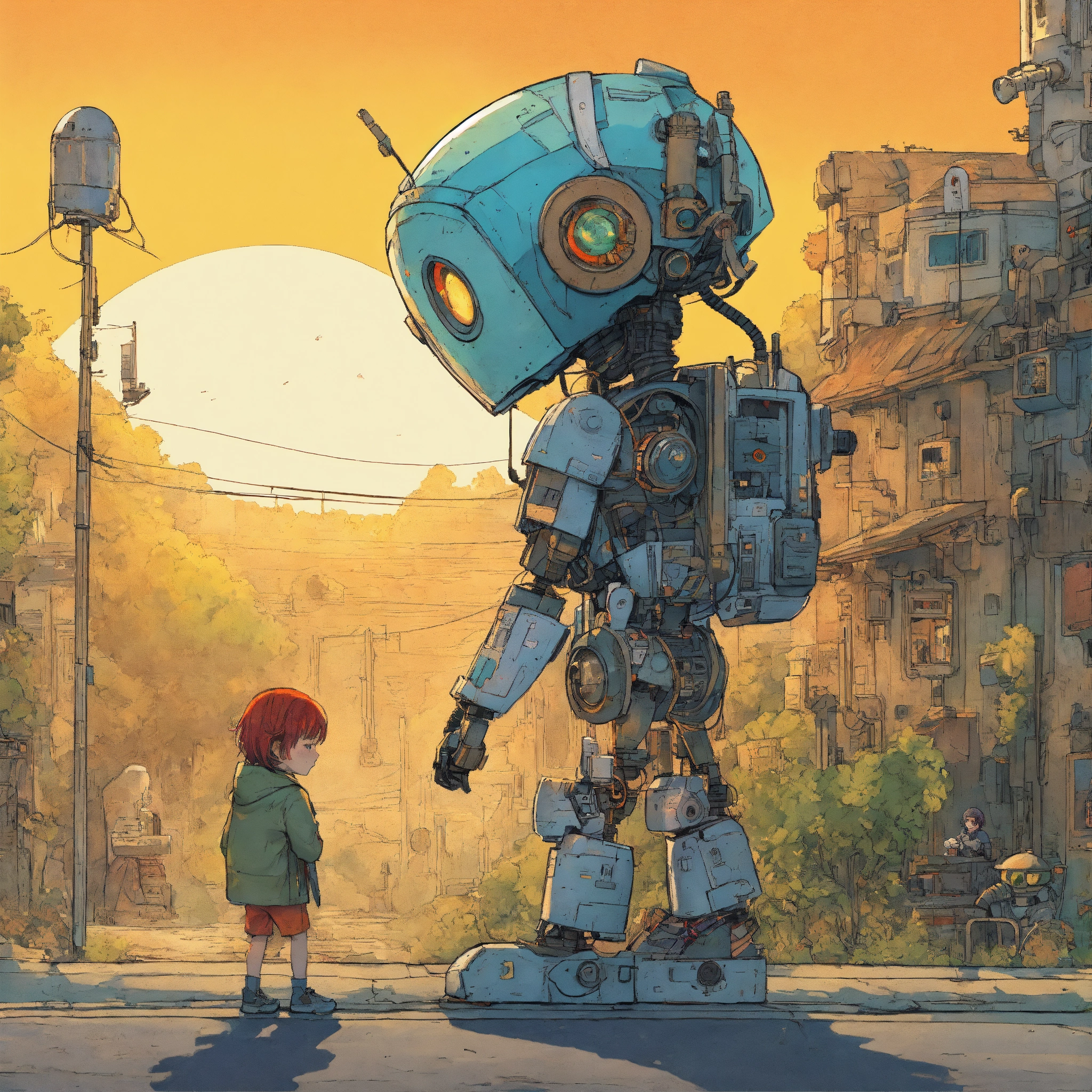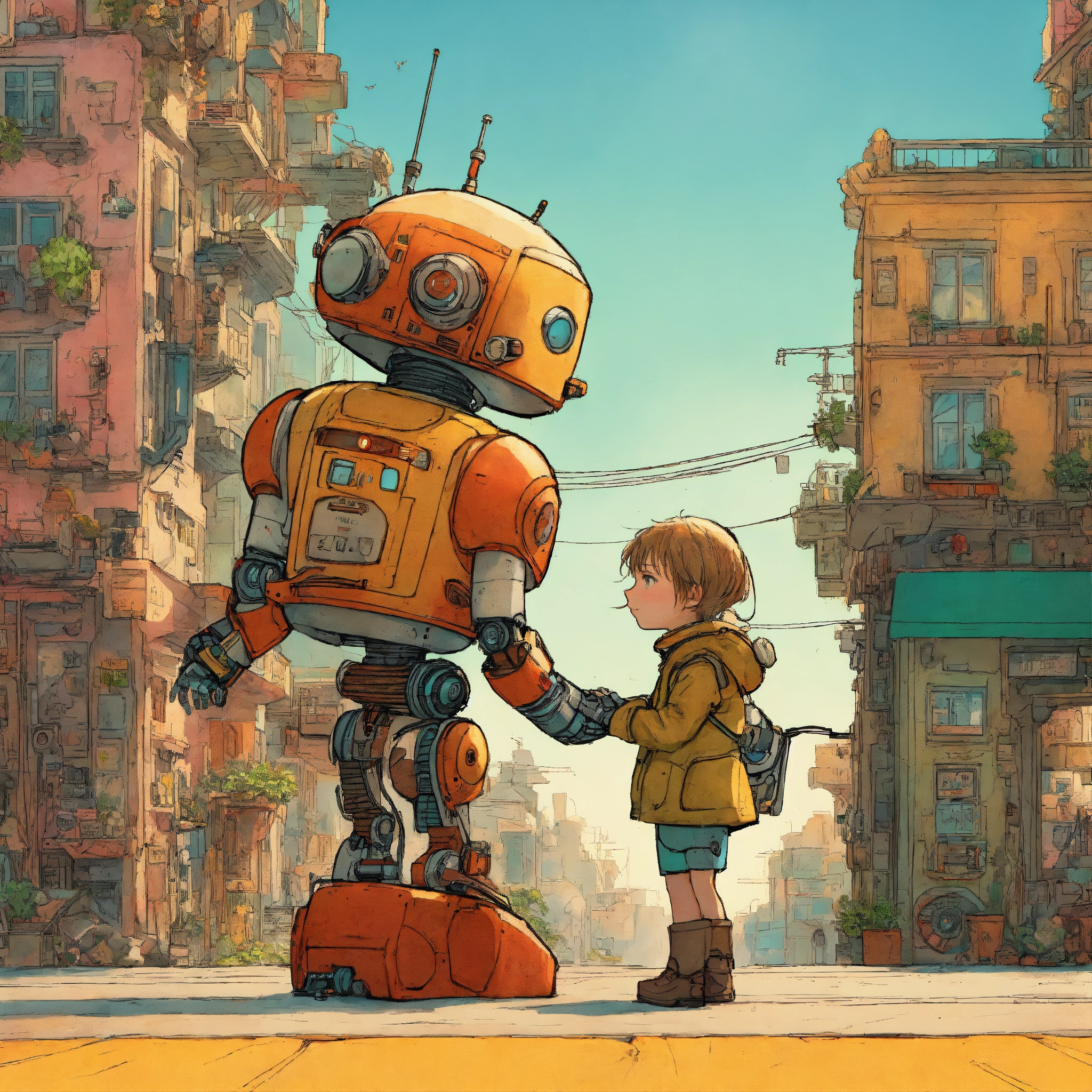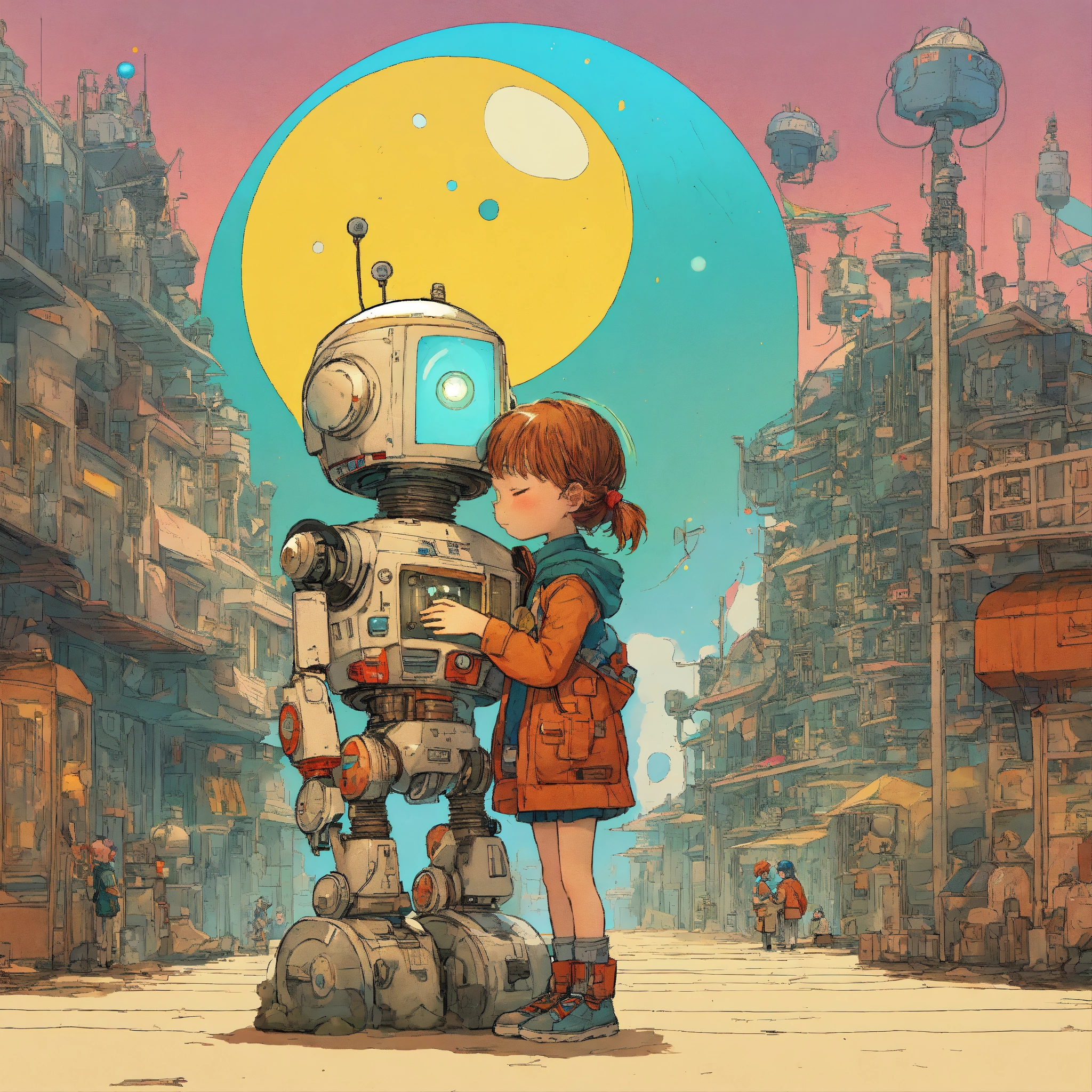 Futurepunk child and robot hugging each other, sunny day, colorful lighting, side view of the characters, sci-fi atmosphere, ultra-high definition (uhd), very detailed, by mattias adolfsson