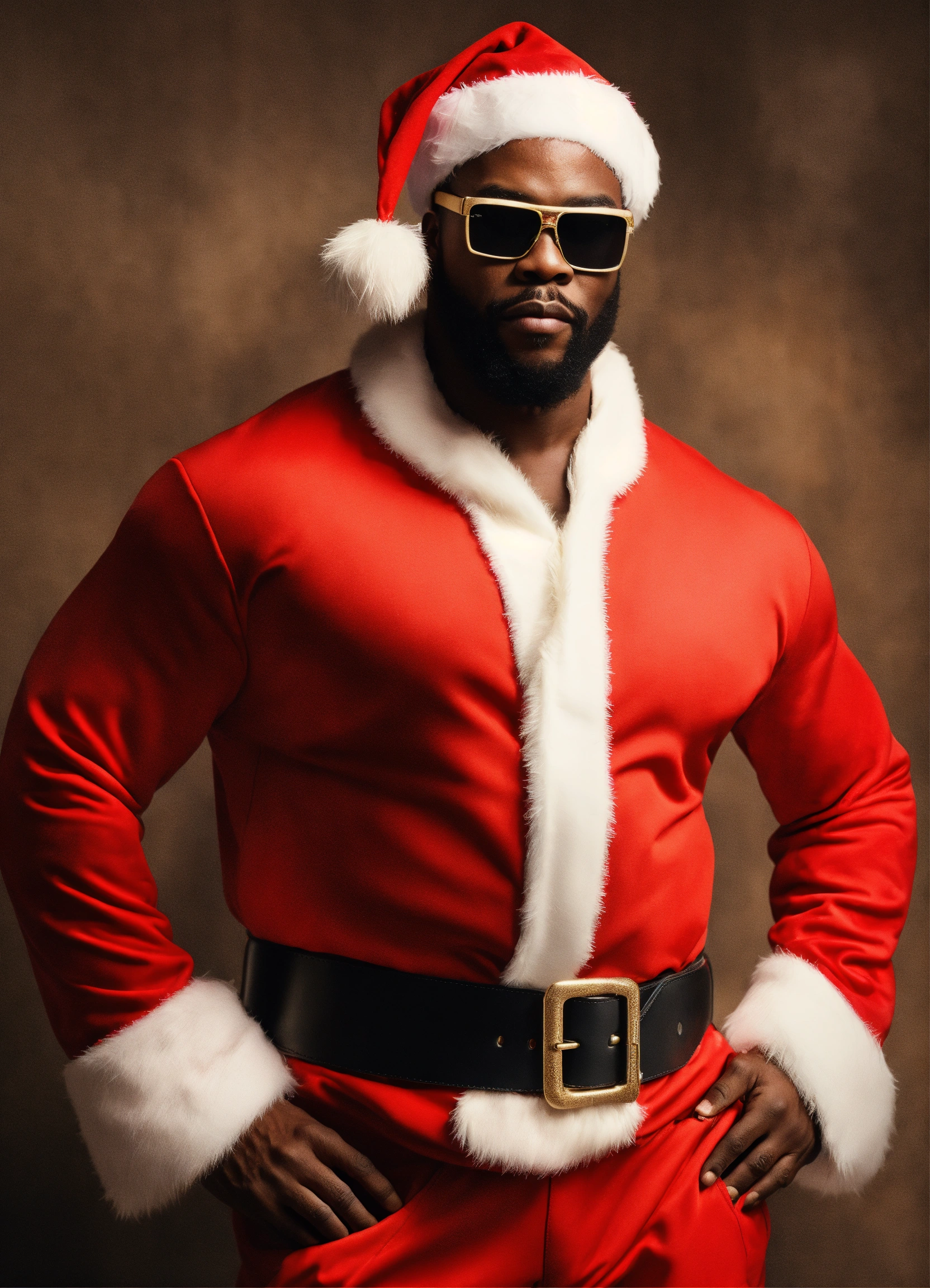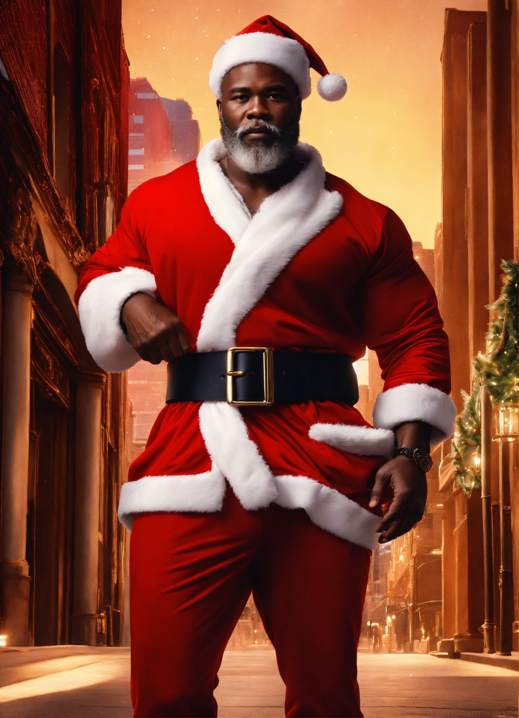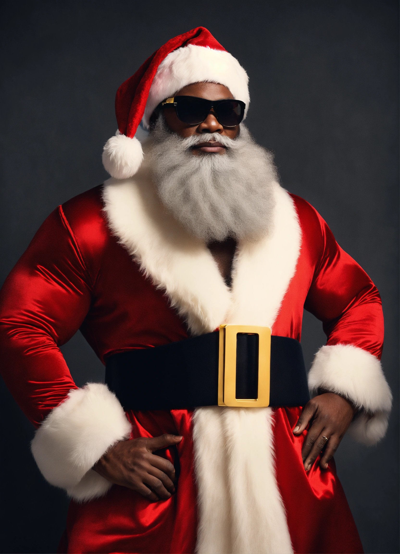 A extremely handsome modern african american santa claus, wearing a belt and athletic wear, inspired by balenciaga. --v 5.0