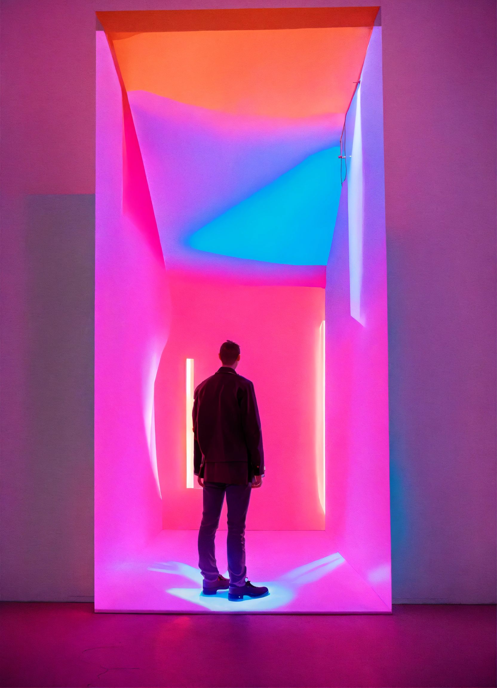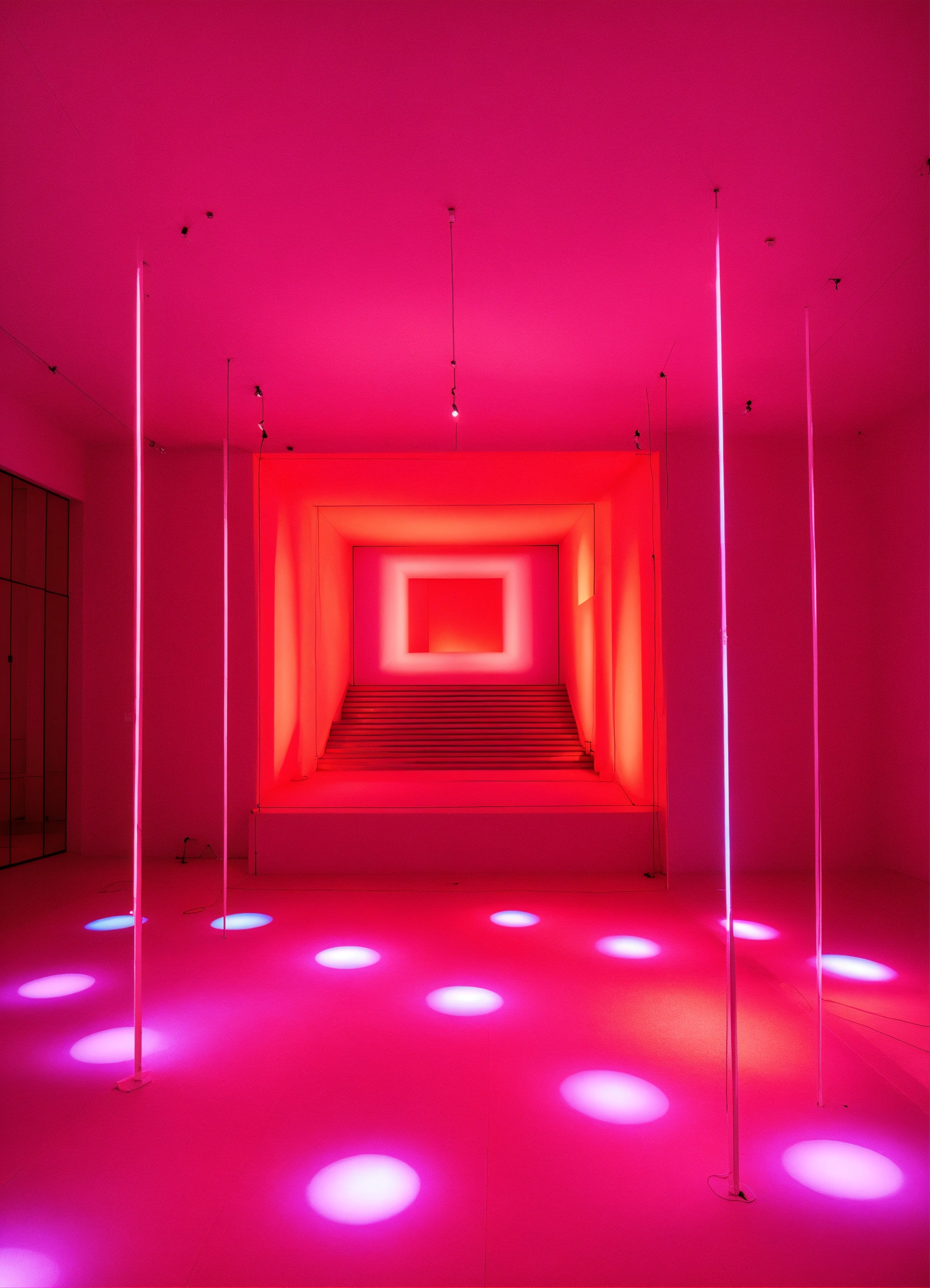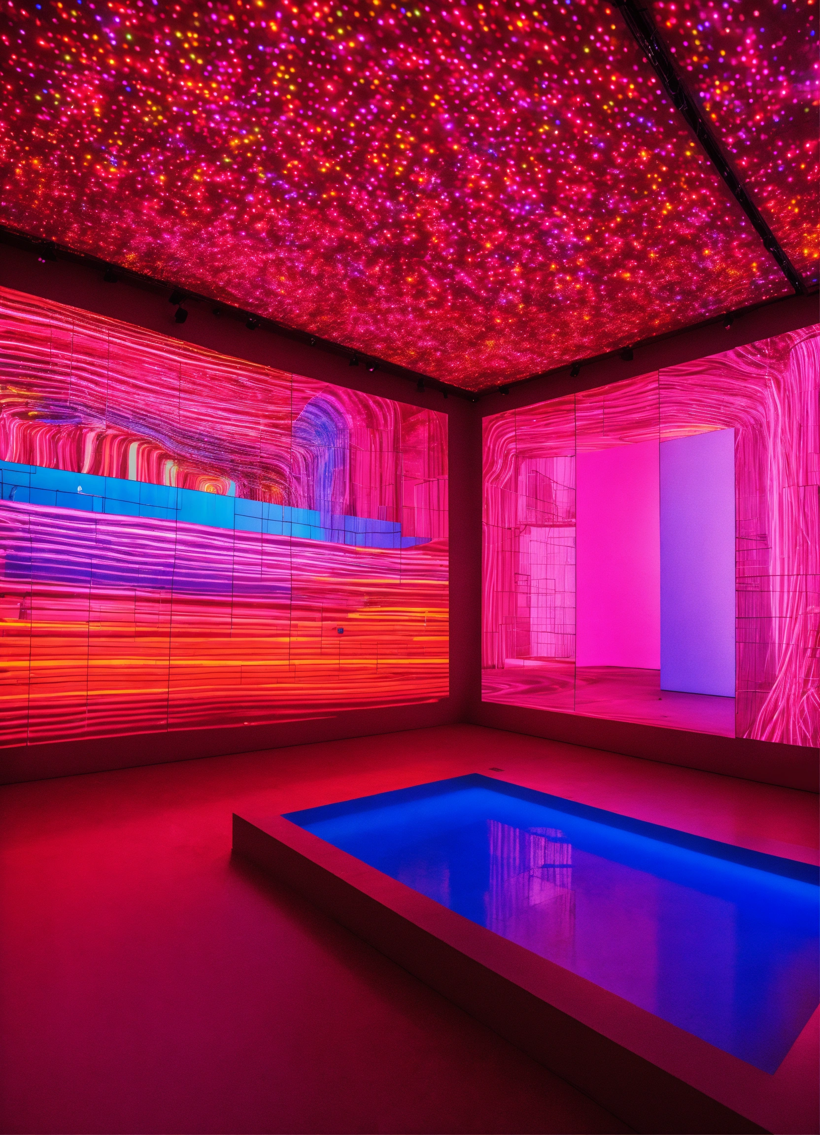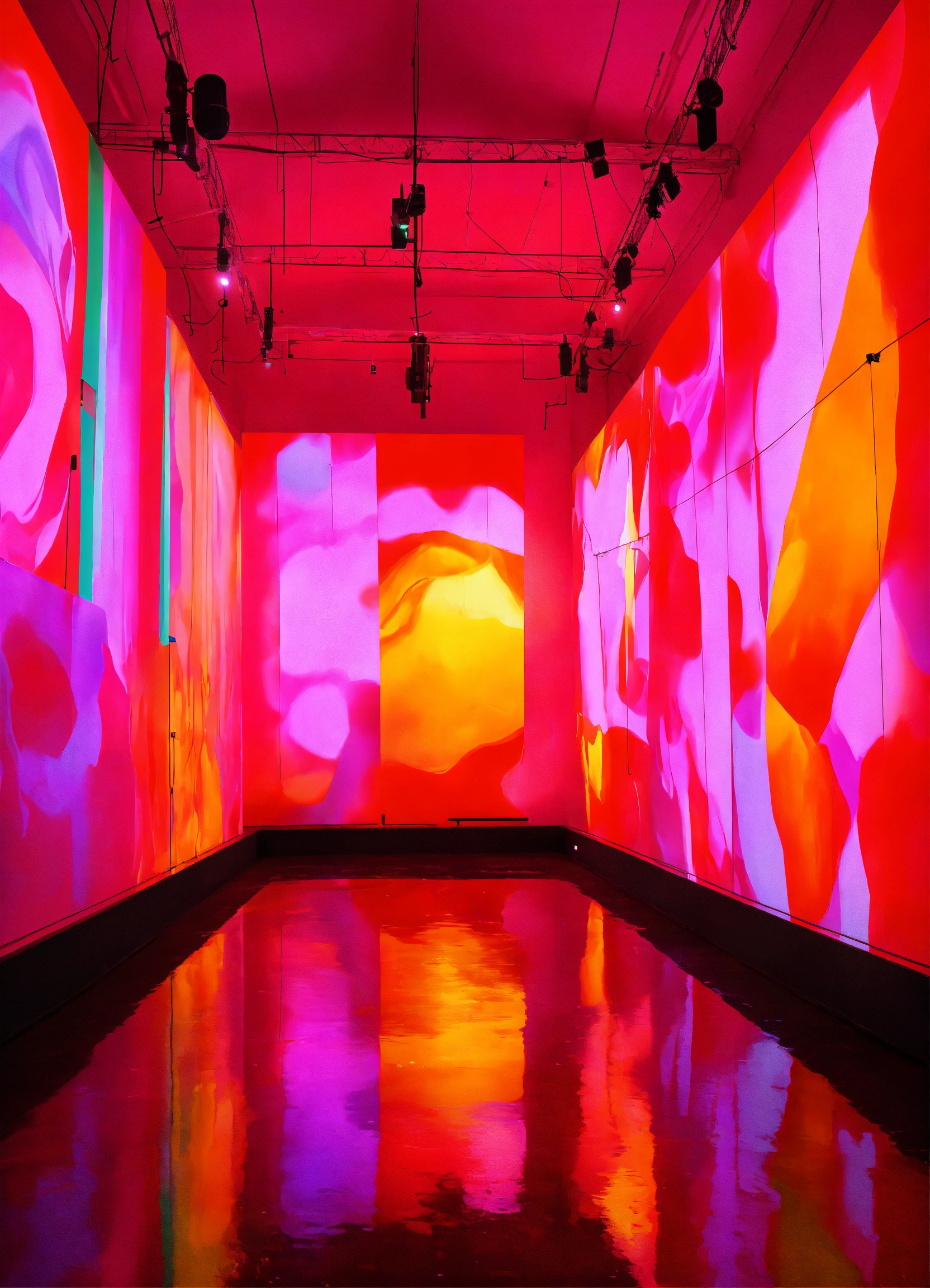 A contemporary art exhibition with projections and candy color lights