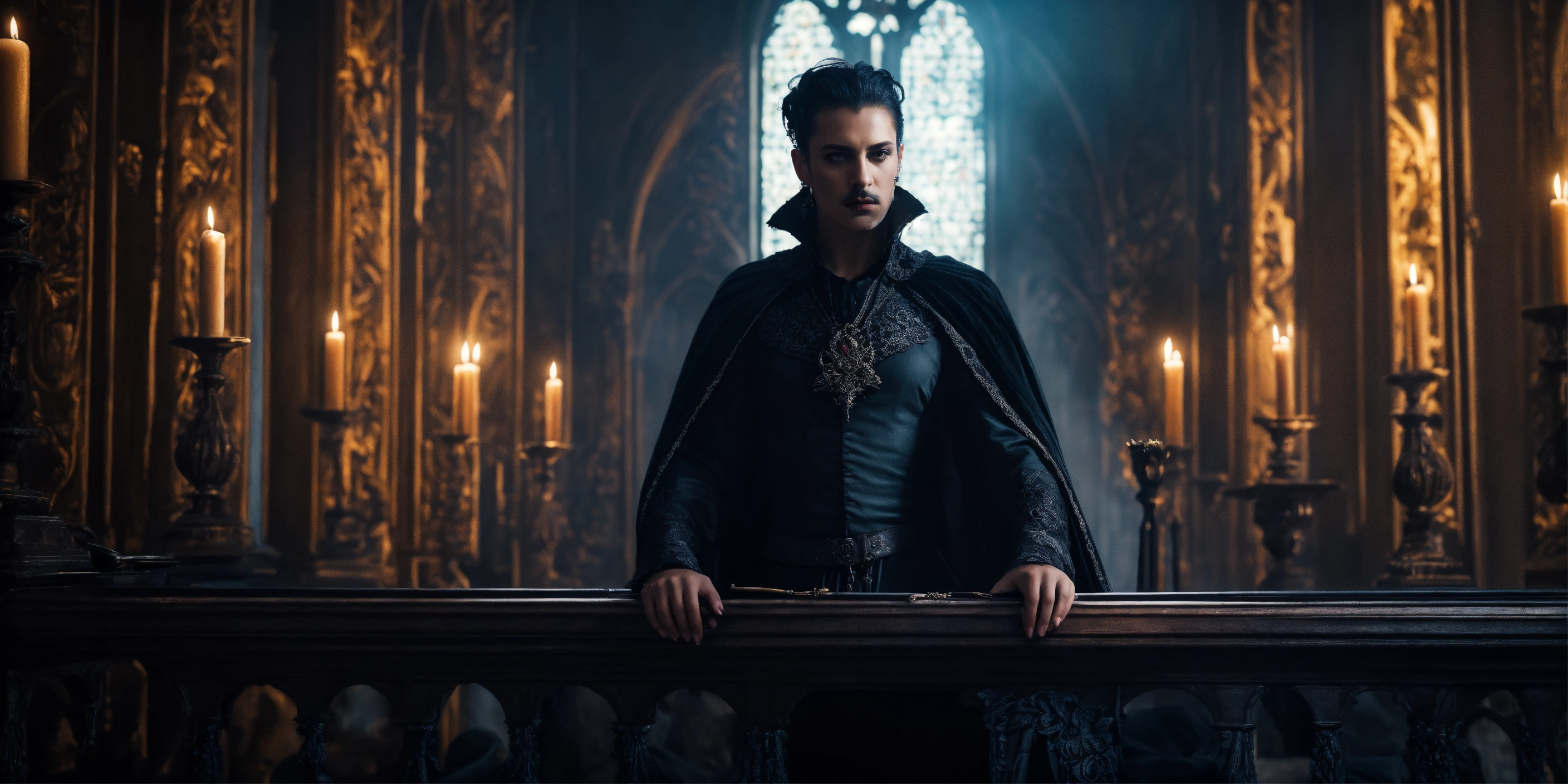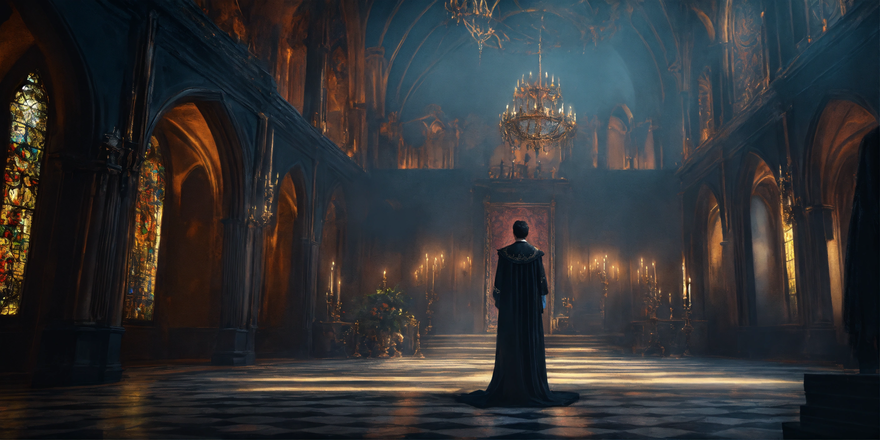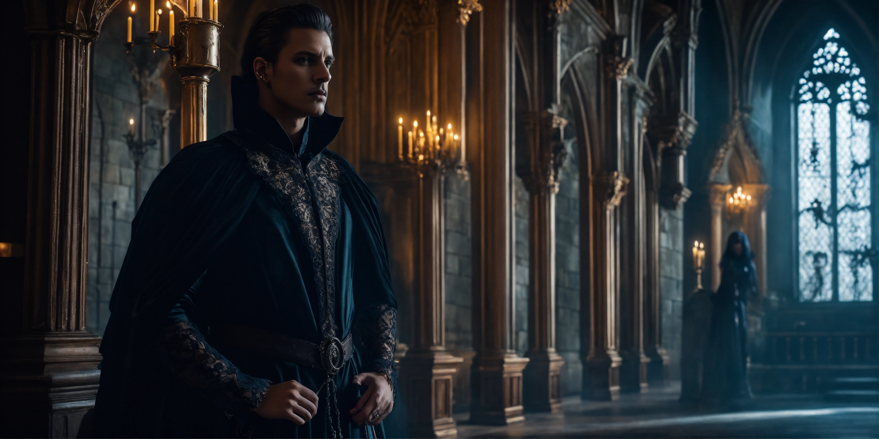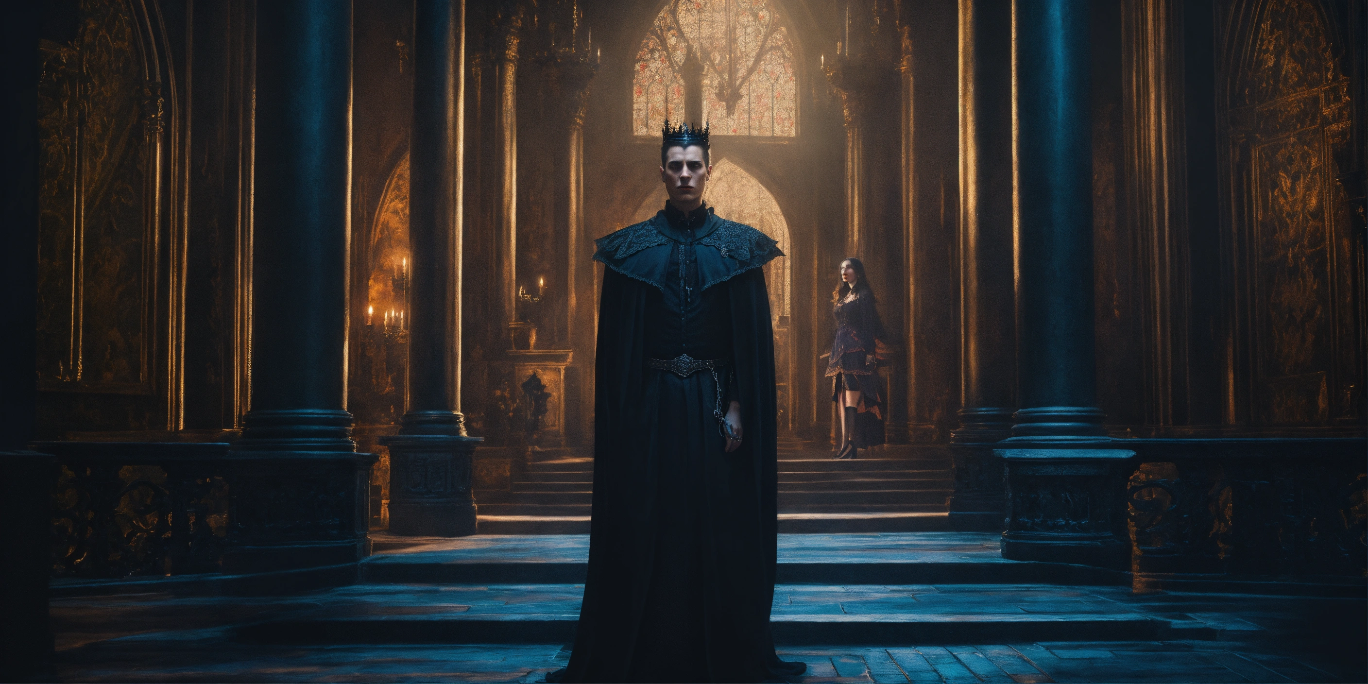 Queen of darkness in a gothic castle stands opposite a beautiful man, mystic, dark fantasy, realistic photo, high detail, digital painting, cinematic, stunning, hyper-realistic, sharp focus, high resolution 8k, insanely detailed