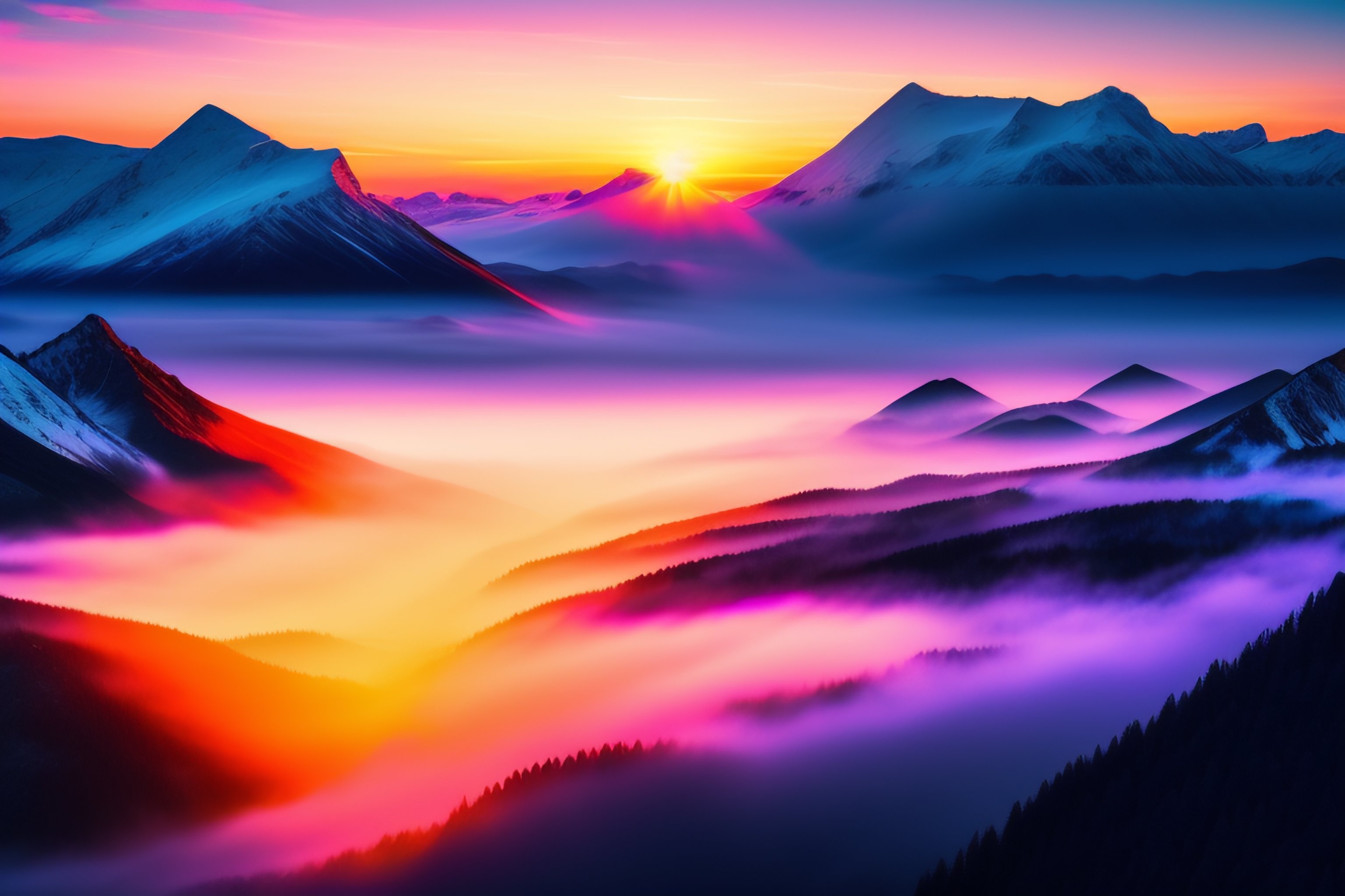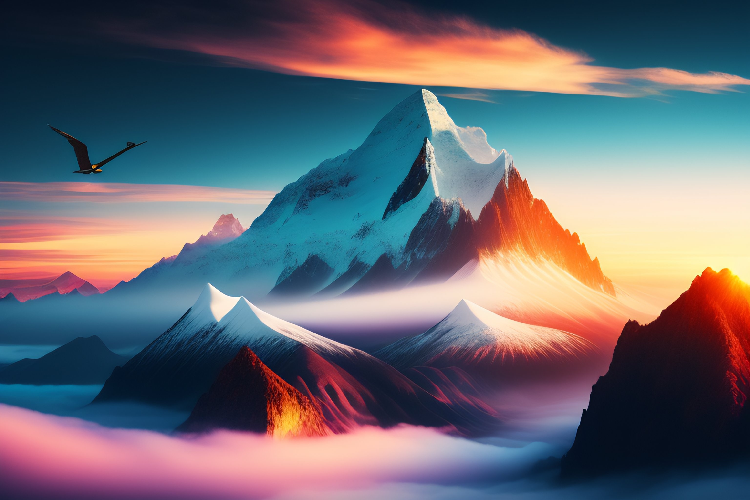 Aerial view of vast mountainscape with high mountains, eagle soaring above clouds, colorful sunset, snow, mist, volumetric light, clouds, sunset, epic, harmonious, peaceful, detailed, texture, high resolution, realistic --testp --ar 16:9