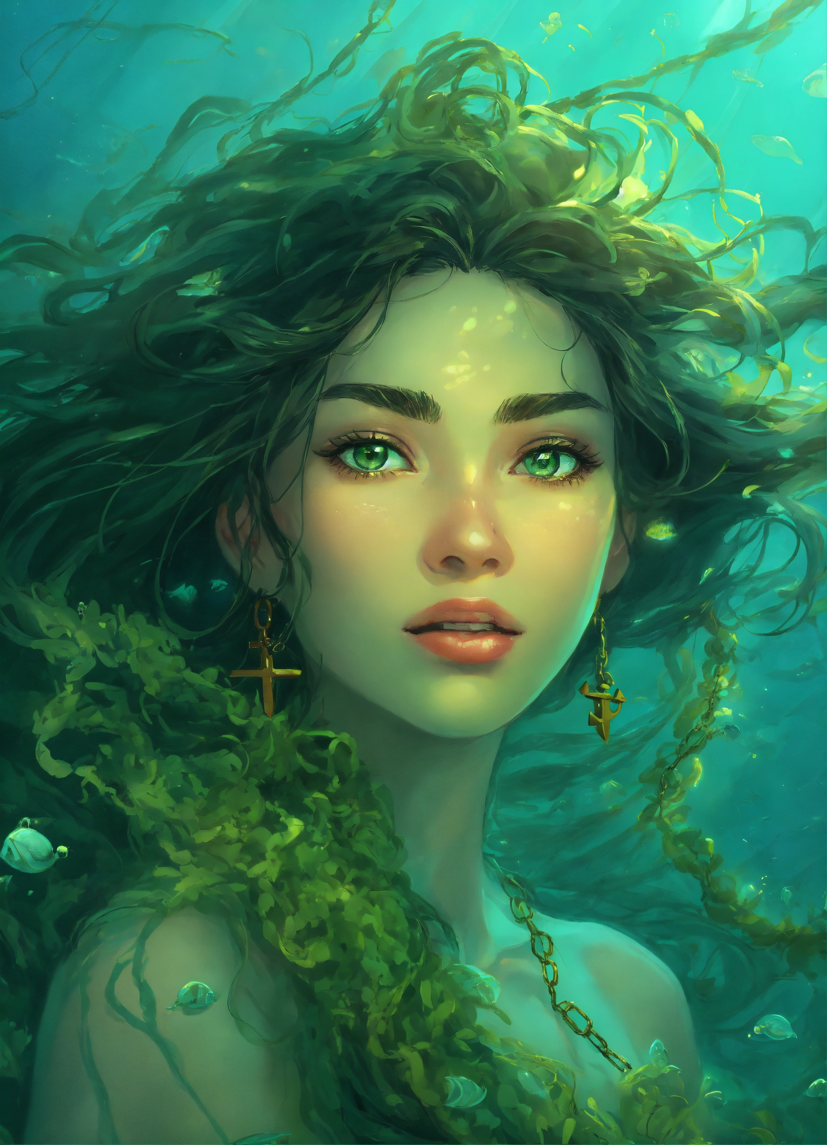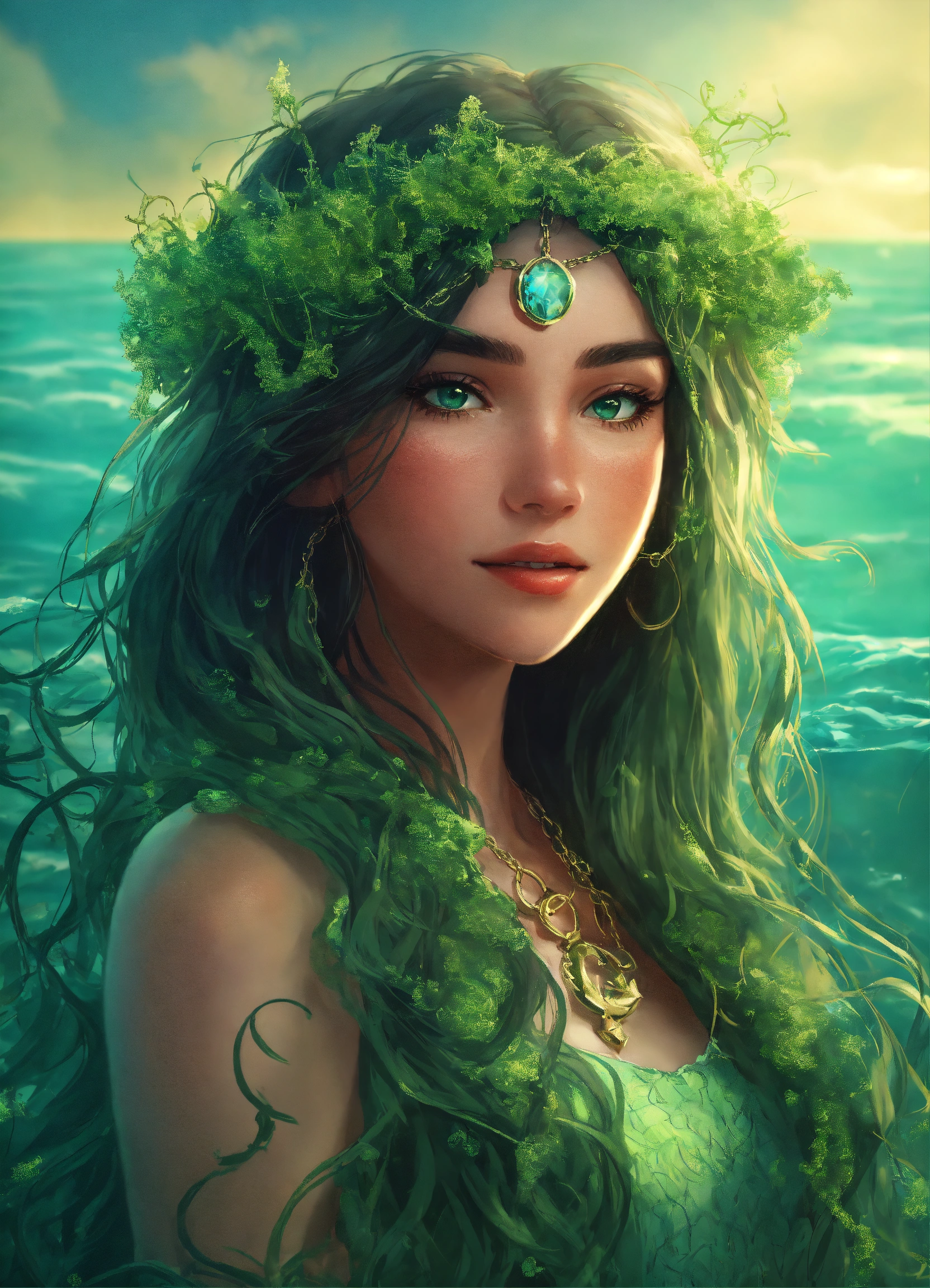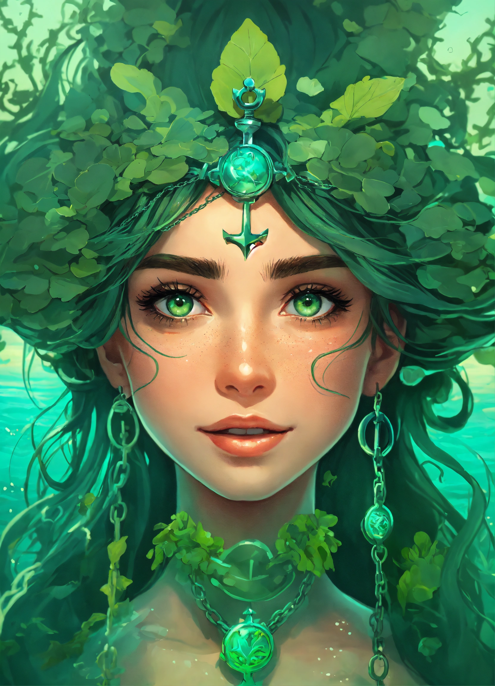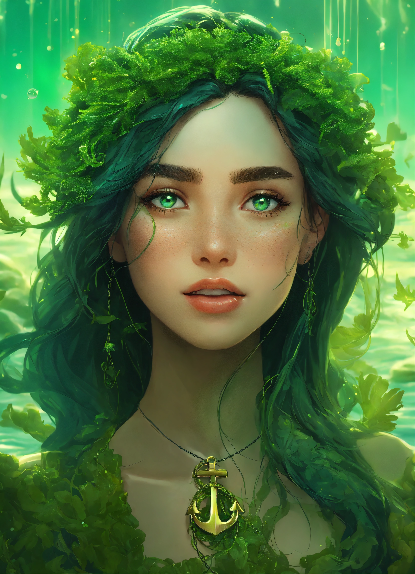 *surreal*portrait of happy disney princess covered in light green sea weed, ocean is inside her eyes, chain and anchor in her dark hair, 2d realistic disney animation